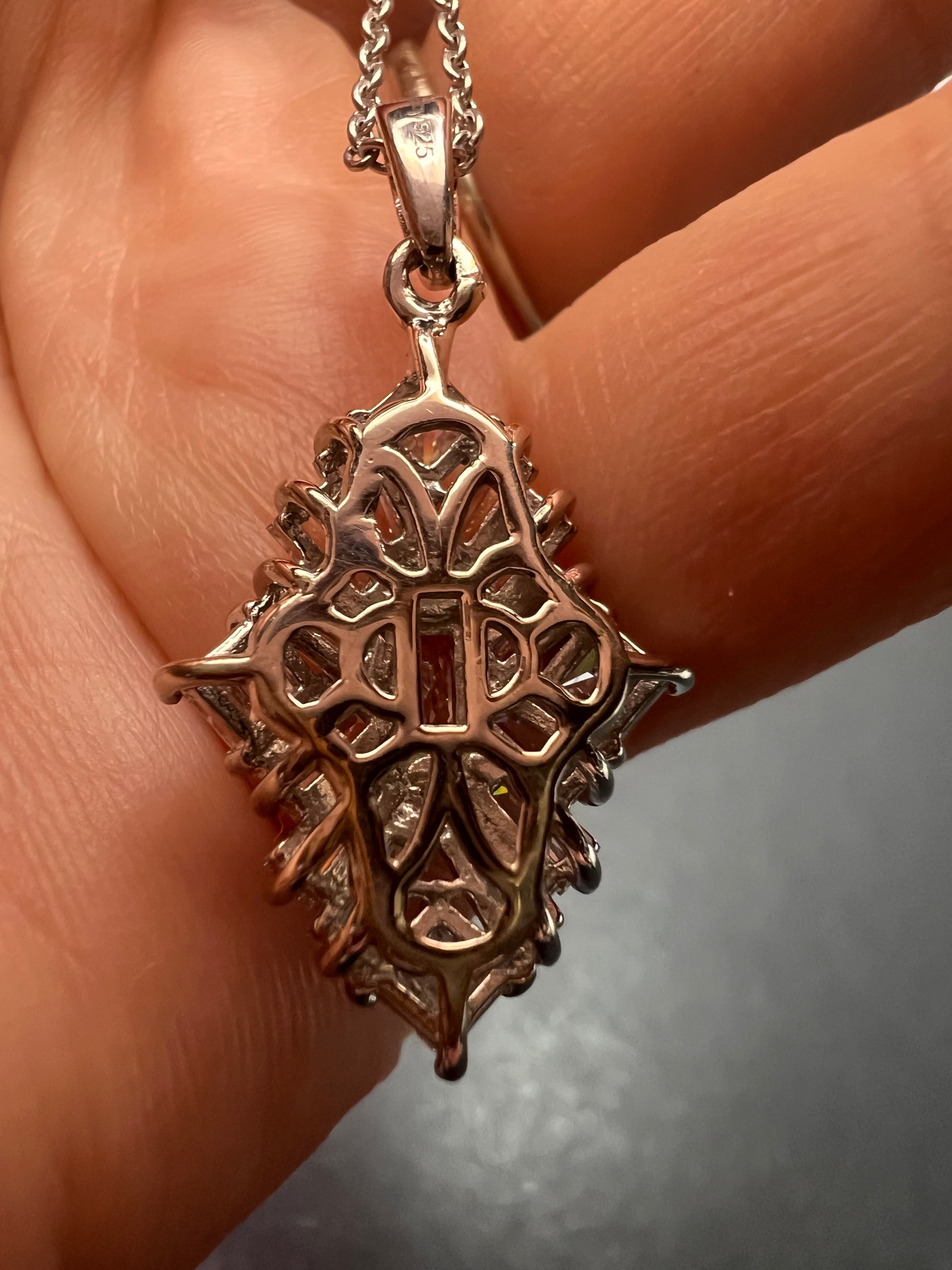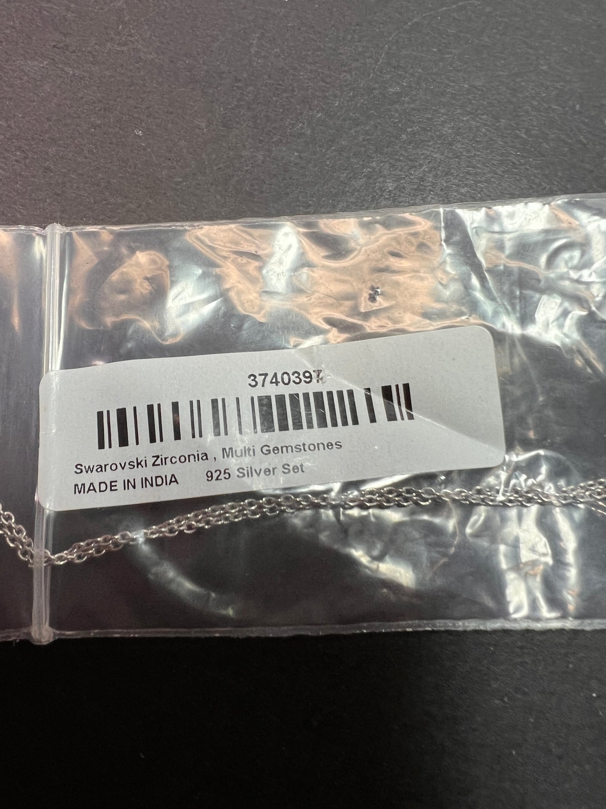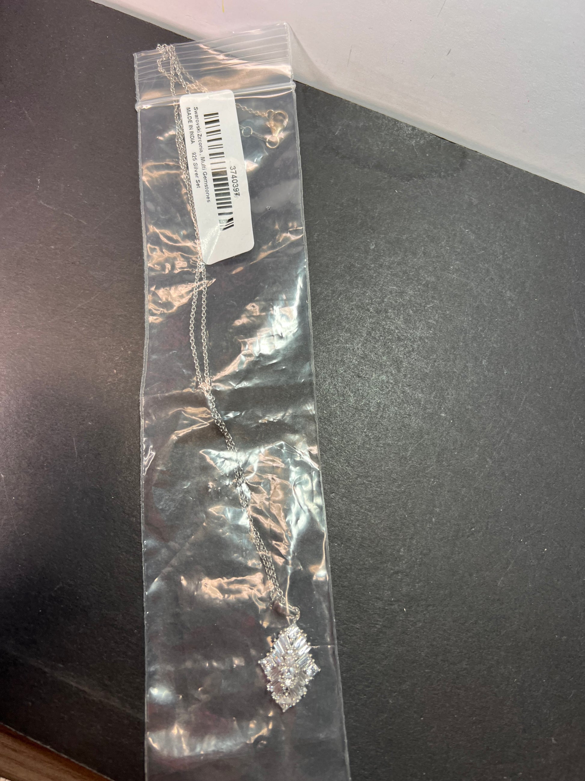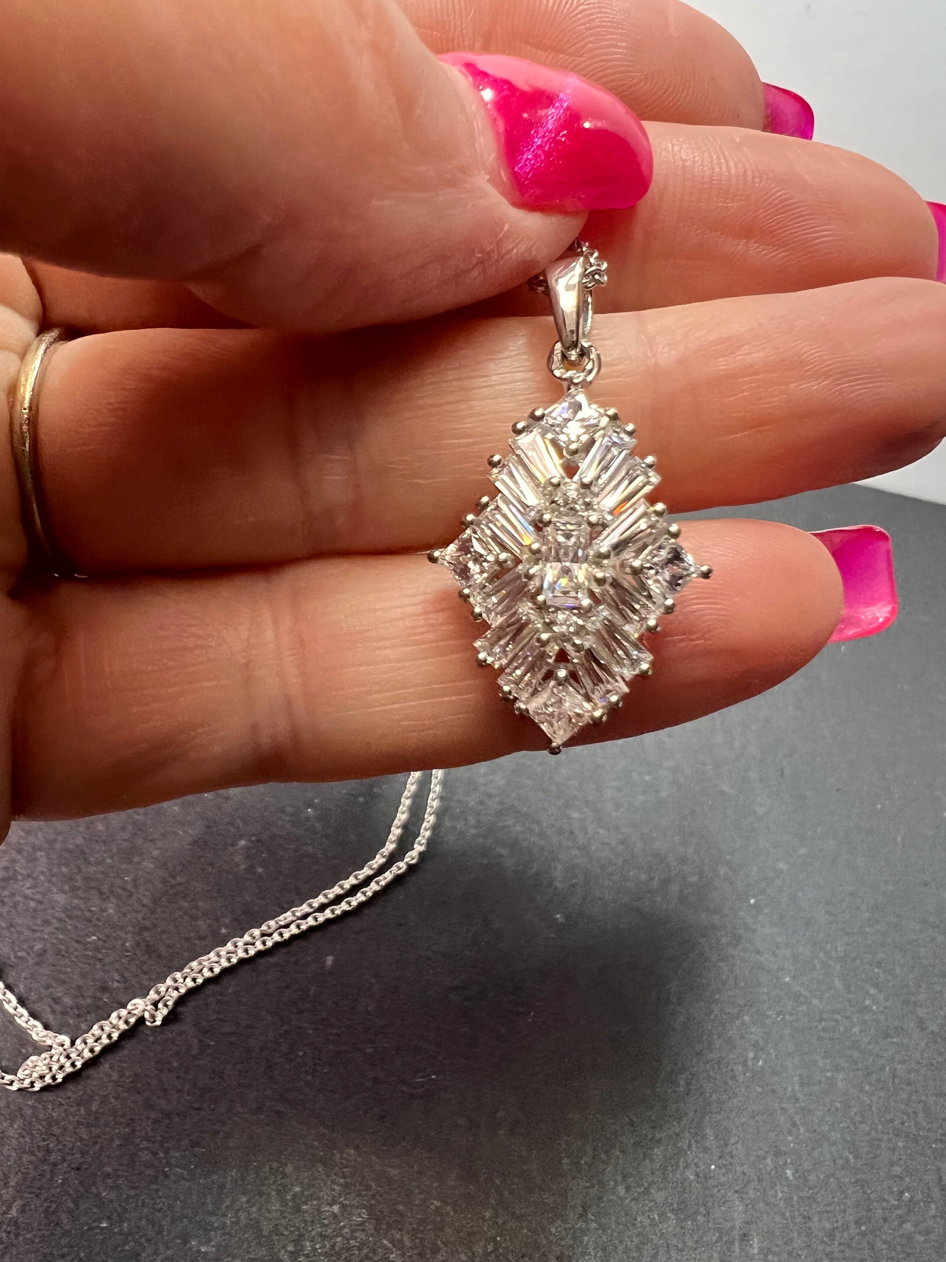 Swarovski cubic zirconias in a prong set rhodium over sterling silver setting. Chain measures 20 inches and is 925 too.