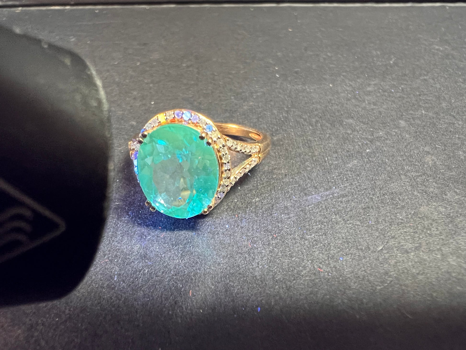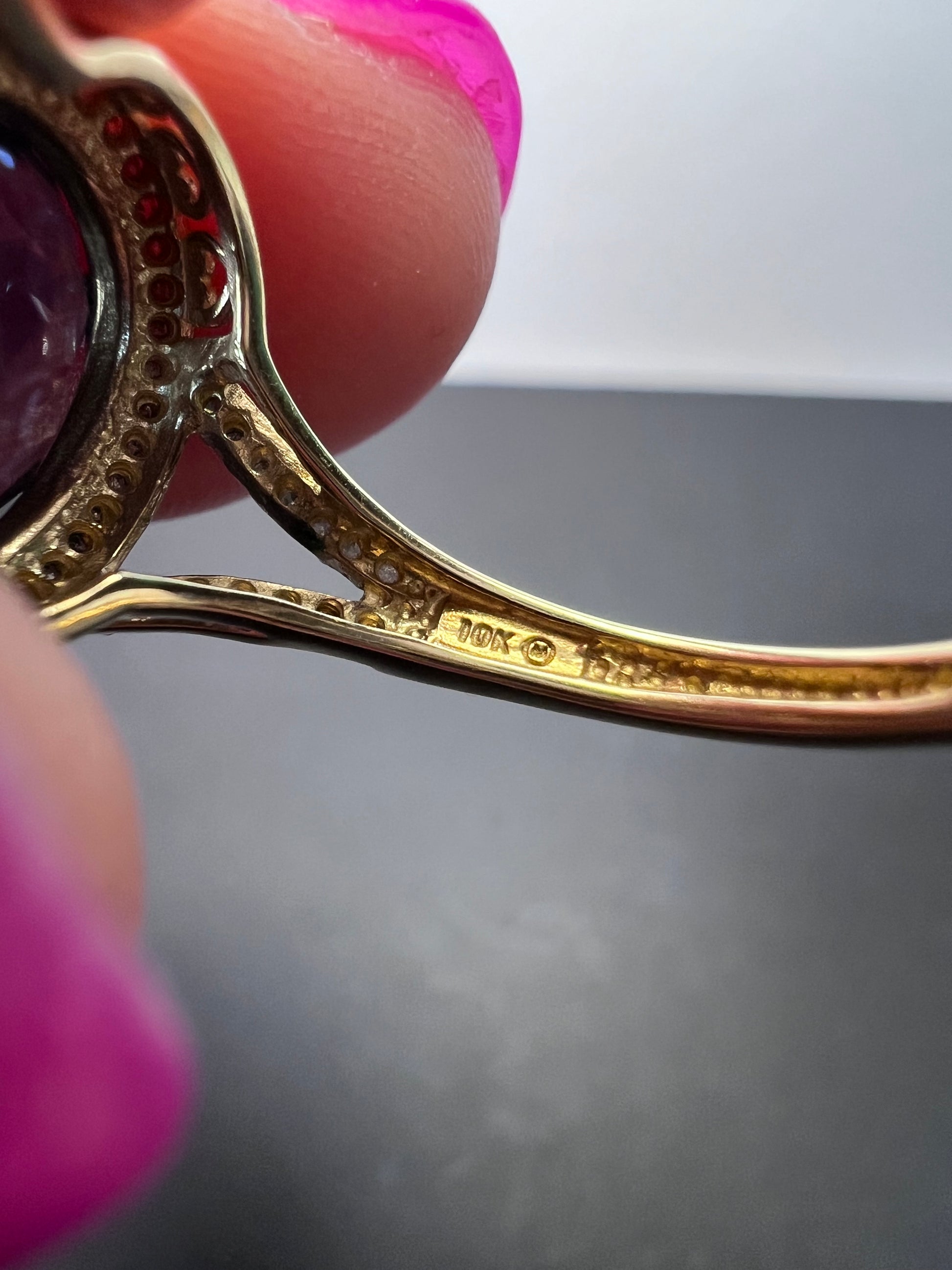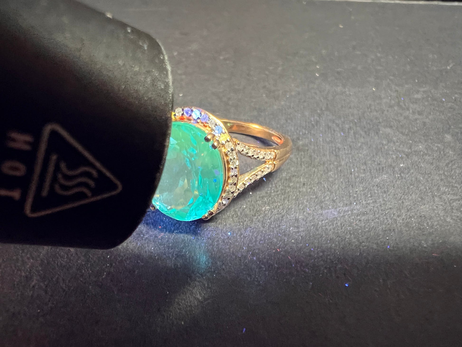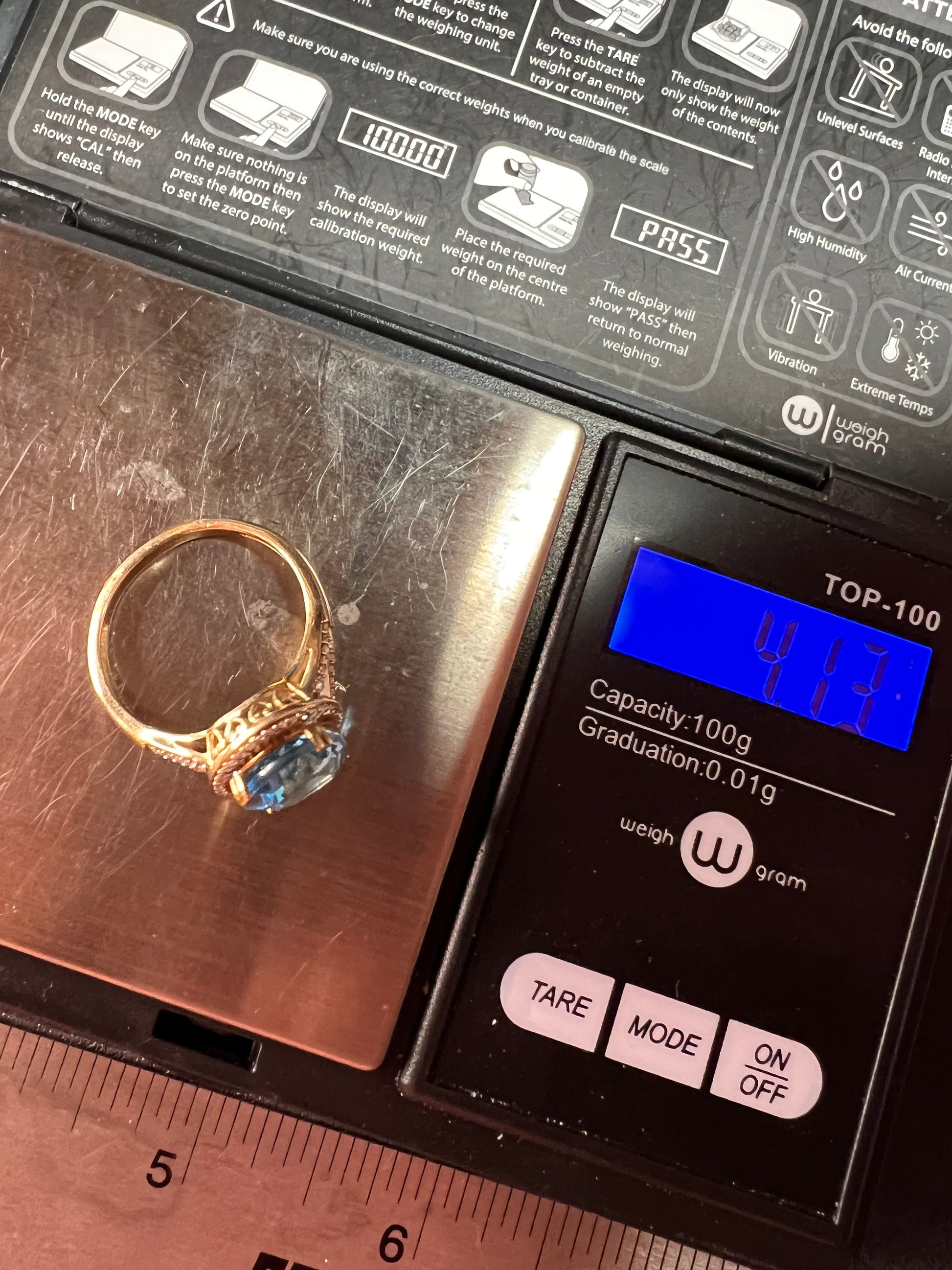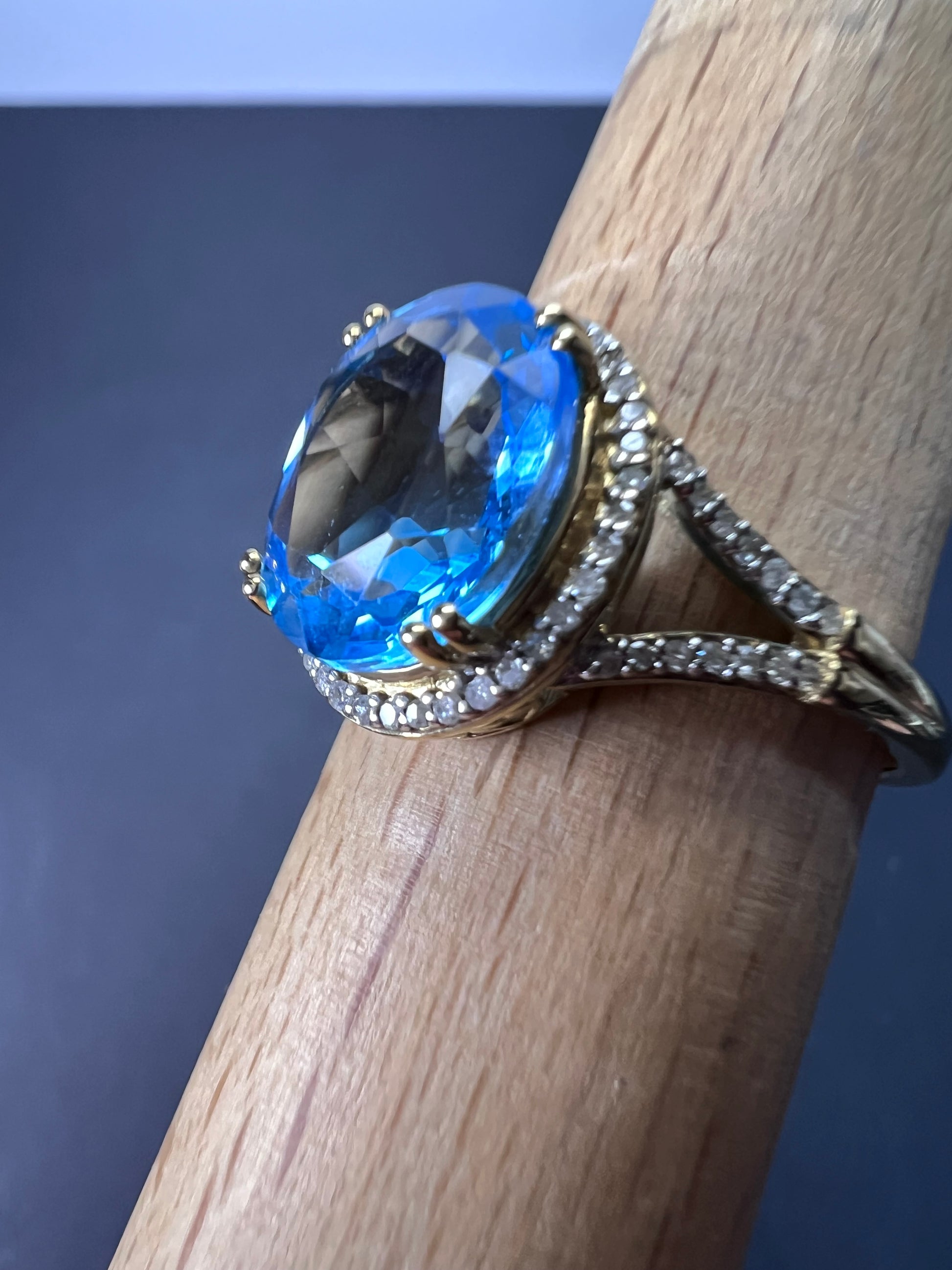 10k yellow gold. Swiss blue topaz with white accent diamonds around the halo and shank size 9. Has a total weight of 4.16 grams. Can be resized by a jeweler easily. This blue topaz stone glows green under UV light.