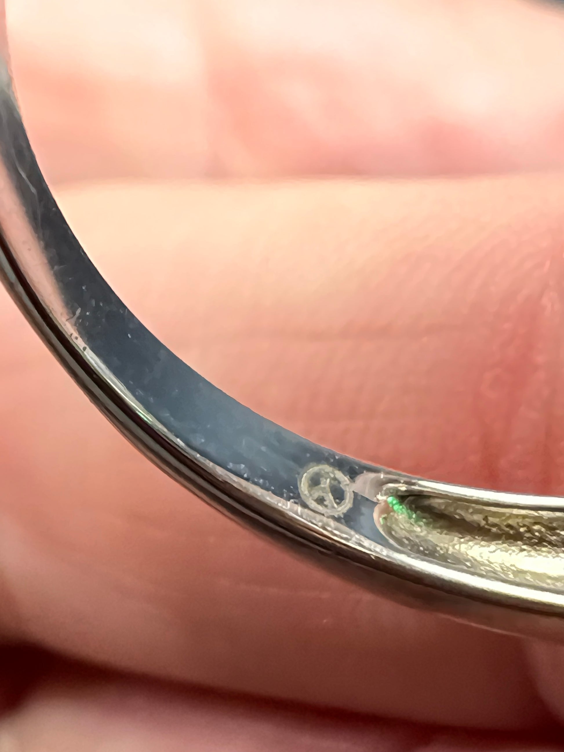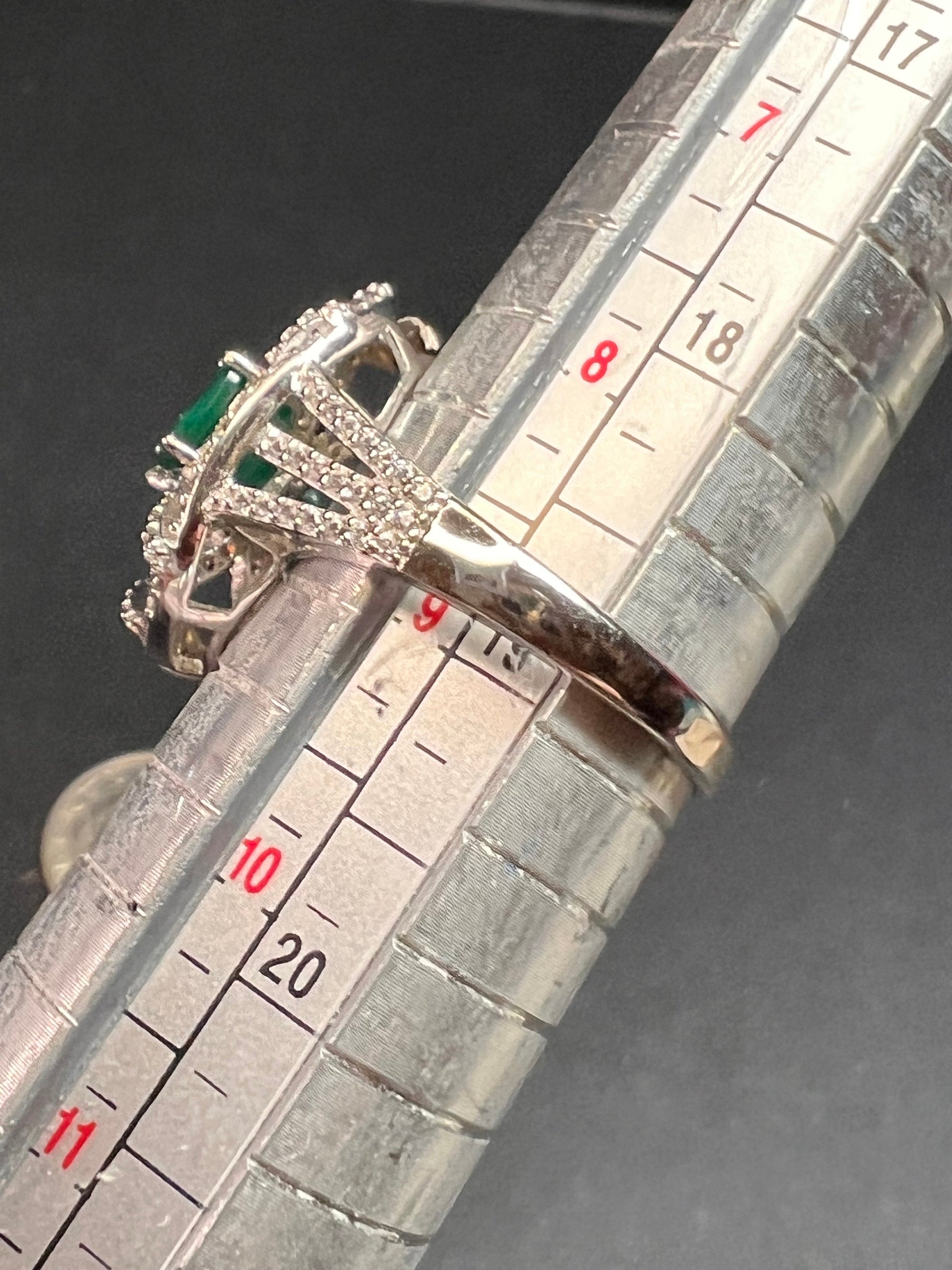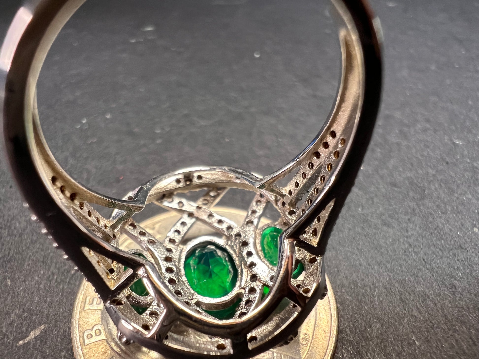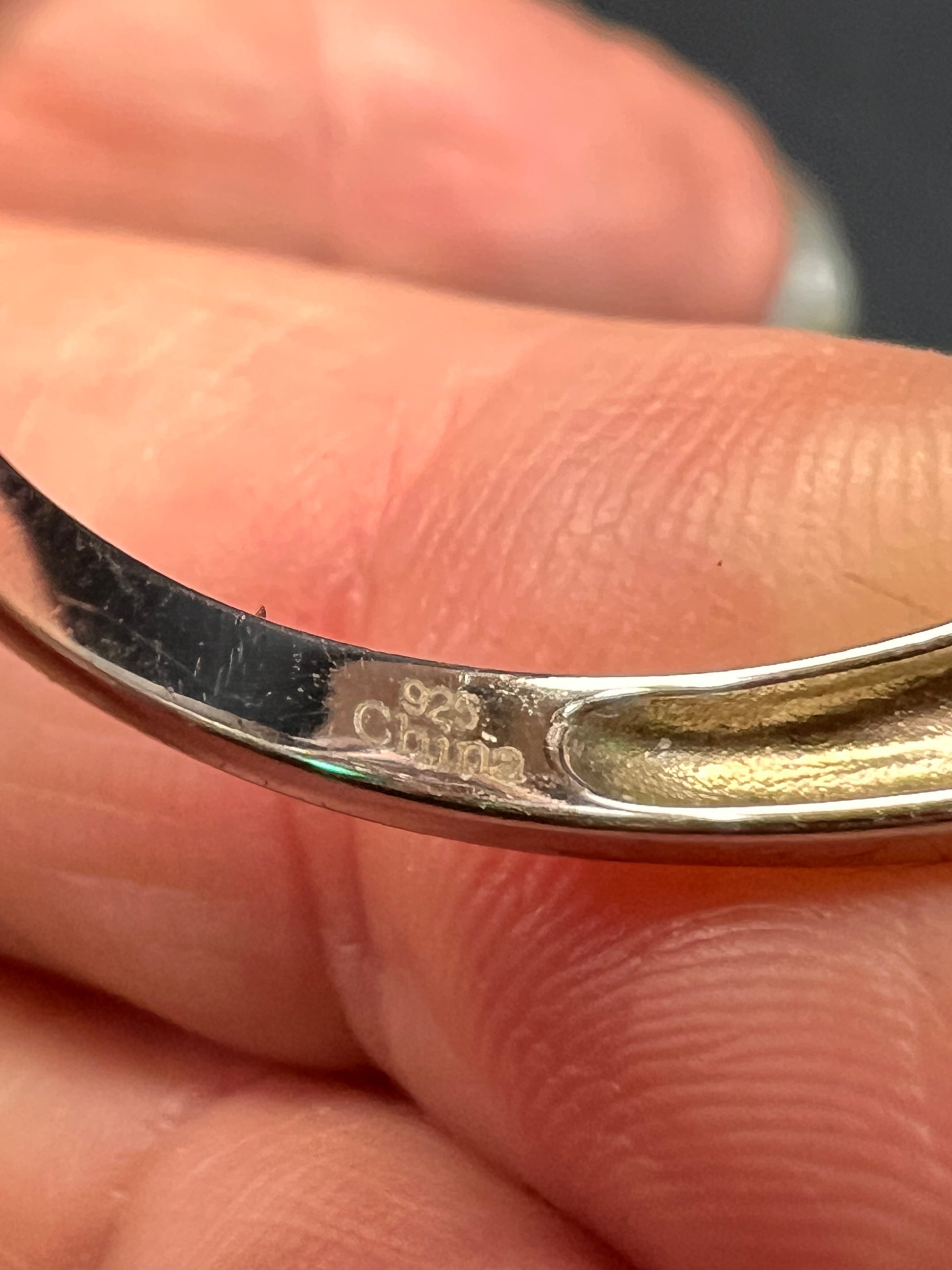 Green gemstones test as glass and white stones test closer to cubic zirconia. I’m assuming these are a synthetic emerald or could possibly be something else but selling as synthetic / glass/ cz / man made. Prong set in authentic 925 sterling silver that’s likely plated with rhodium. China.
