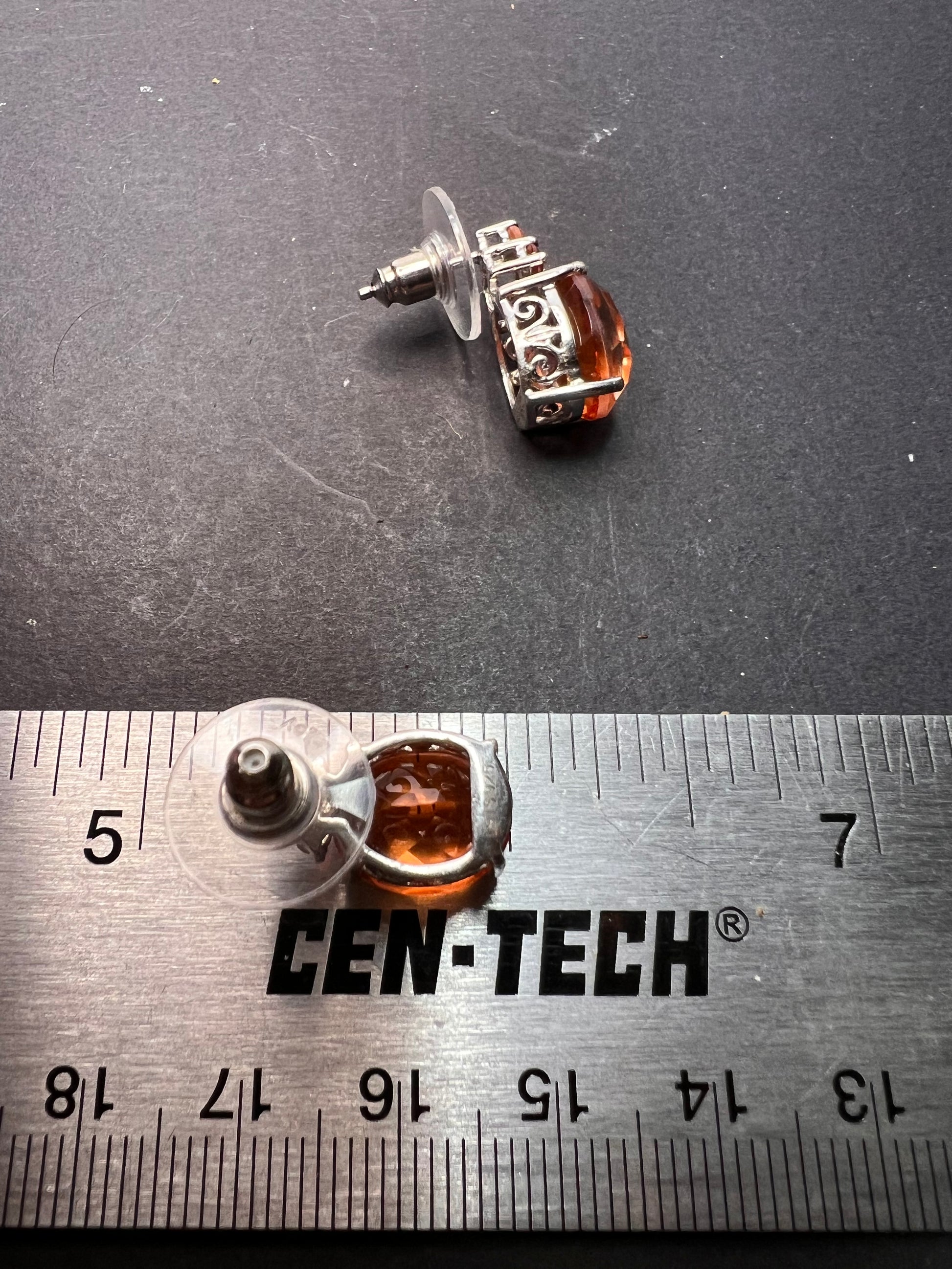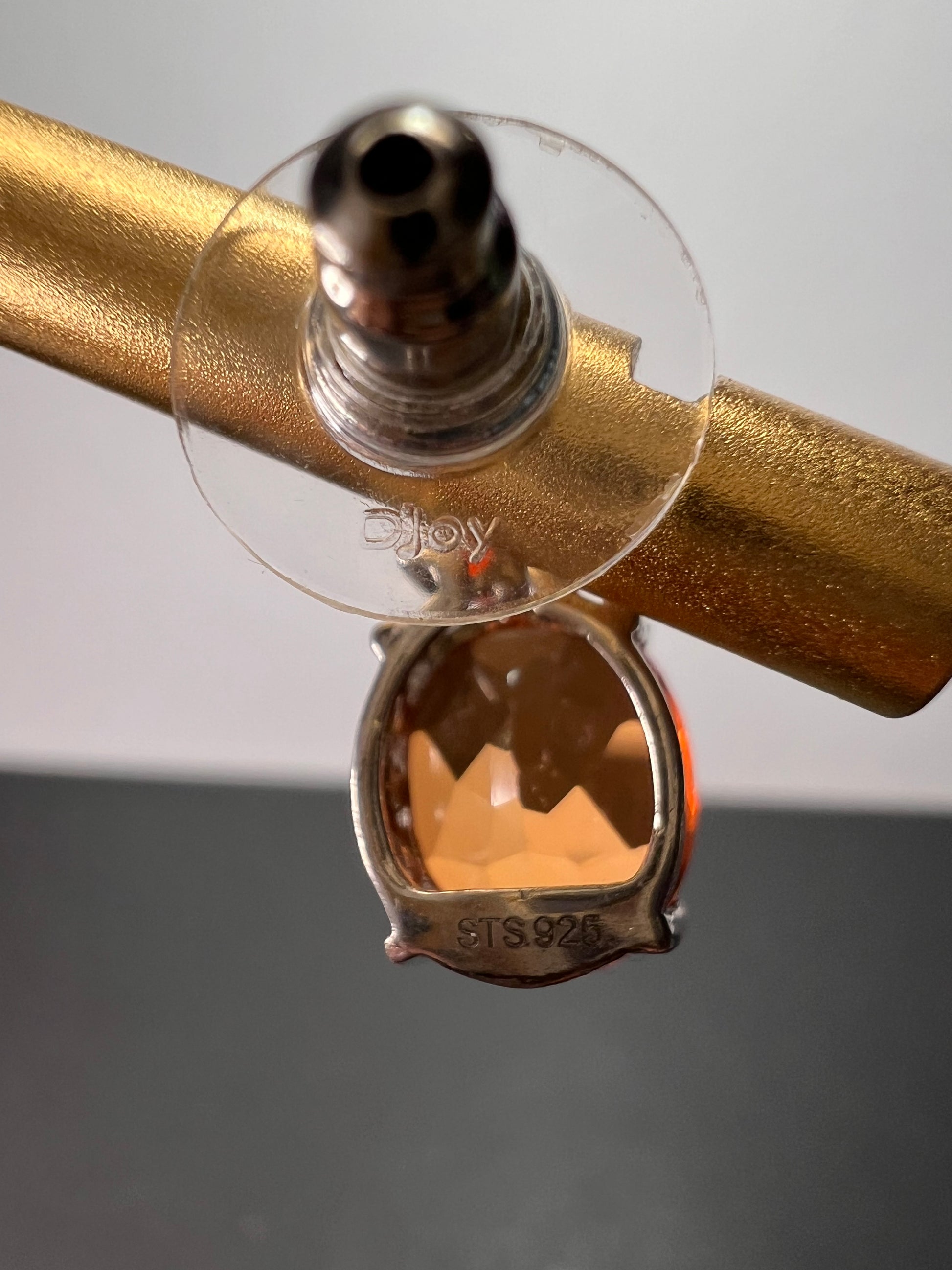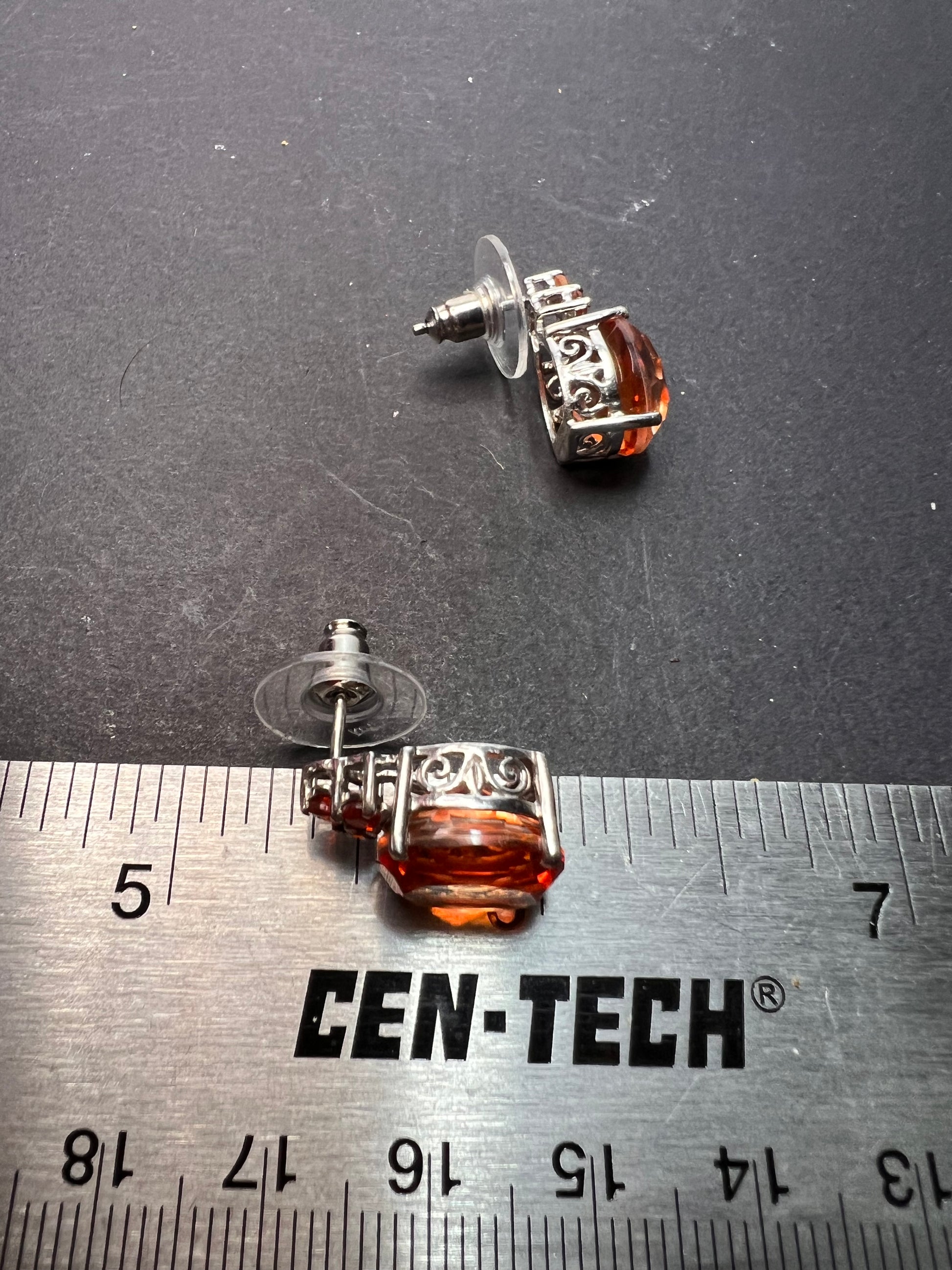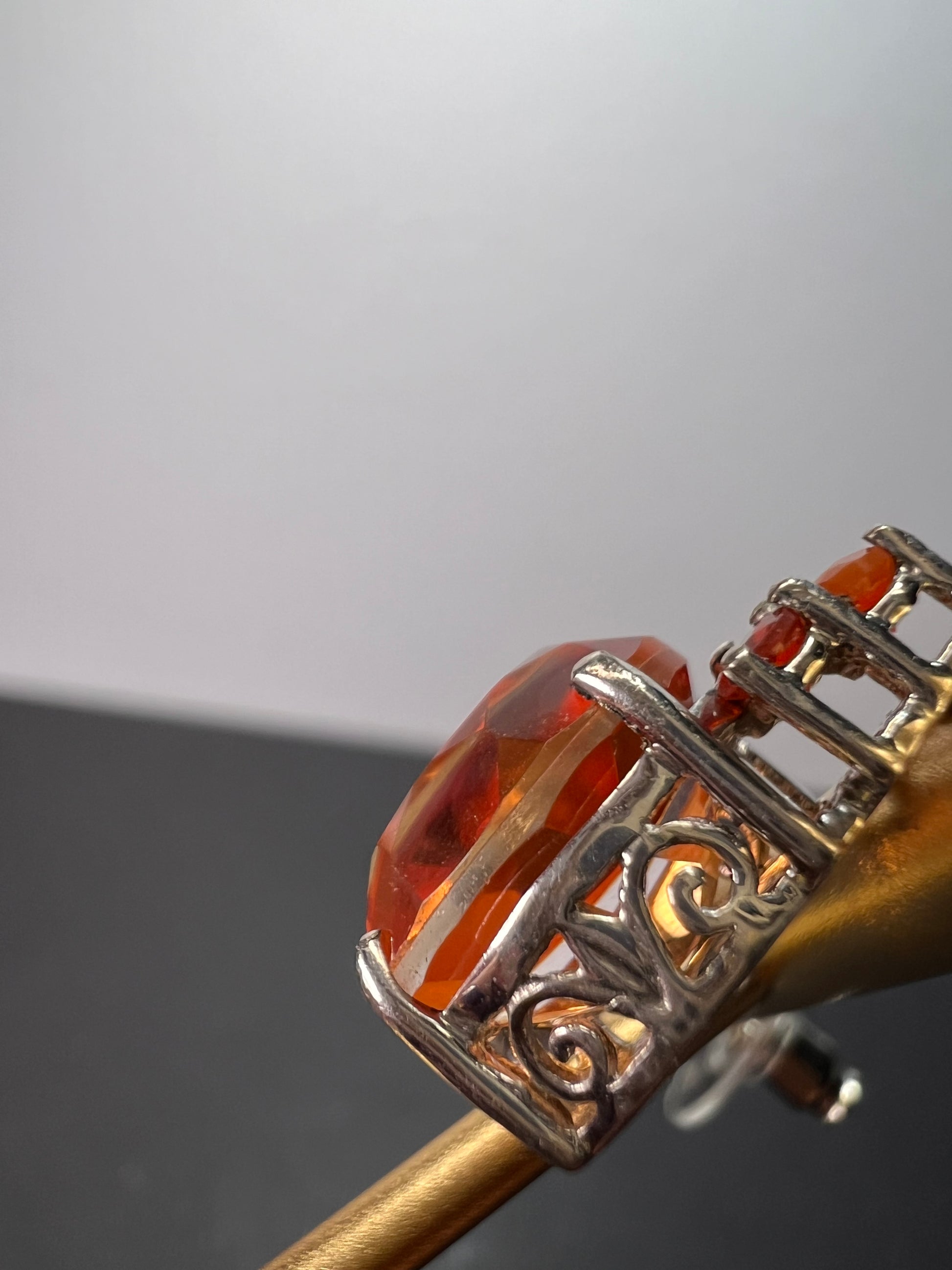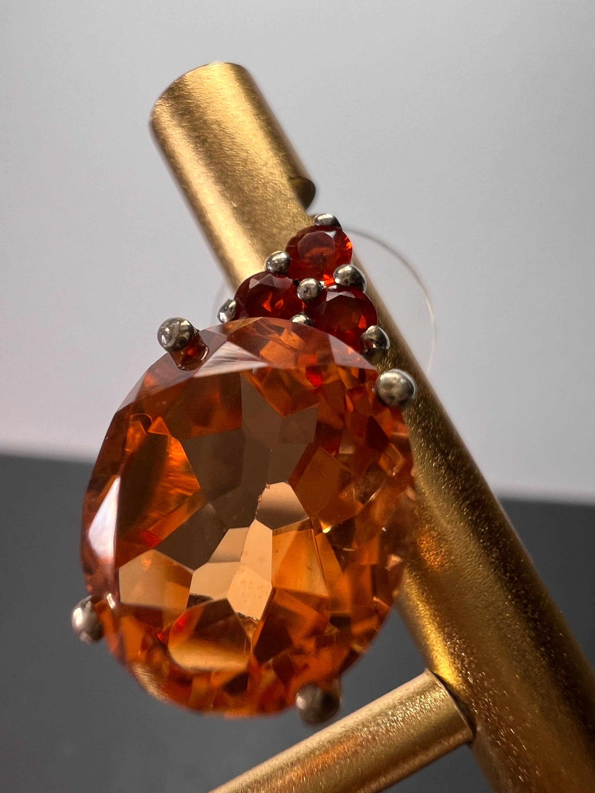 Stones test and view as fire opal (small orange accent stones) , and the big tangerine stones test as quartz and look to be color treated with a type of tangerine / orange color. Set in rhodium or platinum plated over sterling silver.