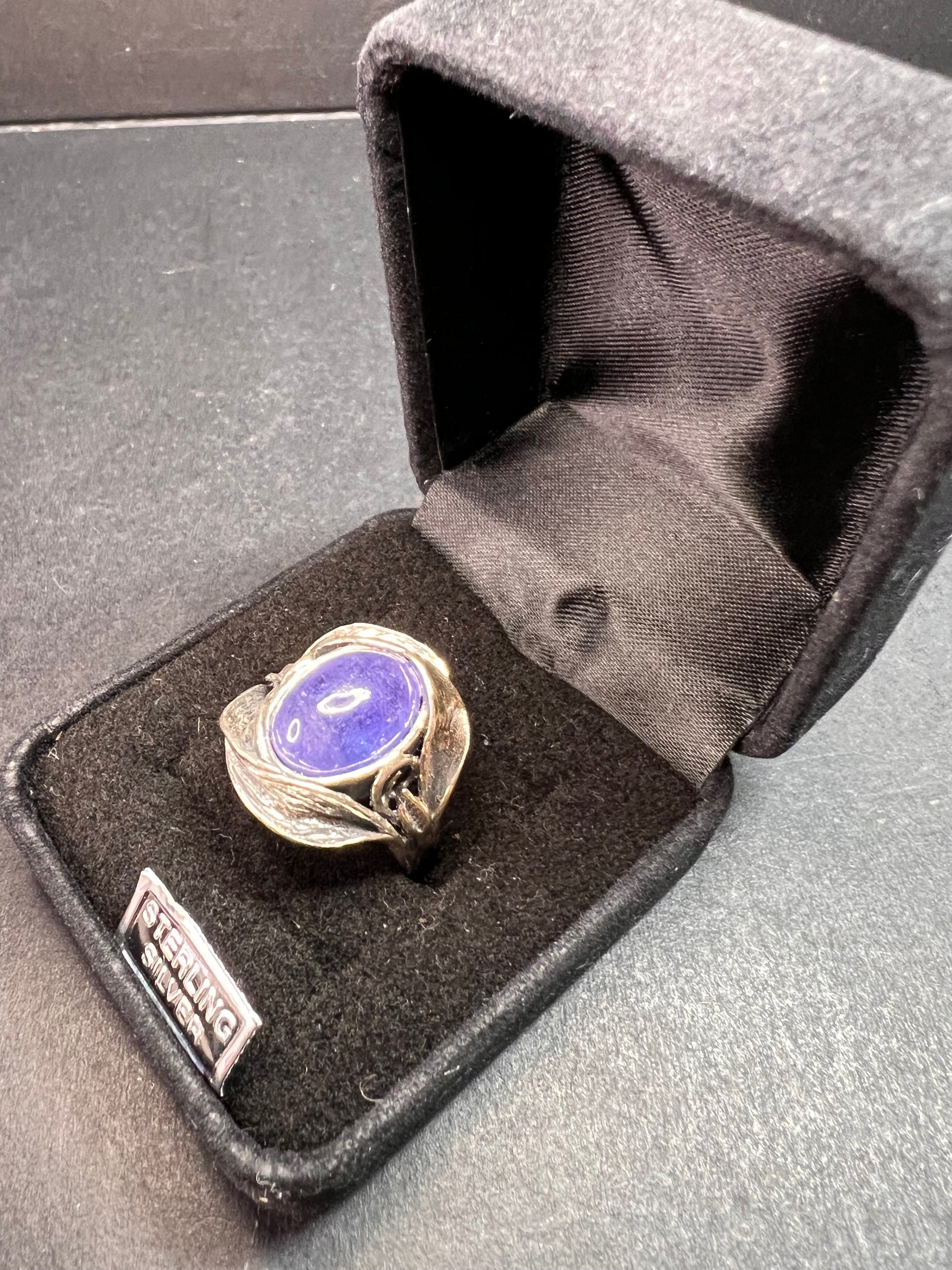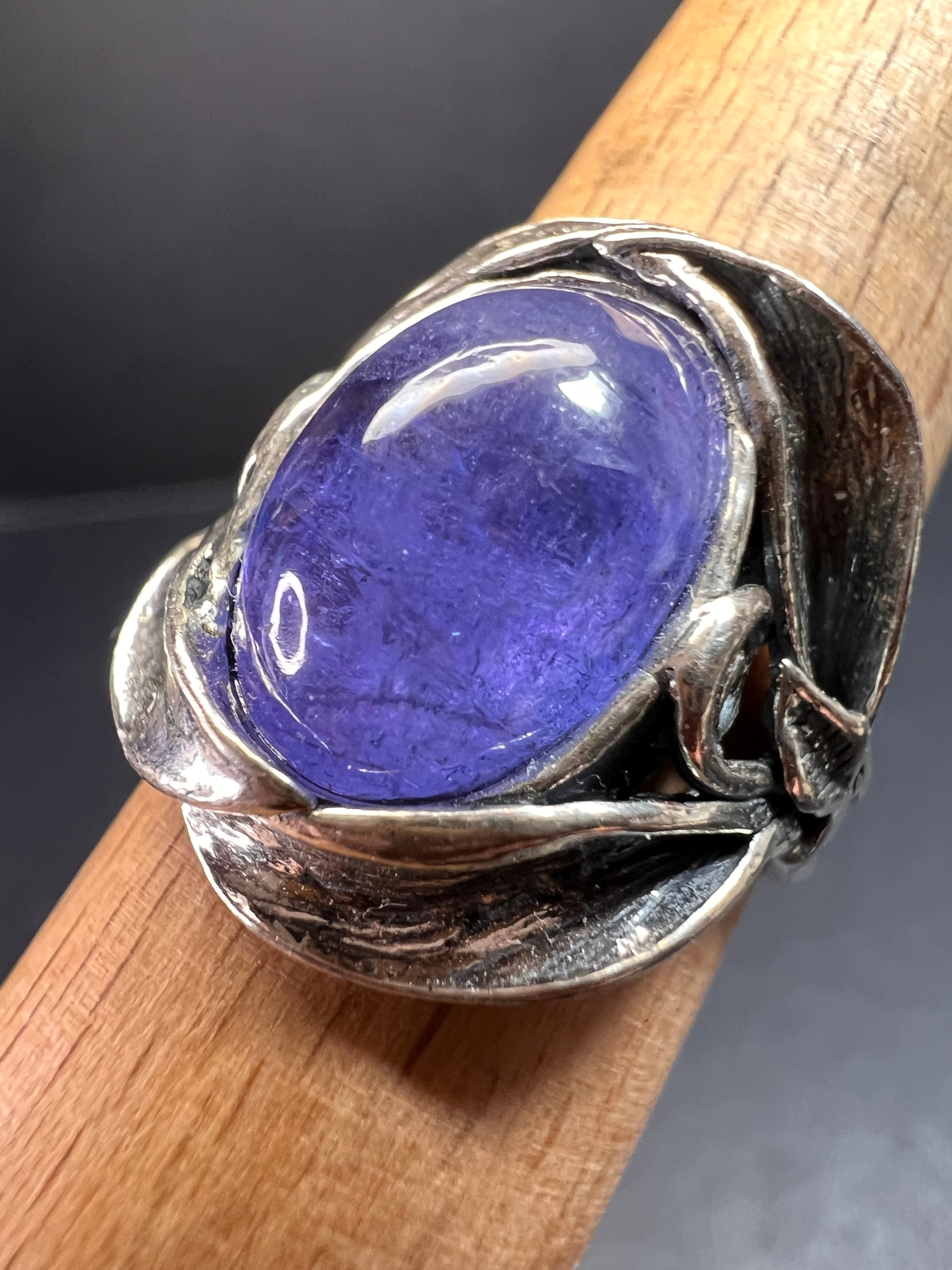 Genuine blue tanzanite oval cut cabochon stone bezel set in authentic 925 sterling silver. Measures a size 9 and has a total weight of 8.84 grams. PZ for PAZ Israel. Comes with ring box.