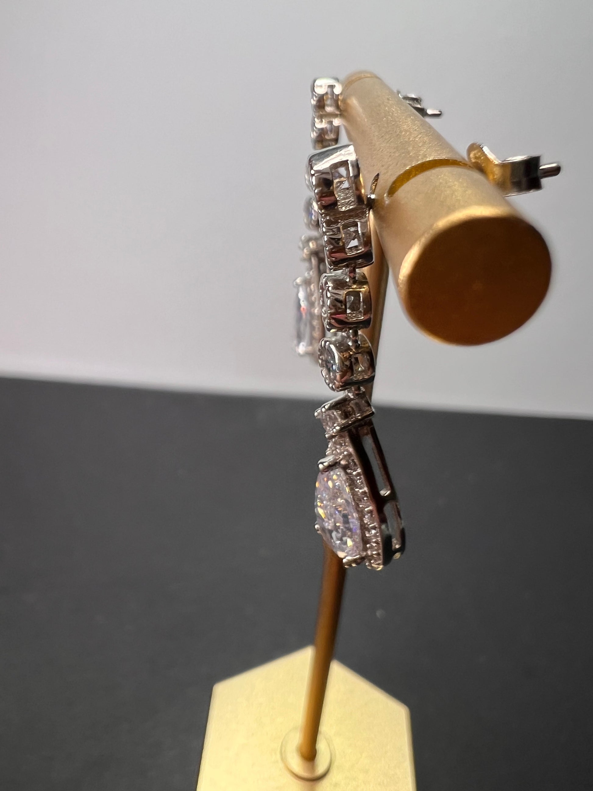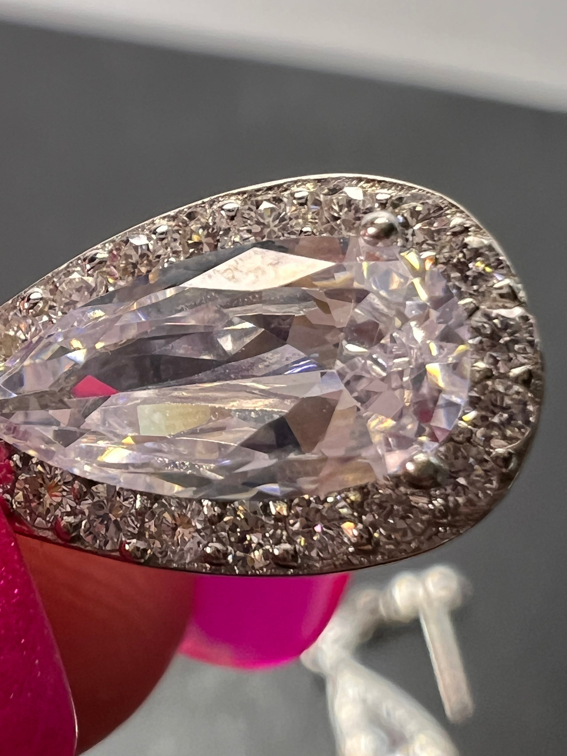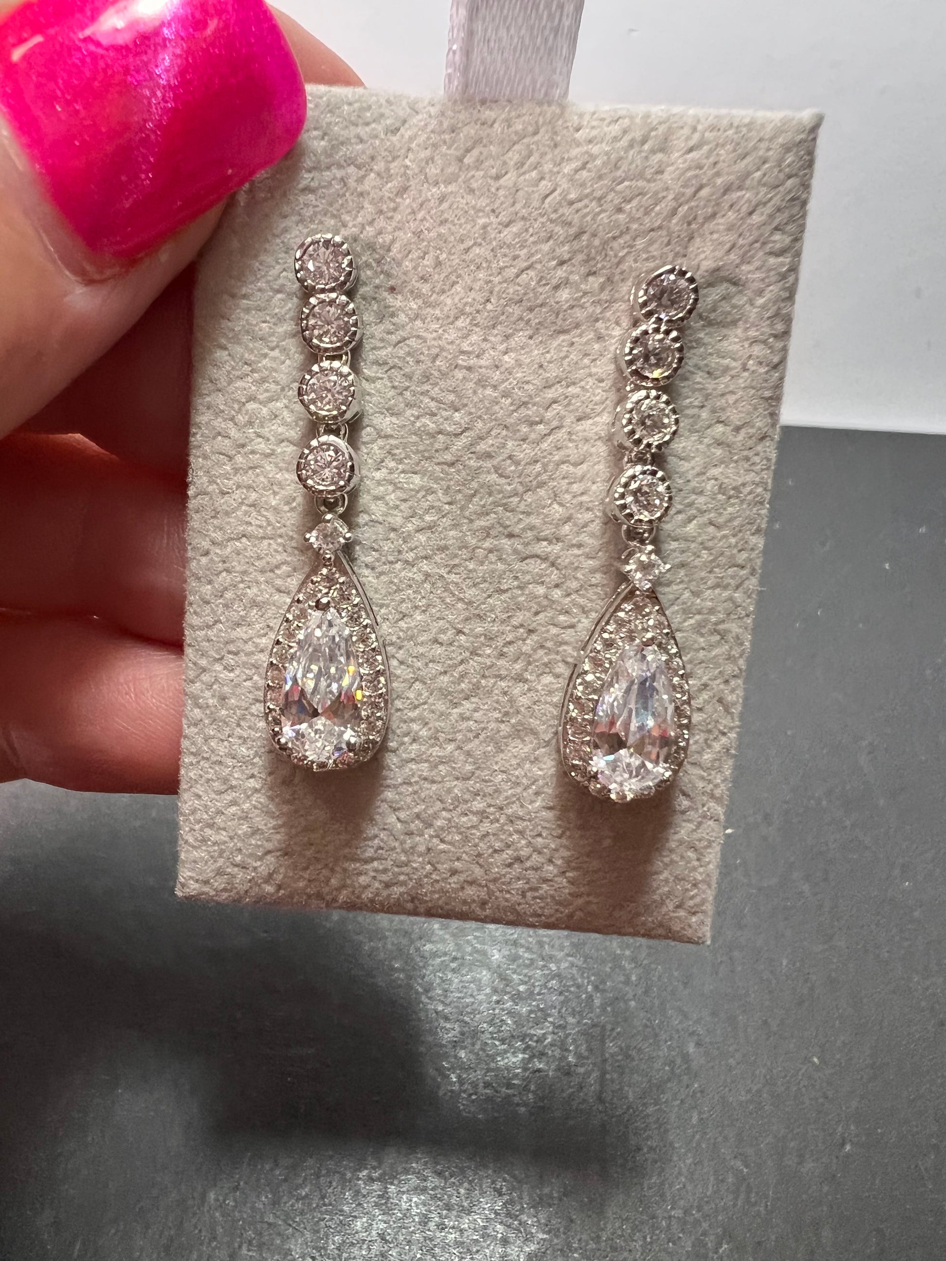 White teardrop and round cubic zirconia stones set in rhodium plated over sterling silver. Earrings measure over an inch in length. See photos.