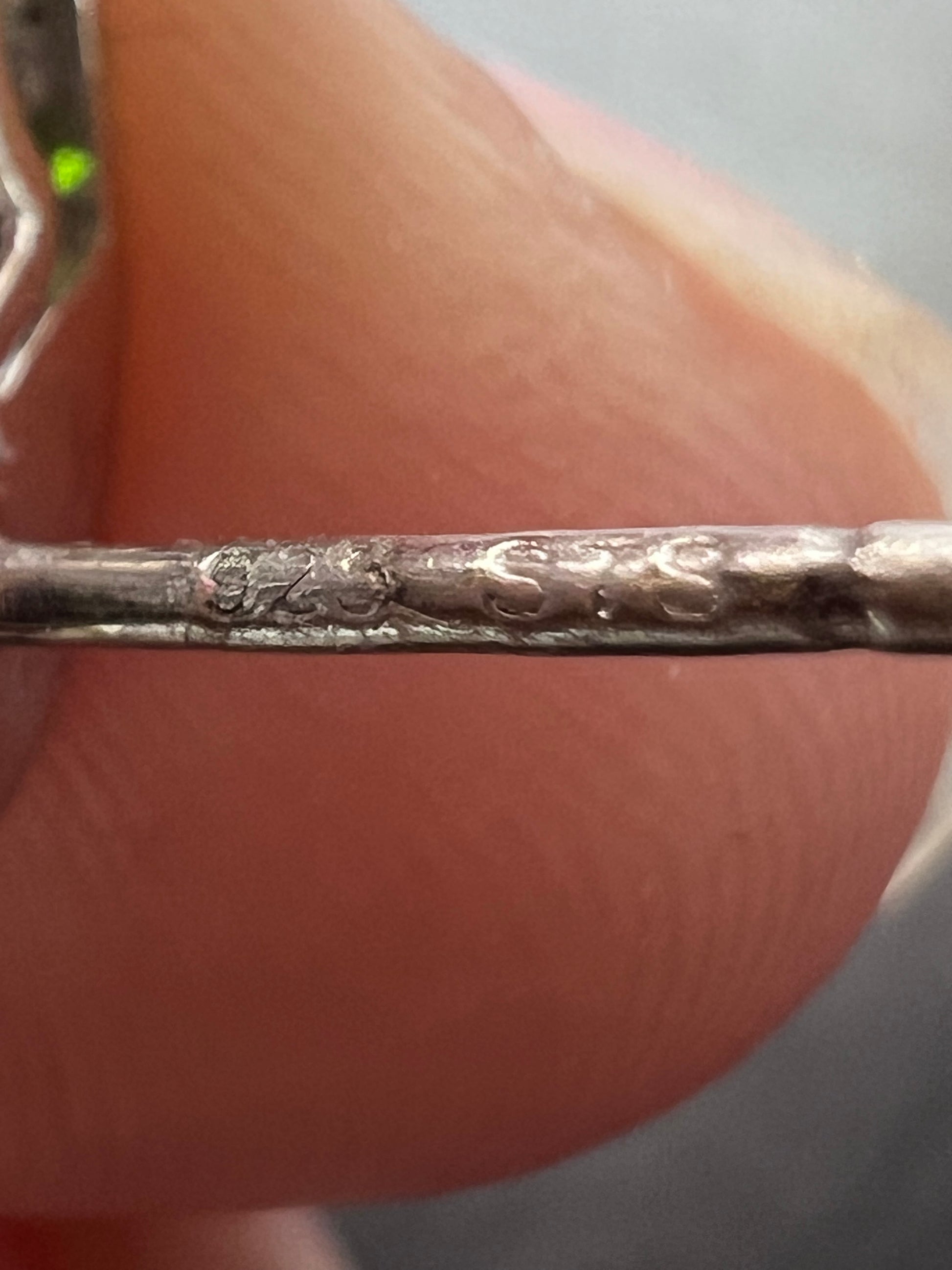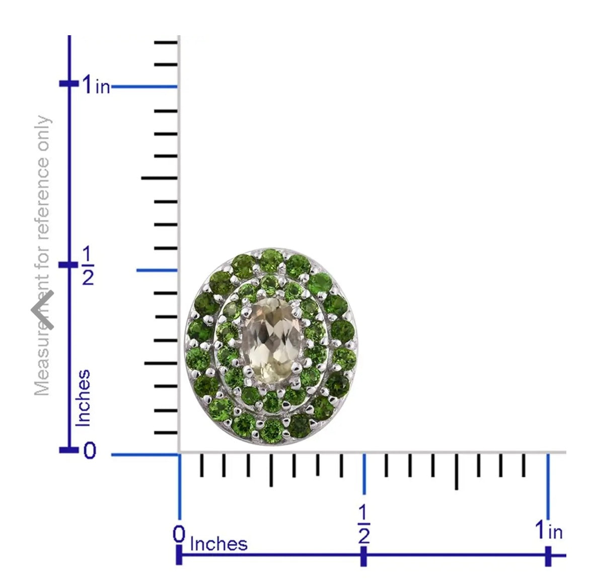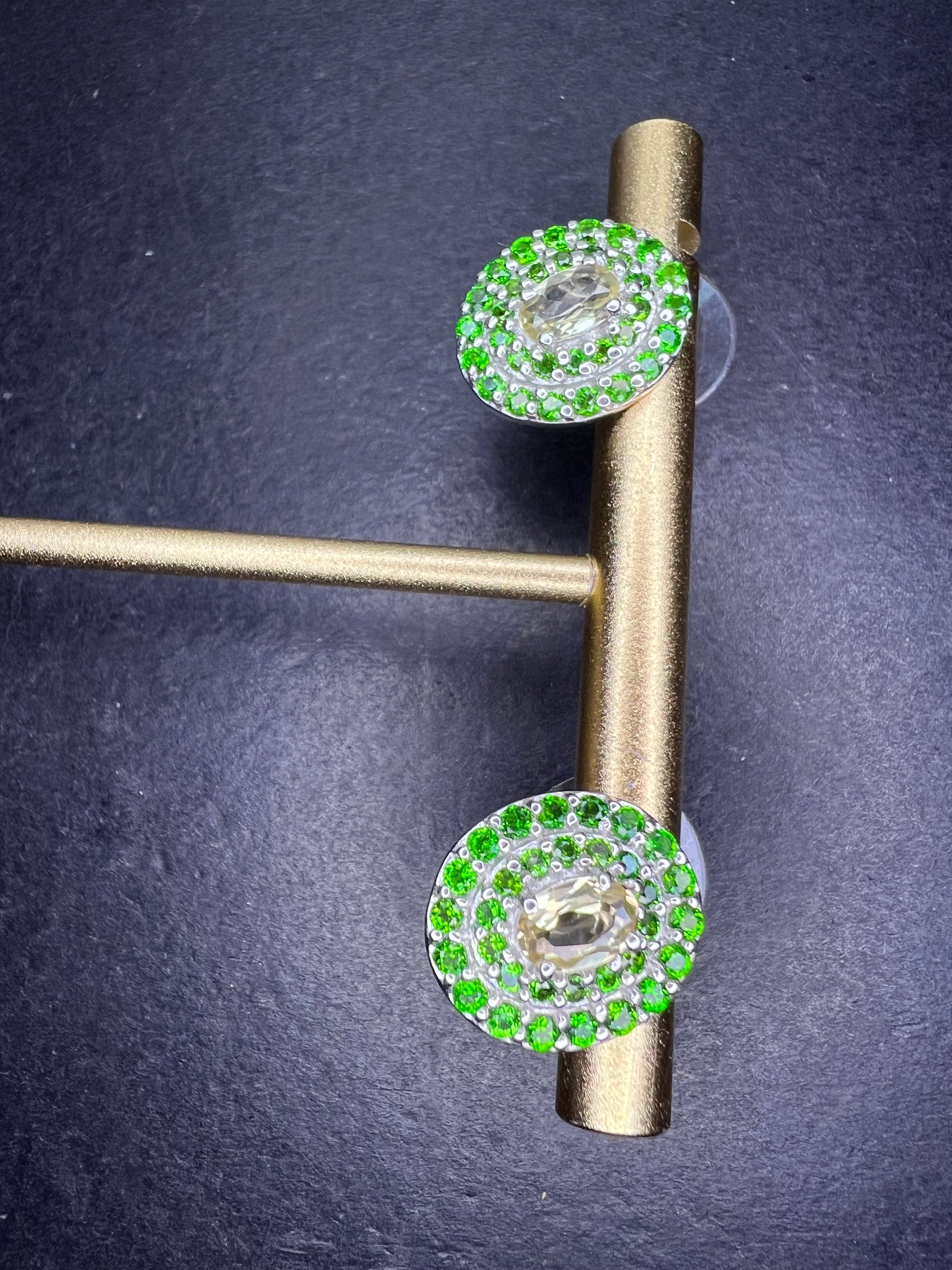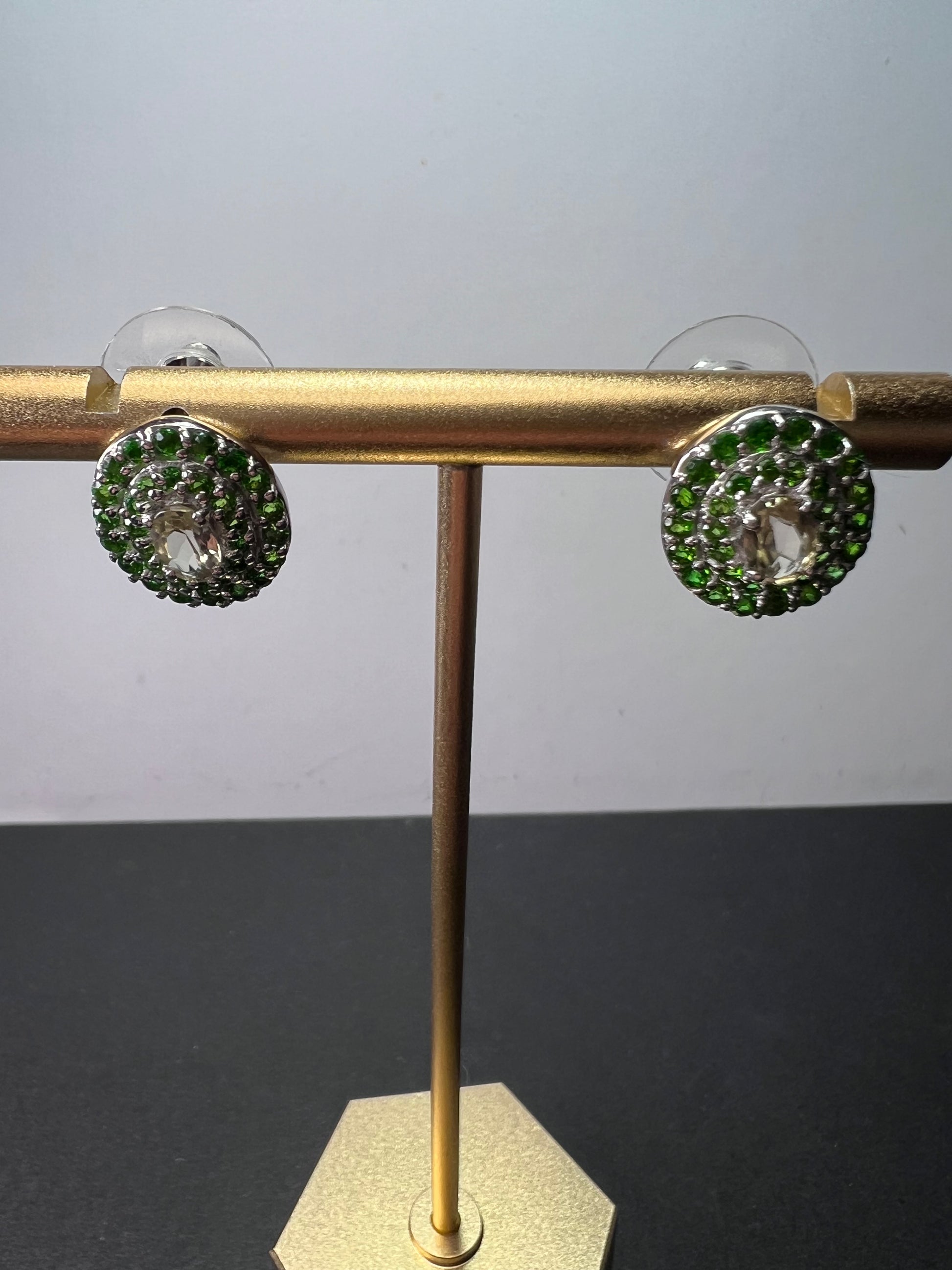 Green stones are chrome diopside. Light almost colorless stones in the center are turkizite. Platinum plated over sterling silver.