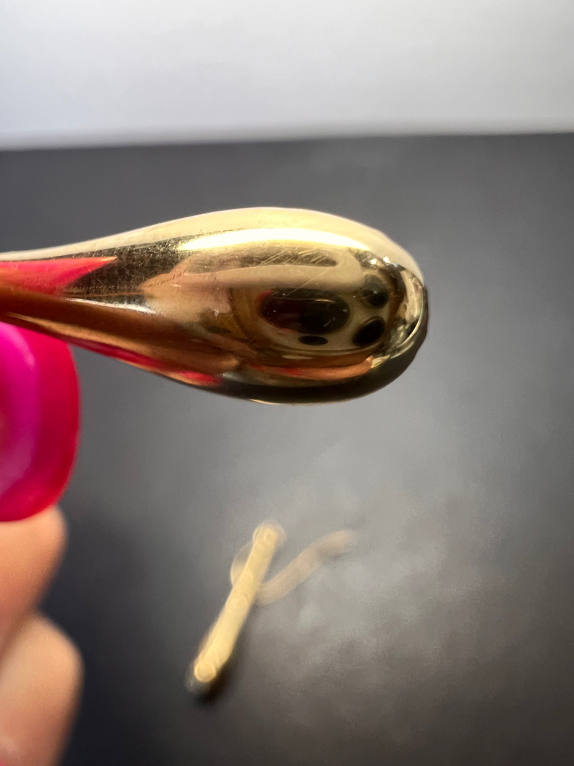 10k yellow Turkish gold teardrop earrings with diamond cut fronts. Hollow. Total weight is .91 grams. Measures just over one inch in length. ARR 10k Turkey stamp. Tested for purity.