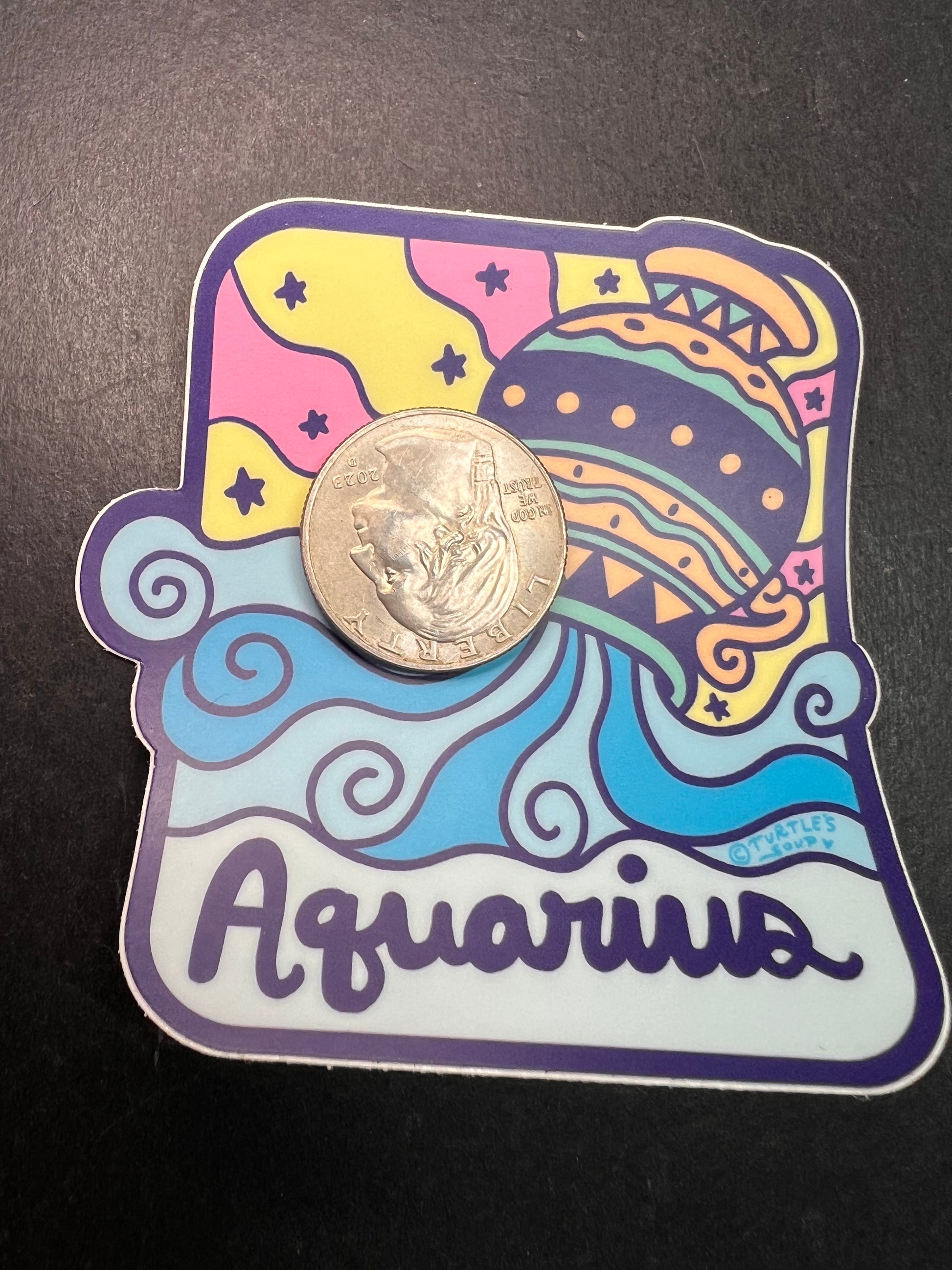 This Aquarius sticker from Turtle’s Soup features a colorful water-bearer design with bright waves and a fun pastel sky. Printed on waterproof vinyl with a matte finish, it sticks great on water bottles, laptops, notebooks, planners, and more. Size is a little over 3 inches (shown with a quarter on top for scale).