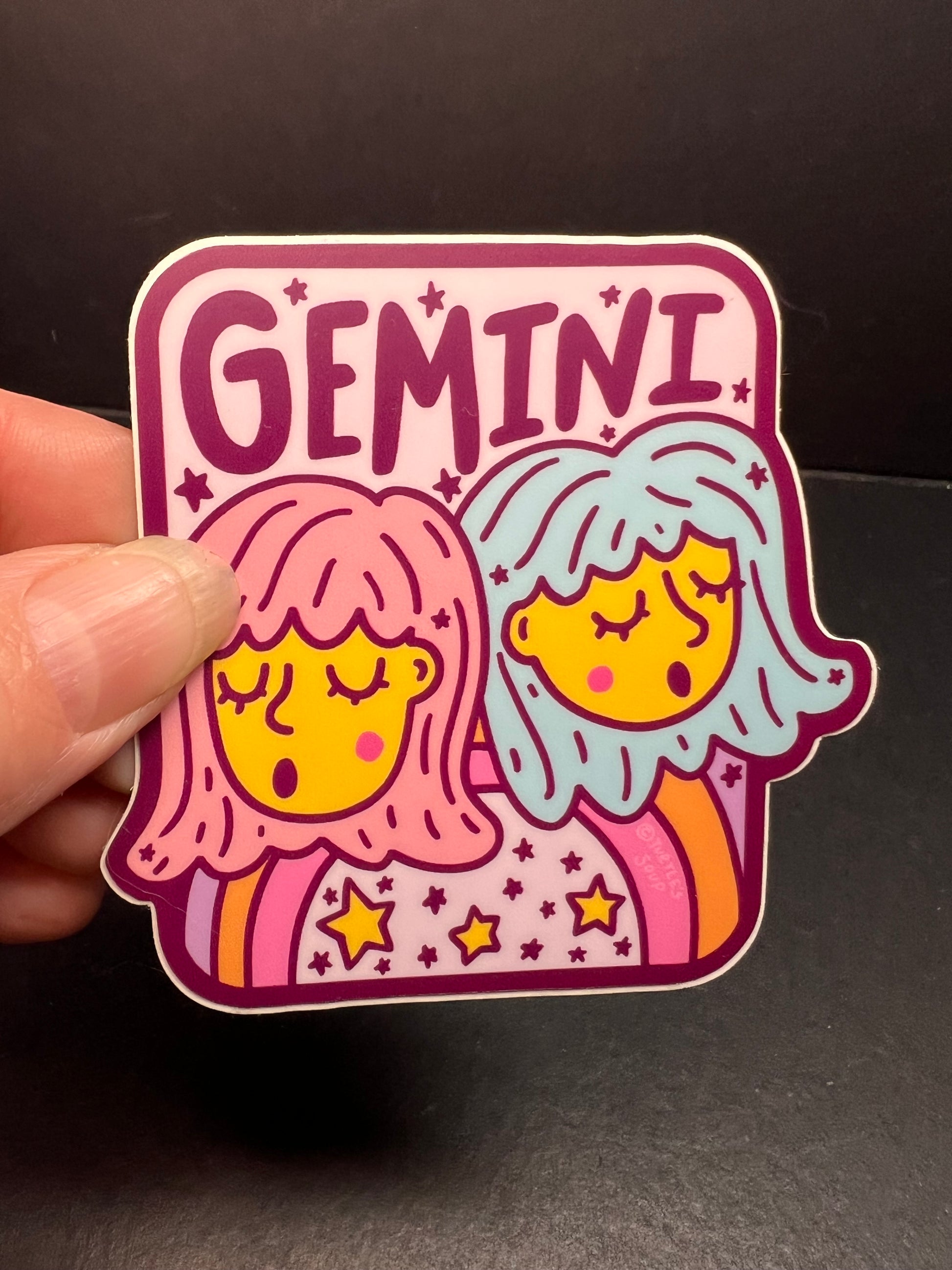 This Gemini sticker from Turtle’s Soup features the classic twin design in cute pastel colors. It’s printed on waterproof vinyl with a matte finish, perfect for water bottles, laptops, notebooks, planners, and more. Measures a little over 3 inches (see the quarter on top for size).