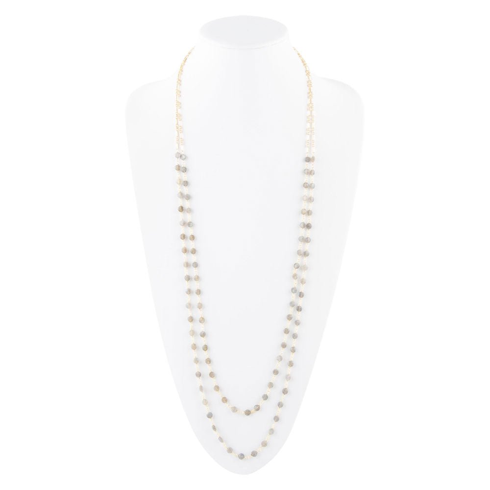 Add some colorful flair to your wardrobe with our genuine gold plated brass and Labradorite necklace! Two rows of rosary linked faceted labradorite creates a unique piece that is sure to make a statement while only weighing 25.6 grams. Inner layer is 35" and outer layer is 37". With a 2" extender chain and lobster claw closure, it can be easily adjusted for the perfect fit.🌟