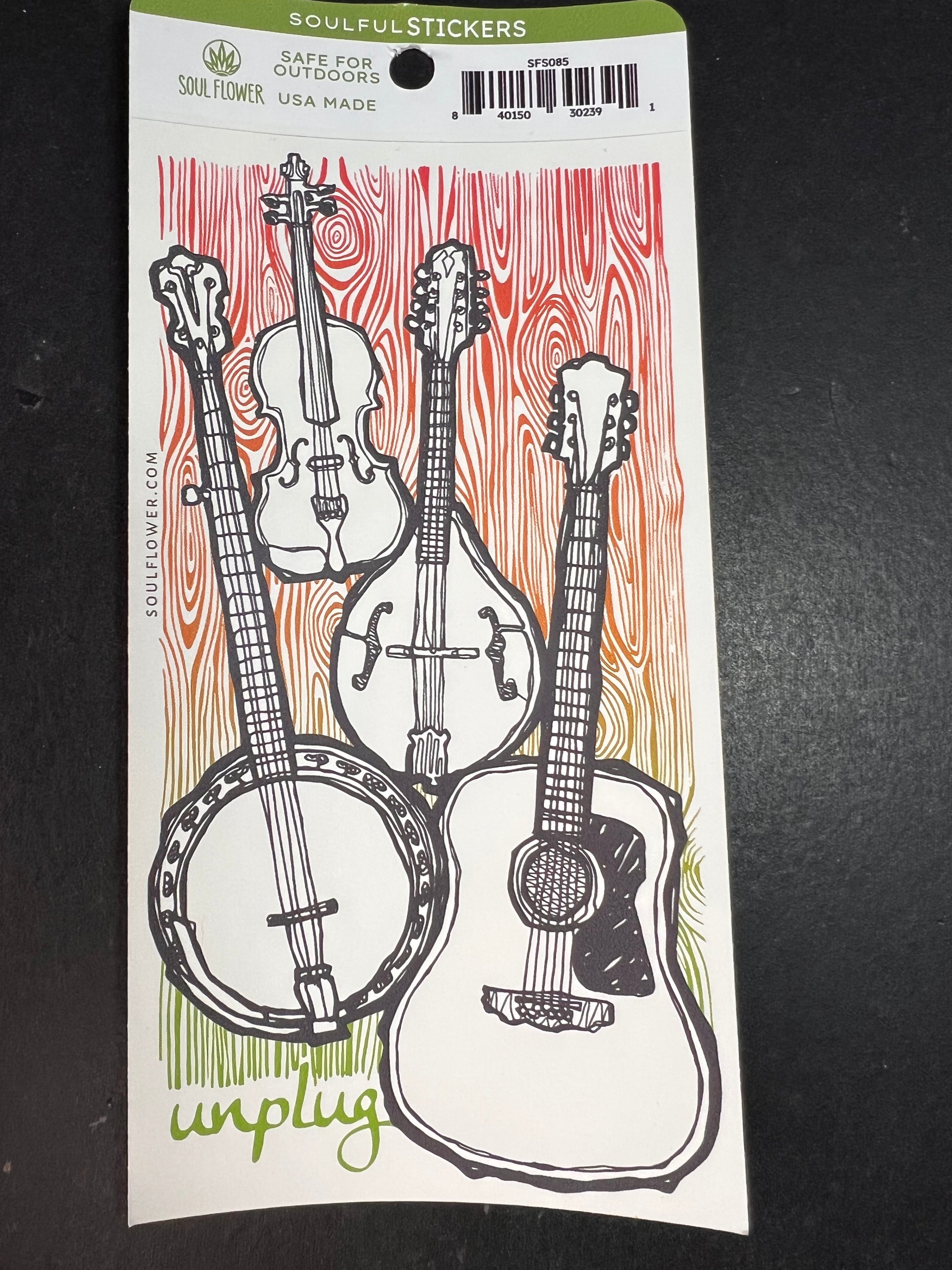 Celebrate acoustic vibes with this soulful sticker featuring hand-drawn string instruments like guitar, banjo, mandolin, violin, and cello. Set against a colorful woodgrain background, it’s perfect for water bottles, laptops, journals, or anywhere you want to add a musical touch.