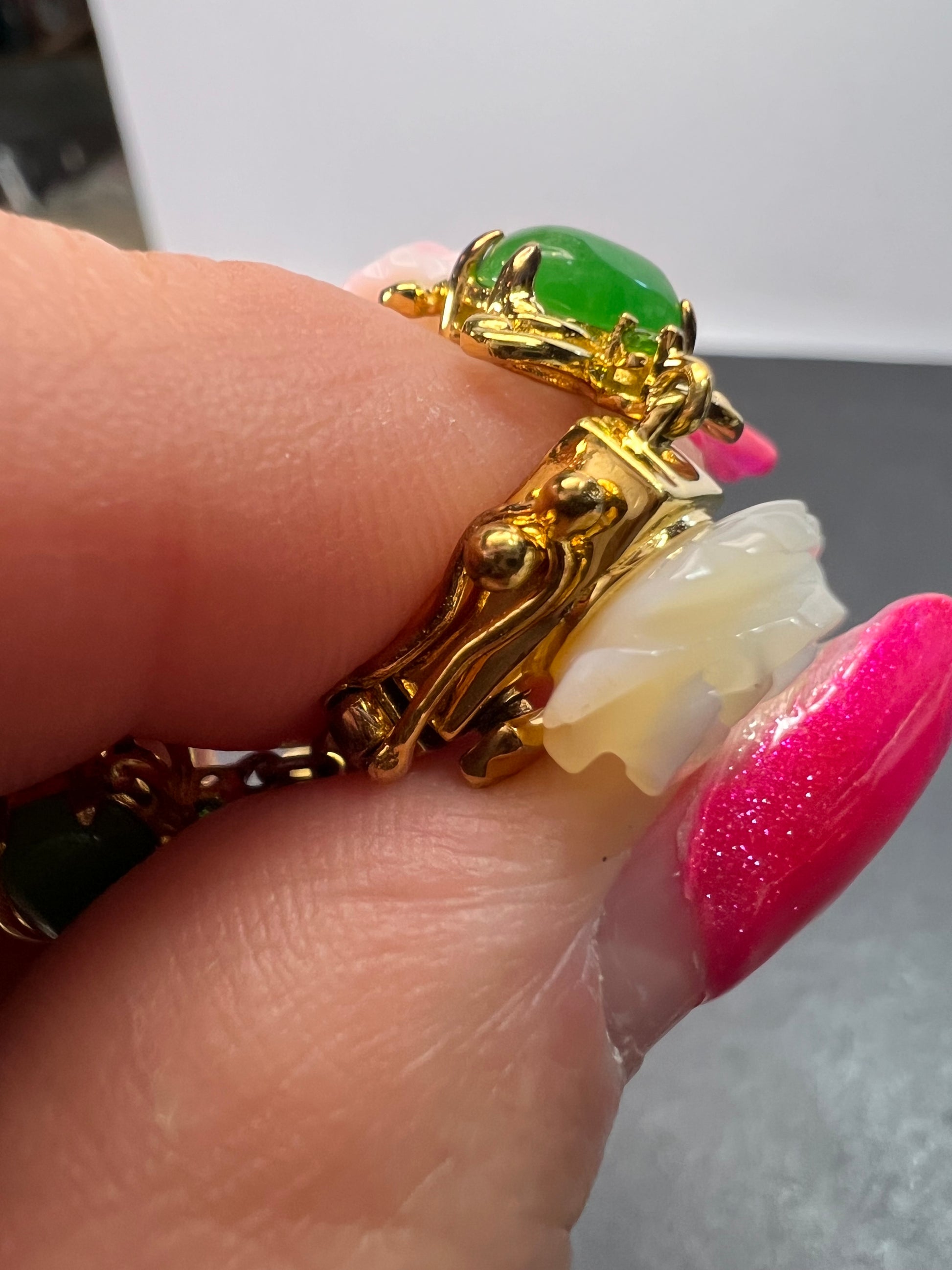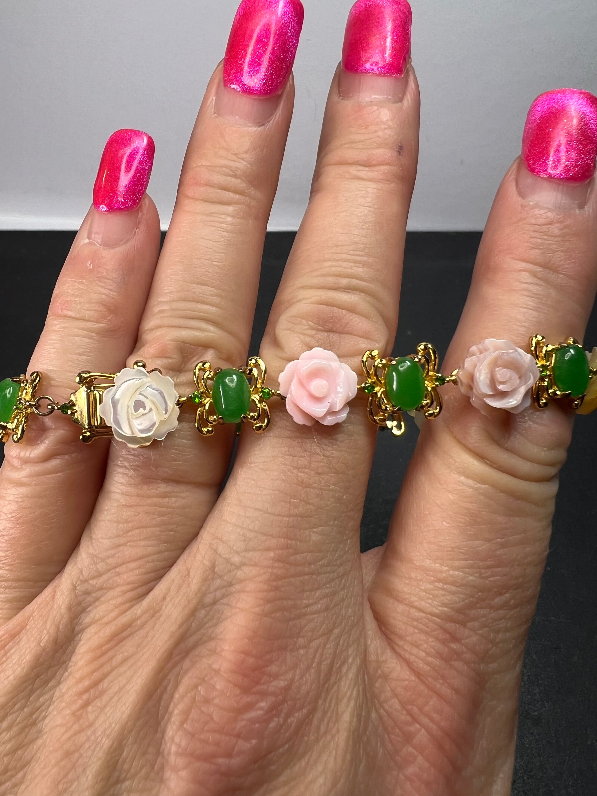 Mother of pearl roses , jade and chrome diopside bracelet in gold over sterling silver 7.5 inches