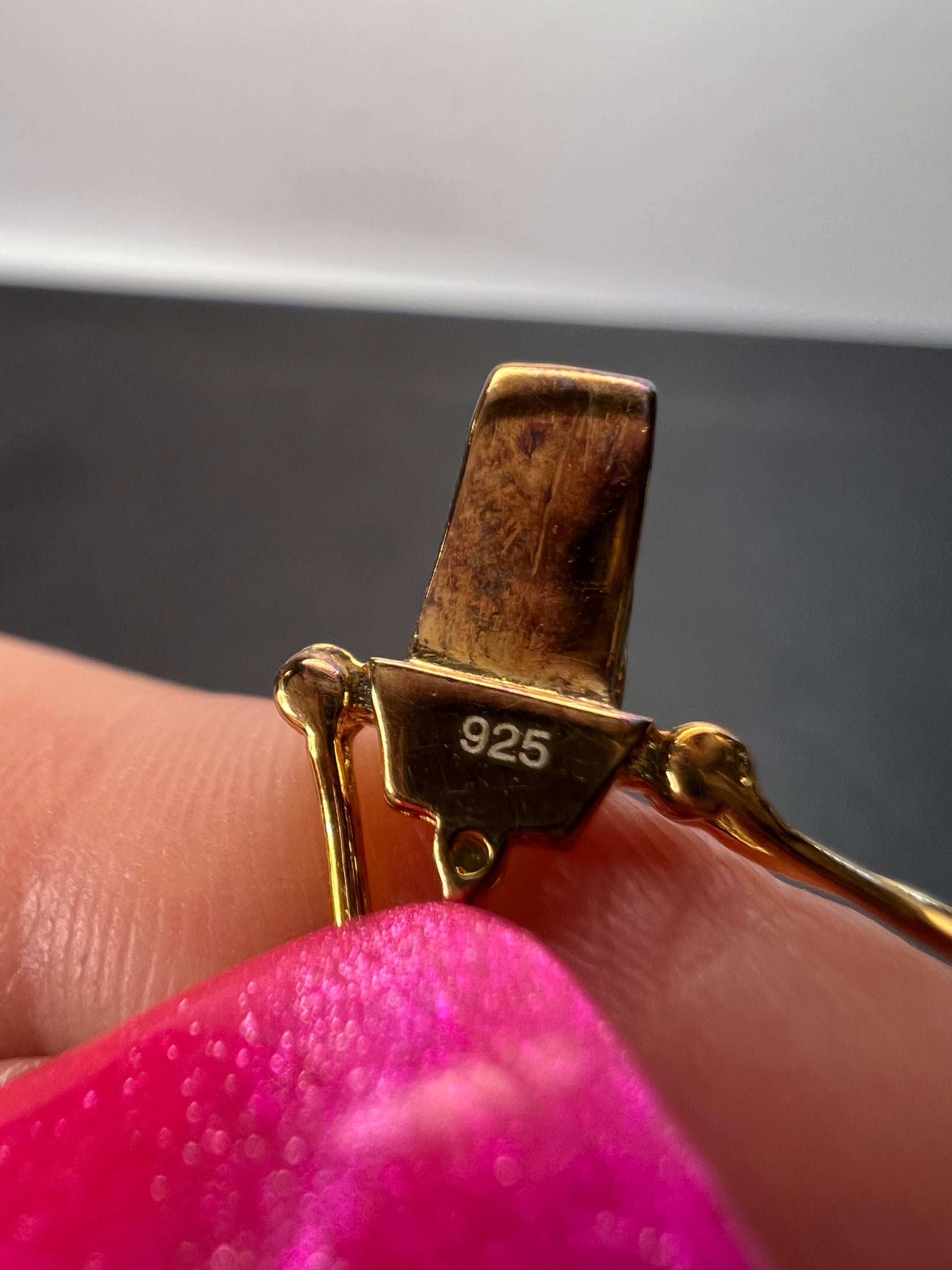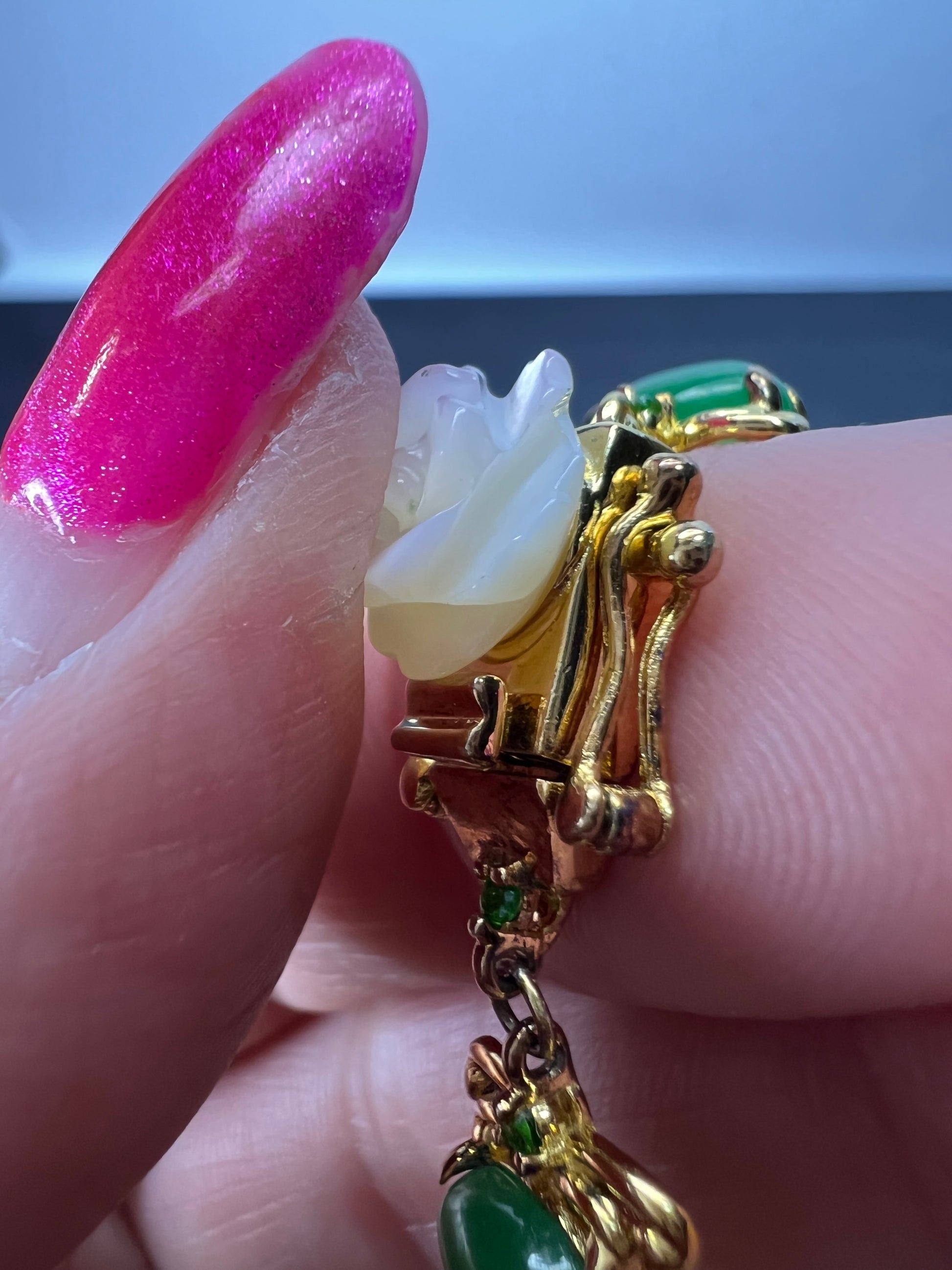 This adorably cute bracelet features carved roses made of white , pink and yellow mother of pearl. Two of the pink roses appear to be carved from a different type of shell, although they test as a stone. The green oval cabochon stones are dyed jade that will glow under UV light. (They glow due to the dye). Tiny green acent gemstones are chrome diopside. Prong set in 14-18k yellow gold plated over sterling silver with a box clasp and two safety snaps. Everything is in perfect working condition with no issues found. Measures about 7.5 inches. 925