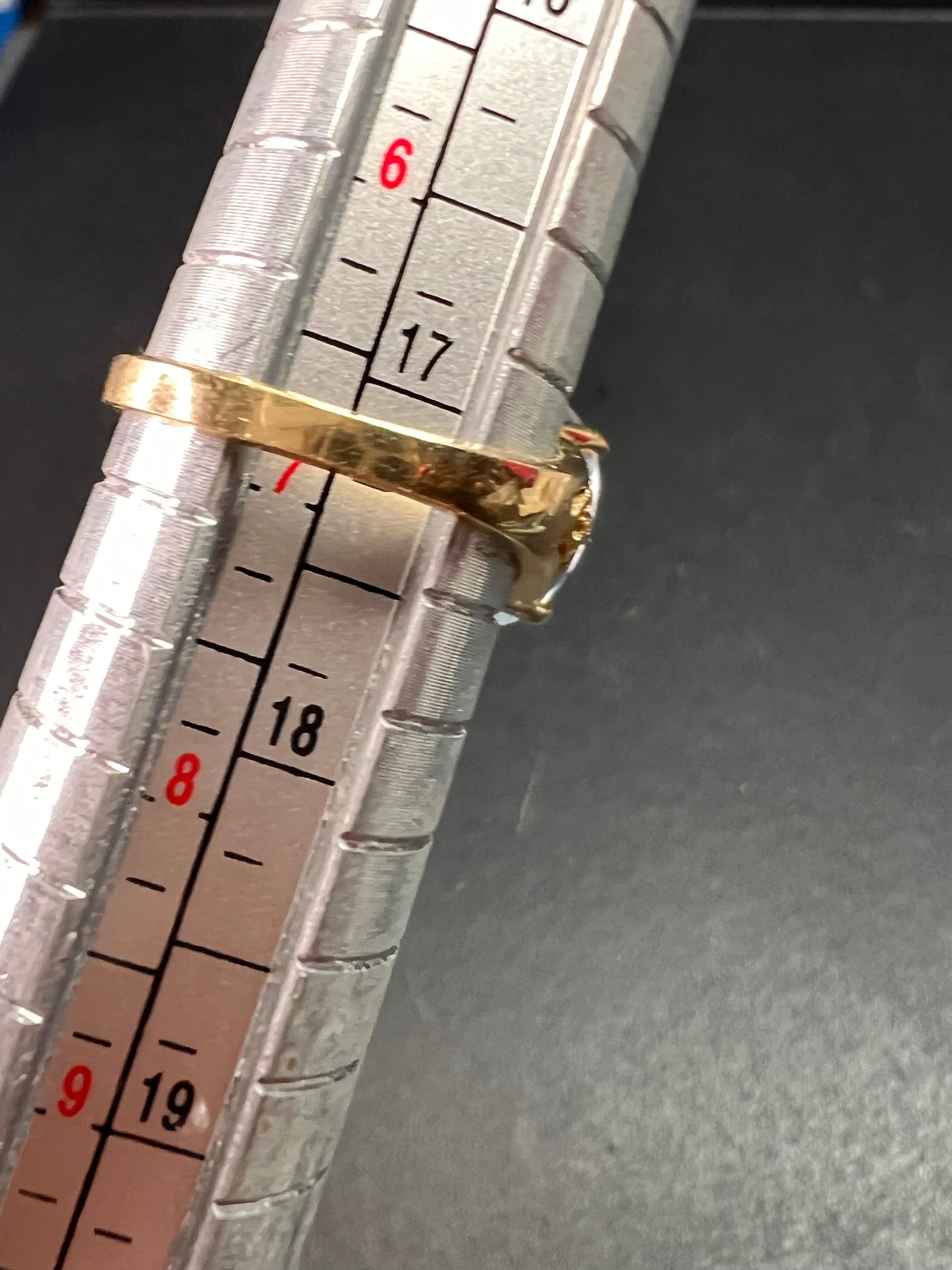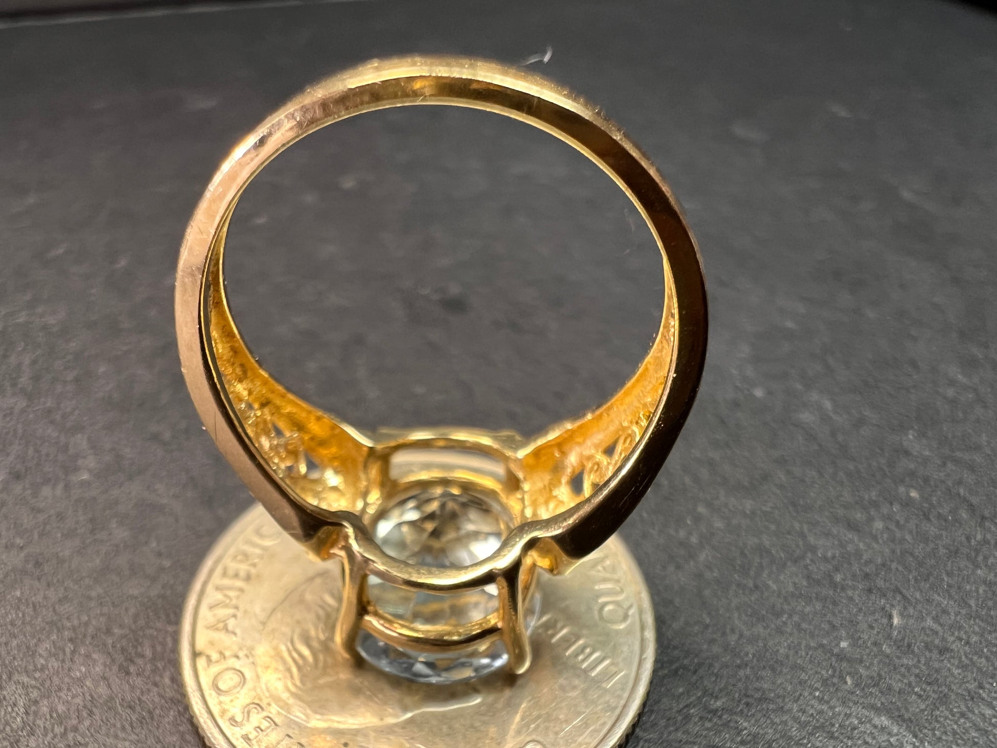 Featuring a striking 9.9mm round-cut aquamarine set in solid 14K yellow gold. The 4.10-gram setting has ornate filigree shoulders and a raised open gallery that lets light pour through the gem, creating beautiful sparkle. Stamped and tested 14k. Unable to read hallmark. Elegant and timeless, this piece makes a beautiful statement or March birthstone gift. Size 7.