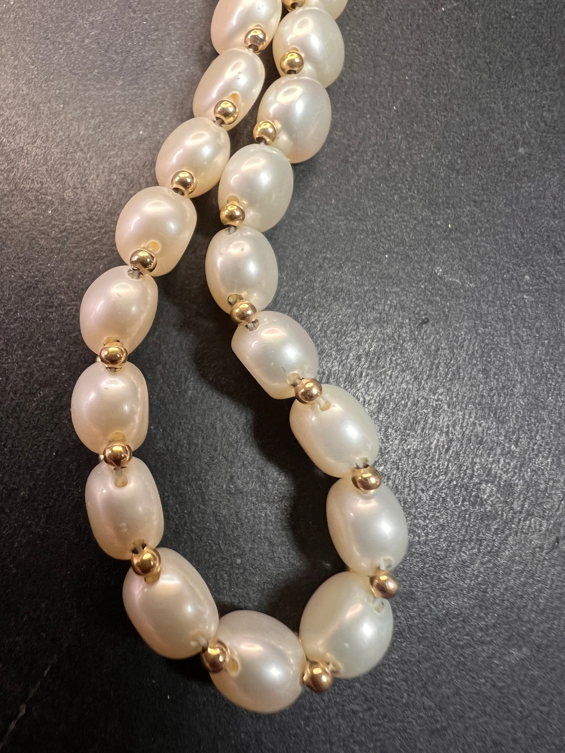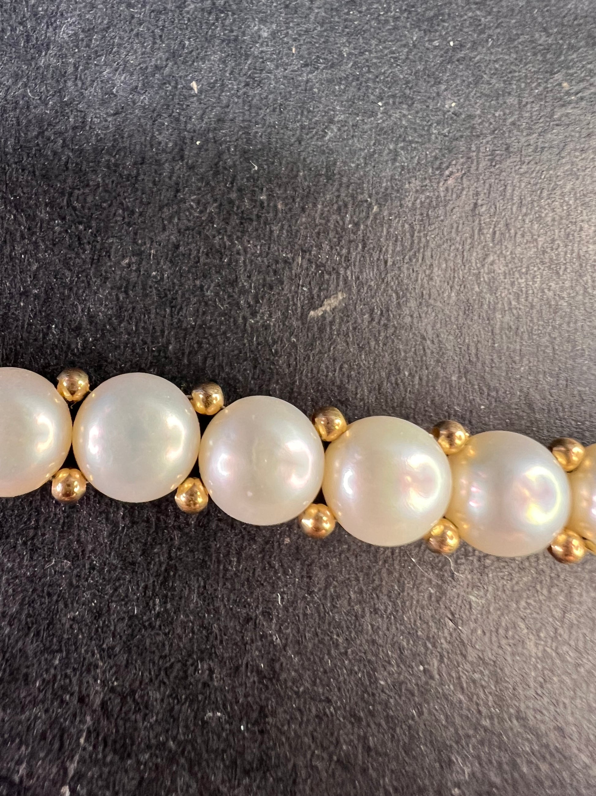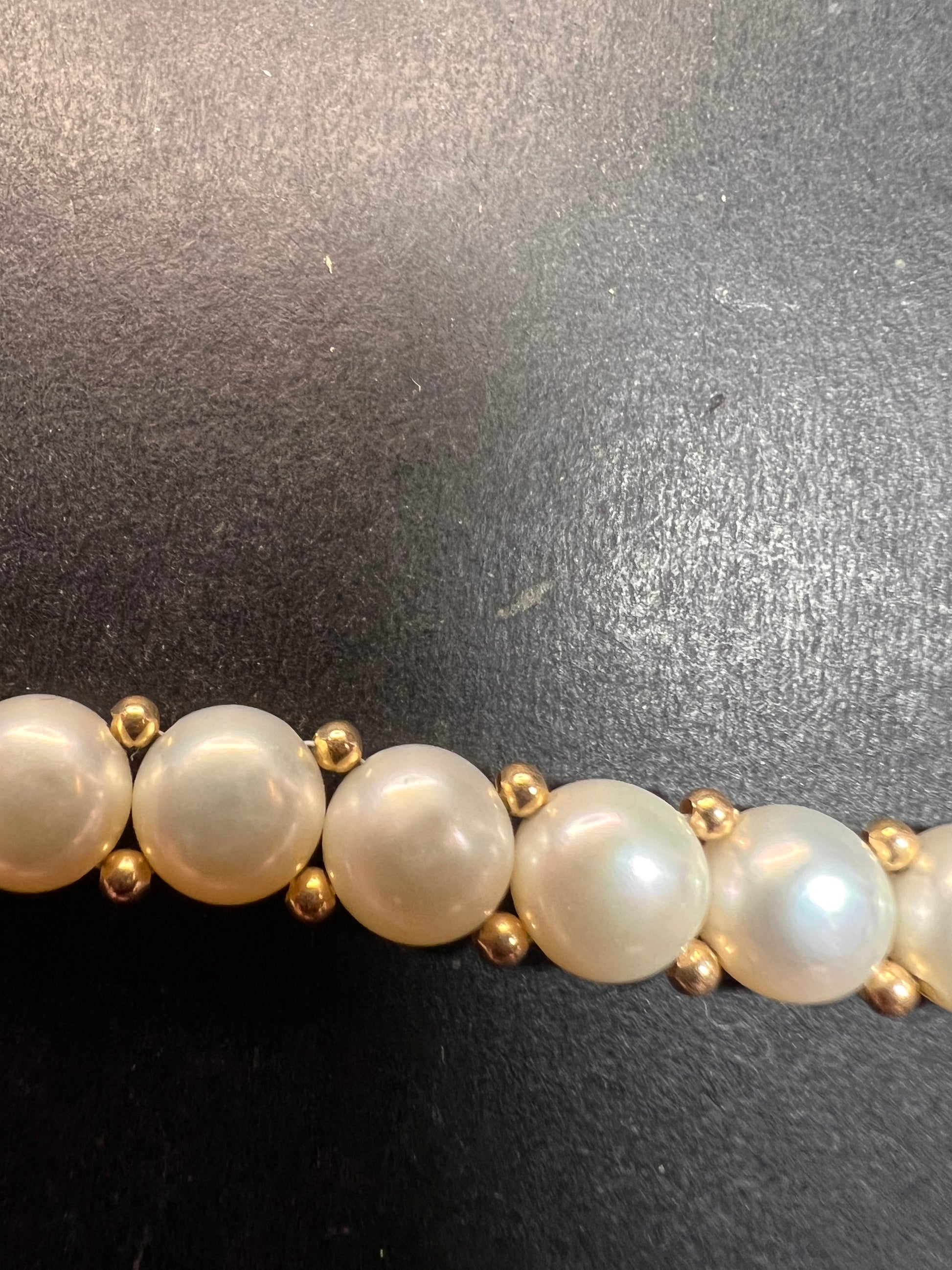 Genuine white freshwater 7mm coin pearls measuring about 7.25 inches in length with 14k yellow gold spacer beads and rounded box clasp. Unfamiliar with hallmark stamp. Acid tested for purity verification. Total weight is 9.57 grams.