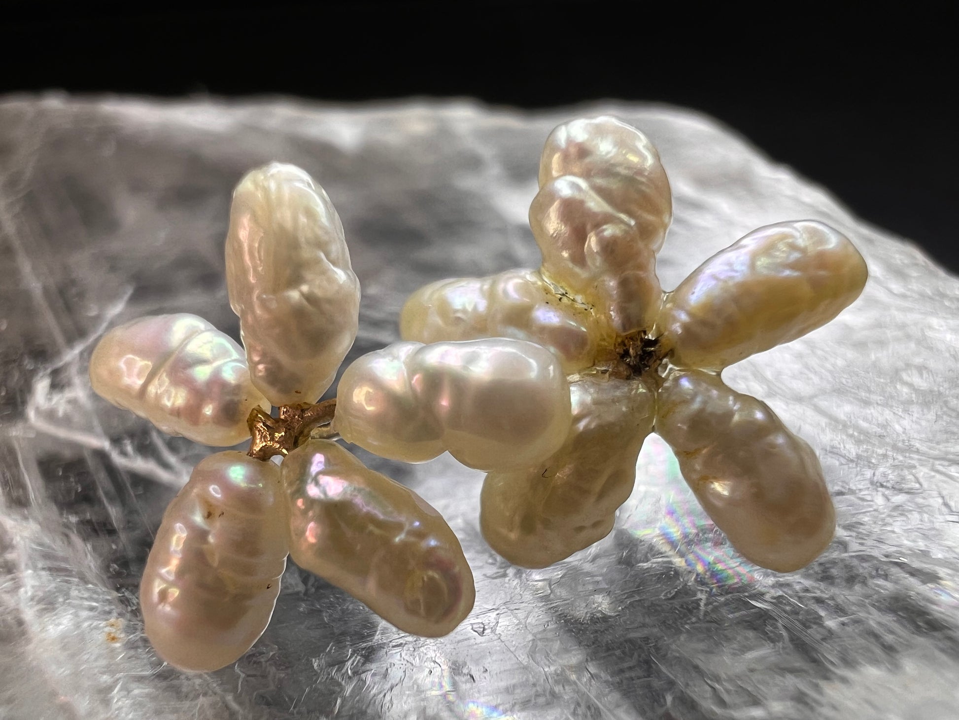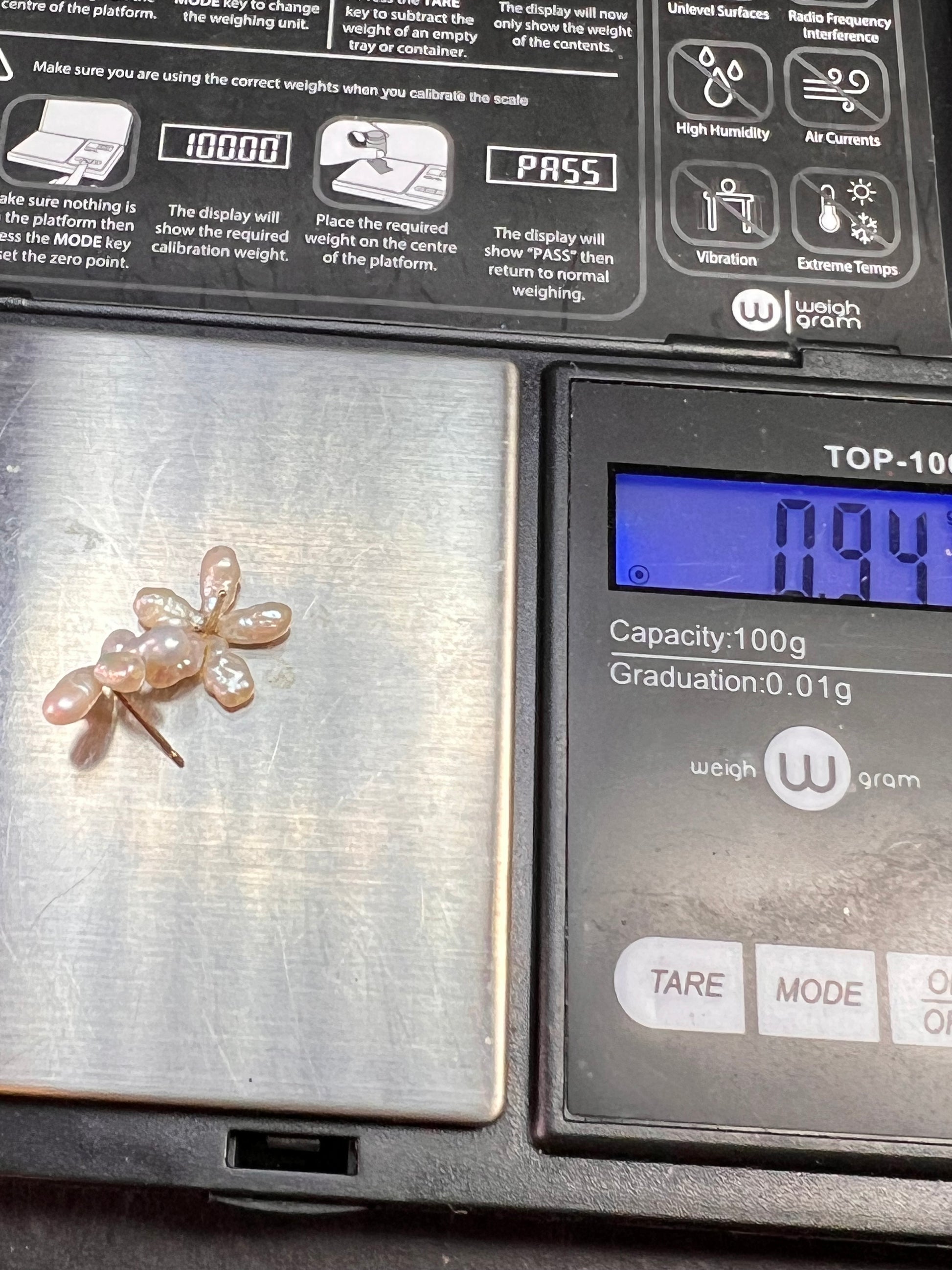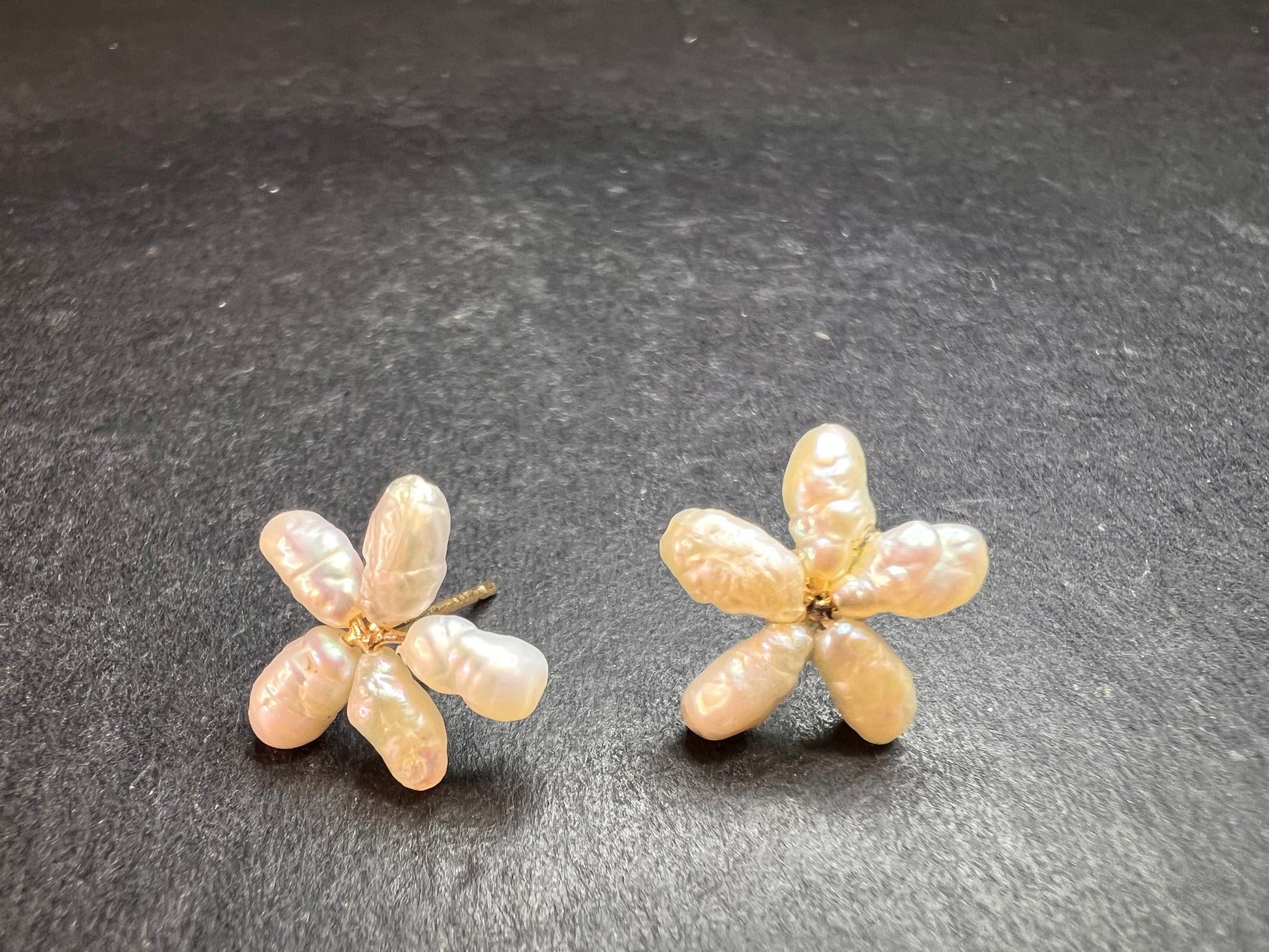 Vintage 14k yellow gold freshwater pearl flower stud earrings, acid tested for metal purity verification. Each earring features five baroque freshwater pearls arranged in a sweet flower design with soft, natural iridescence. The flowers measure about 18–19mm (≈0.7 in) across based on the ruler photo. Combined total weight for the pair is approximately 0.94 grams as shown on the scale. Posts are solid 14k yellow gold. Original backs are not included, so you can pair them with your preferred earring backs. Lovely vintage pearls for everyday wear, bridal looks, or a romantic floral accent.