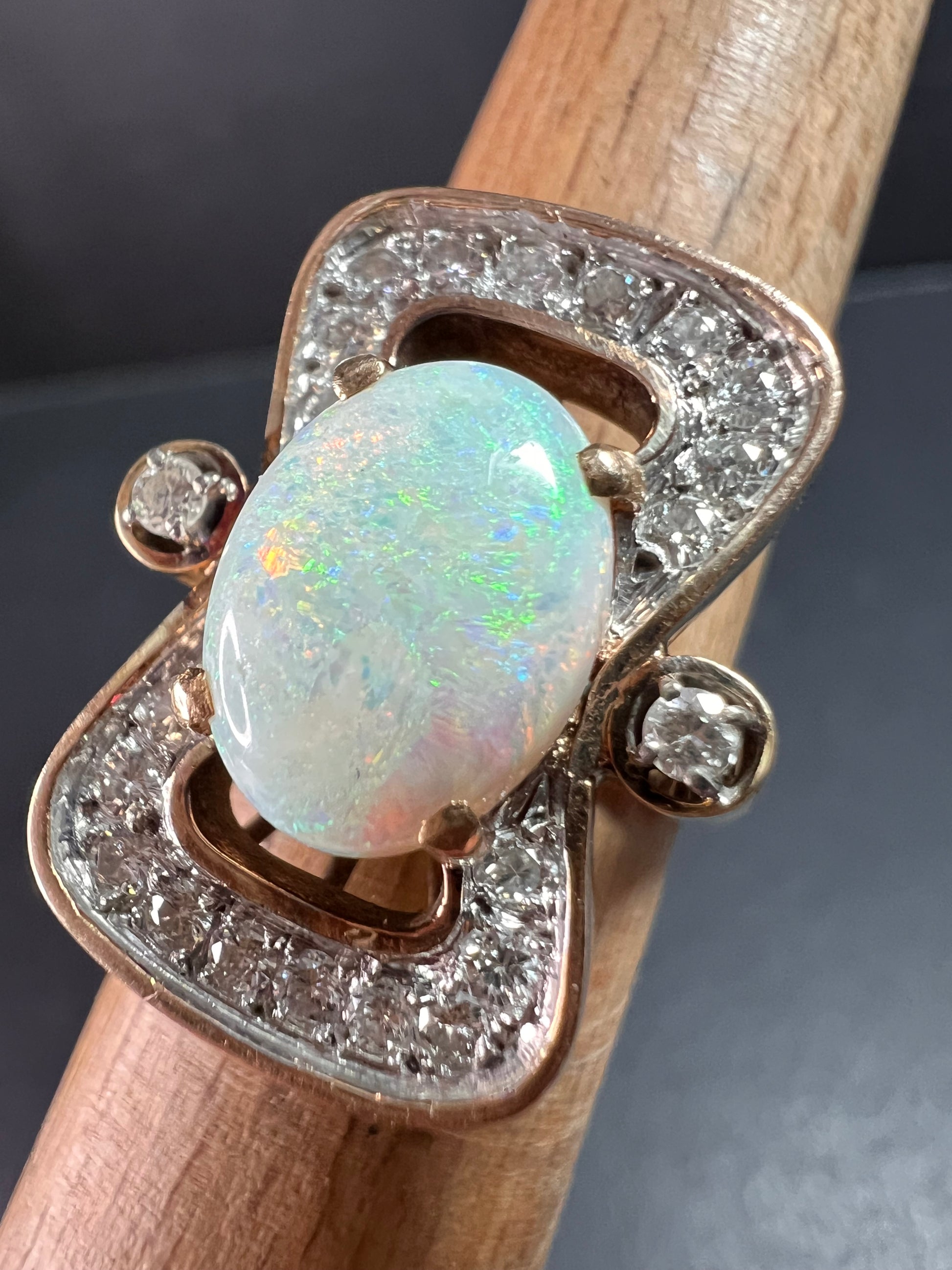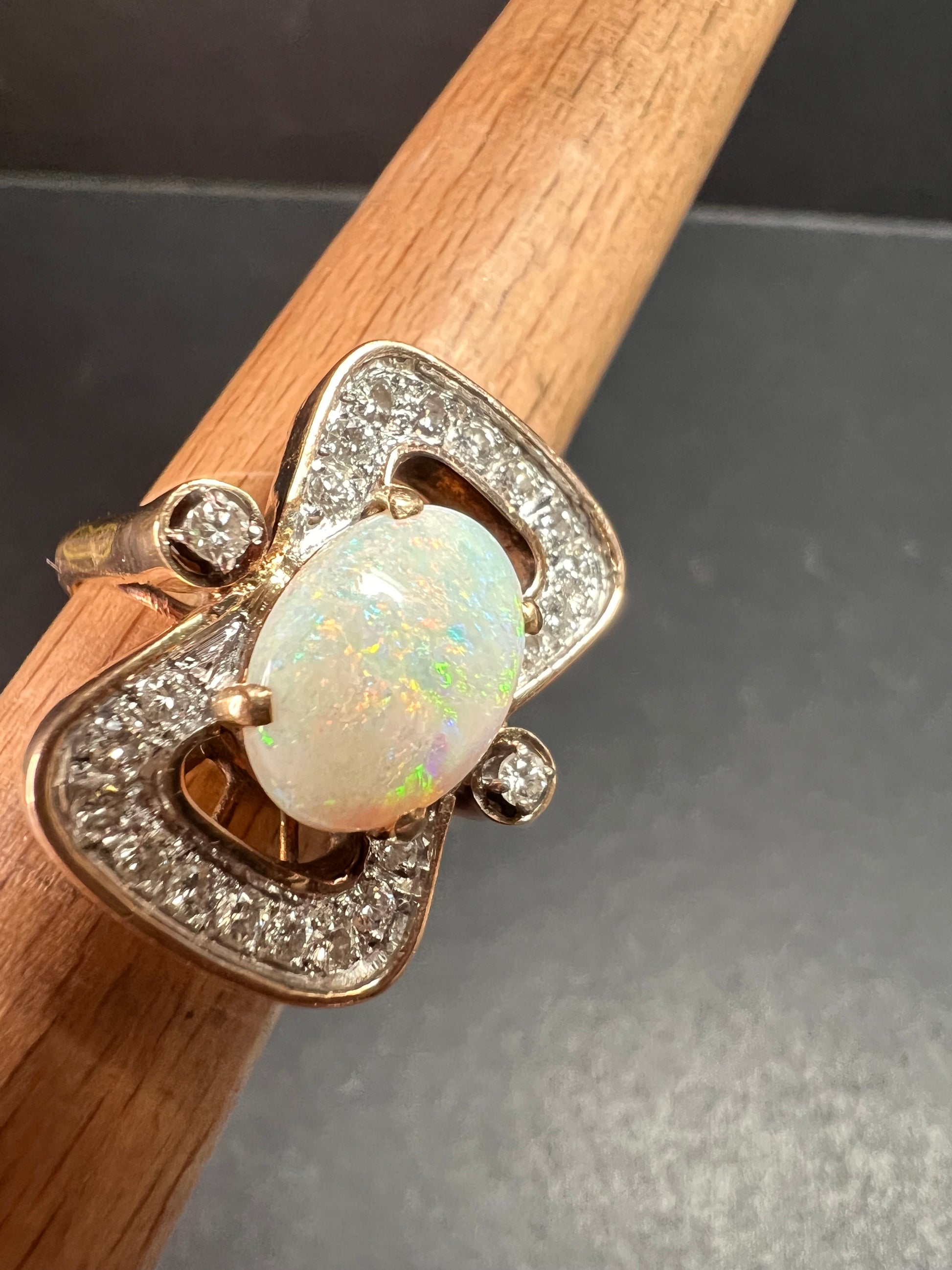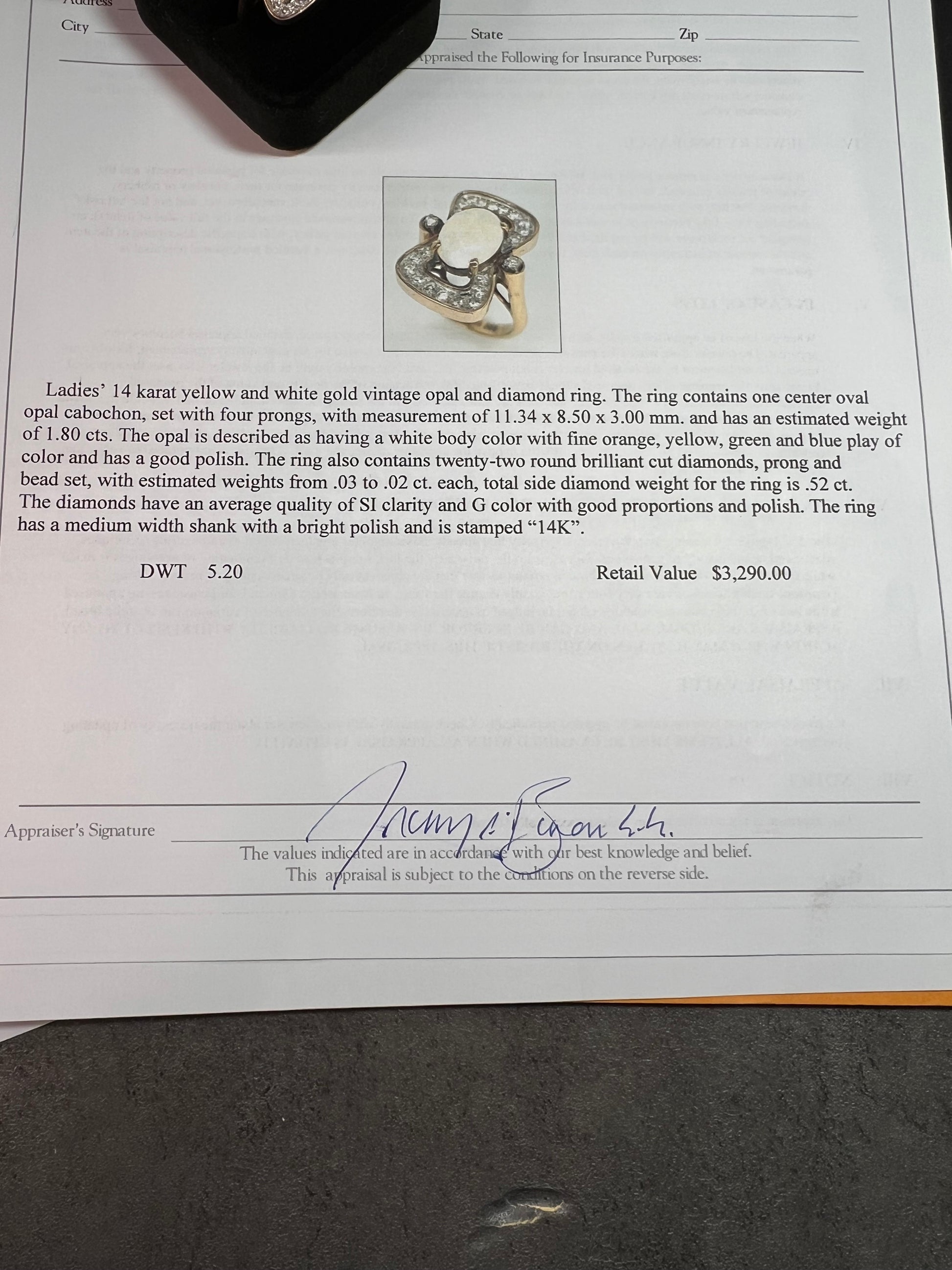 Elegant vintage 14K yellow and white gold opal and diamond ring from the 1960s–1970s era, weighing 8.38 grams and measuring approximately a size 6.5. The centerpiece is a likely Australian natural opal cabochon measuring 11.34 × 8.50 × 3.00 mm, with an estimated weight of 1.80 cts and vivid play-of-color in orange, yellow, green, and blue. It is framed by twenty-two round brilliant diamonds and two larger accent diamonds, totaling an estimated .52 ct (SI clarity, G color). This sculptural retro design is stamped “14K” and presents beautifully. This is a papered piece of fine jewelry, accompanied by a professional appraisal certificate that authenticates its quality and lists a retail value of $3,290.