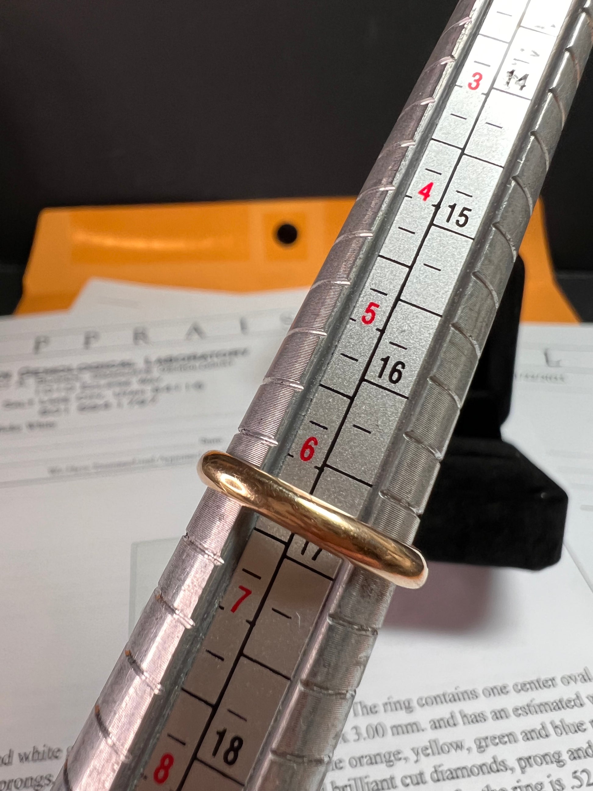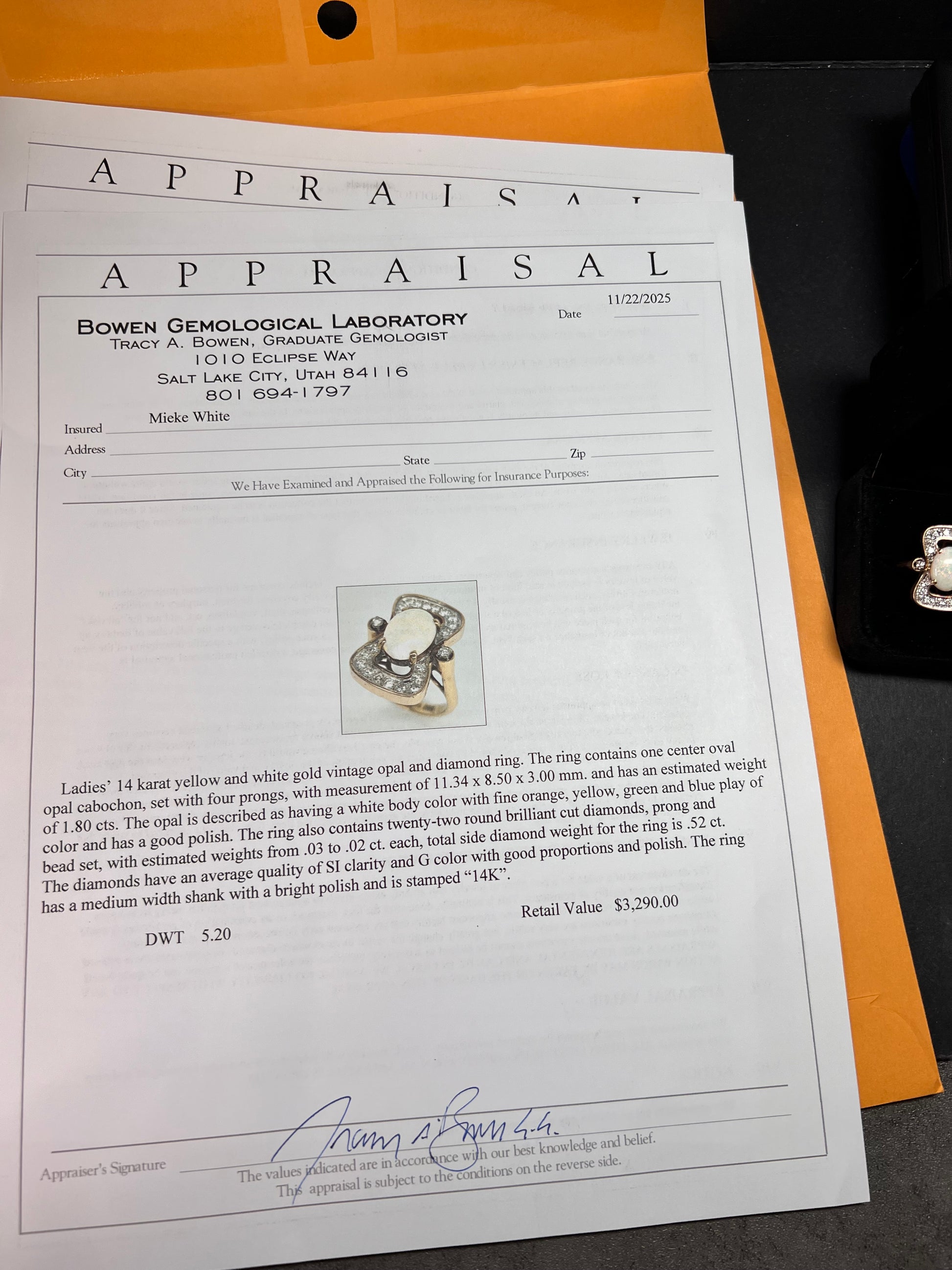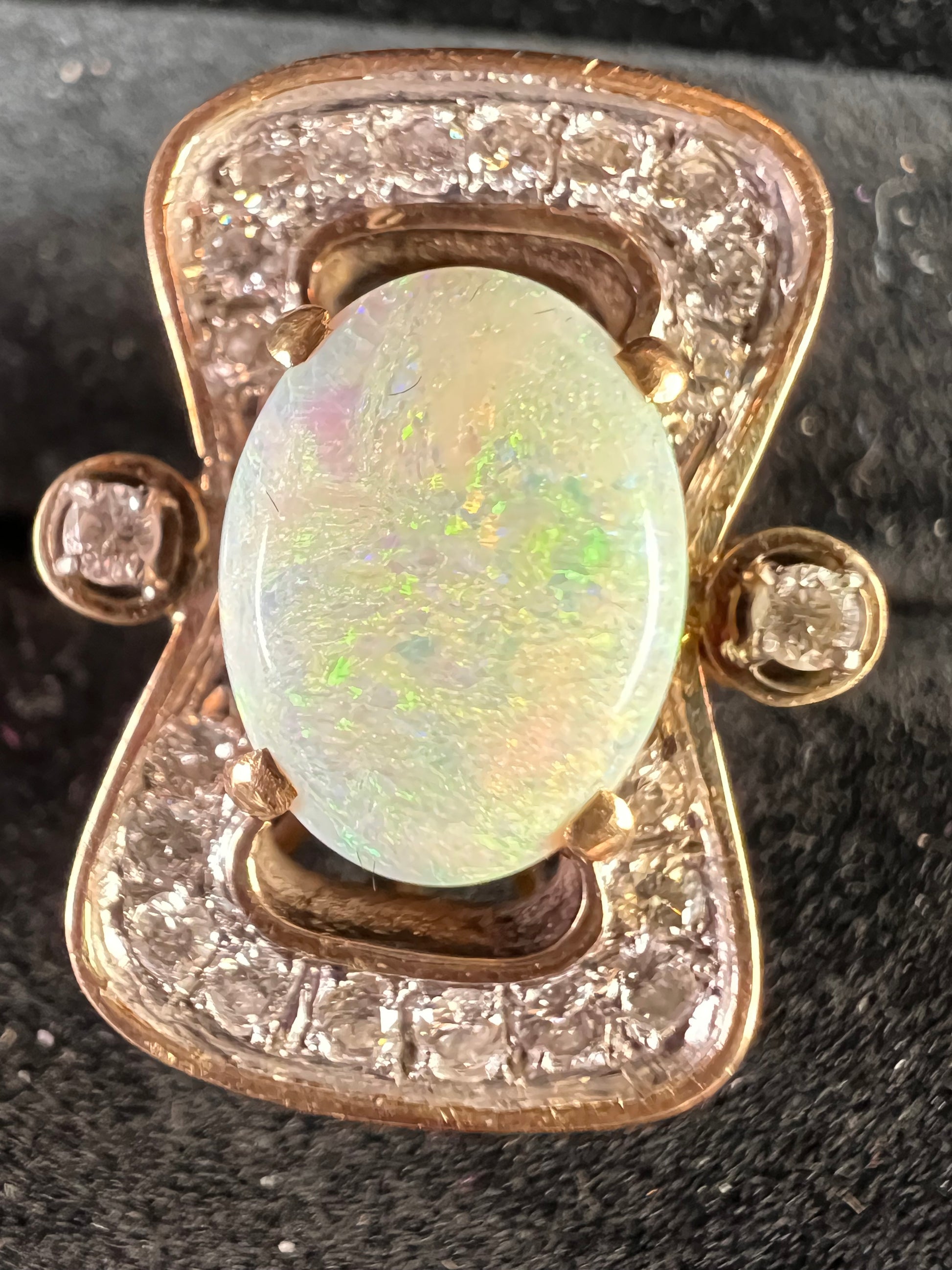 Elegant vintage 14K yellow and white gold opal and diamond ring from the 1960s–1970s era, weighing 8.38 grams and measuring approximately a size 6.5. The centerpiece is a likely Australian natural opal cabochon measuring 11.34 × 8.50 × 3.00 mm, with an estimated weight of 1.80 cts and vivid play-of-color in orange, yellow, green, and blue. It is framed by twenty-two round brilliant diamonds and two larger accent diamonds, totaling an estimated .52 ct (SI clarity, G color). This sculptural retro design is stamped “14K” and presents beautifully. This is a papered piece of fine jewelry, accompanied by a professional appraisal certificate that authenticates its quality and lists a retail value of $3,290.