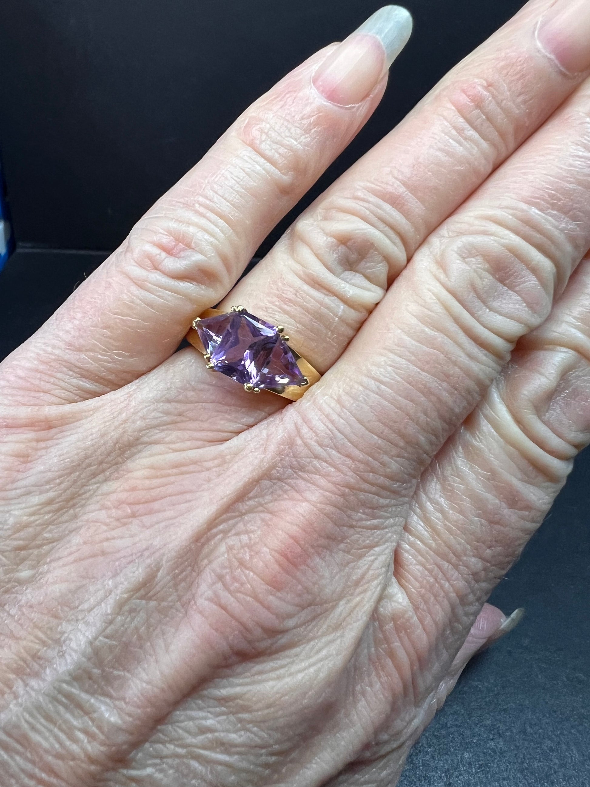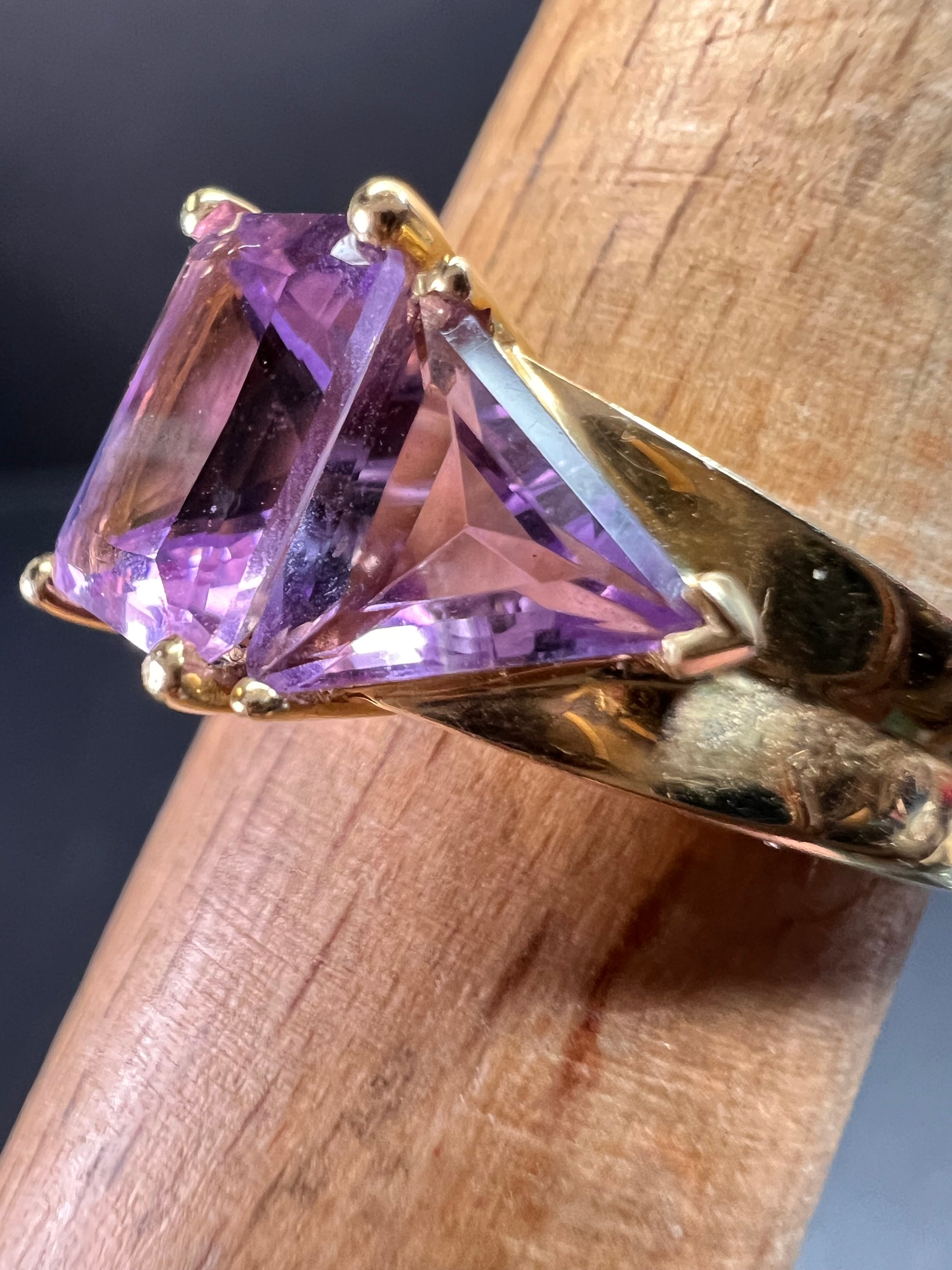 Vintage Ross-Simons 14K Yellow Gold Trillion Cut Amethyst Three-Stone Ring – Modernist Design, Size 7