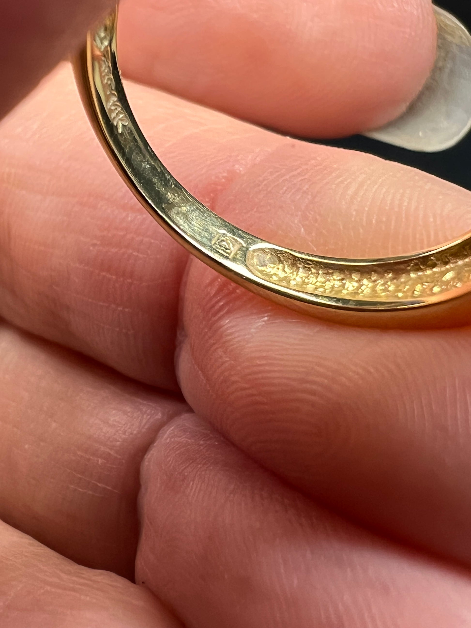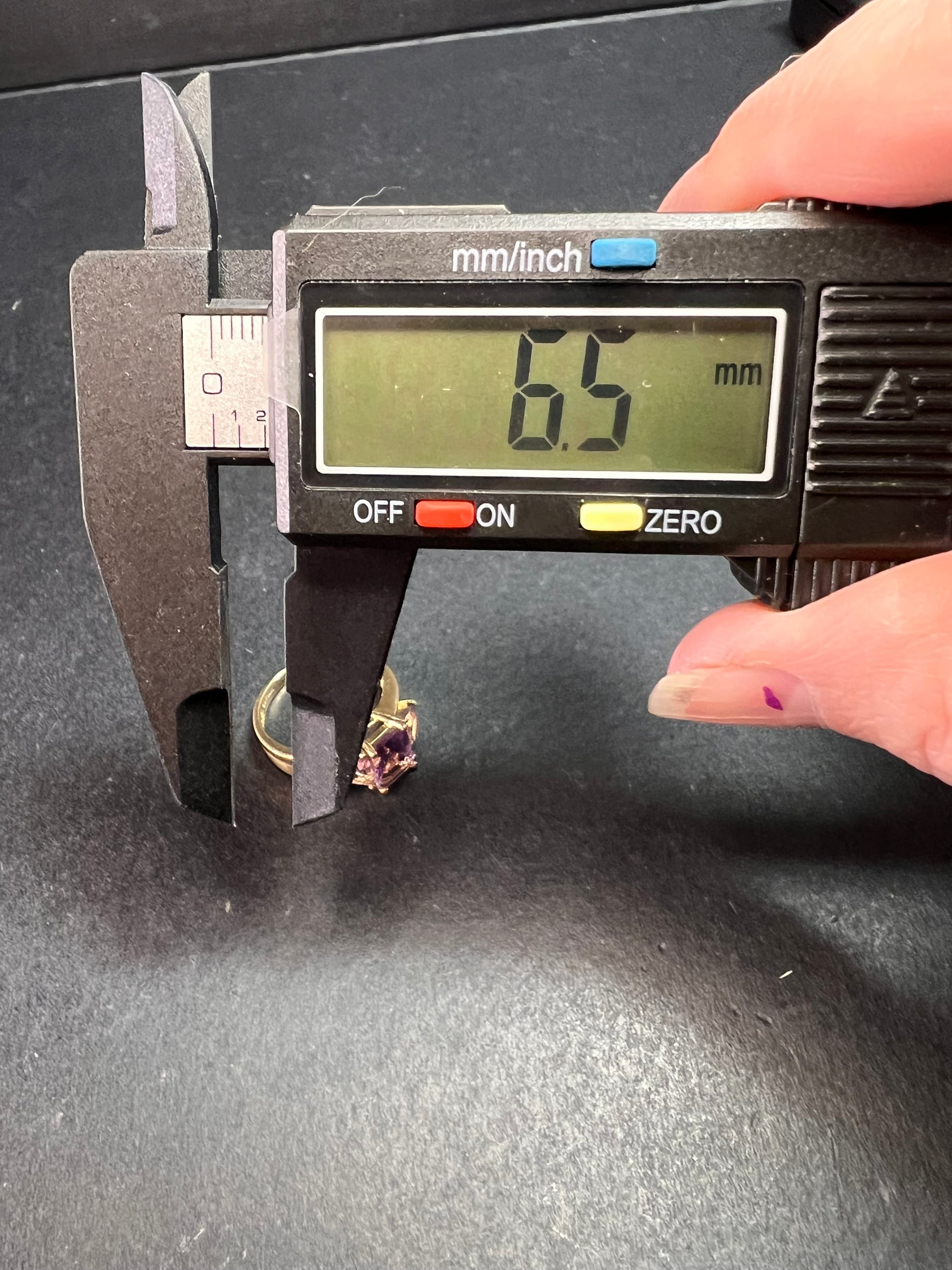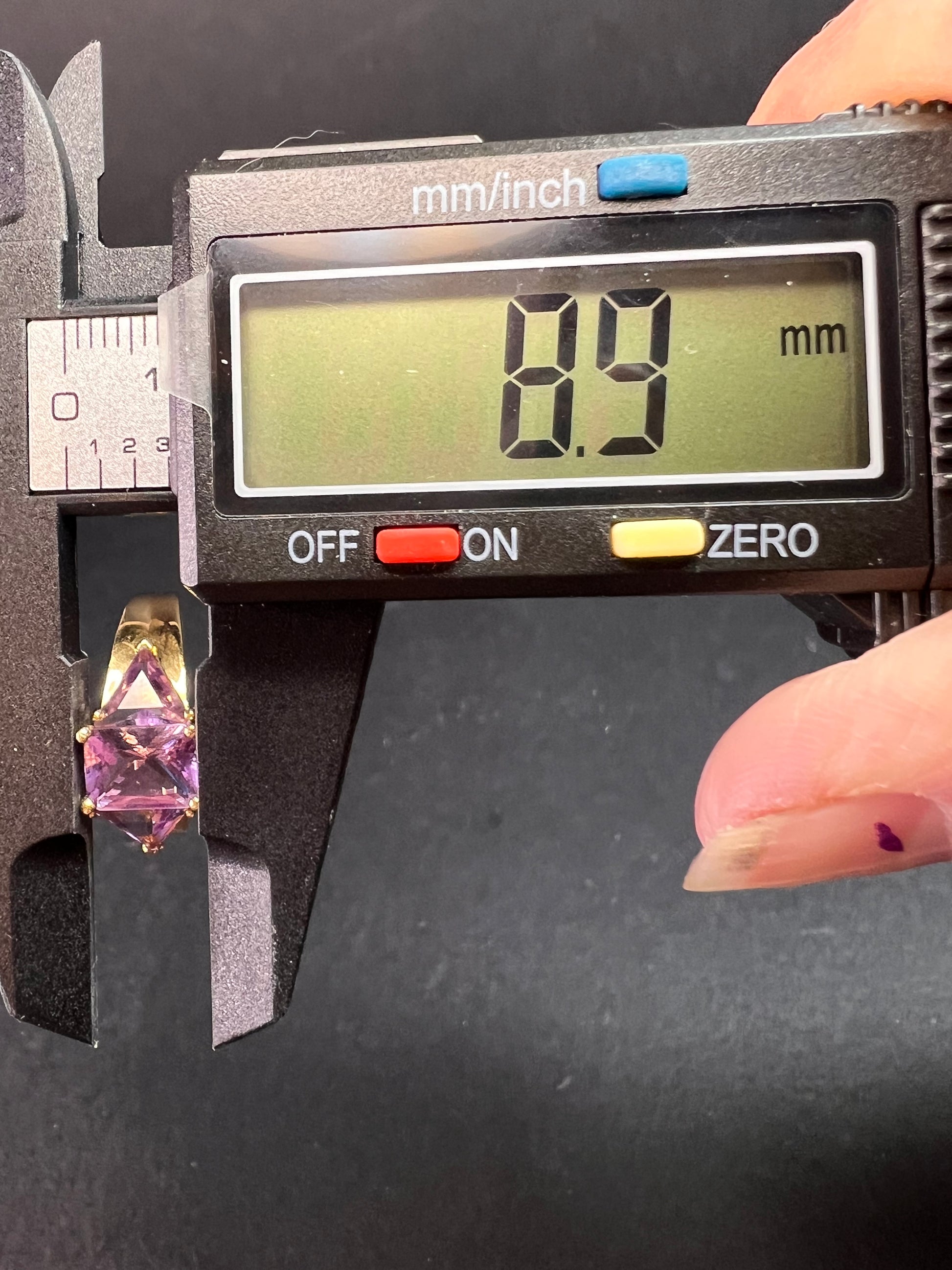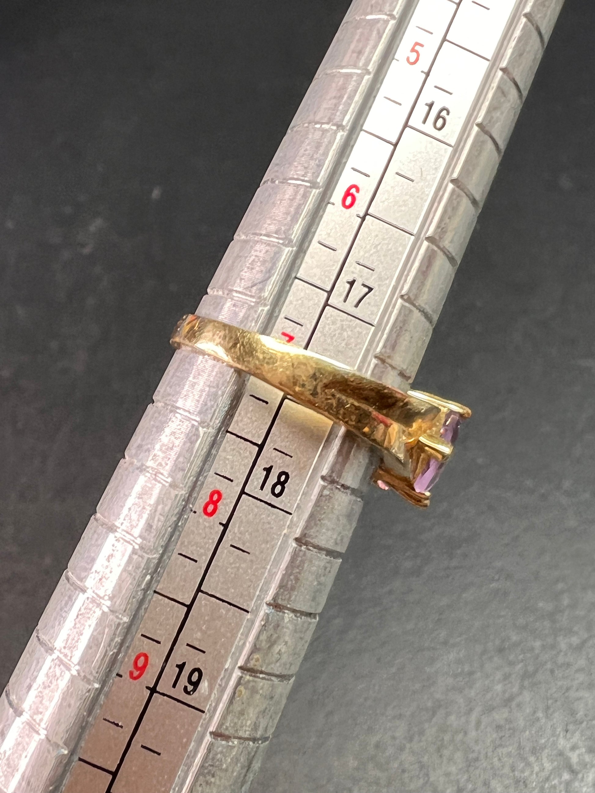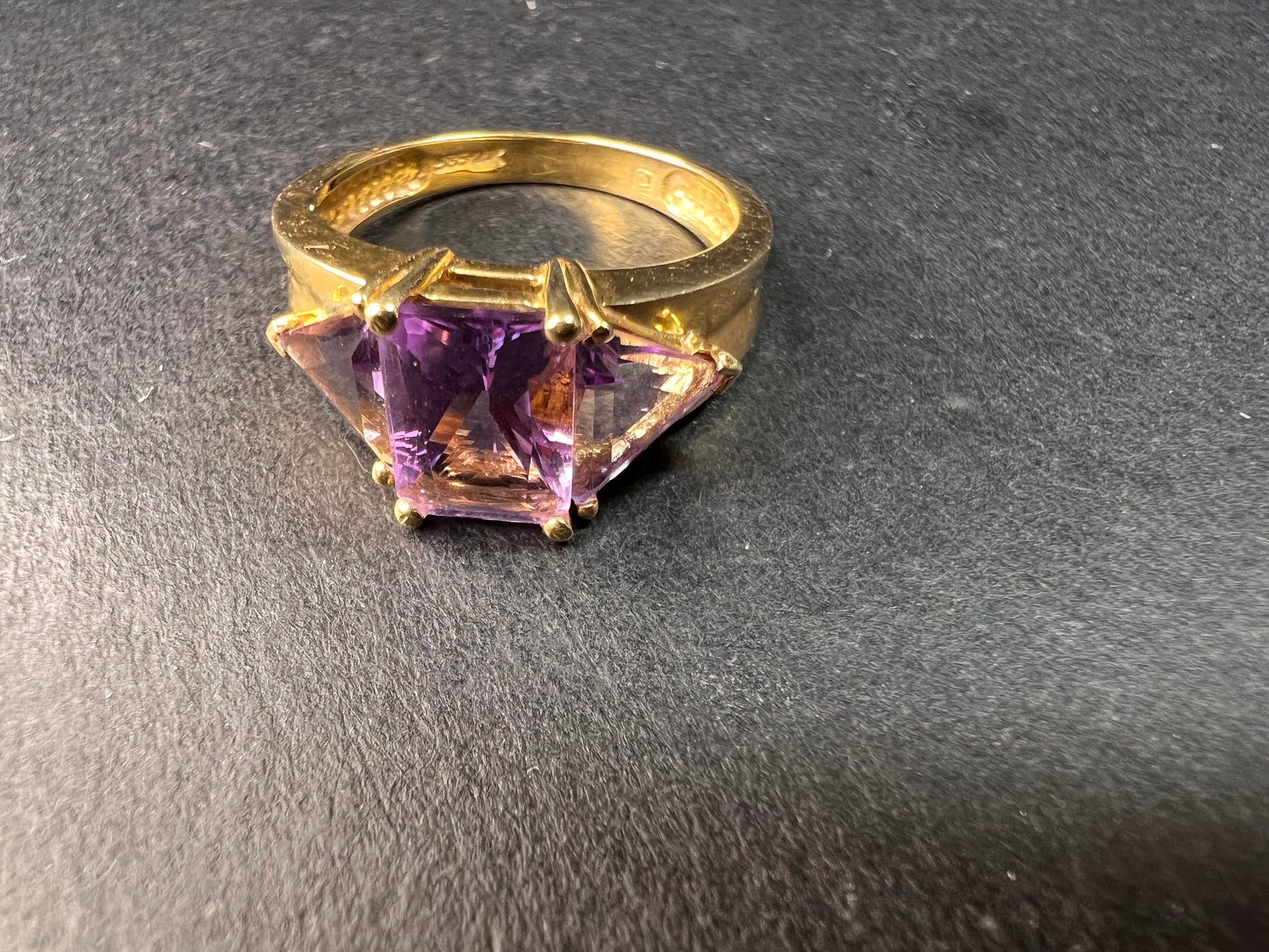 Pre-owned vintage Ross-Simons 14K yellow gold ring featuring three rich purple trillion-cut amethyst gemstones set in a bold geometric design. The hallmark inside the band shows the distinct “RS” maker’s mark used by Ross-Simons during the late 1980s–1990s, alongside a clear 14K gold stamp.