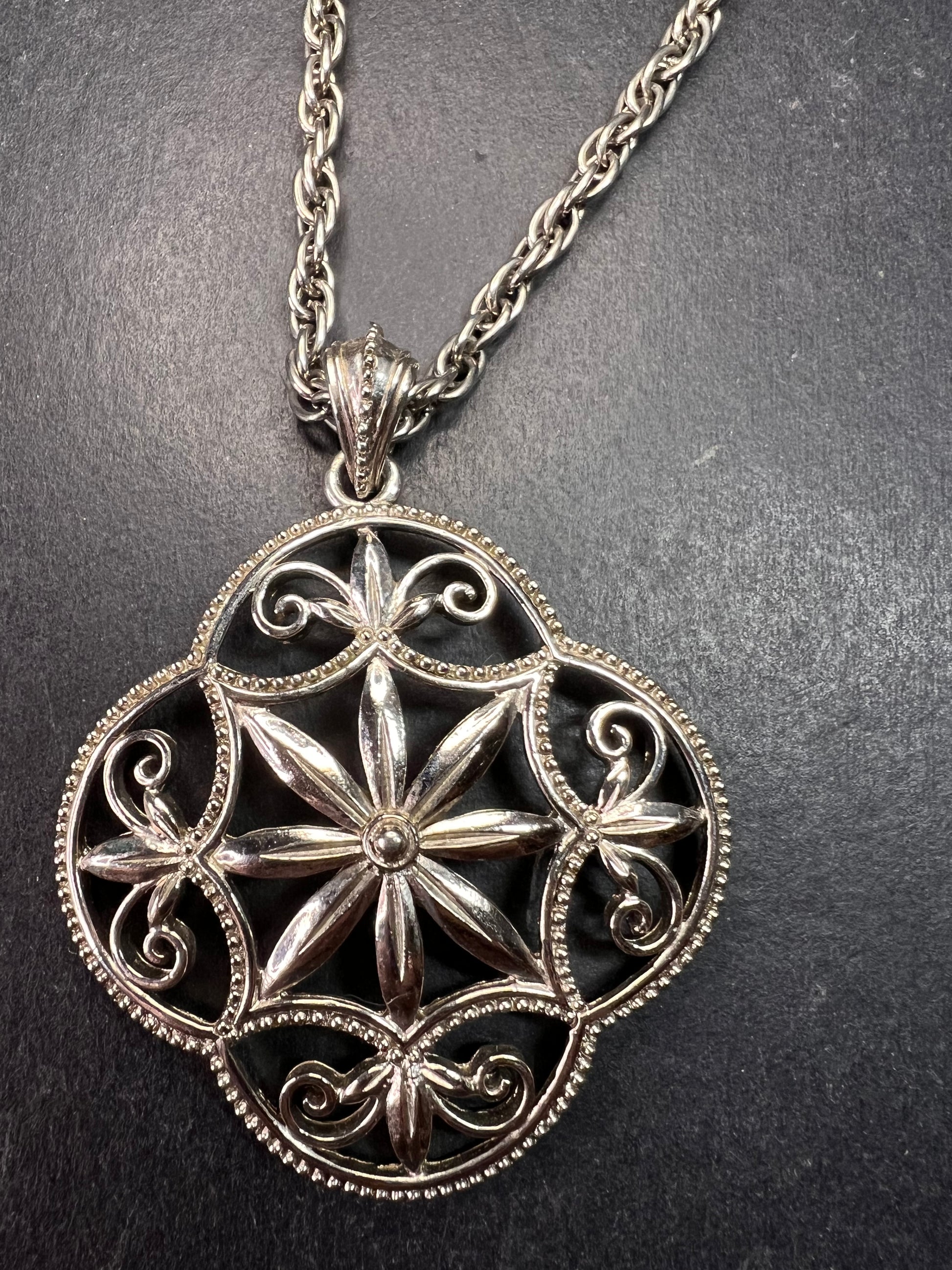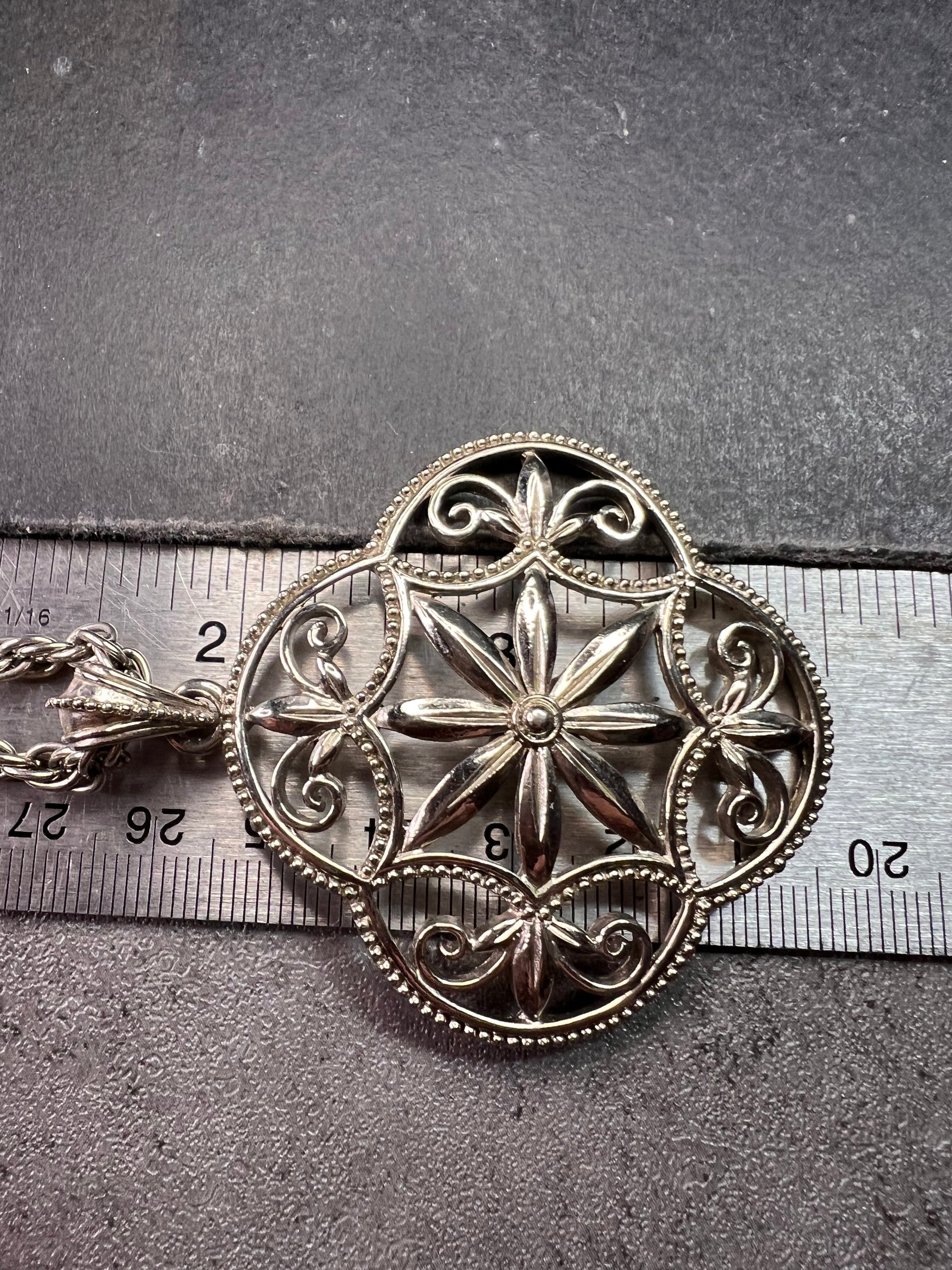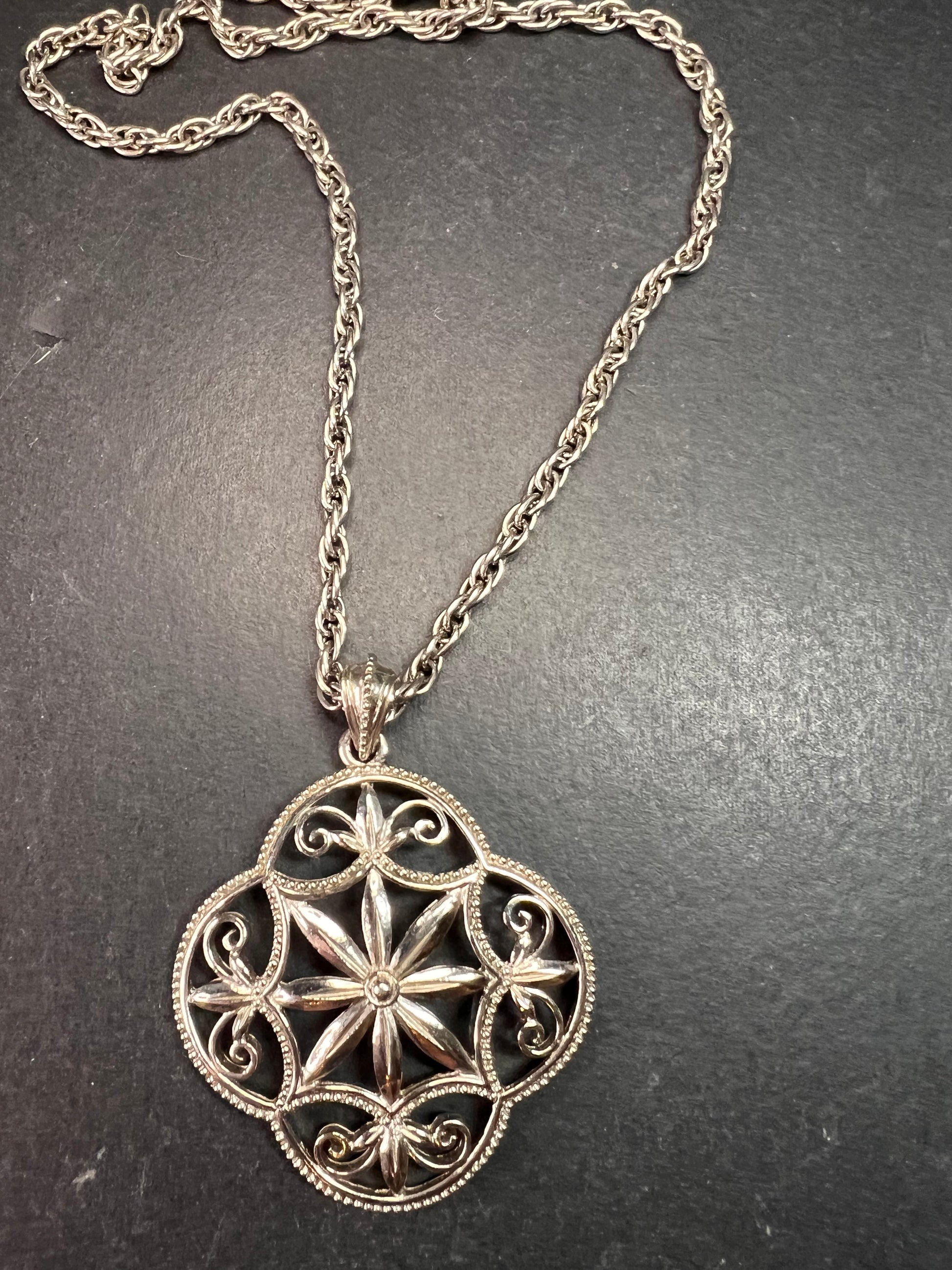 Vintage 1928 Silver Tone Filigree Medallion Rope Chain Necklace 28”