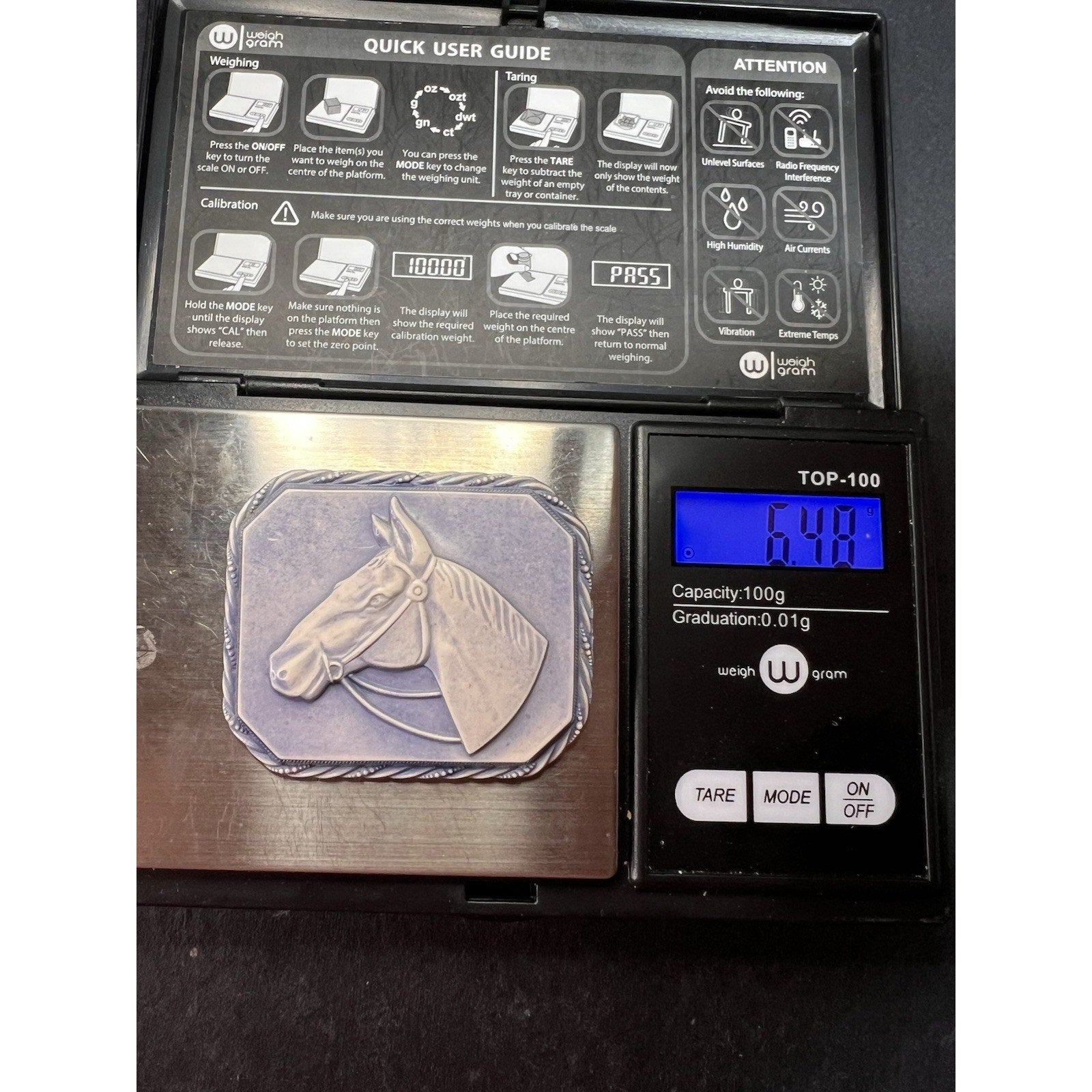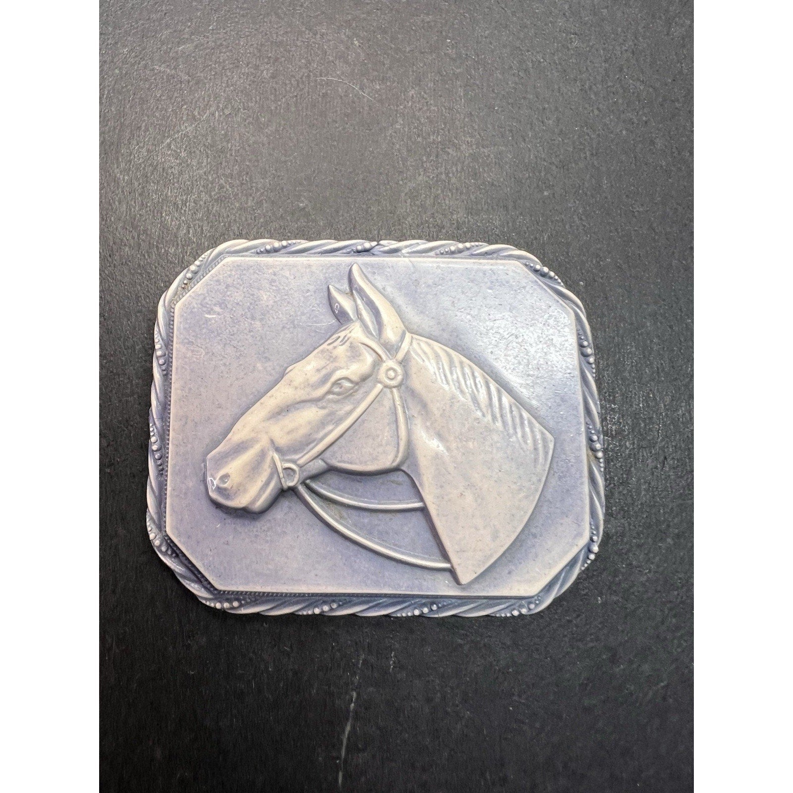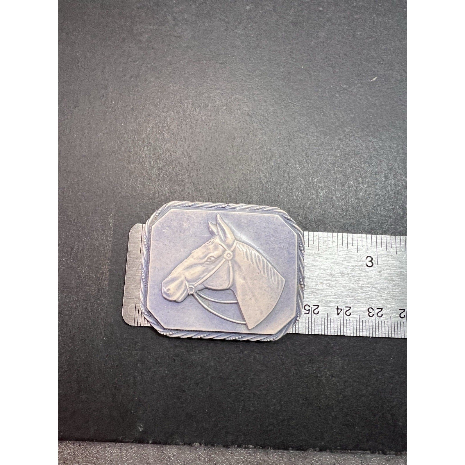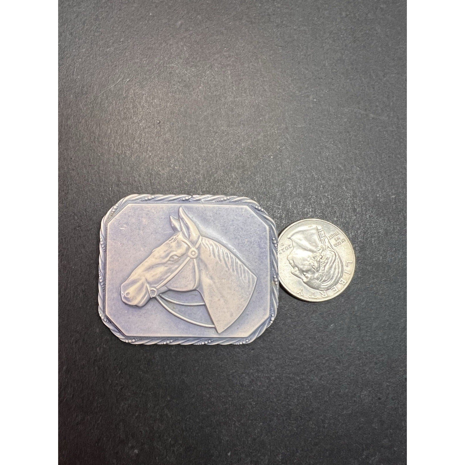 This vintage 1940's celluloid horse head brooch/pin features a unique blue square design, perfect for those who appreciate retro fashion. Measuring 2 inches, retro-themed pin, adding a touch of nostalgia to an outfit. The vintage piece is a charming addition to any jewelry collection, especially for those who appreciate unique equestrian and eye-catching accessories.