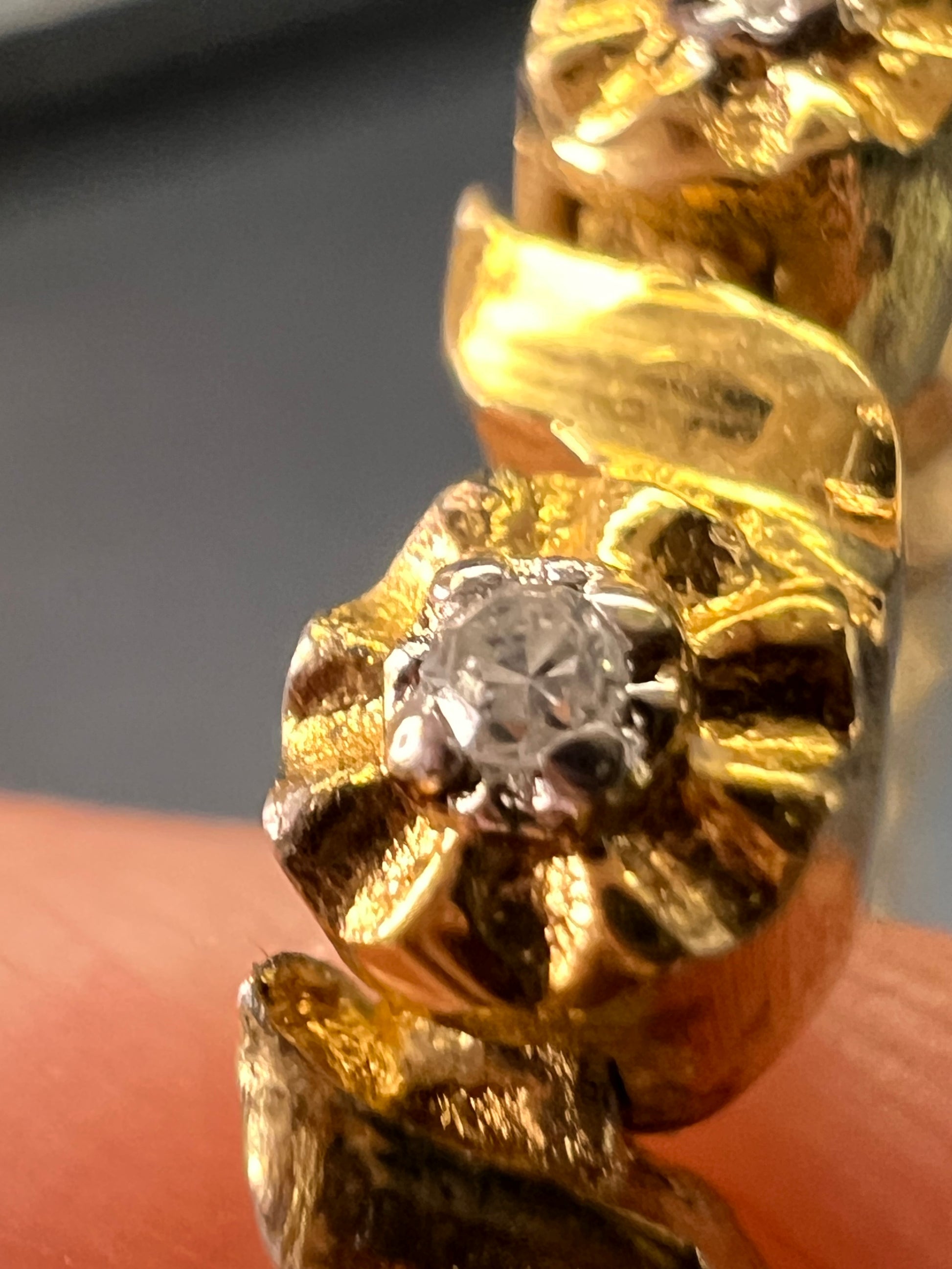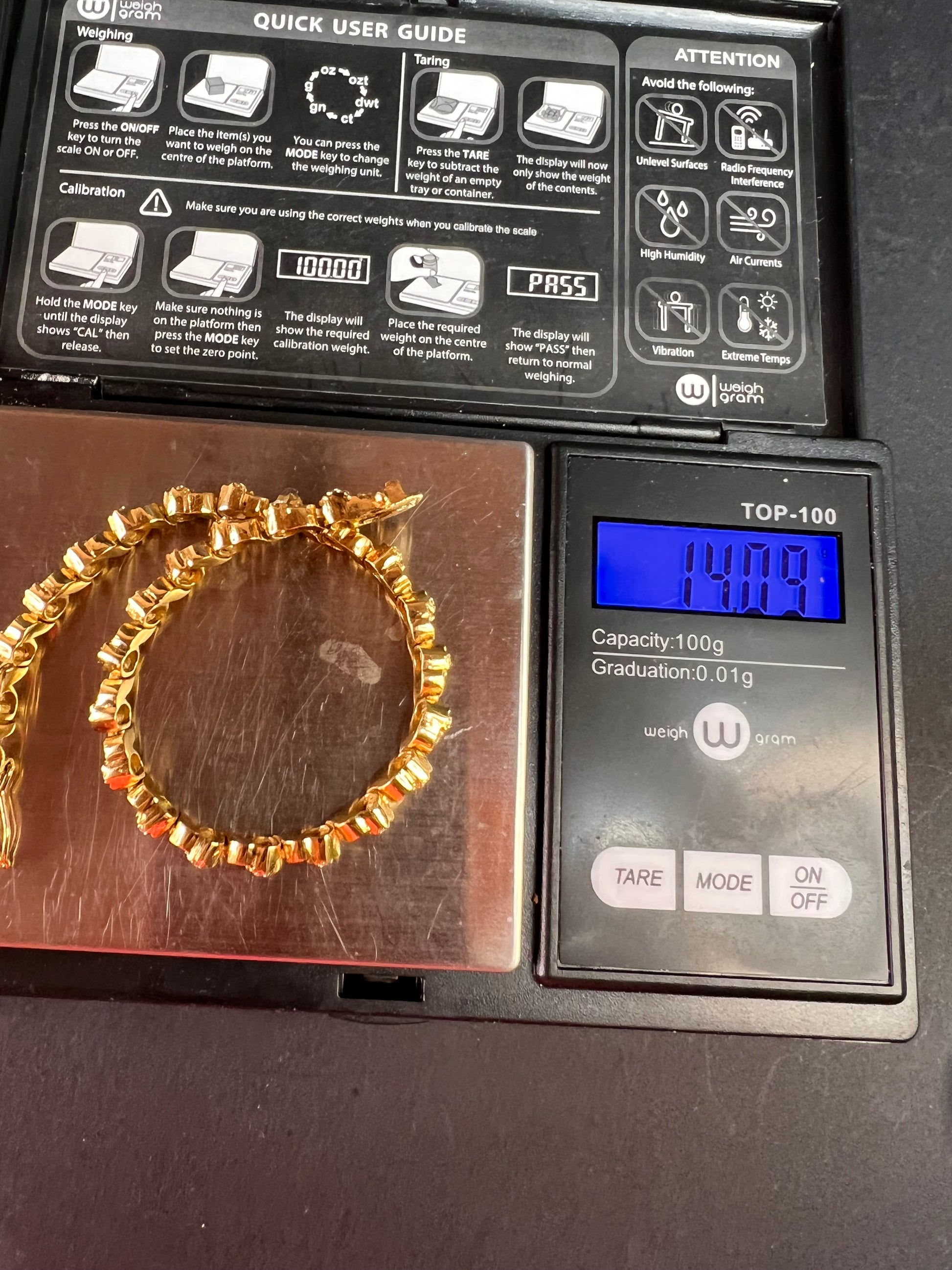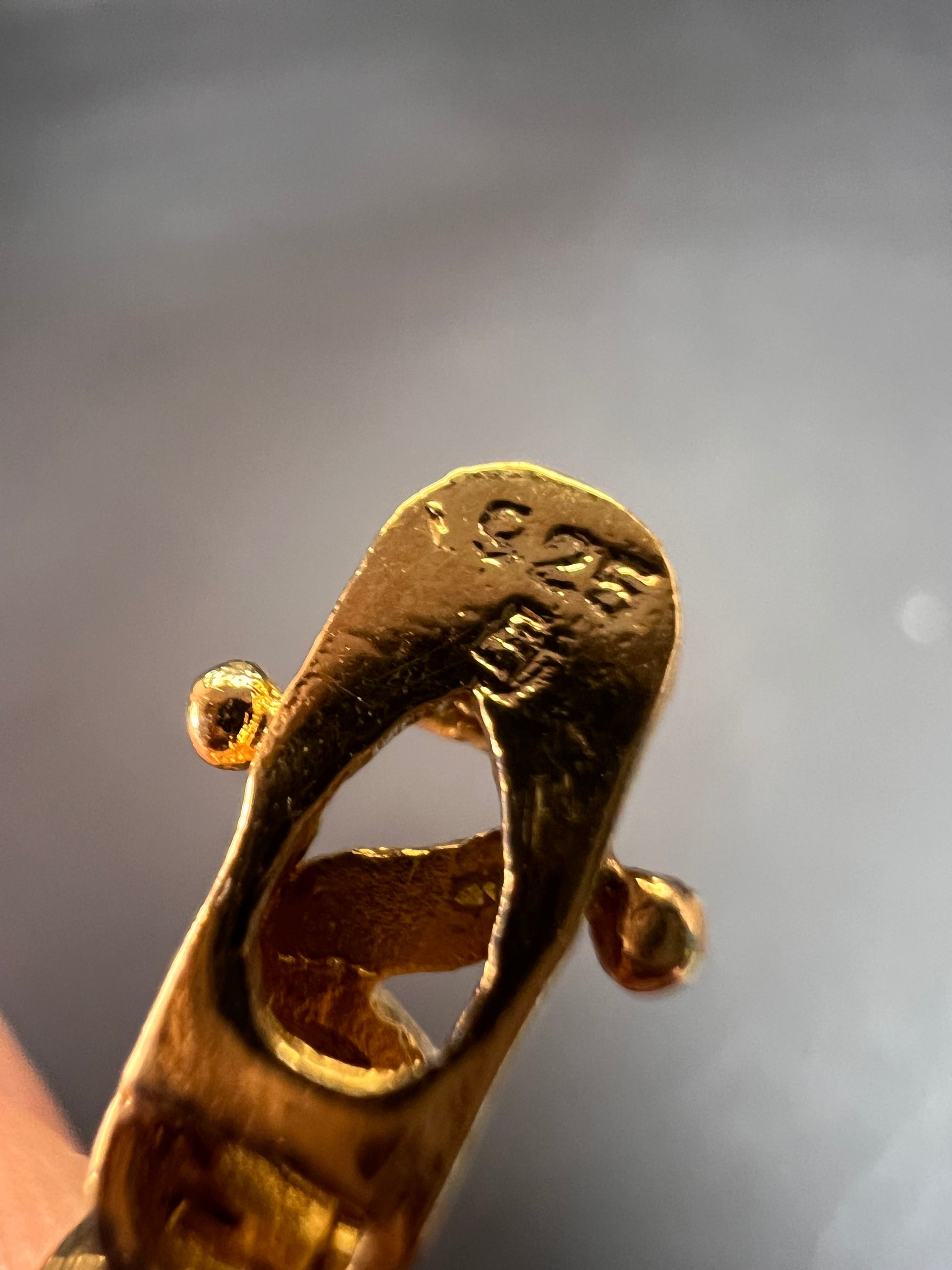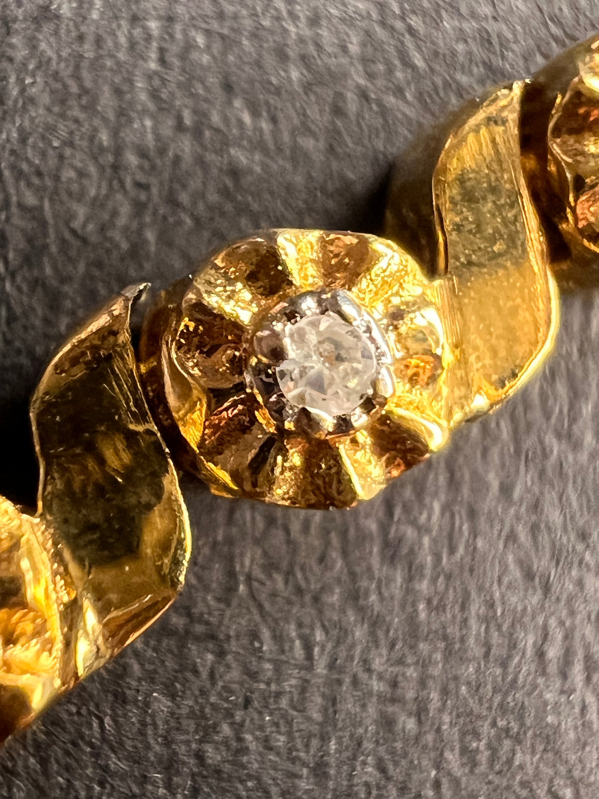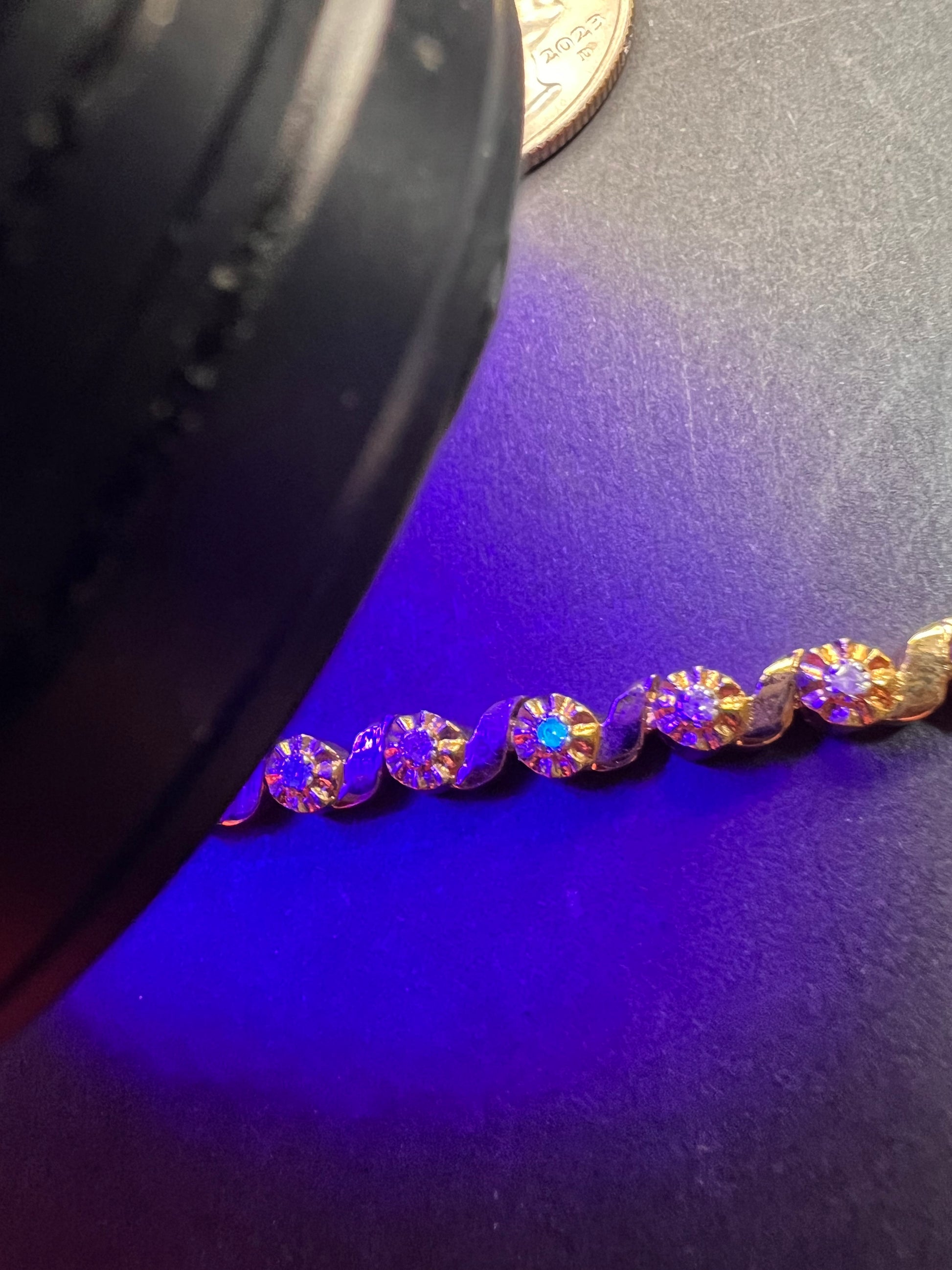 28 genuine earth mined tiny white / colorless diamonds prong set in yellow gold plated over sterling silver. Measures about 7.5 inches in length and weighs 14.09 grams. Box clasp with two safety snaps. 925, unknown hallmark. Diamonds roughly measure about 2mm each in setting totaling maybe just under 1 carat or so total ctw.