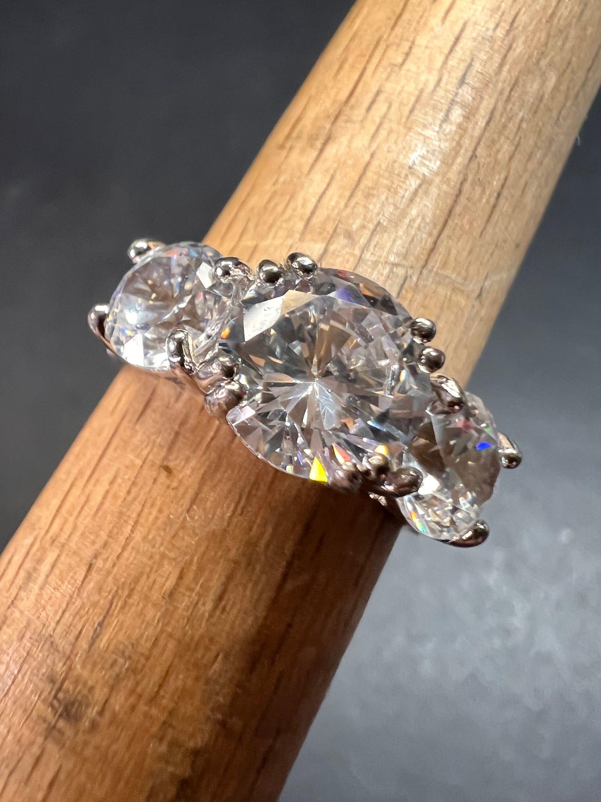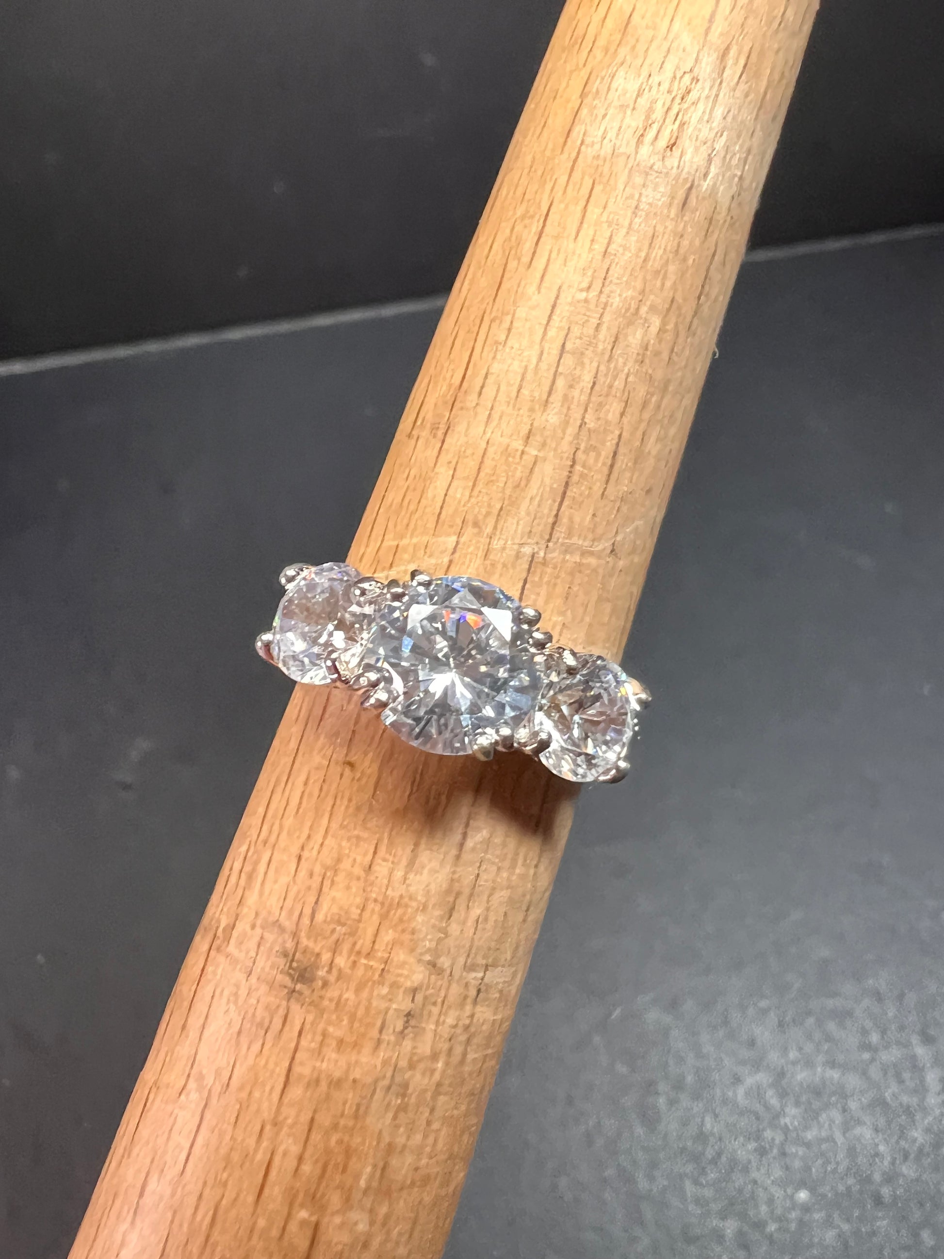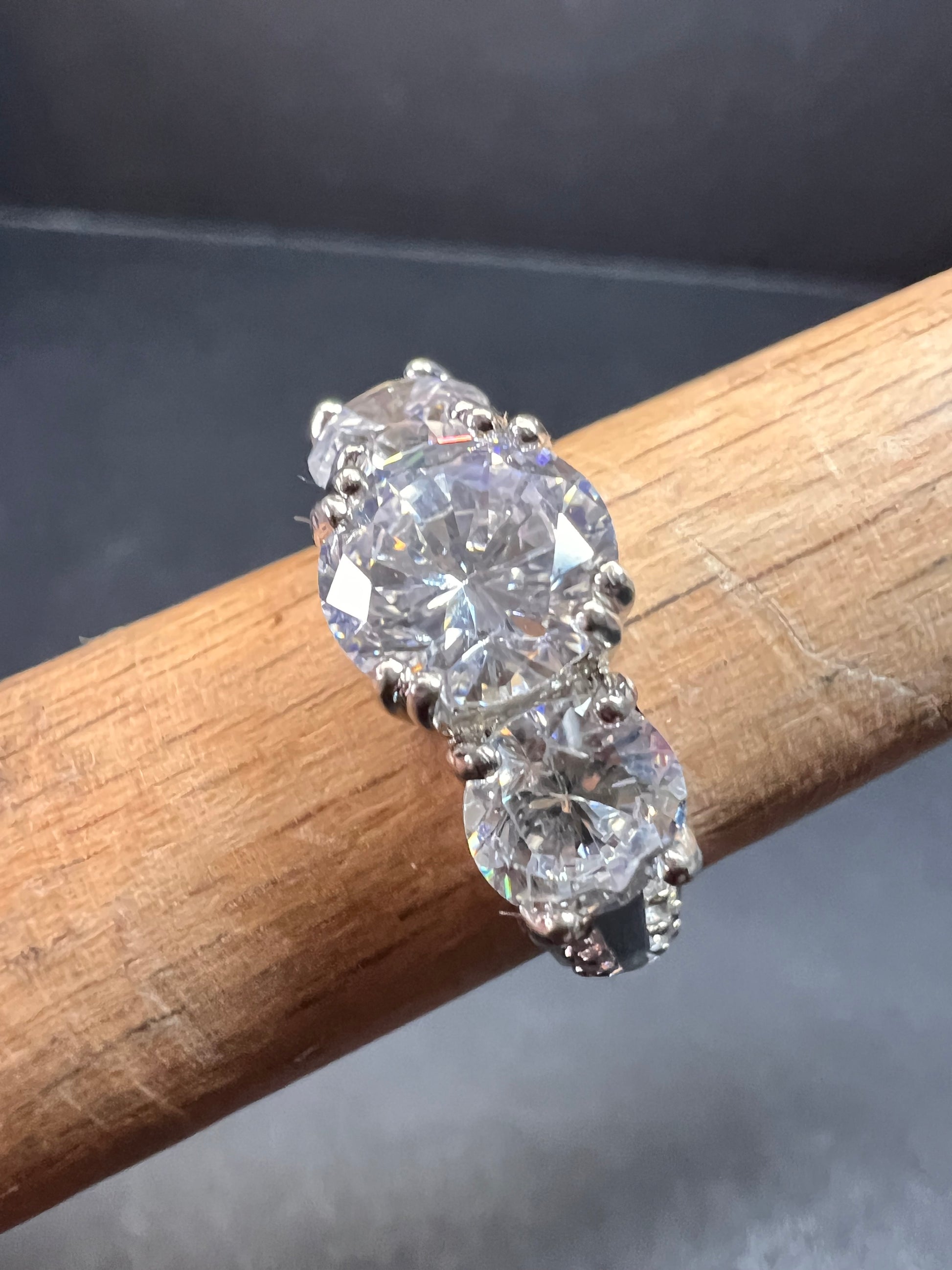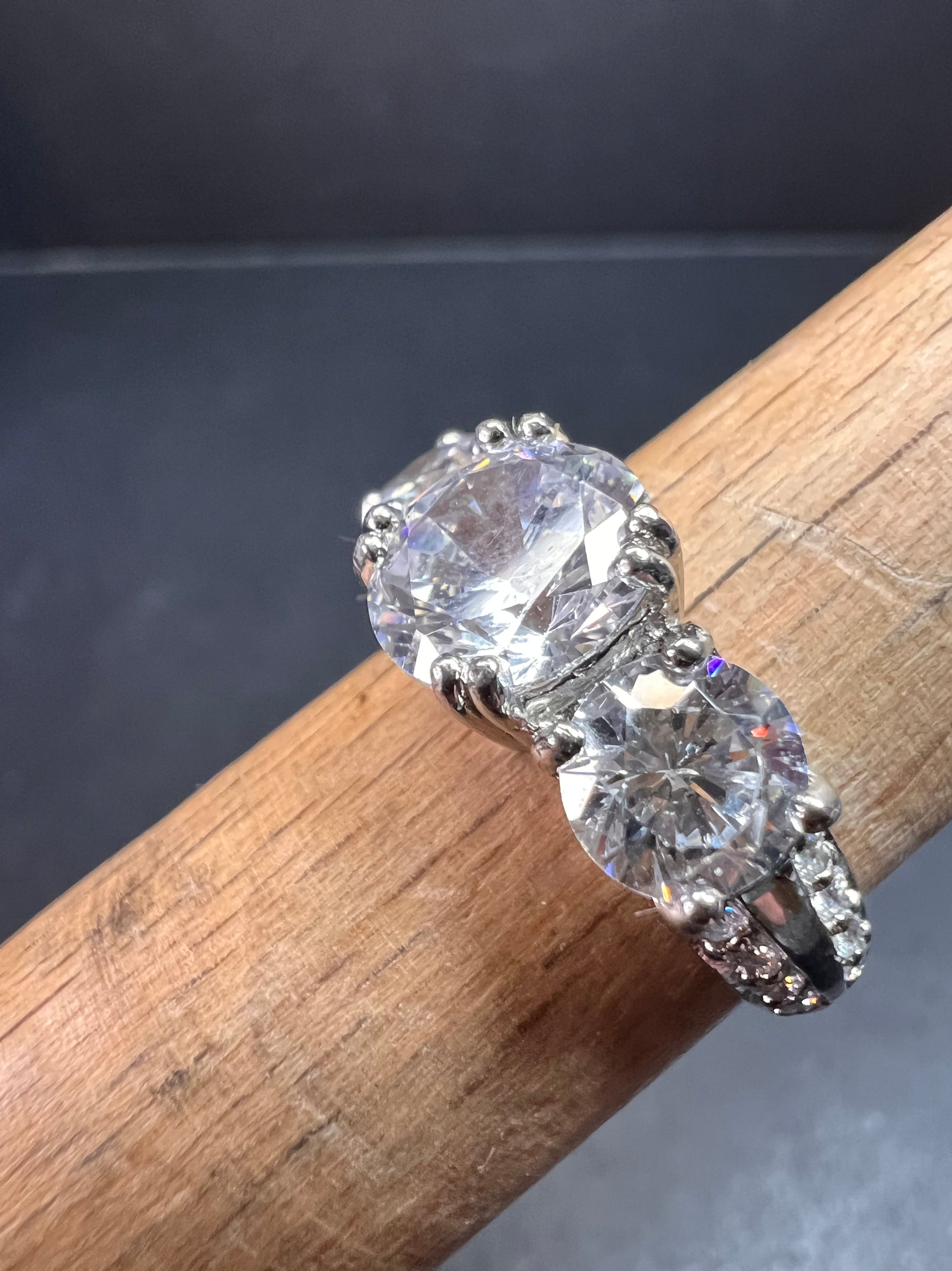 Three white / colorless cubic zirconia round cut gemstones prong set in an authentic 925 sterling silver setting that’s likely plated with platinum or rhodium. Accent stones on shank are also CZ. Measures a size 7. Past present and future design. 925 Thailand