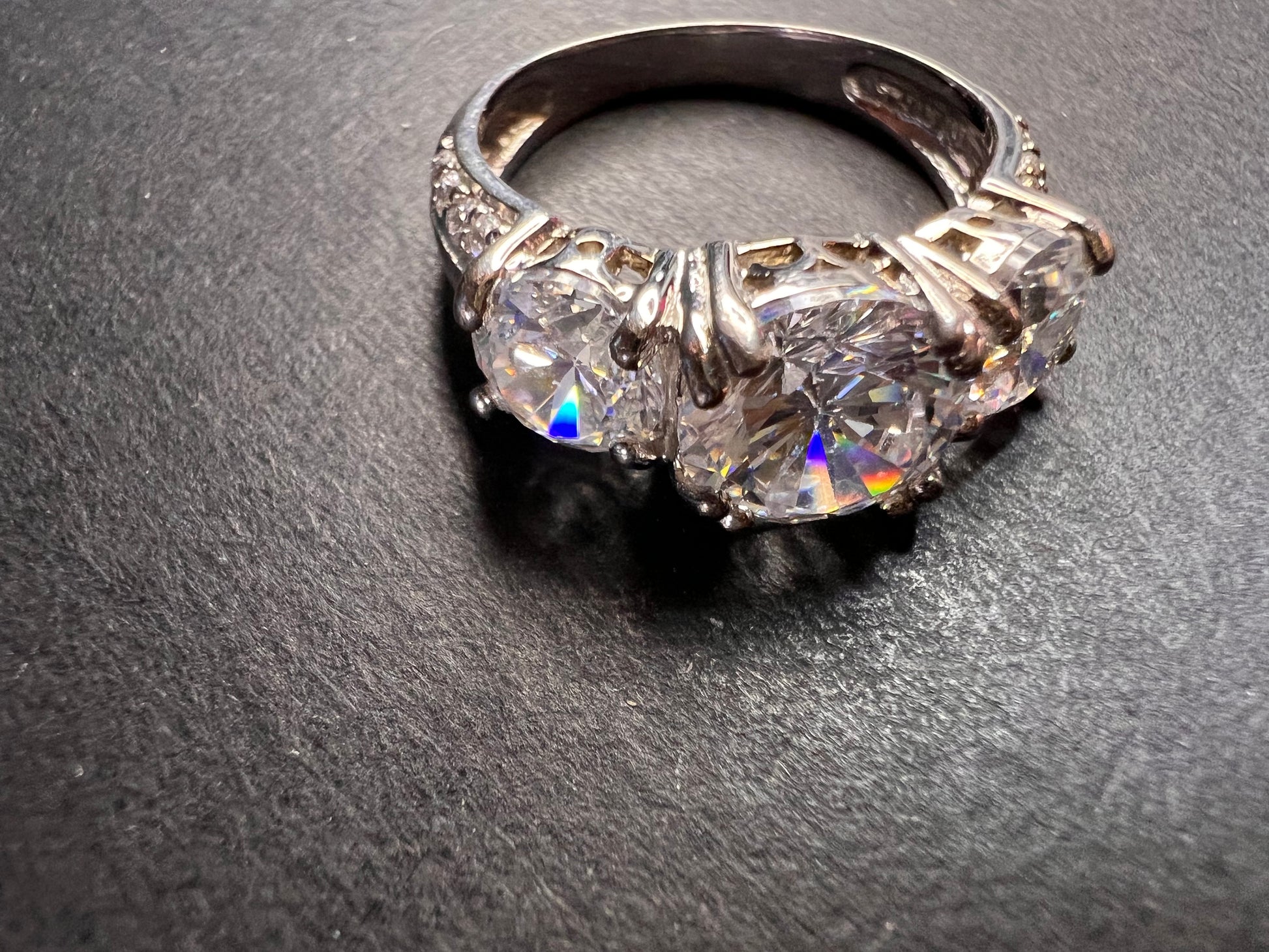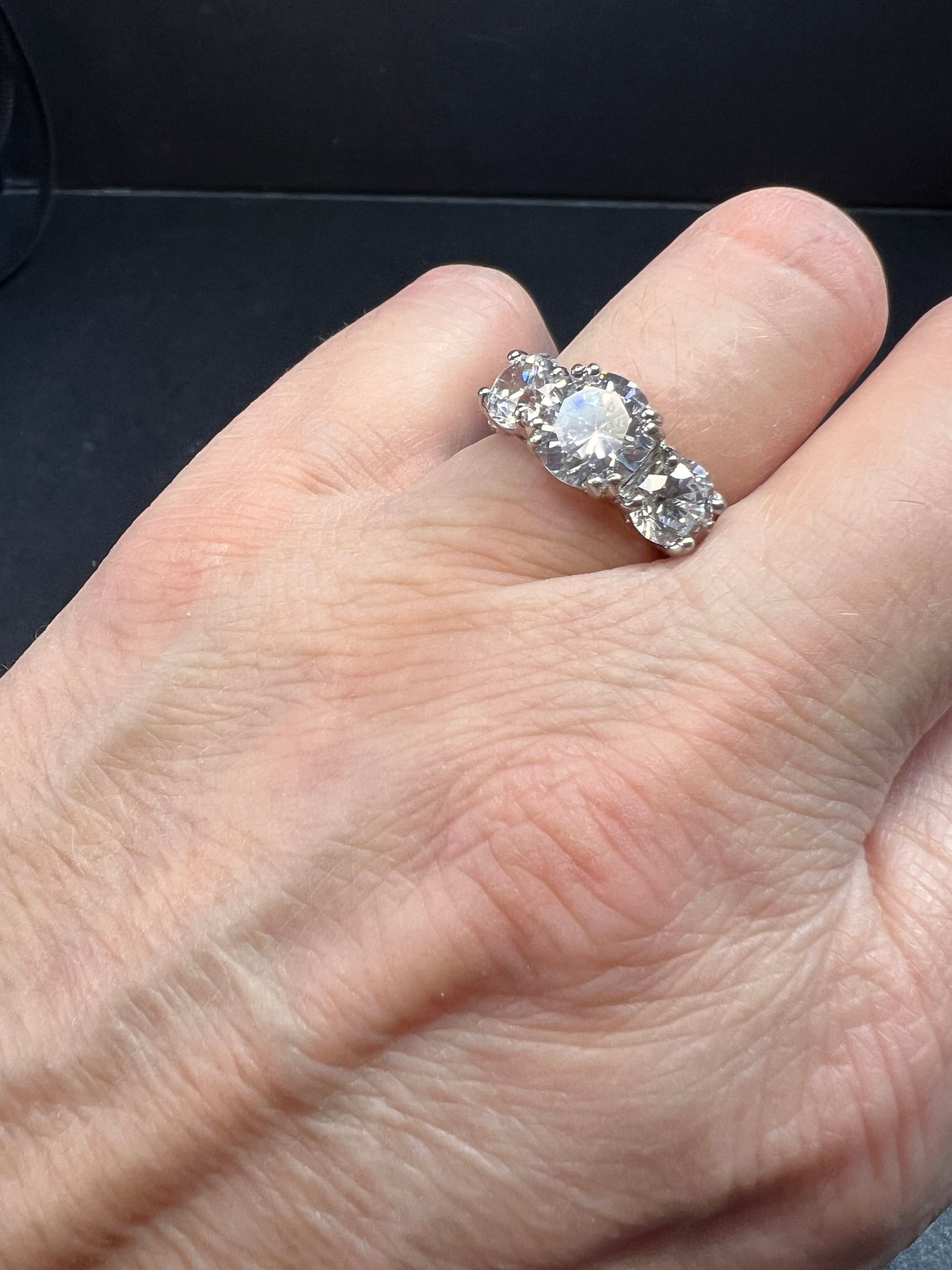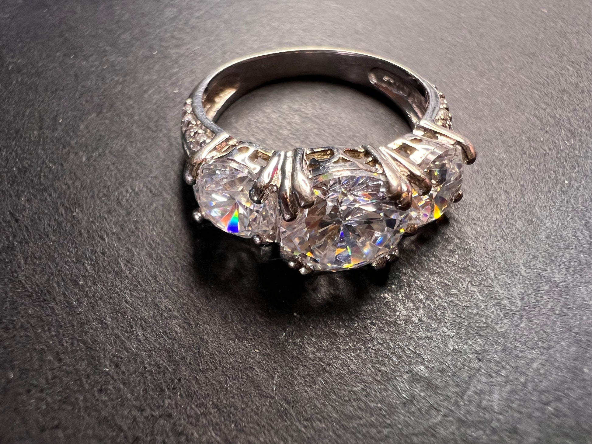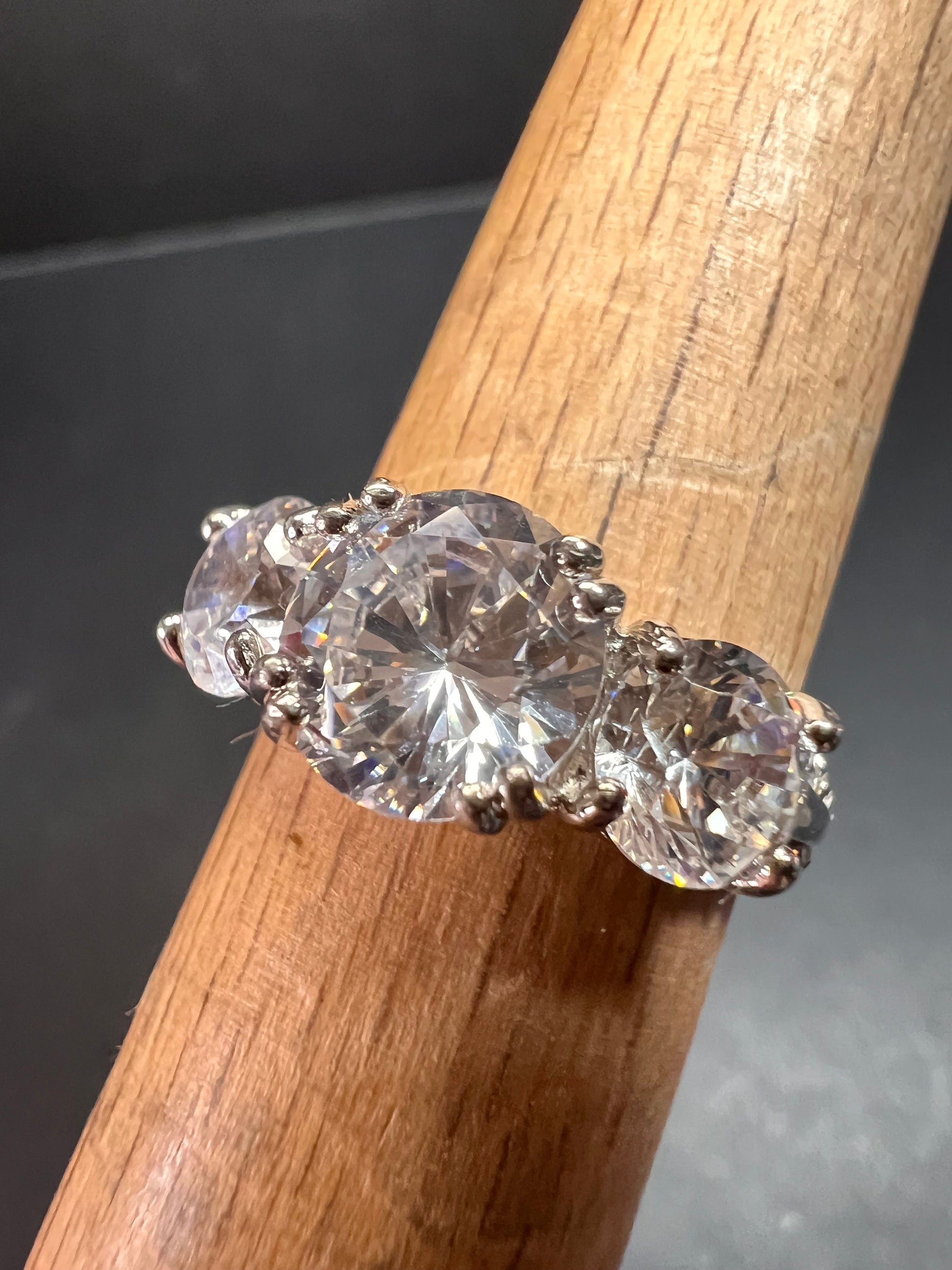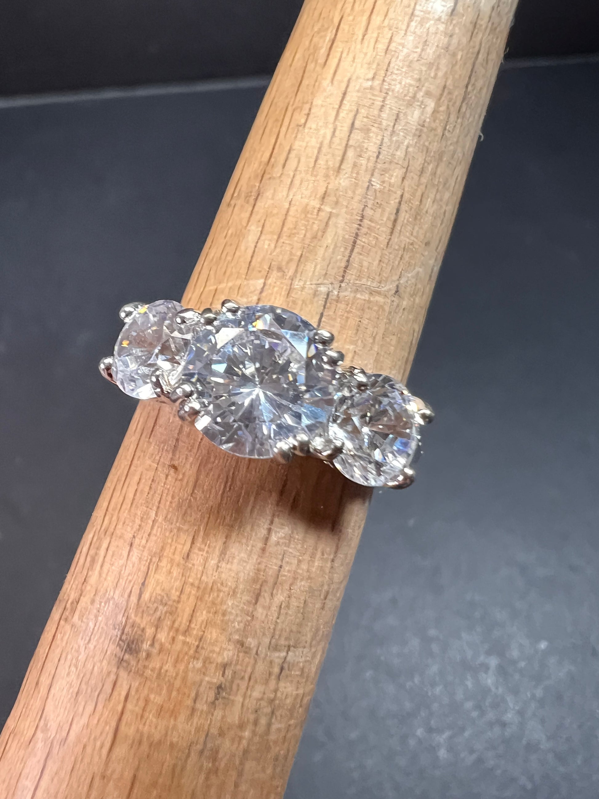 Three white / colorless cubic zirconia round cut gemstones prong set in an authentic 925 sterling silver setting that’s likely plated with platinum or rhodium. Accent stones on shank are also CZ. Measures a size 7. Past present and future design. 925 Thailand