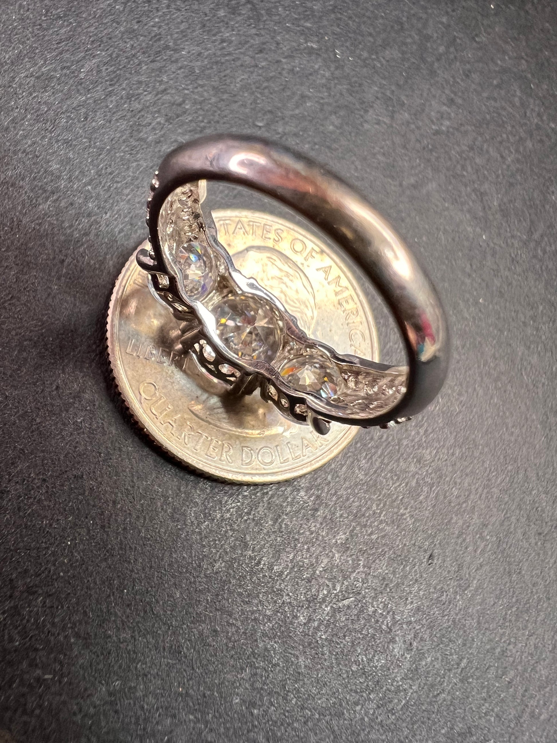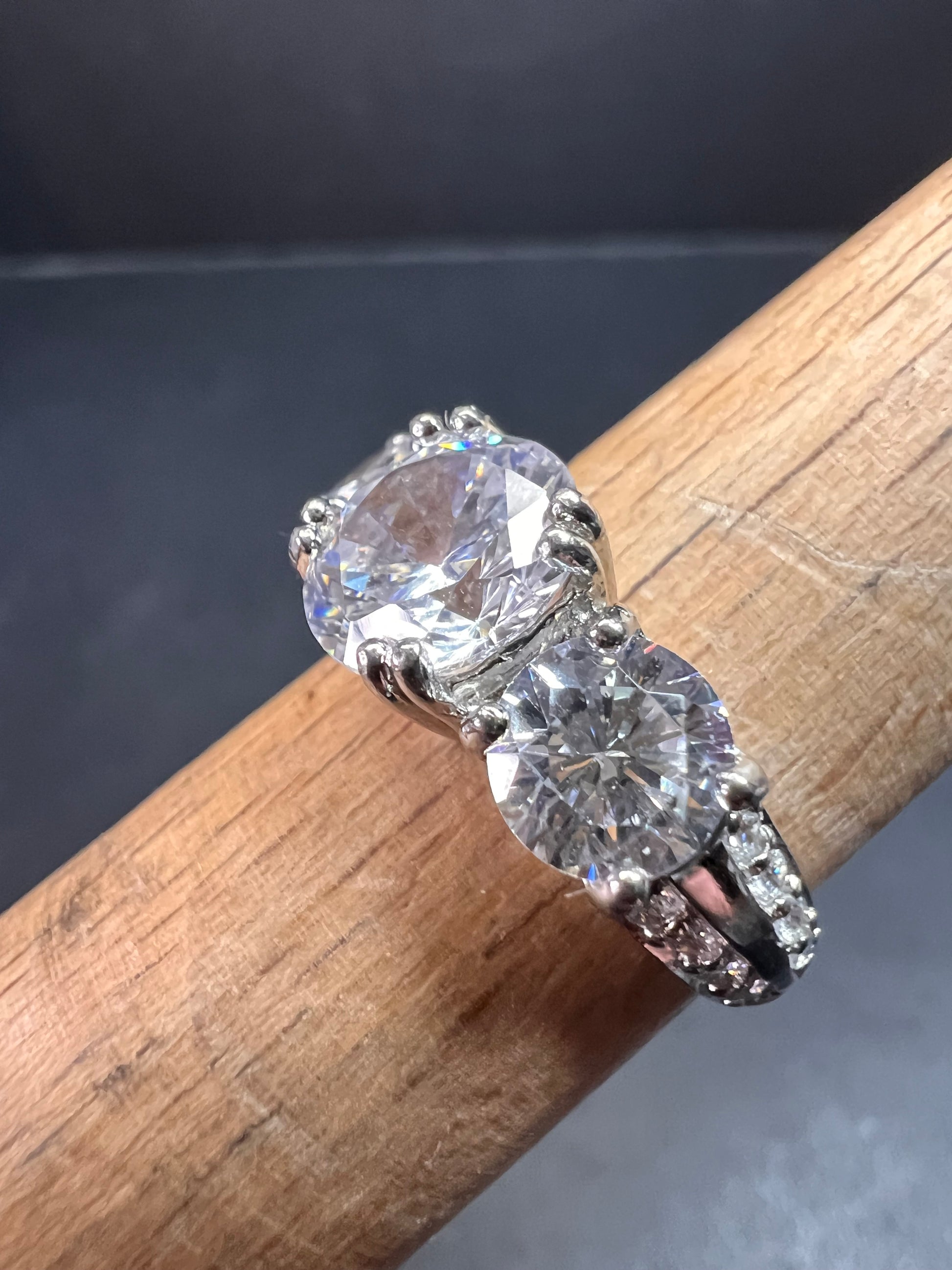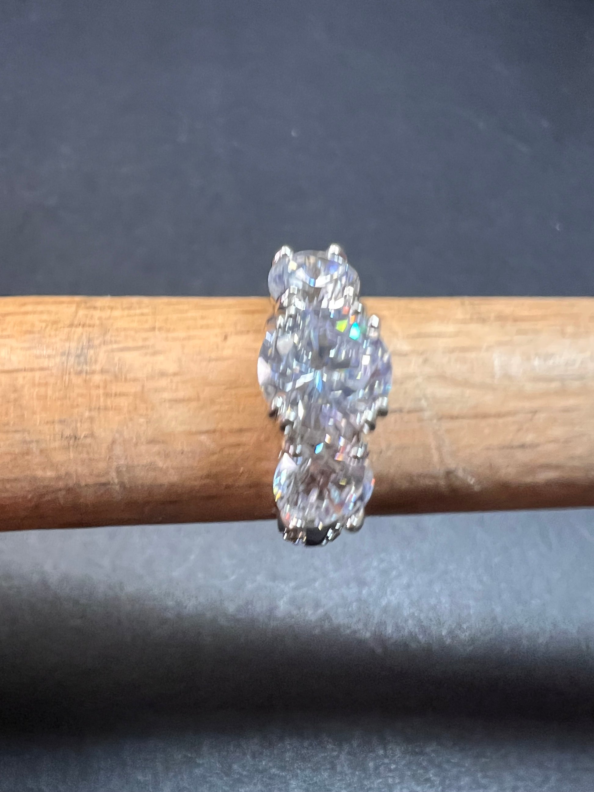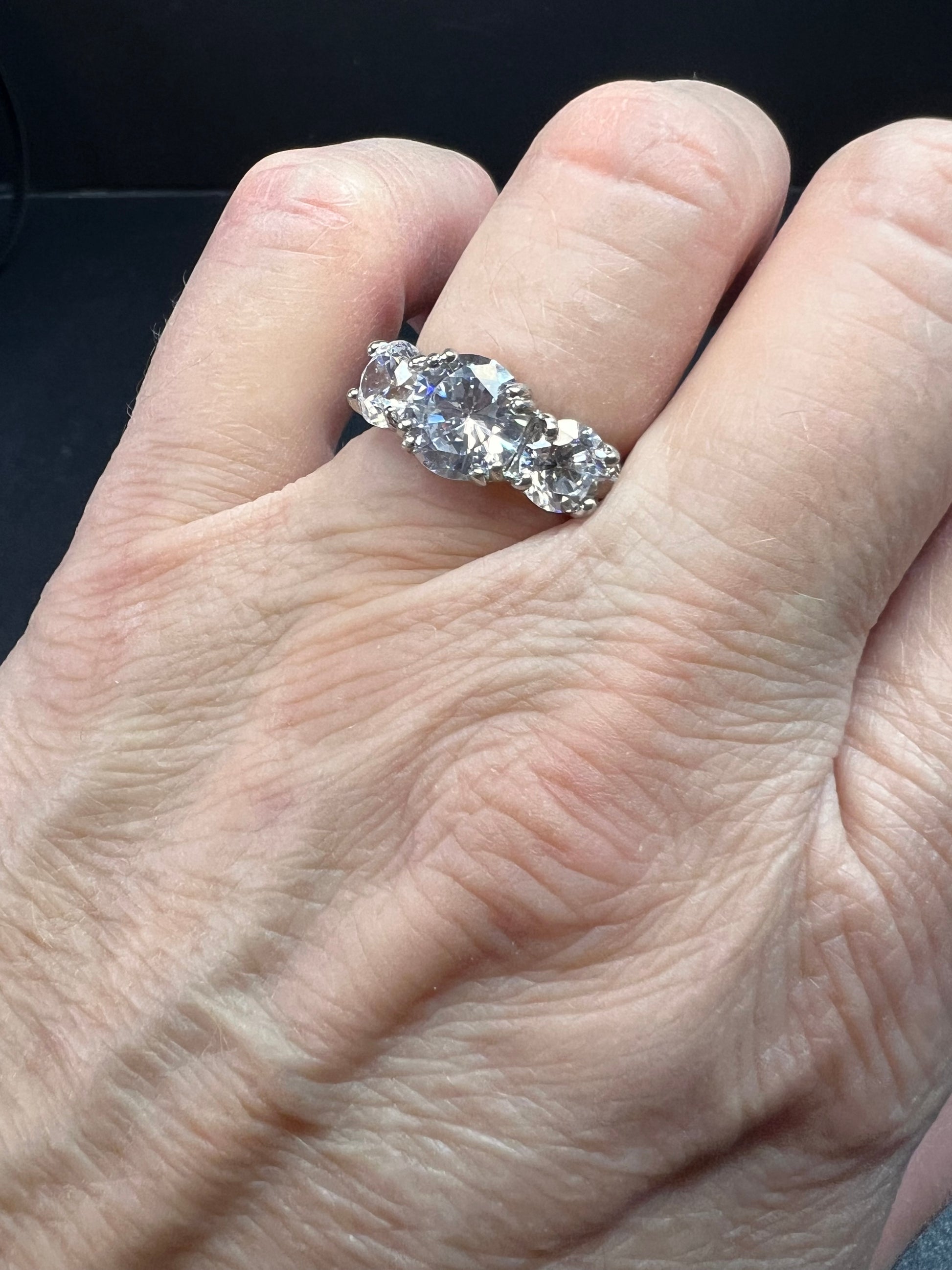 Three white / colorless cubic zirconia round cut gemstones prong set in an authentic 925 sterling silver setting that’s likely plated with platinum or rhodium. Accent stones on shank are also CZ. Measures a size 7. Past present and future design. 925 Thailand