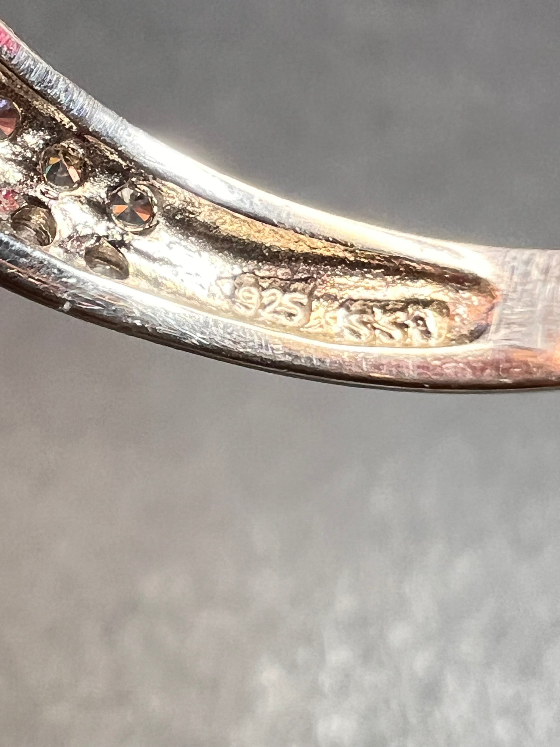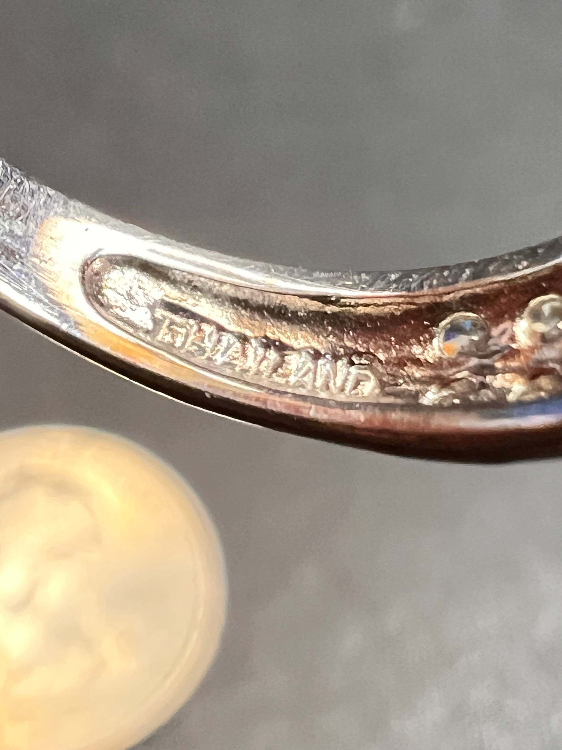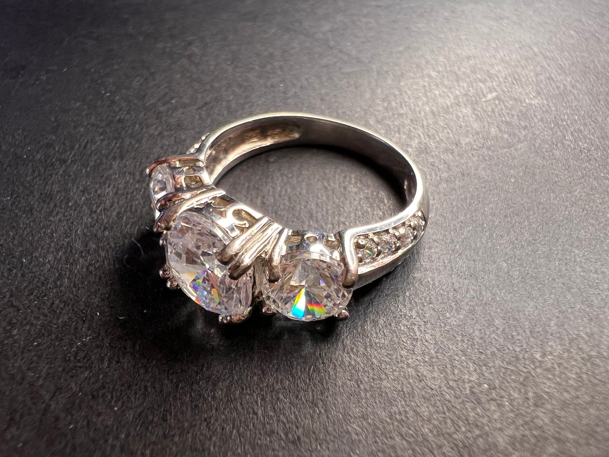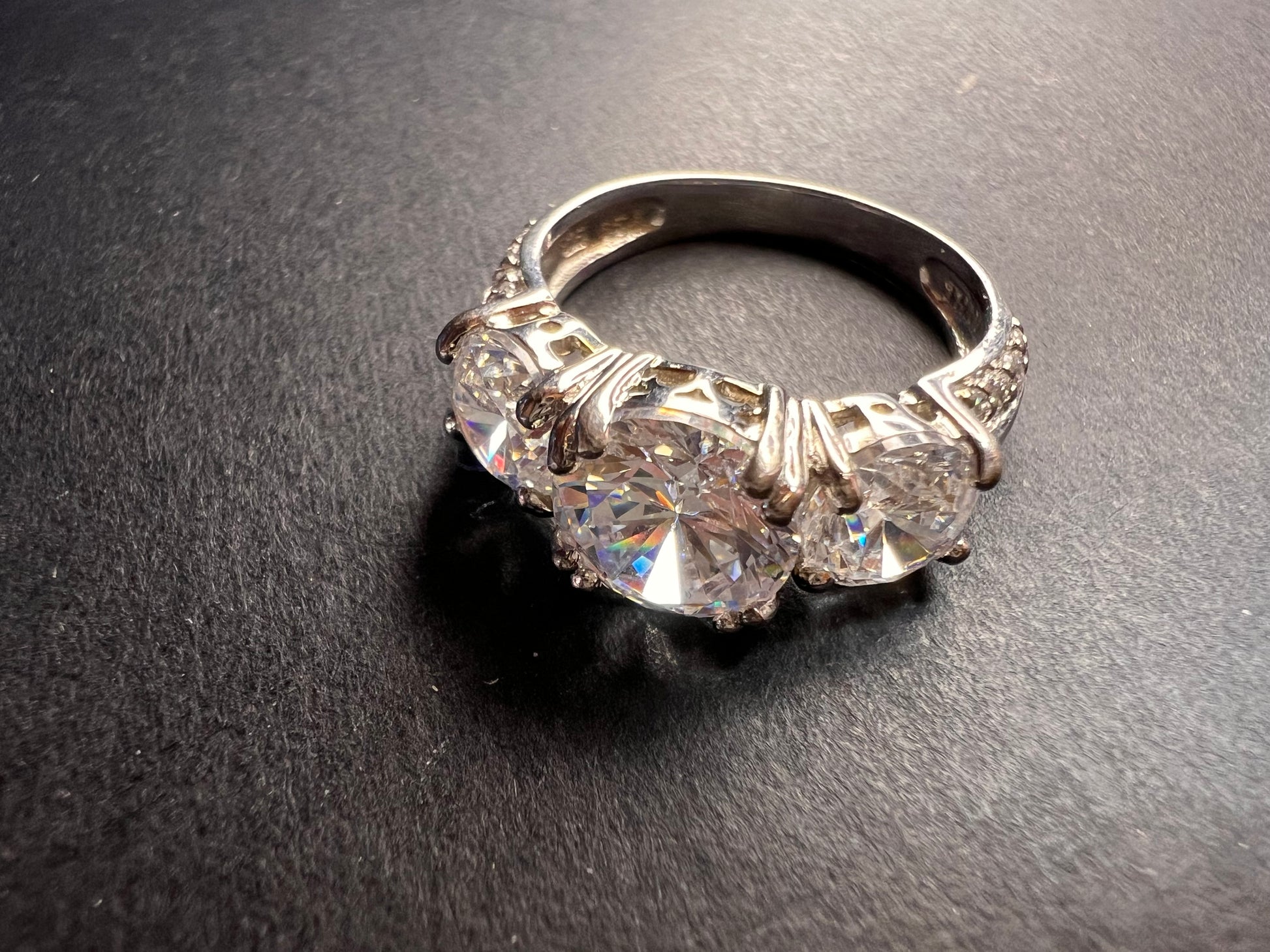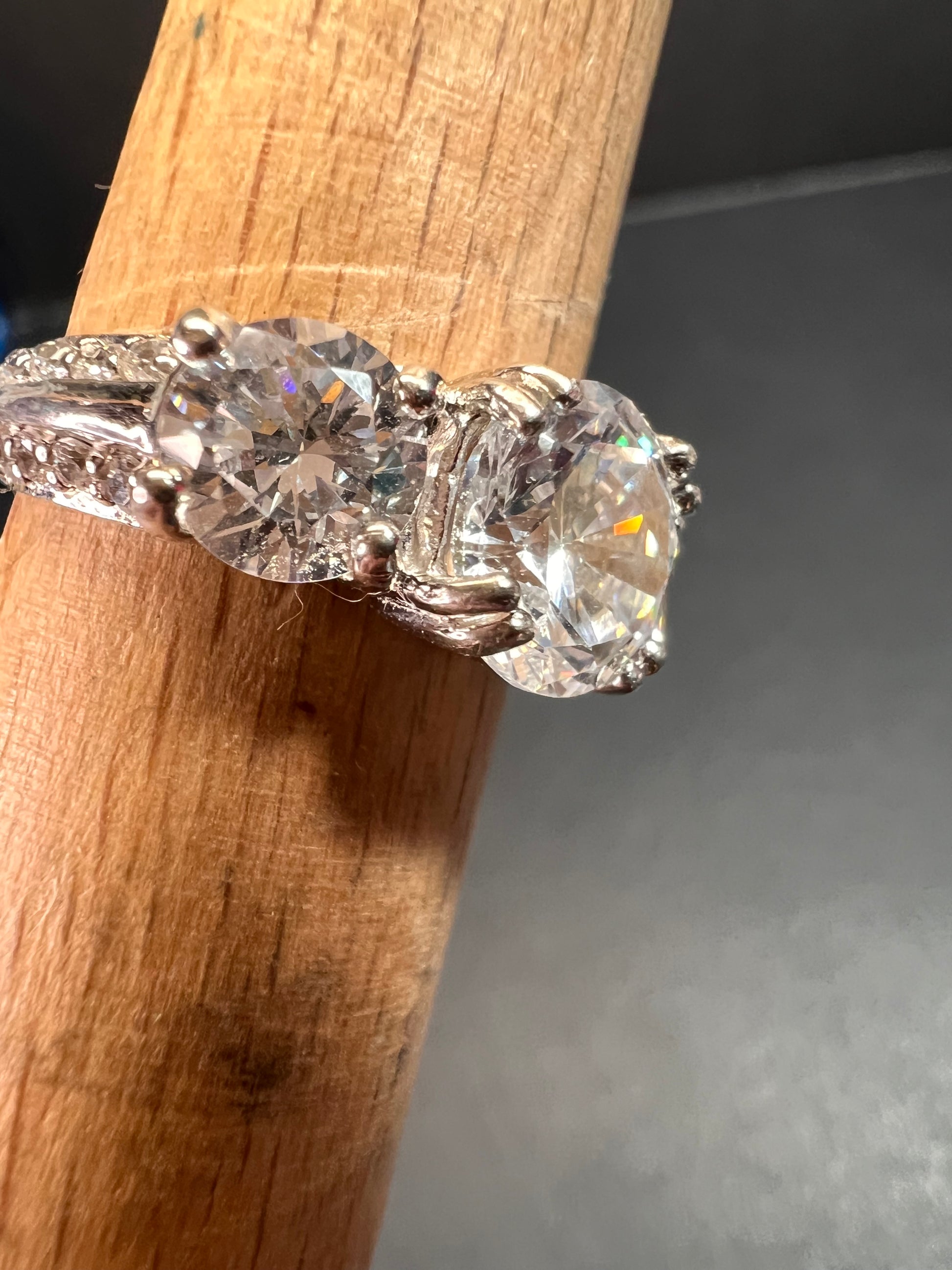 Three white / colorless cubic zirconia round cut gemstones prong set in an authentic 925 sterling silver setting that’s likely plated with platinum or rhodium. Accent stones on shank are also CZ. Measures a size 7. Past present and future design. 925 Thailand