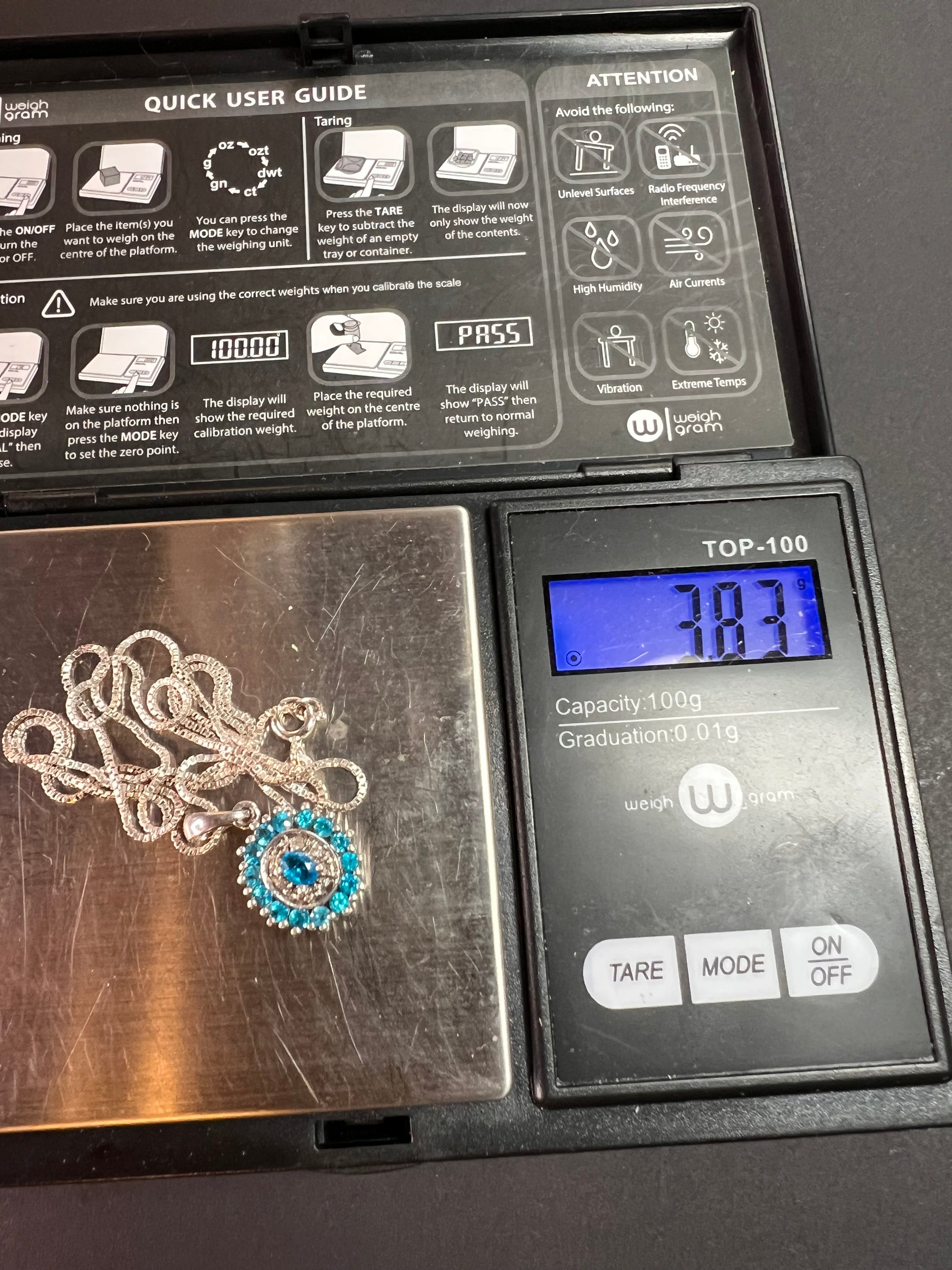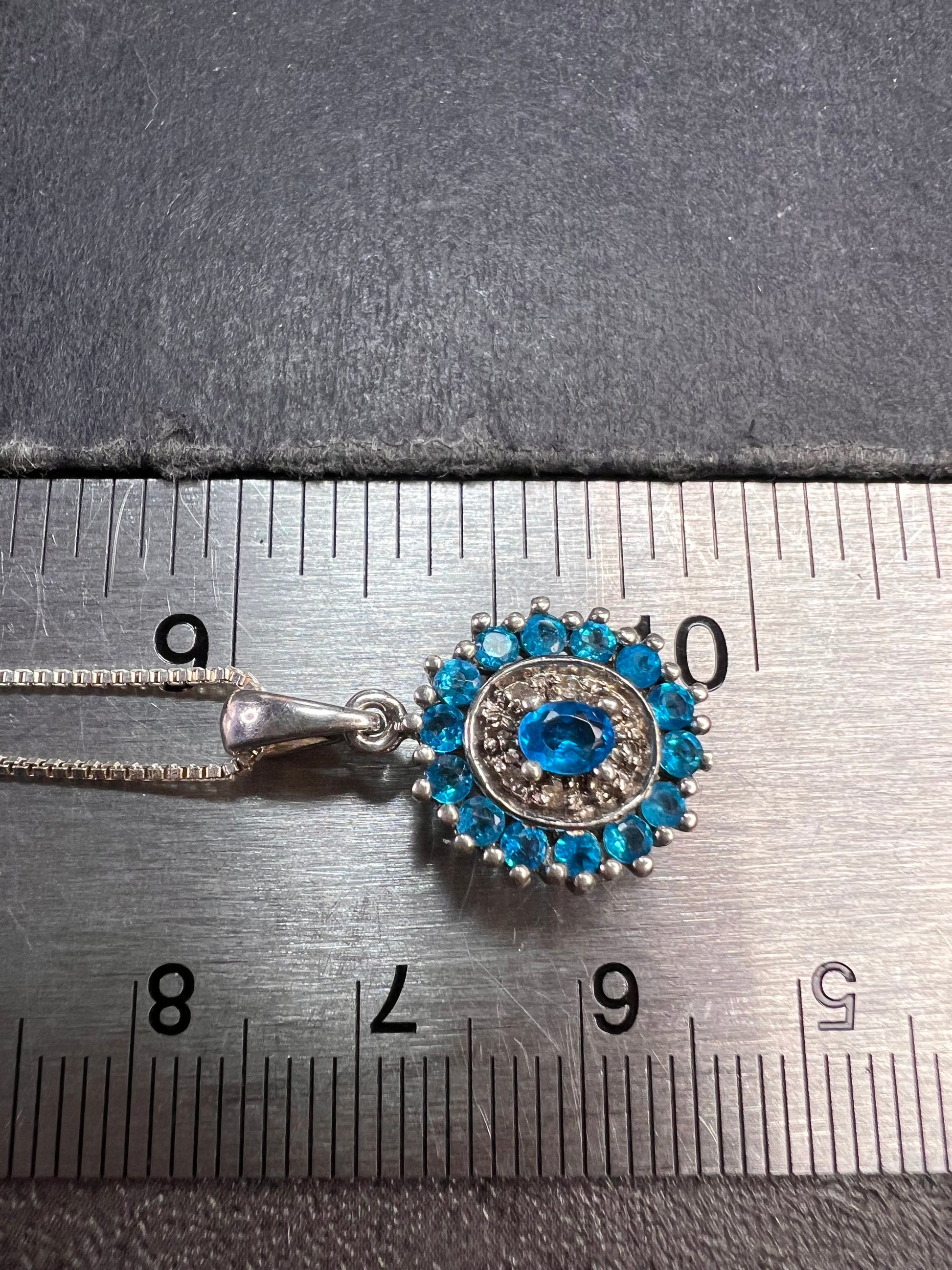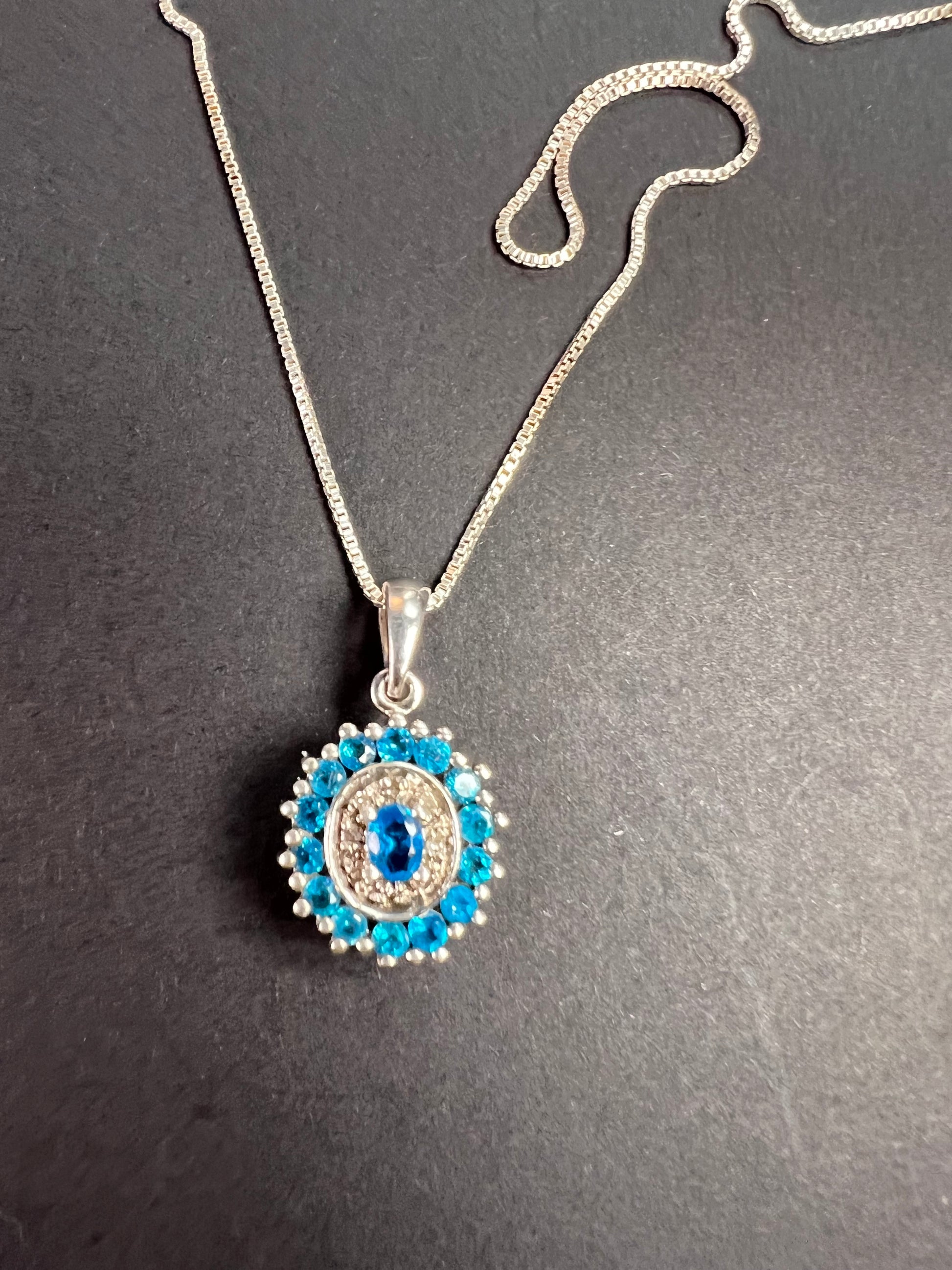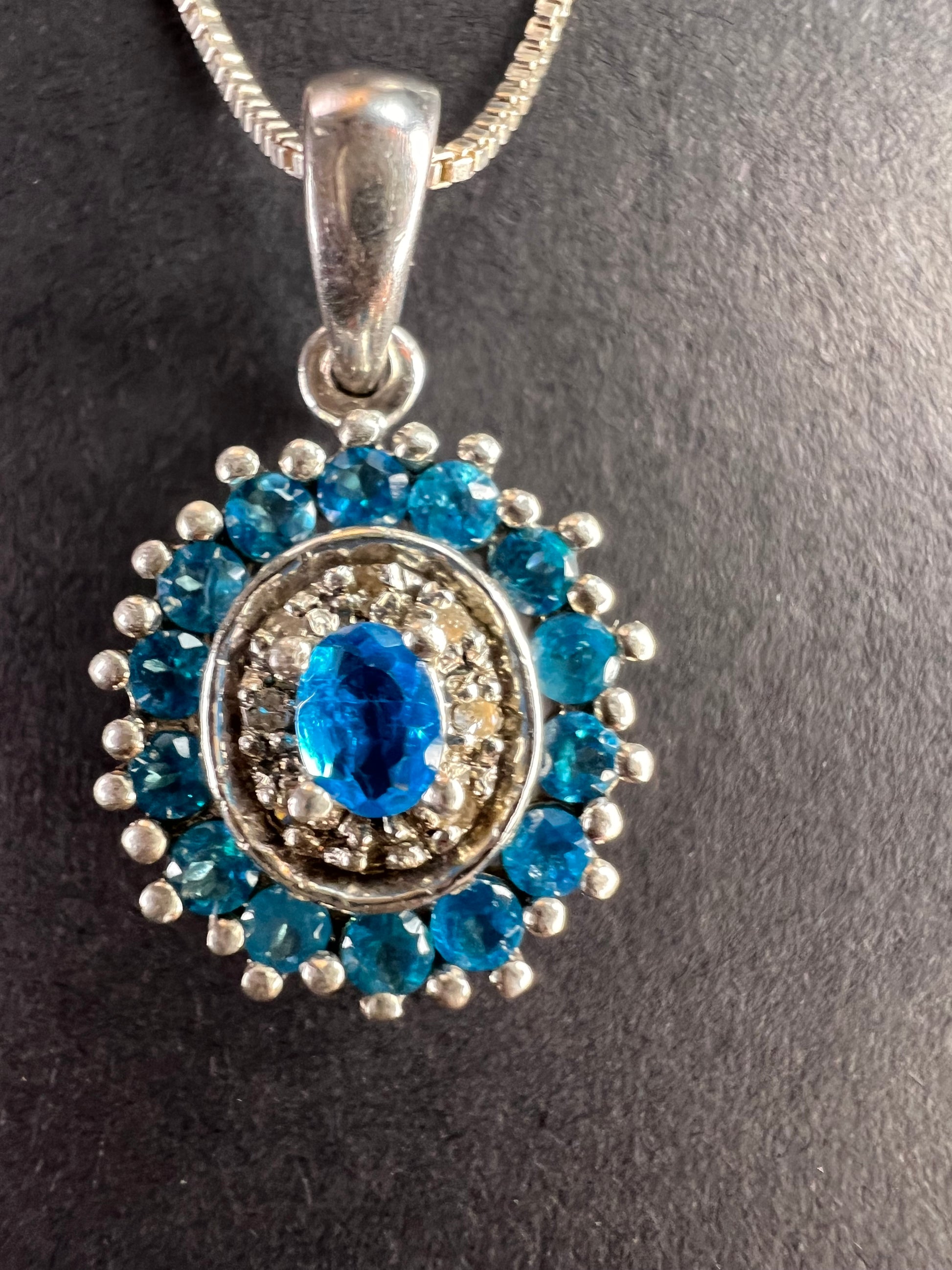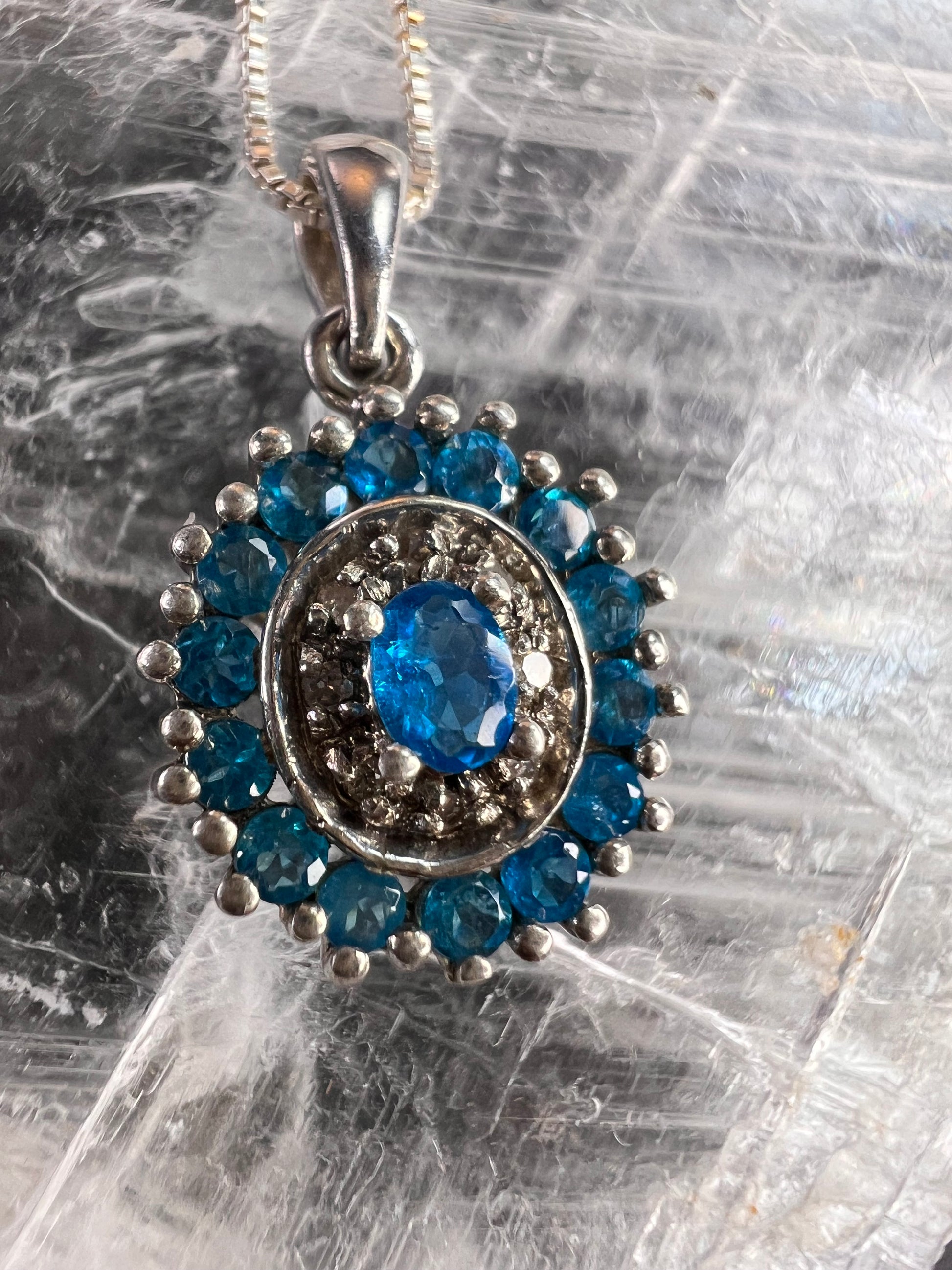 Gently pre-owned to vintage sterling silver pendant necklace featuring vivid neon blue apatite gemstones in a classic halo design. The center oval apatite is accented by smaller blue apatites and white stones that test as diamond. Due to the very small size of the white stones, it cannot be determined whether the diamonds are natural or lab-grown; inclusions are present but difficult to assess at this scale. Pendant and chain are solid 925 sterling silver. Includes a brand-new 18-inch sterling silver box chain. Measurements and weight shown in photos.