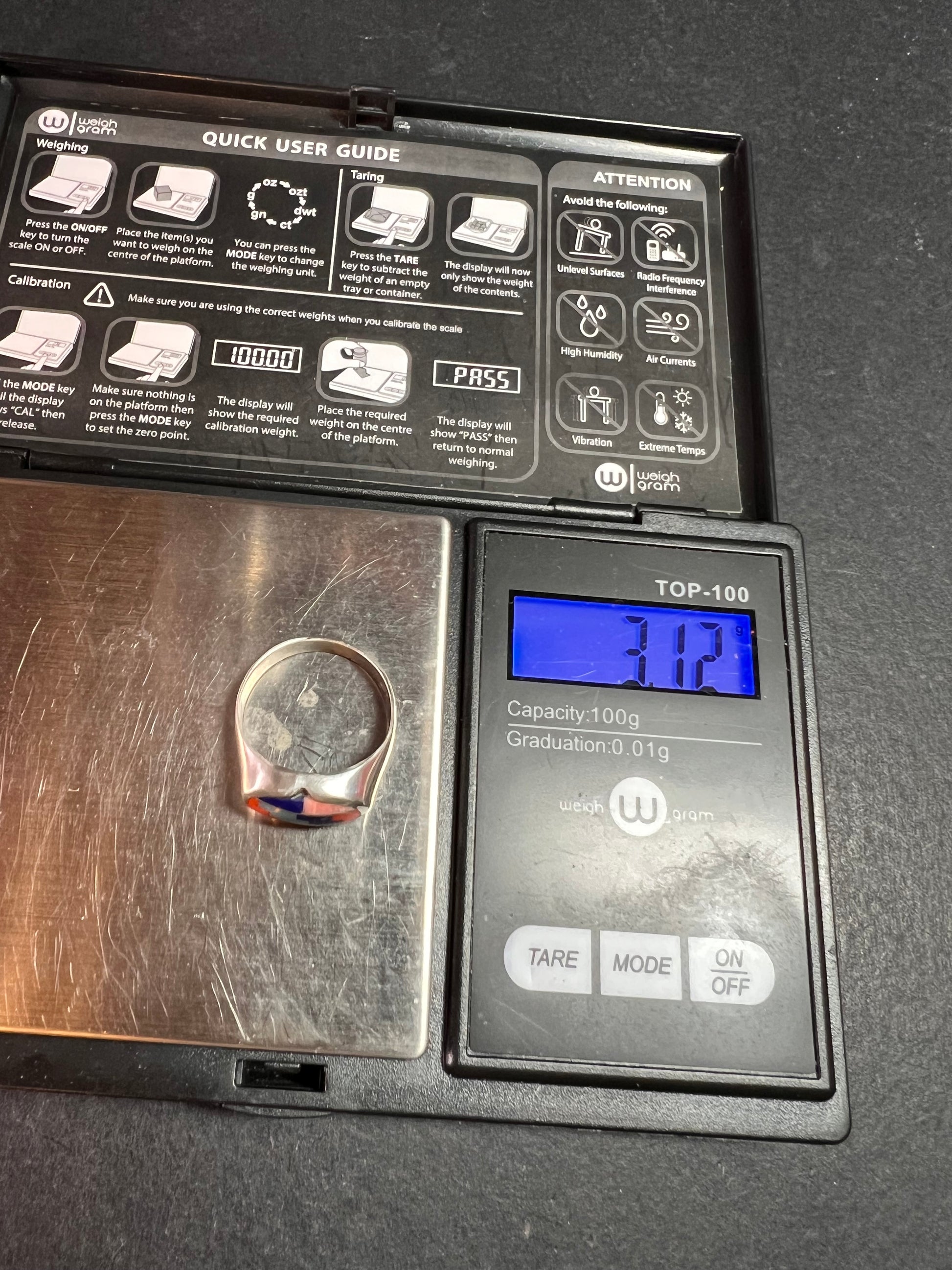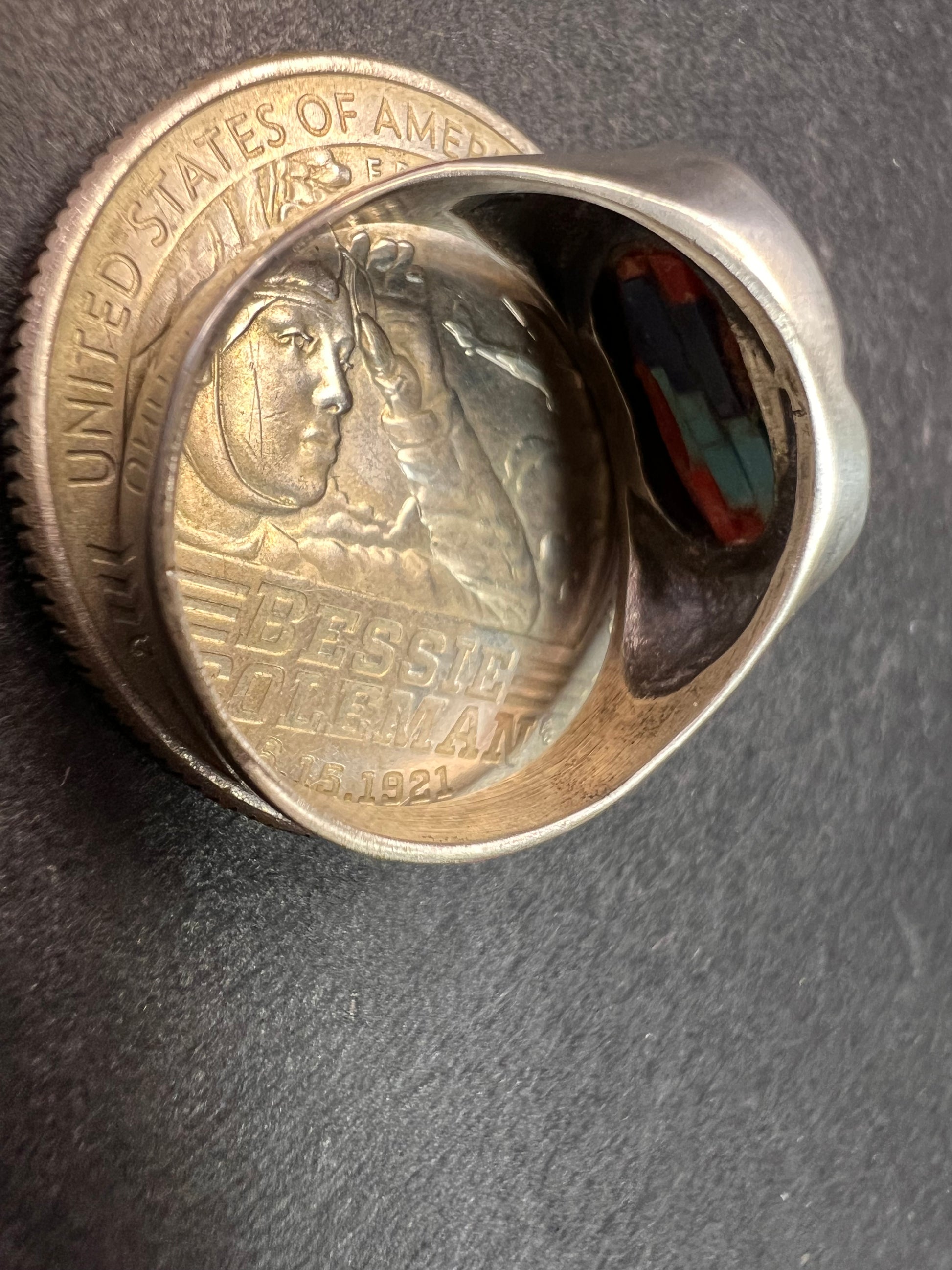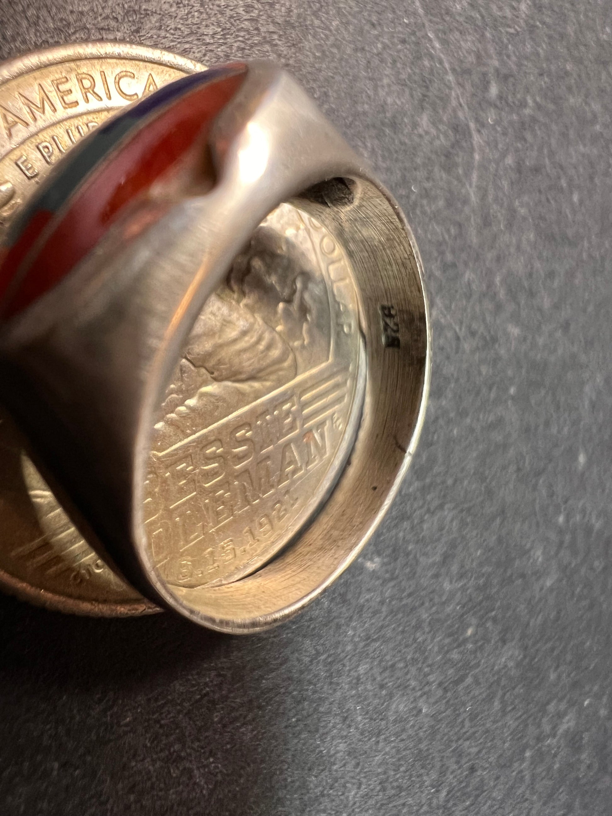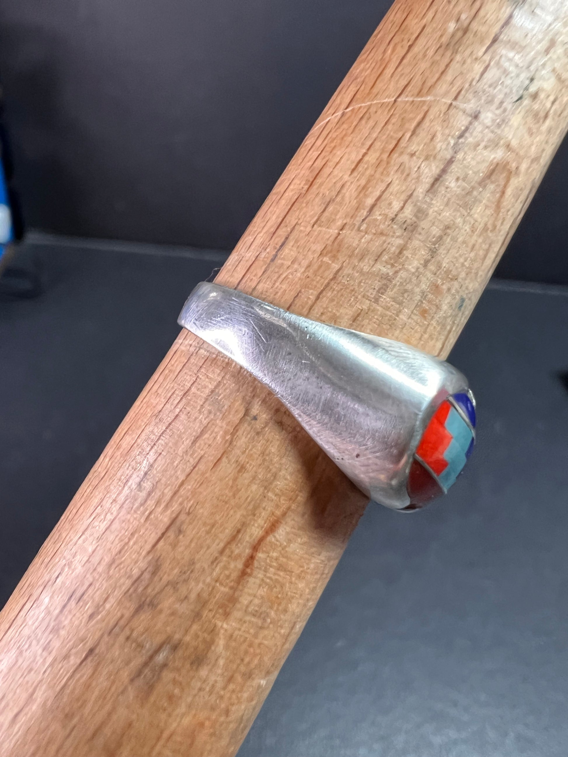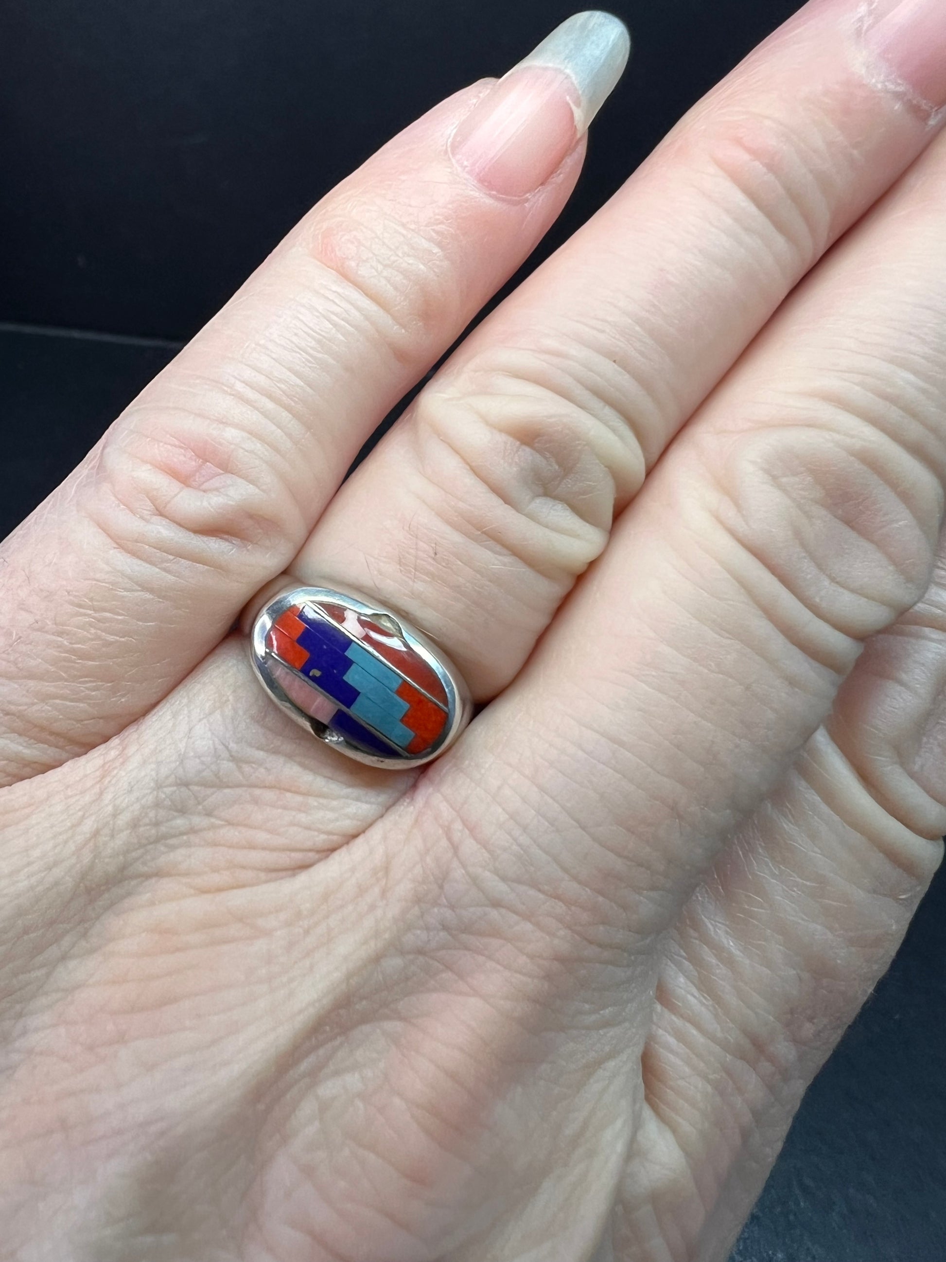 Pre owned vintage condition with normal silver wear and a small chip in the inlay as shown. This handmade Southwest-style sterling silver ring features a colorful mosaic of red, blue, turquoise-tone, and pink shell stones arranged in a stepped geometric pattern. The inlay is set in an oval bezel on a smooth, comfortable band. Stamped 925 inside the shank and tested sterling silver. Lightweight and easy to wear, this size 7 ring has a classic vintage Southwest look that works beautifully for everyday style or collecting.