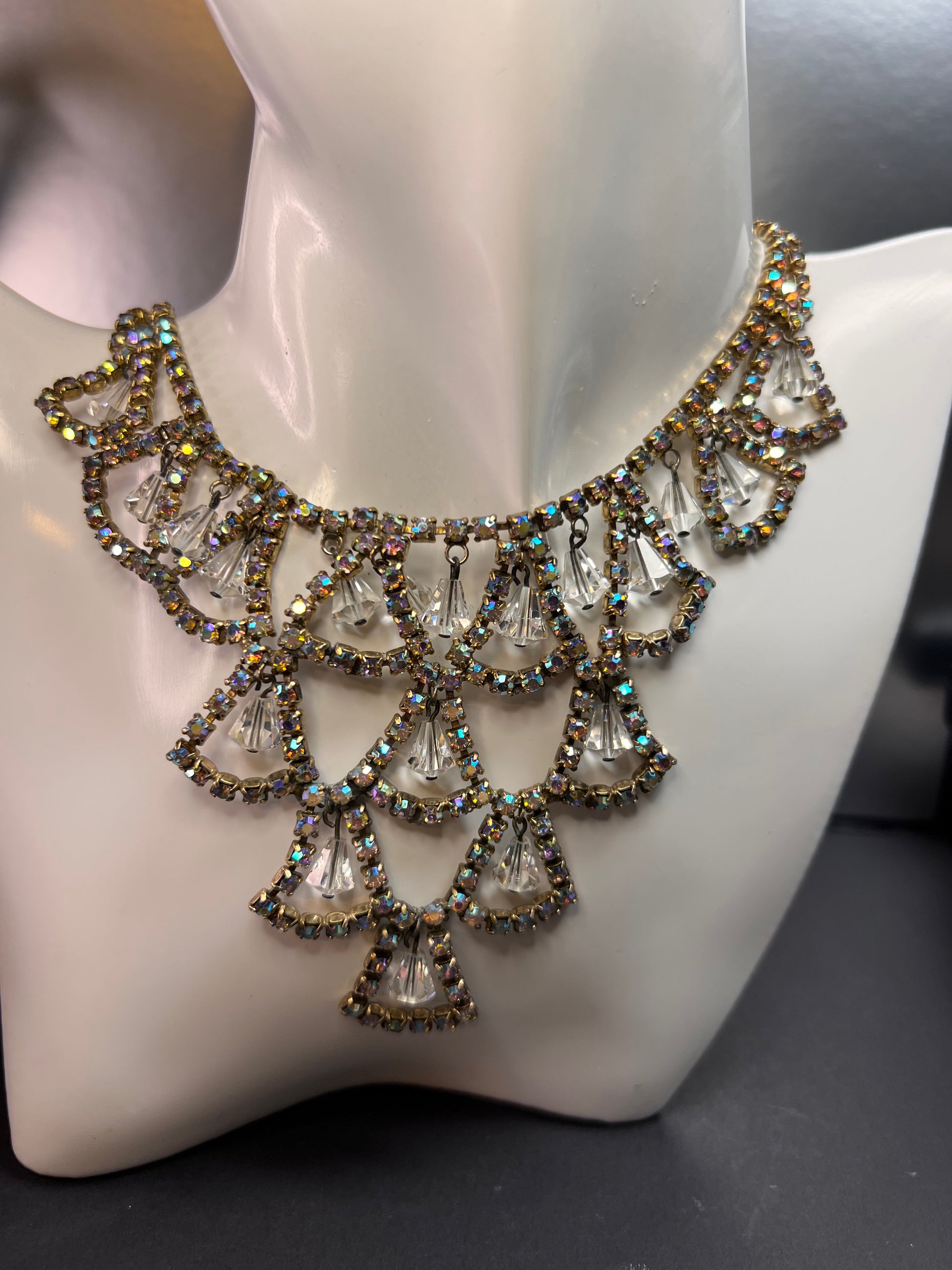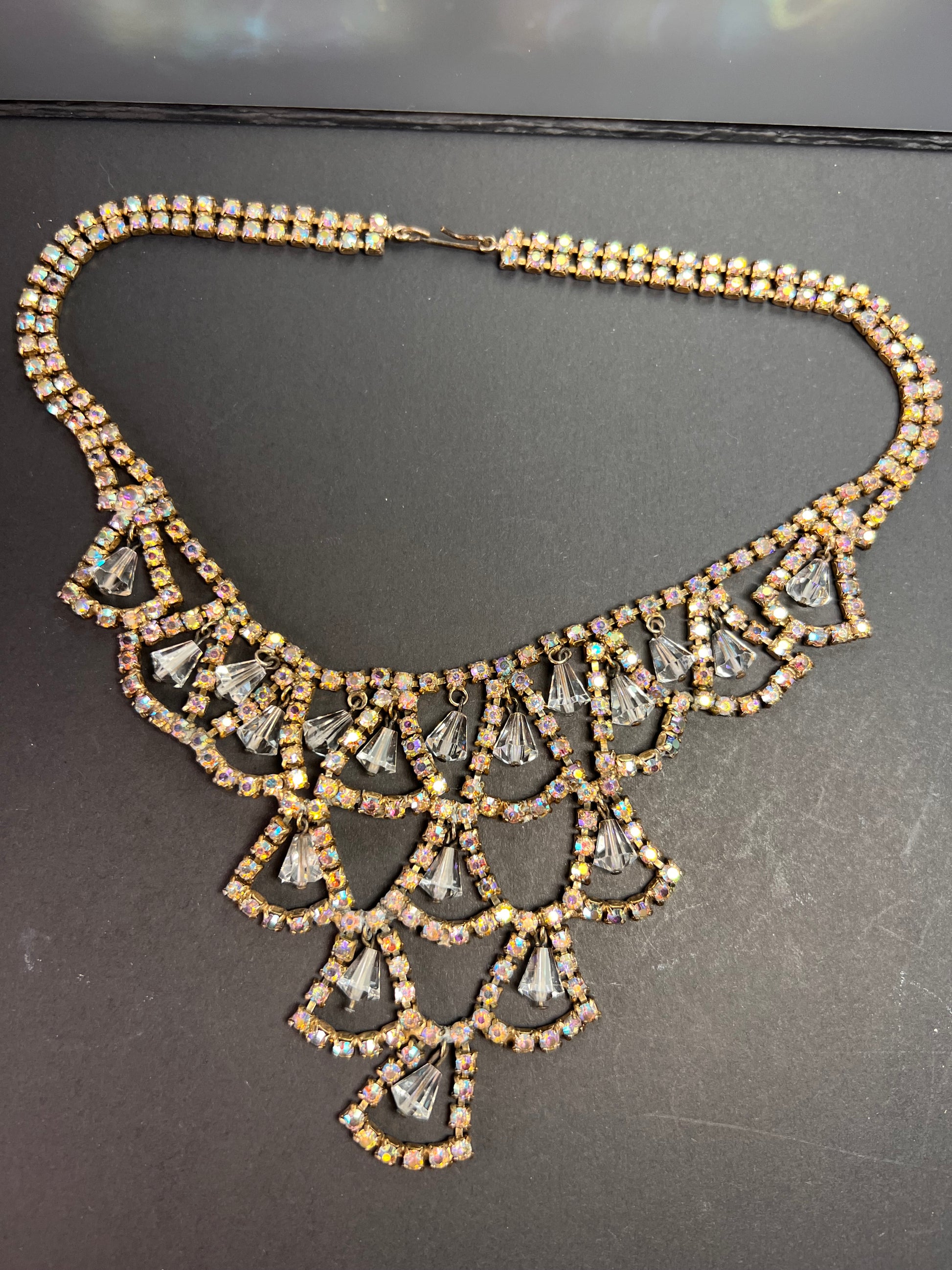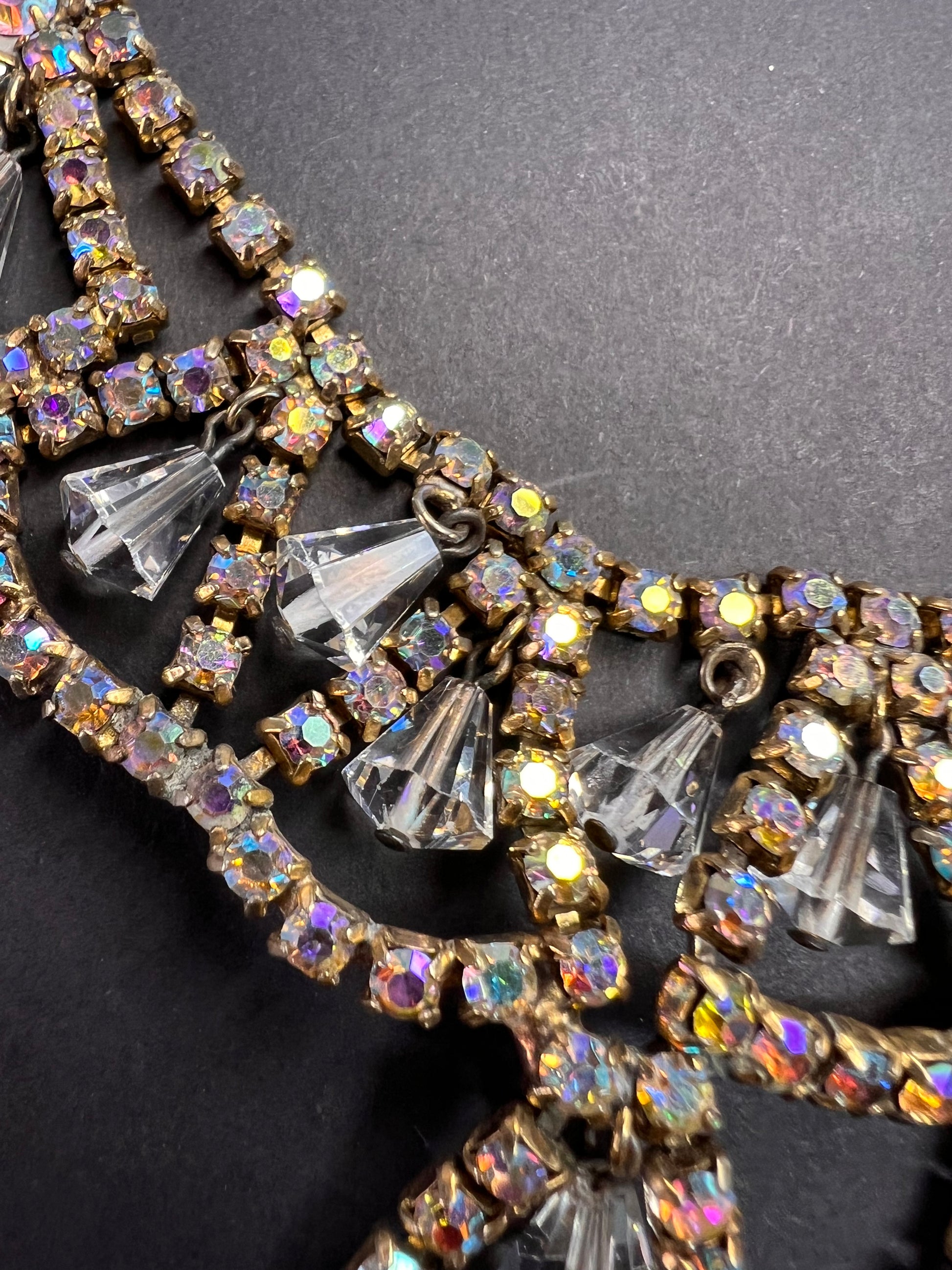 Vintage AB Rhinestone Bib Necklace Clear Glass Dangles Gold Tone