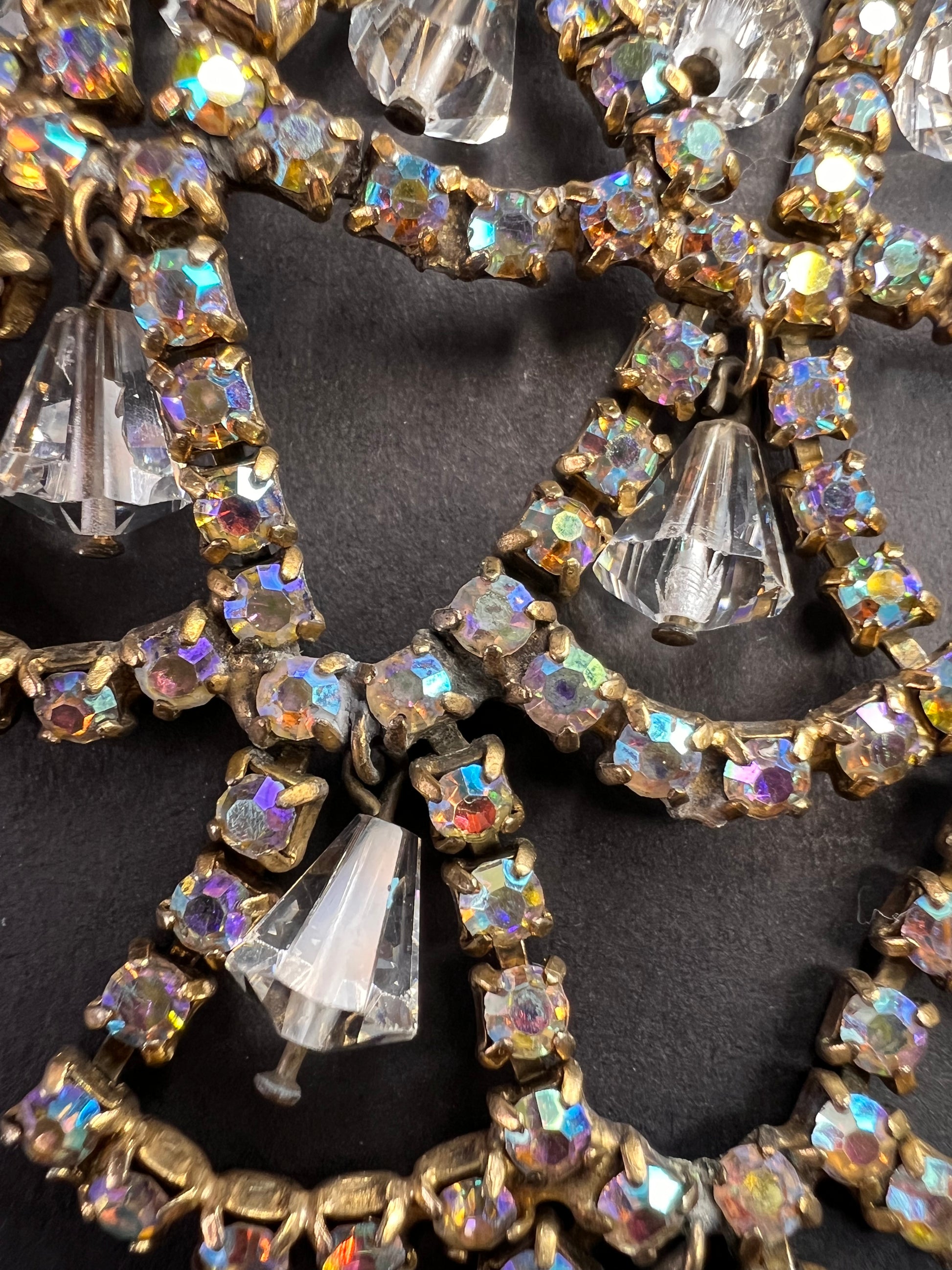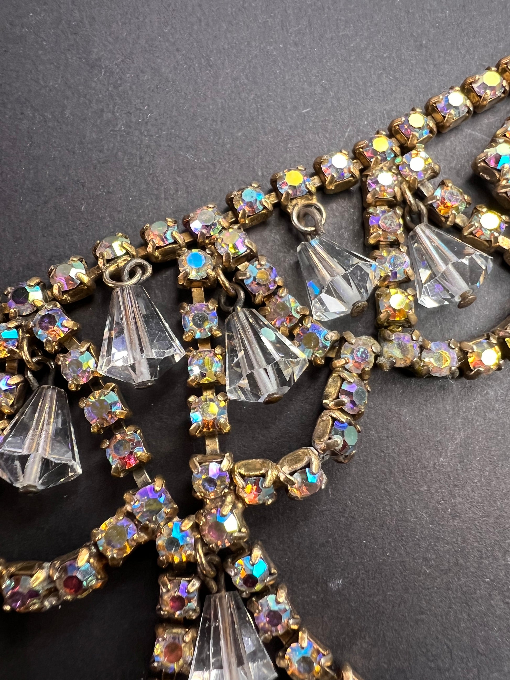 Vintage mid-century statement bib necklace featuring brilliant aurora borealis rhinestones set in warm gold-tone metal with multiple clear faceted glass drop dangles. The layered festoon design creates dramatic movement and sparkle, making this a true showpiece necklace. Construction and materials are consistent with high-quality mid-century costume jewelry and closely resemble Juliana-style designs, though no maker mark is present. Open-back glass stones enhance light refraction, and the necklace sits beautifully at the collarbone for maximum impact. Secure hook clasp. A striking example of classic vintage rhinestone craftsmanship. Measures close to 20 inches at its lowest point.