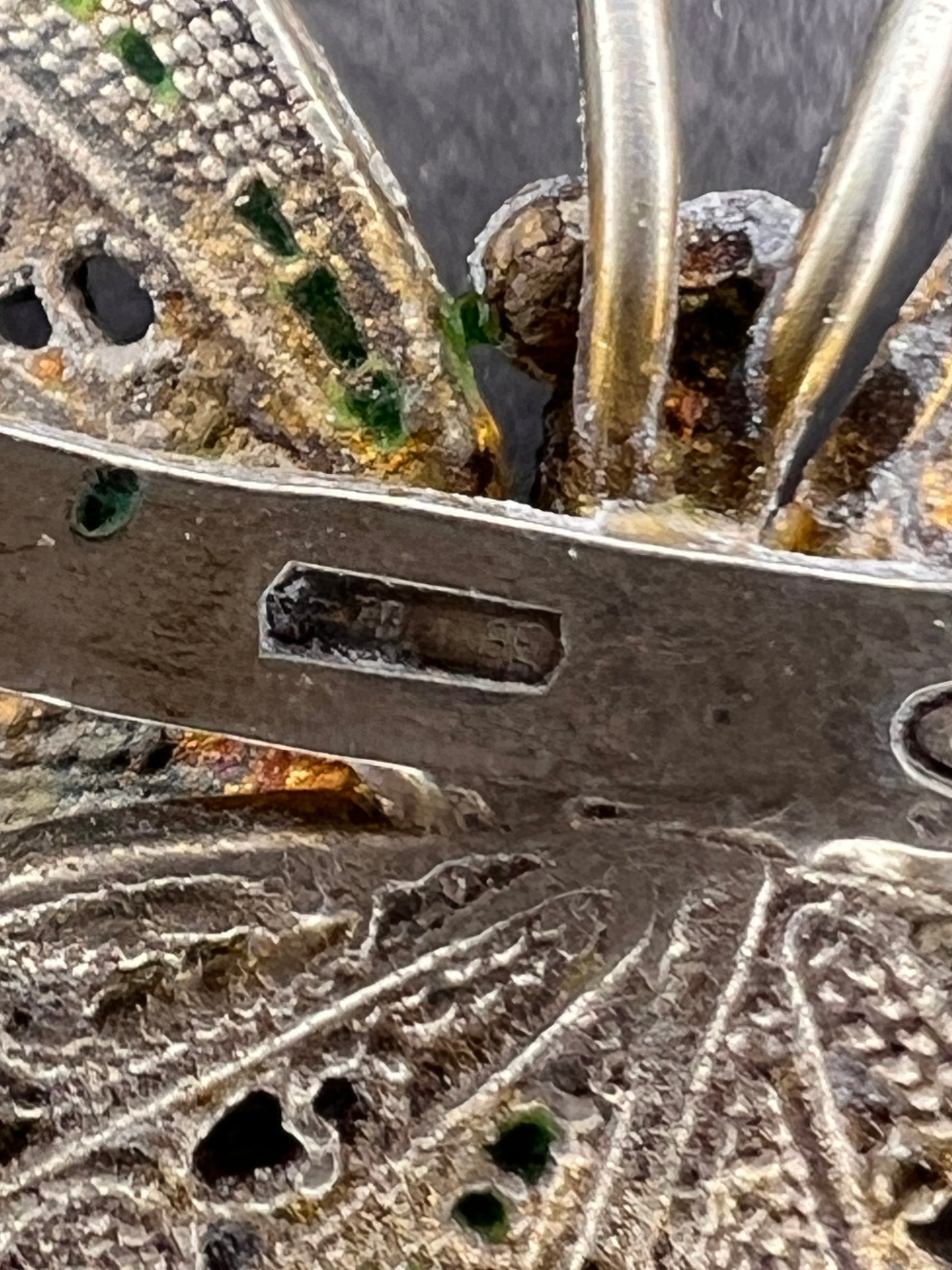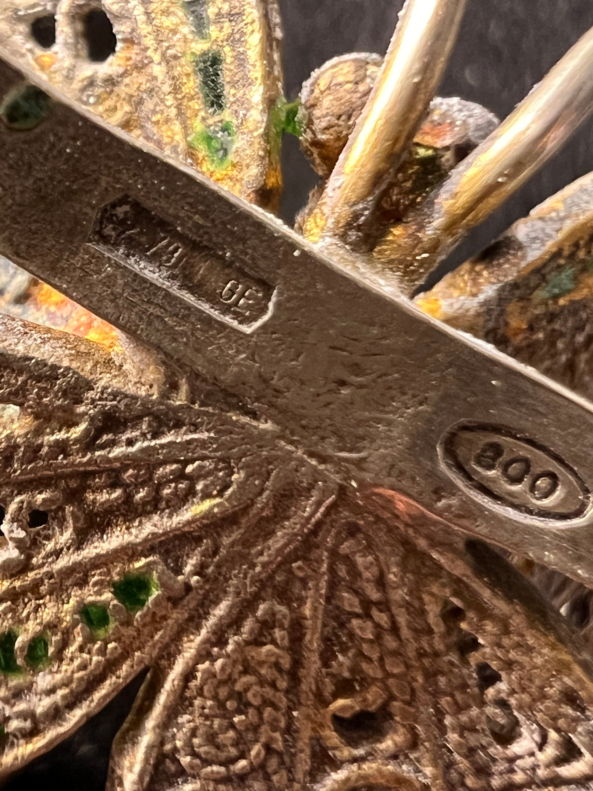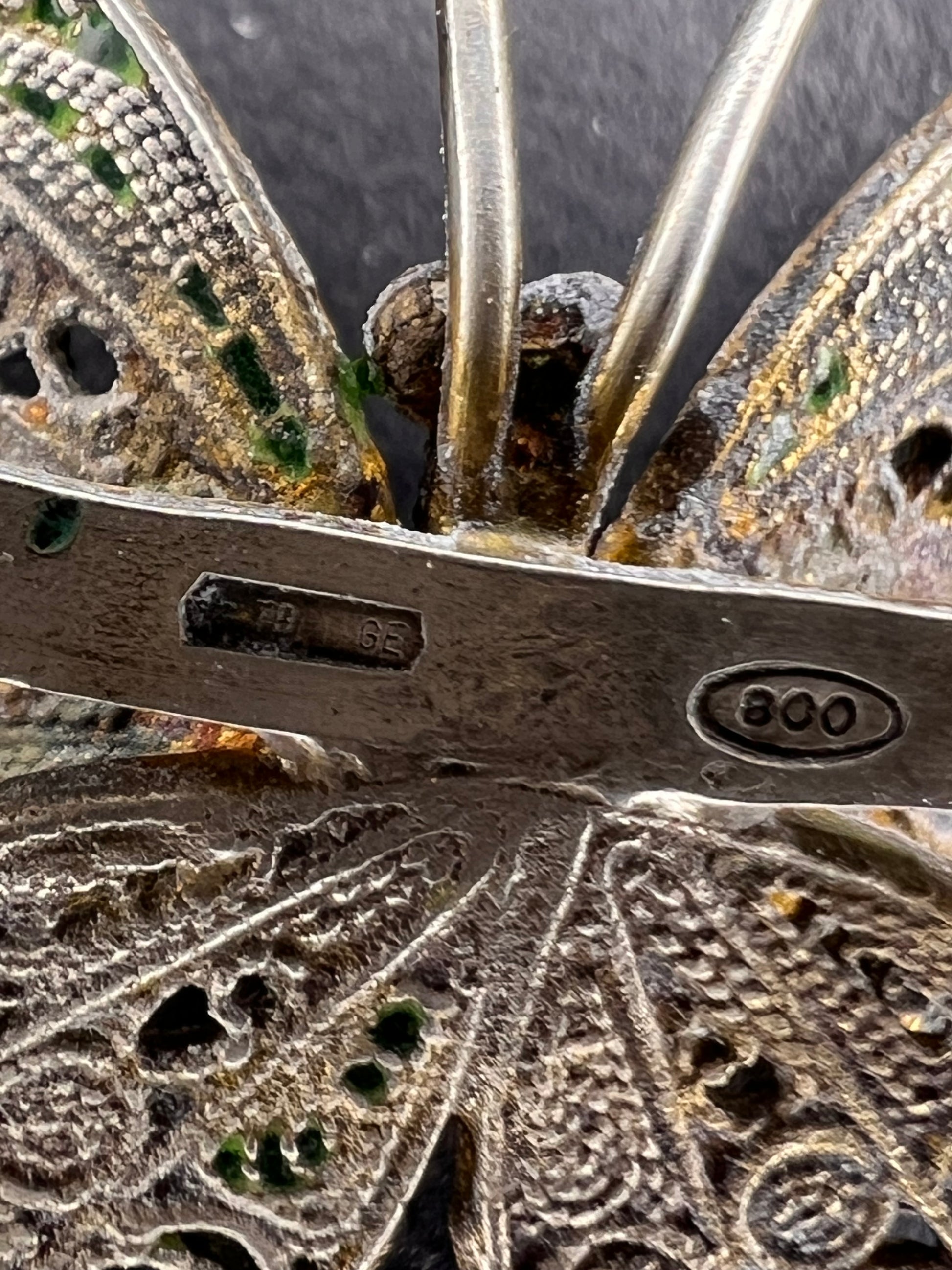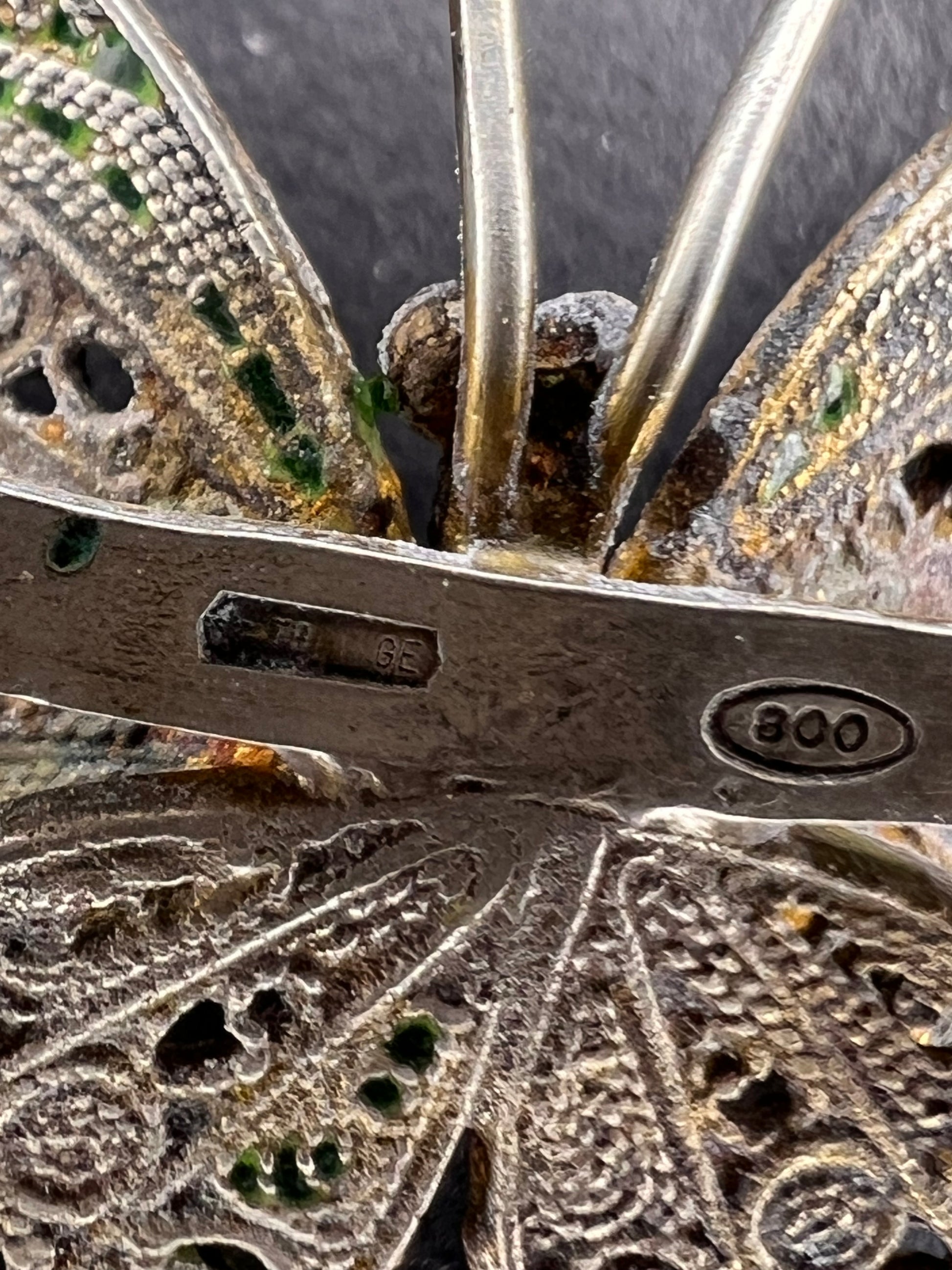 Vintage 40’s-early 70’s era 800 silver butterfly design with glass enamel and filigree details. Brooch is made in Italy by designer Alieti Adriana. Total weight is 5.94 grams. Measures about 1 5/8 inches. Stamped on back 79*GE 800.