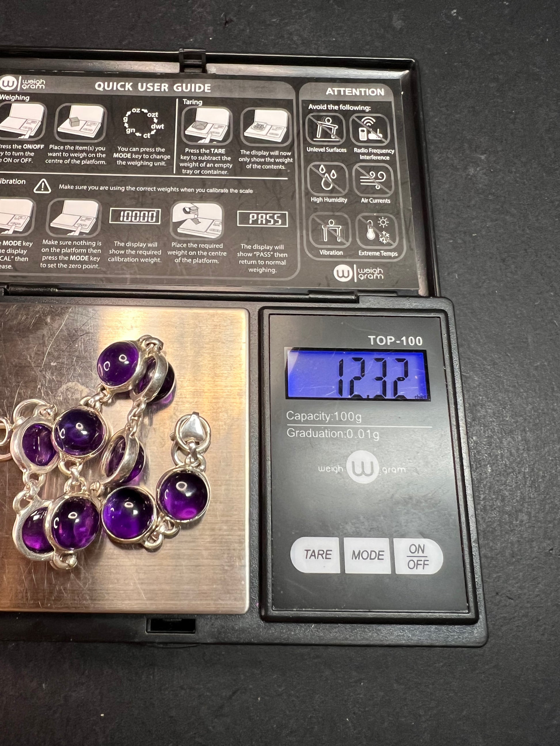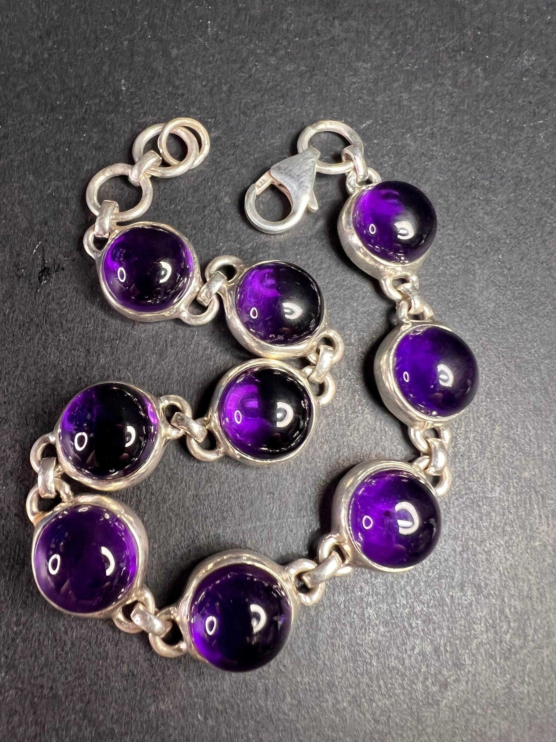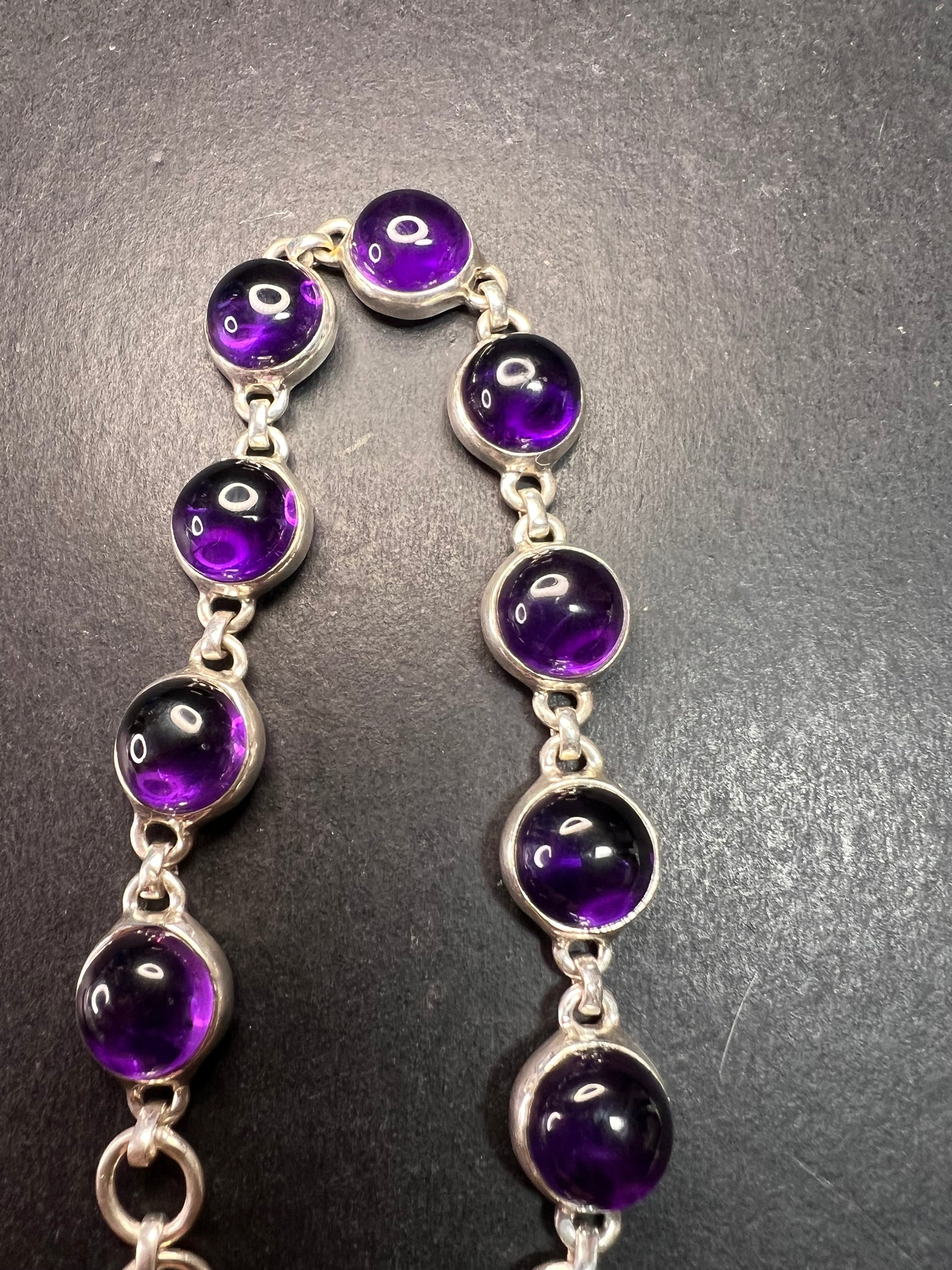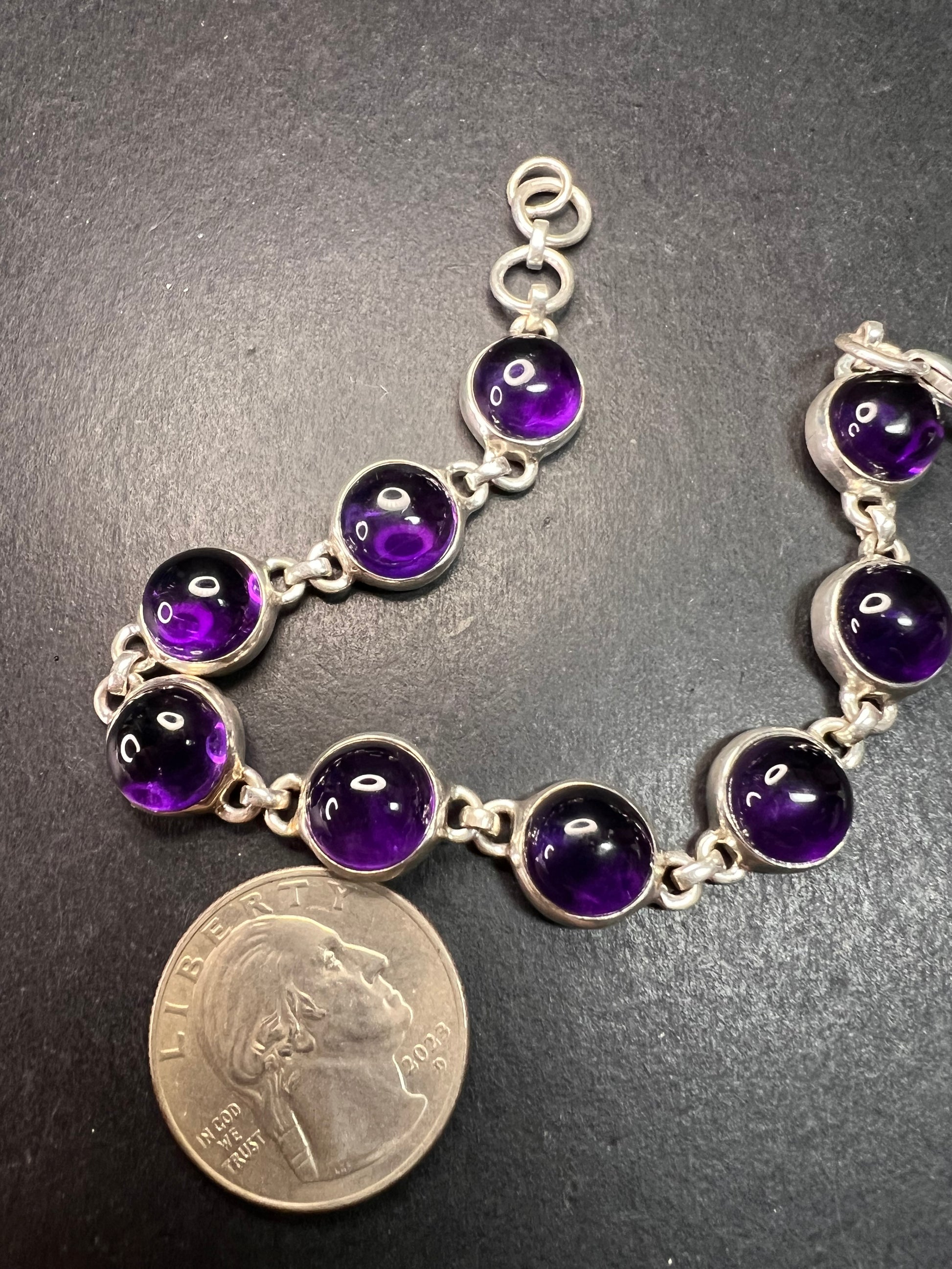 Deep Purple African amethyst round cabochons bezel set in authentic 925 sterling silver. Total weight is 12.32 grams and measures just over 7.75 inches.