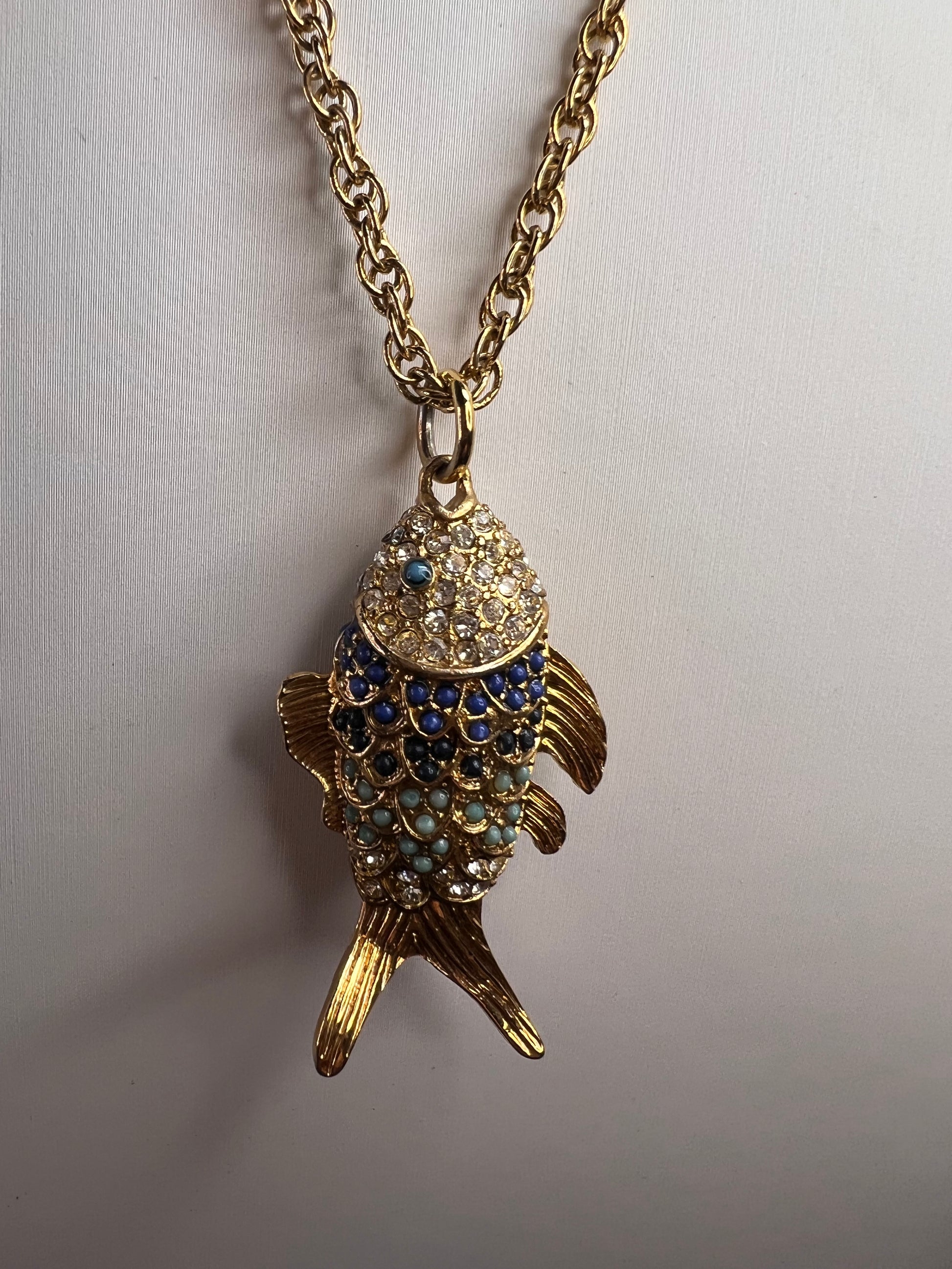Ann Taylor brand gold tone fish pendant with blue glass and rhinestones. Chain measures 32 inches in length with spring clasp. Ann Taylor logo charm dangling from clasp end.