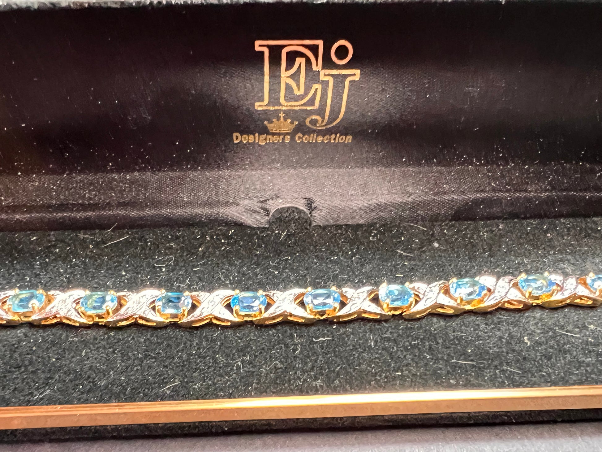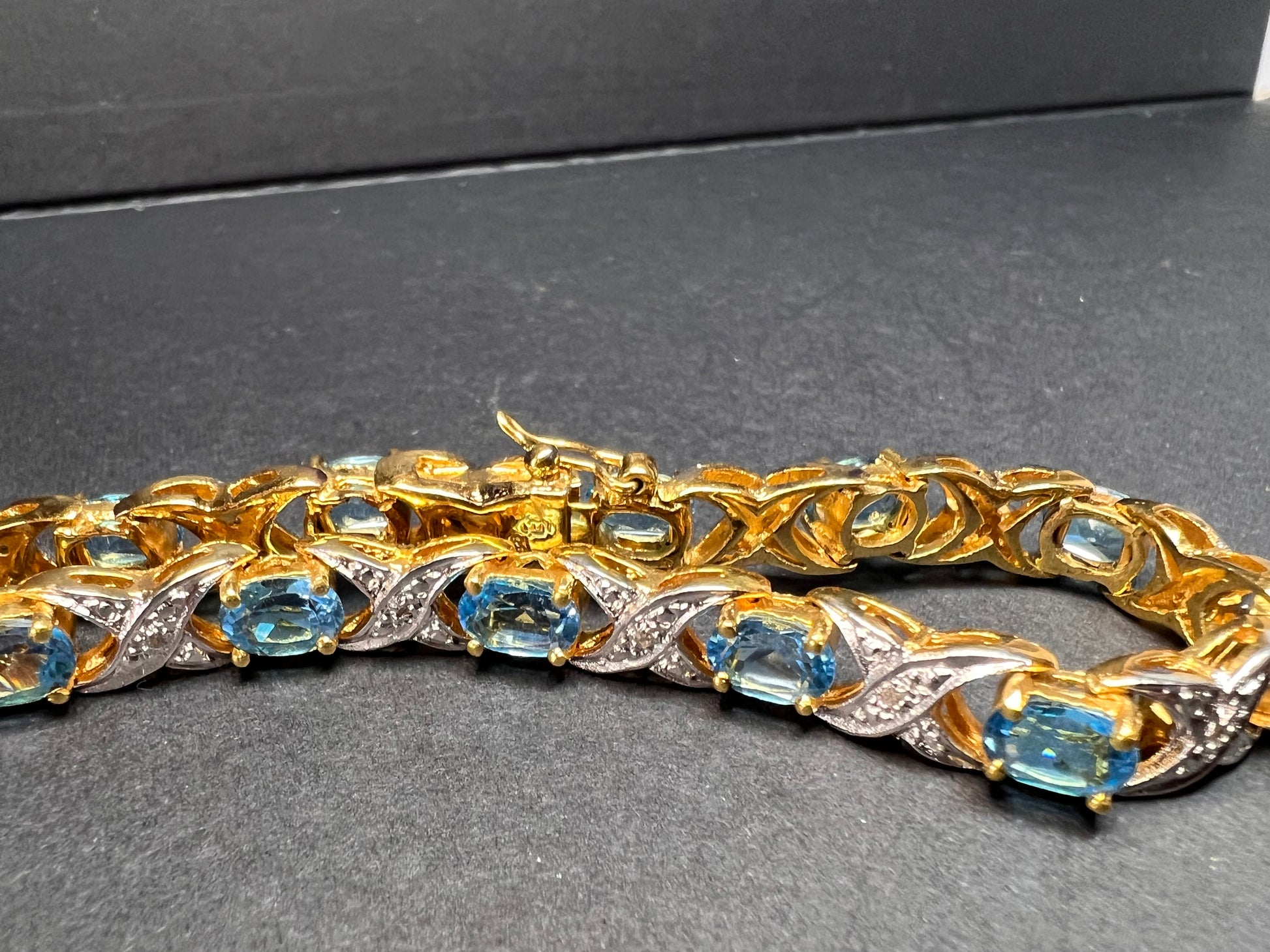 Genuine blue topaz gemstones x 12, with 12 tiny colorless/ white diamond accent stones. Prong set in yellow gold plated over authentic 925 sterling silver. Measures just a tad bit over 7 inches in length. Box flap with two safety snaps. Comes with velvet box from EJ Designers Collection.