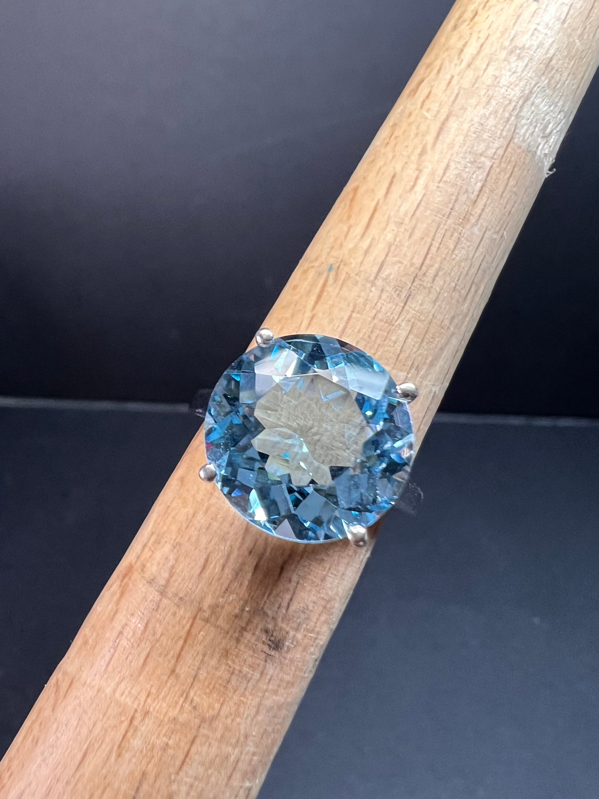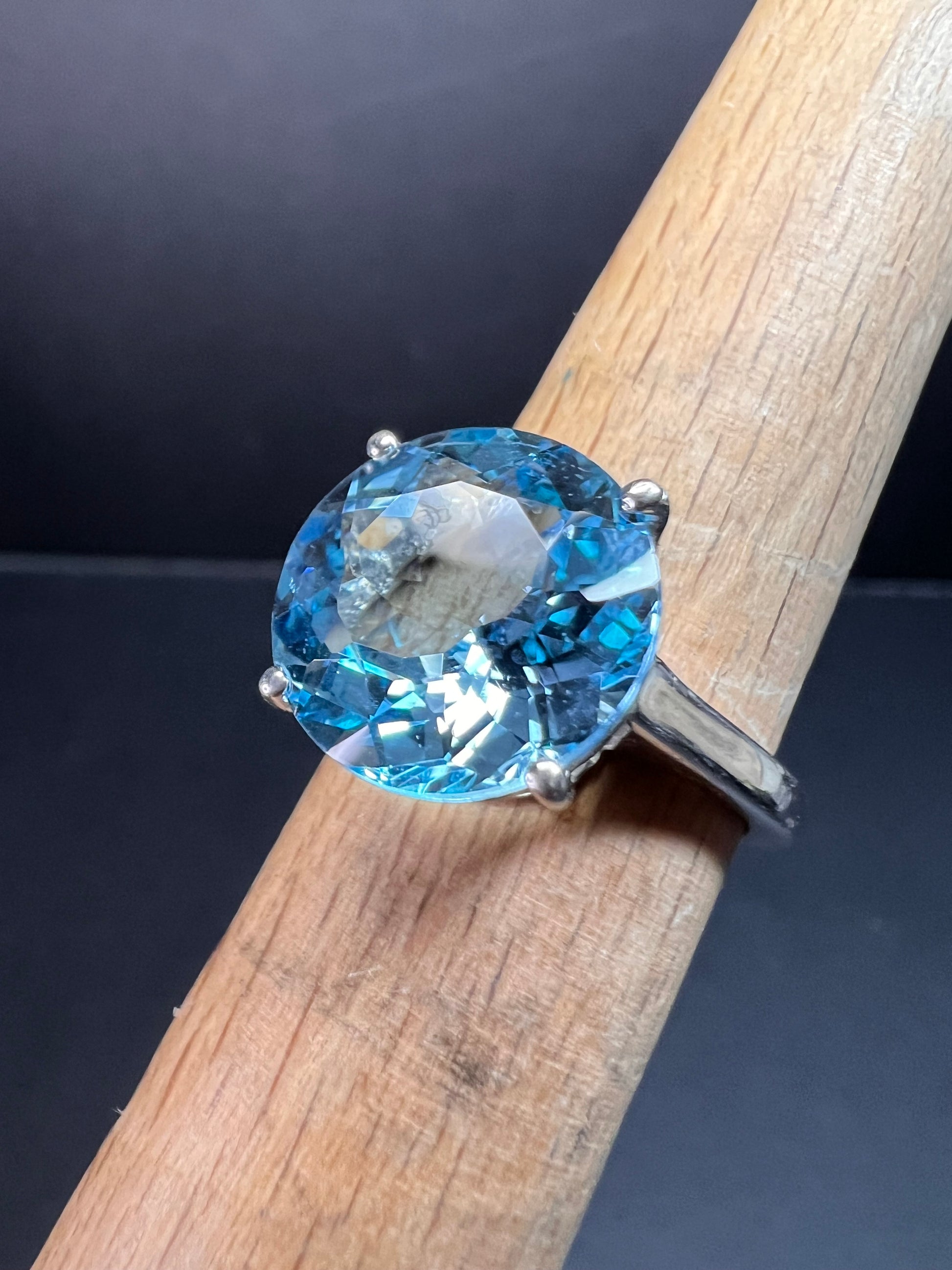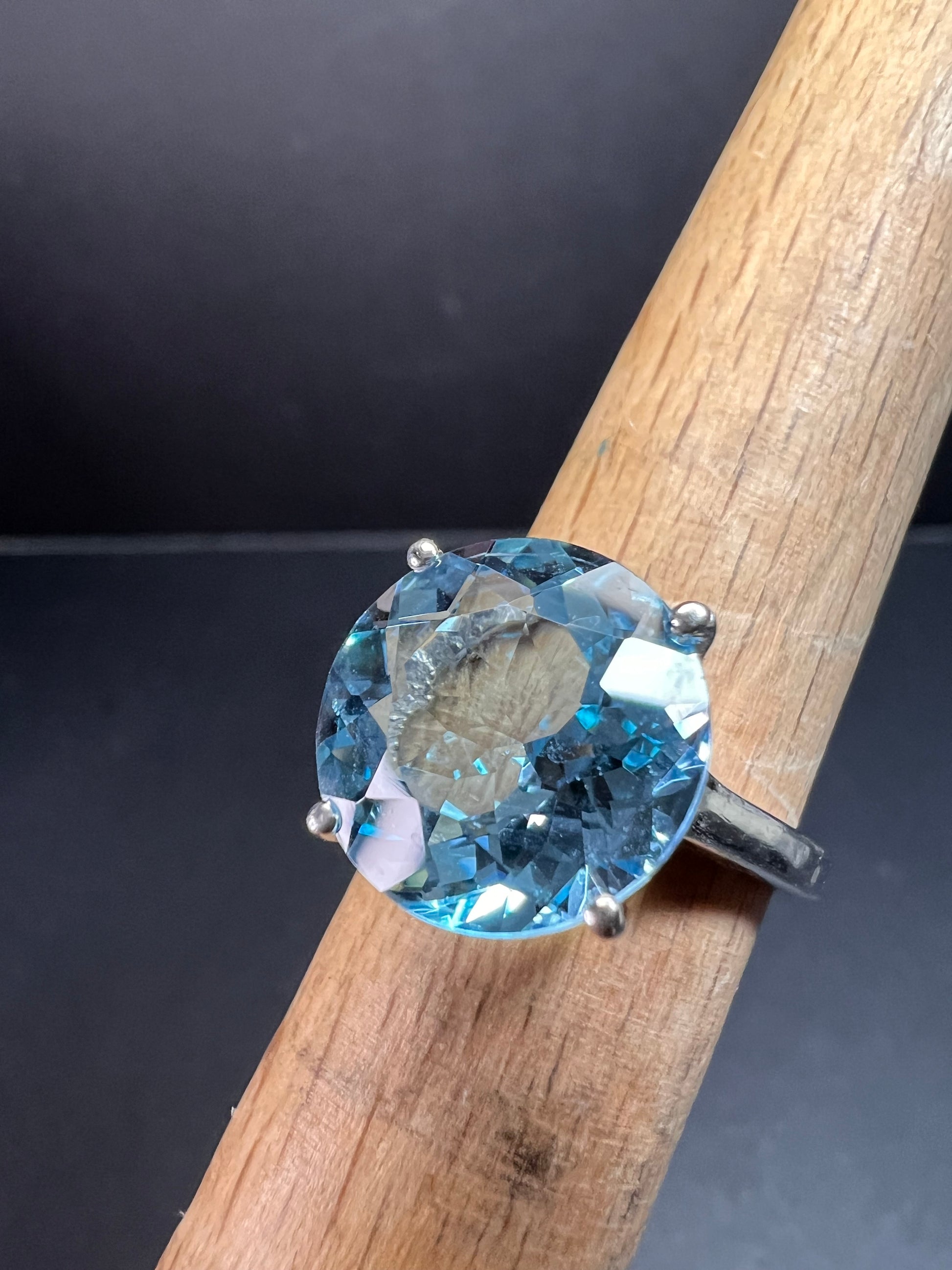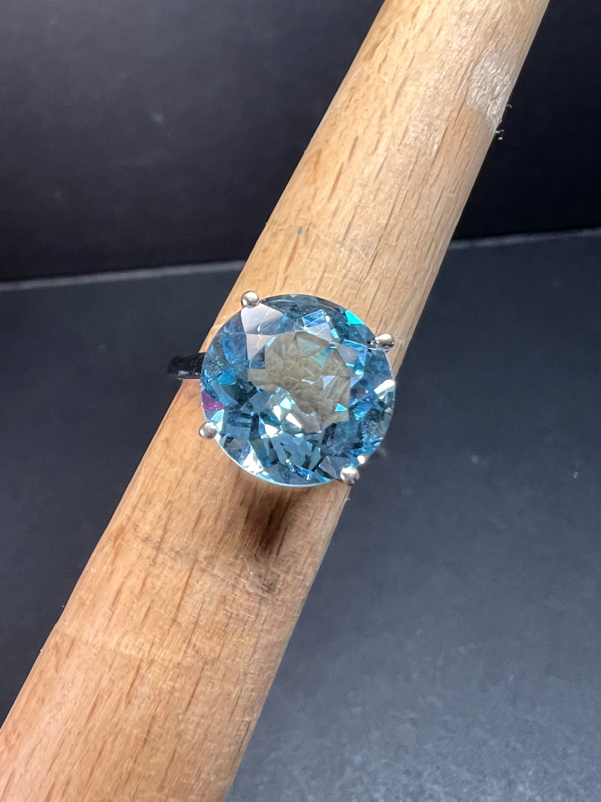 Genuine sky blue topaz round cut gemstone measuring about 13mm in diameter, prong set in an authentic 925 sterling silver setting that’s likely plated with rhodium. Measures a size 7 and has a total weight of 5.07 grams. Stamped 925 India.