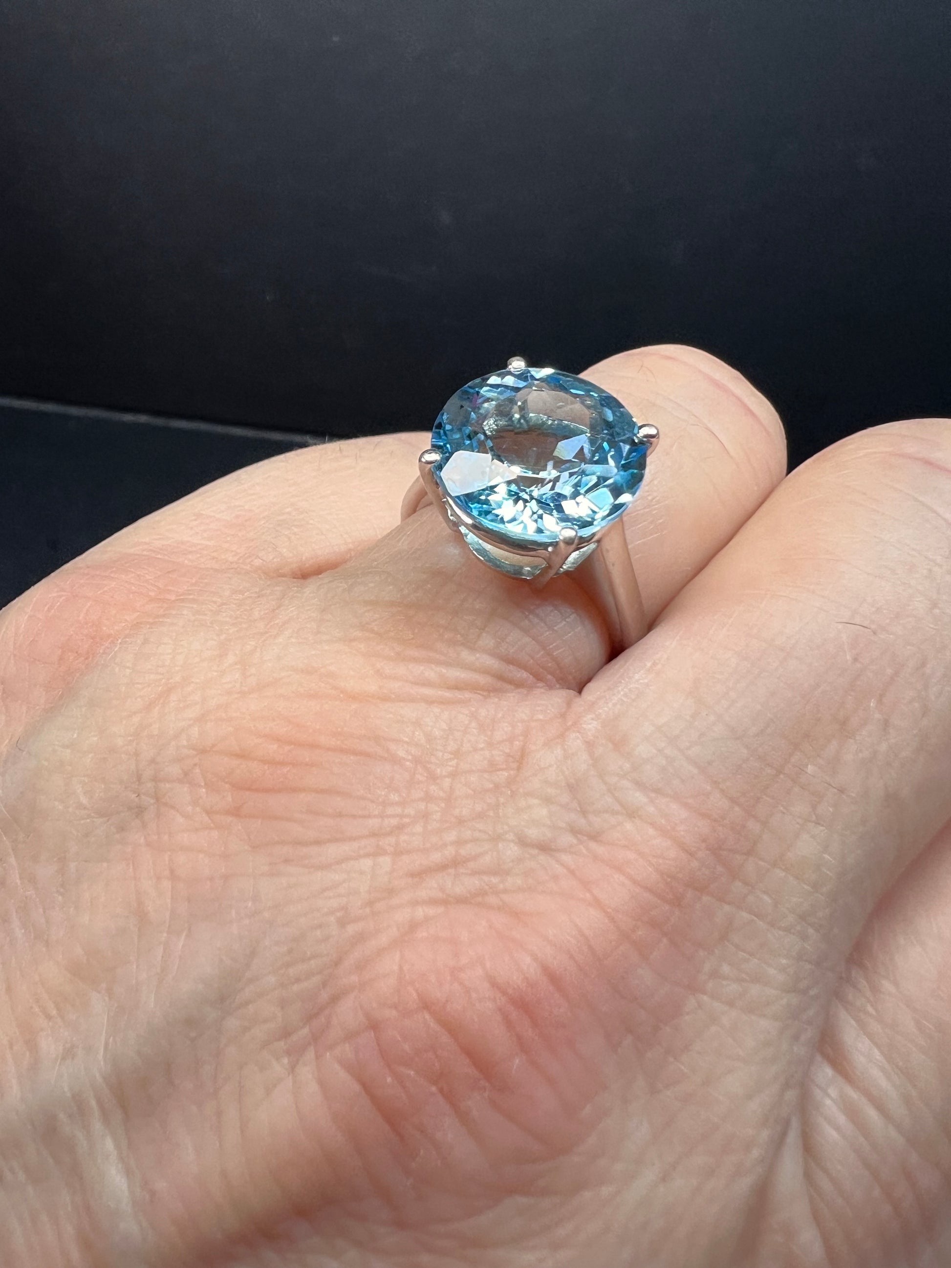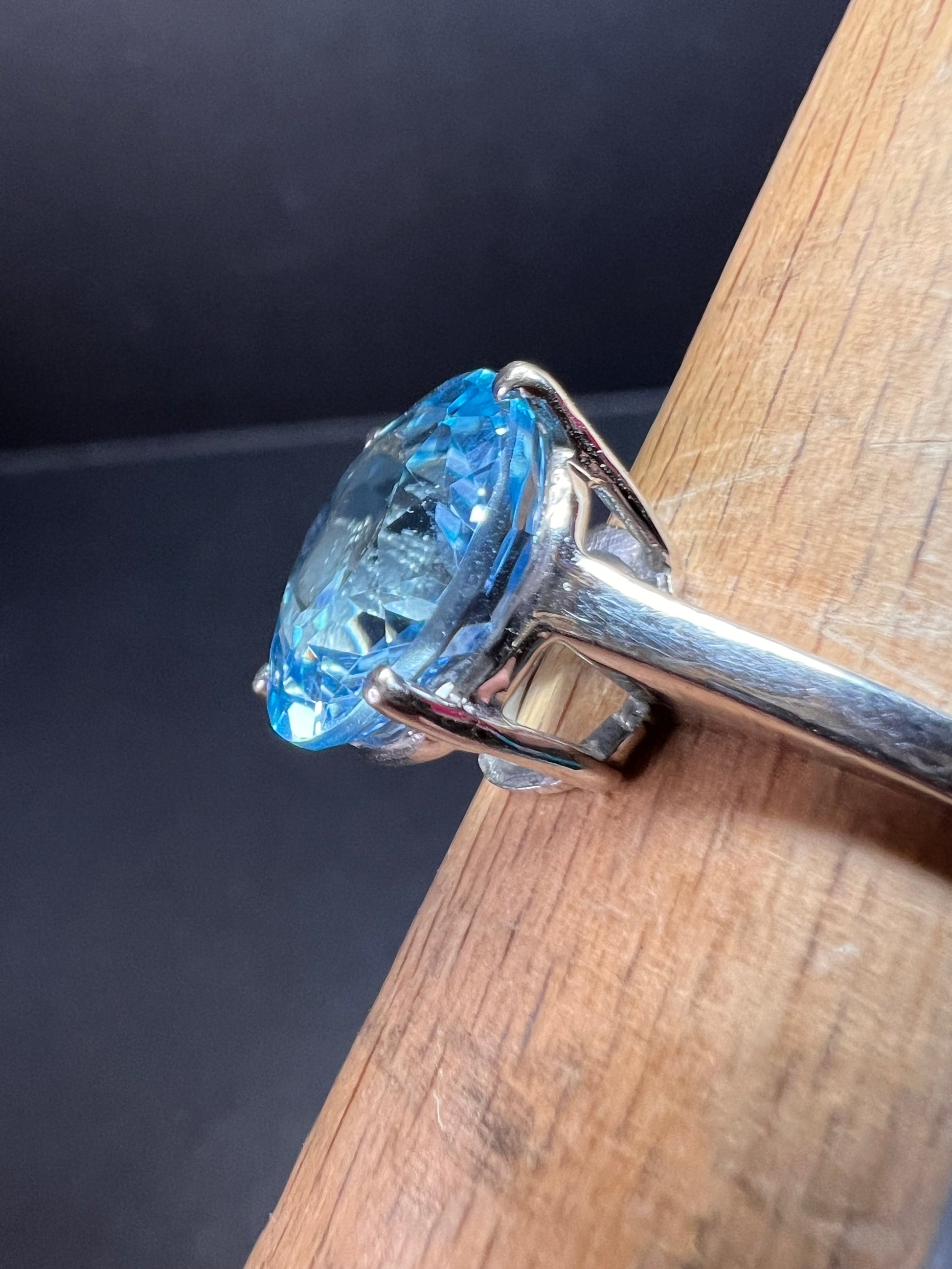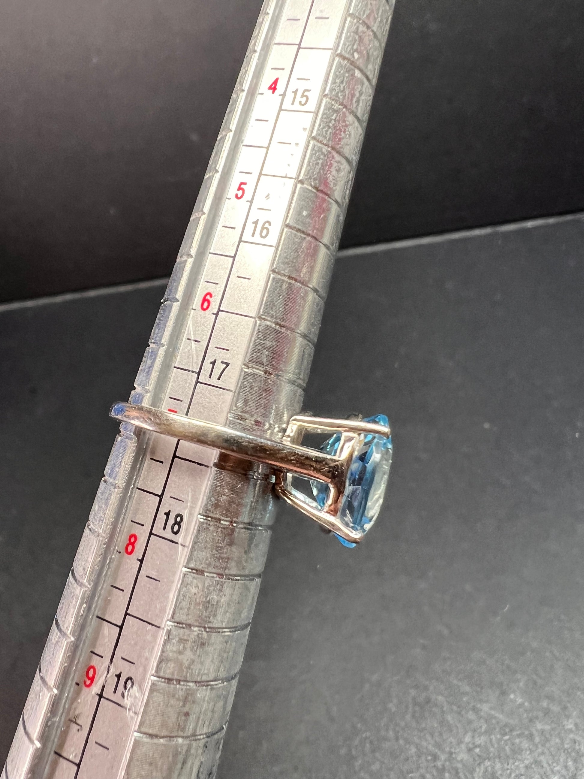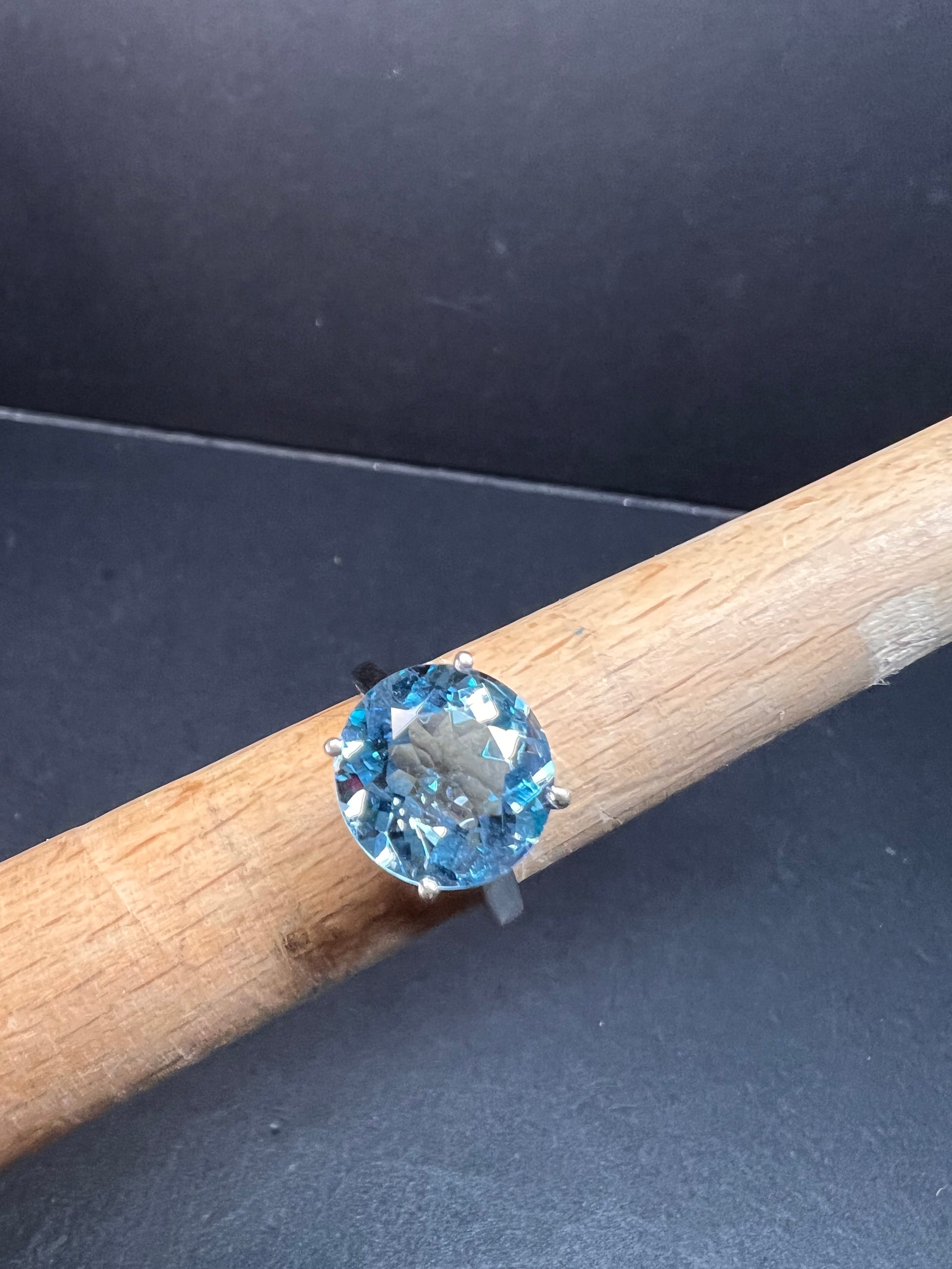 Genuine sky blue topaz round cut gemstone measuring about 13mm in diameter, prong set in an authentic 925 sterling silver setting that’s likely plated with rhodium. Measures a size 7 and has a total weight of 5.07 grams. Stamped 925 India.