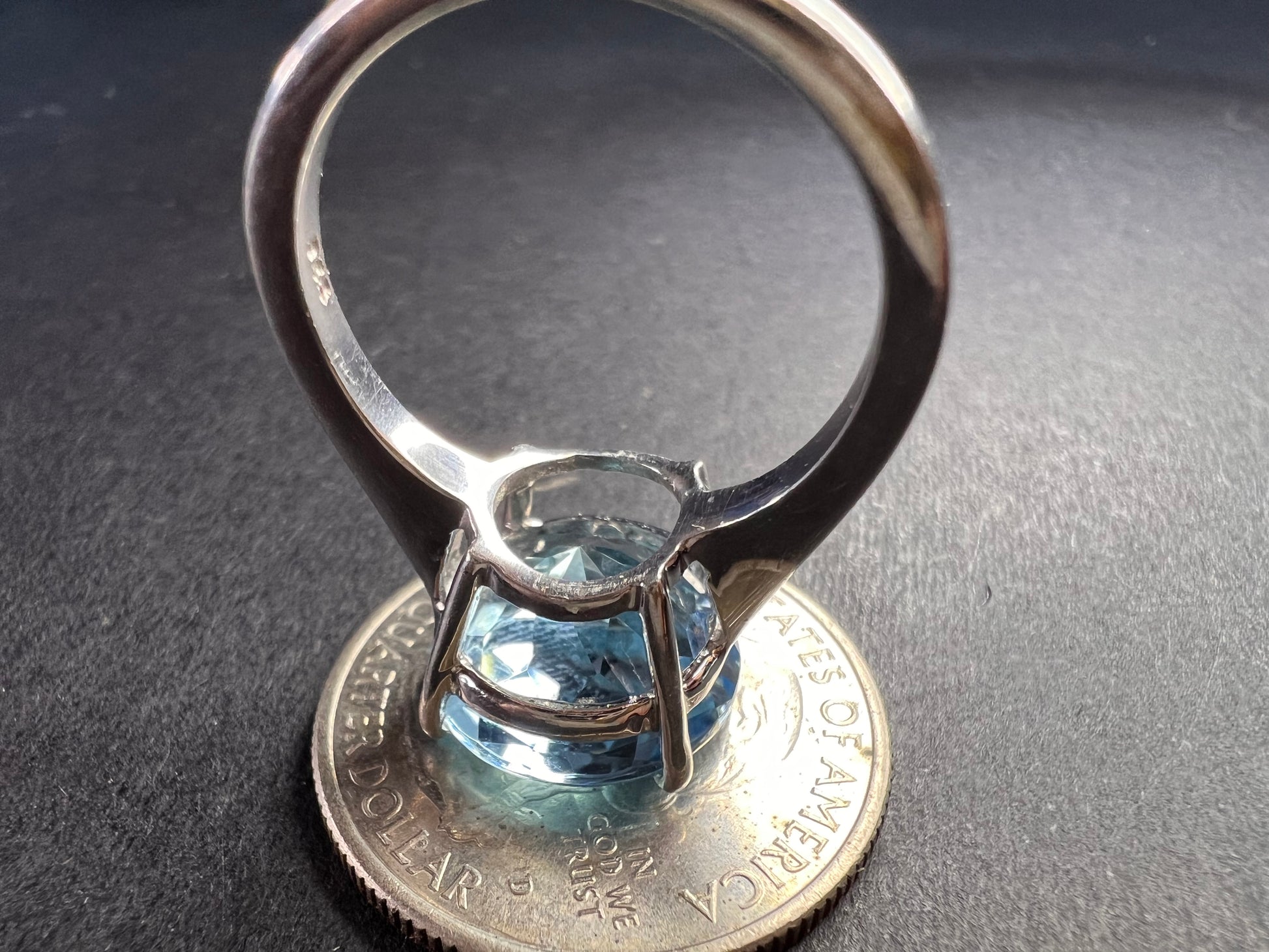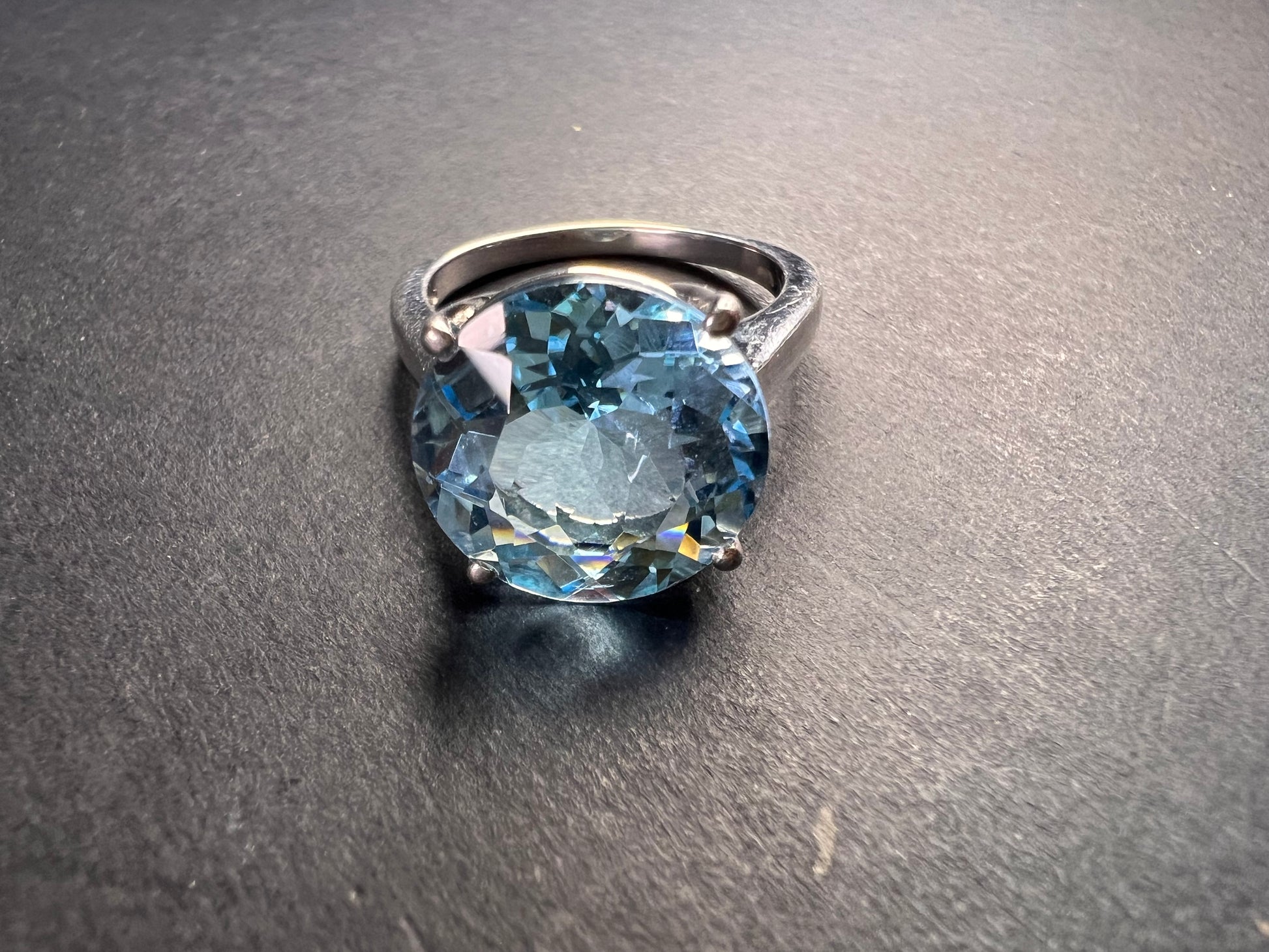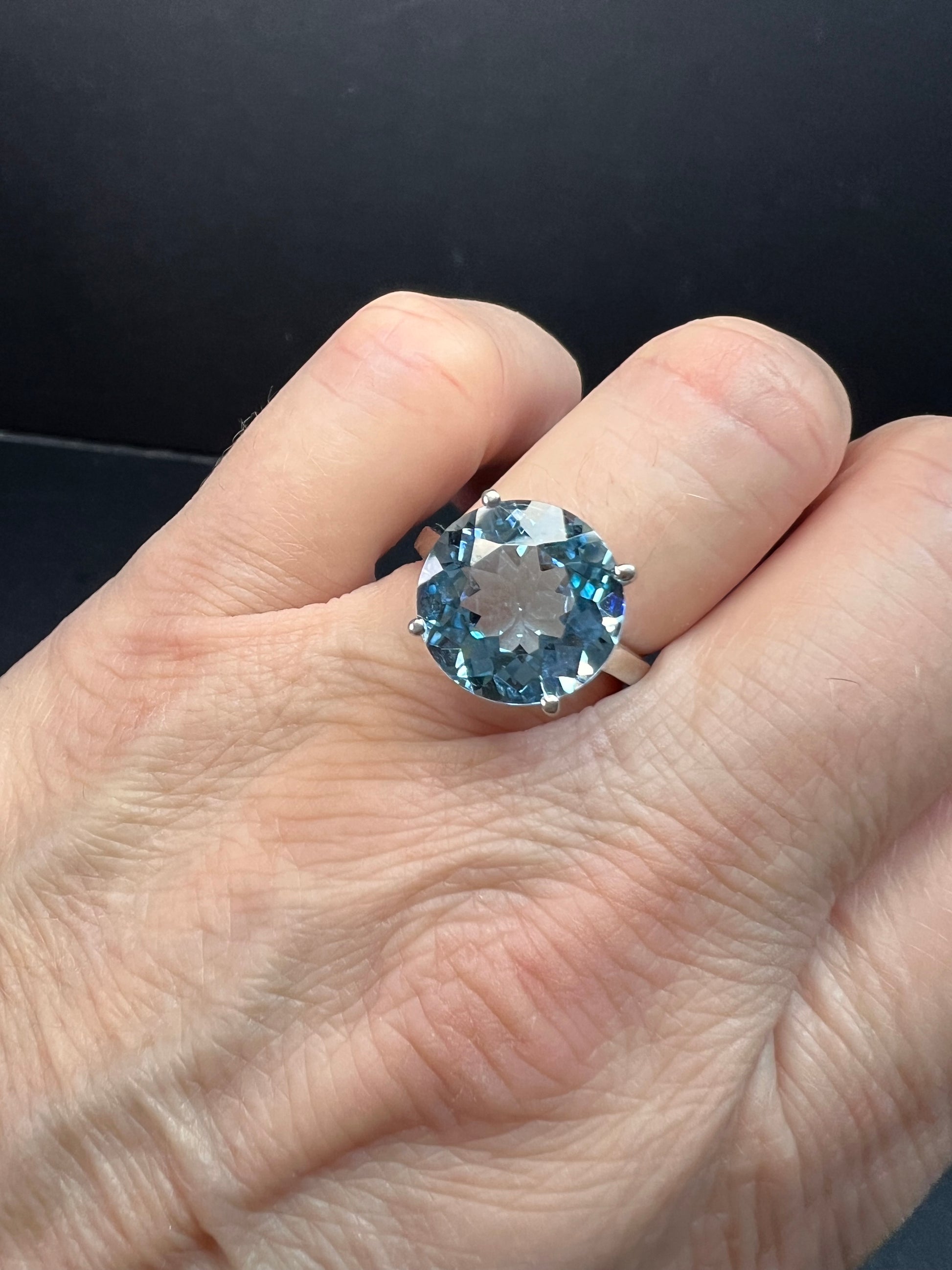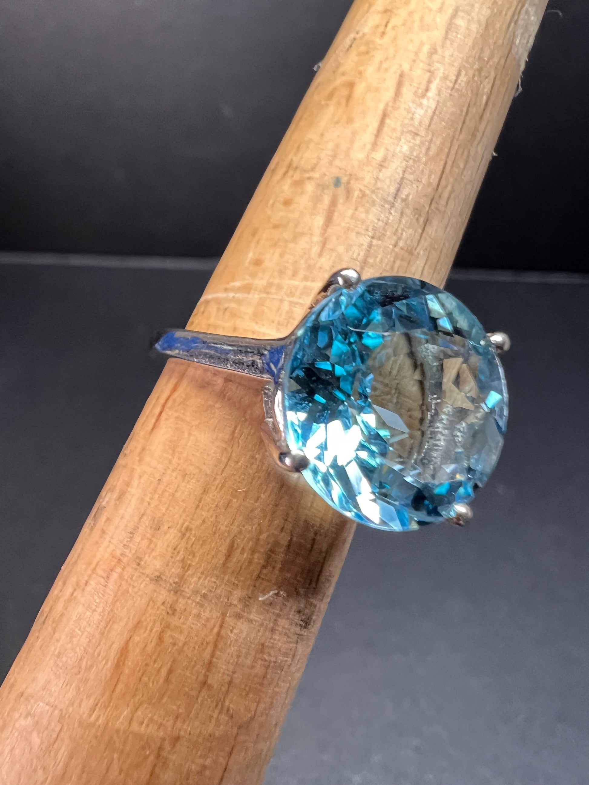 Genuine sky blue topaz round cut gemstone measuring about 13mm in diameter, prong set in an authentic 925 sterling silver setting that’s likely plated with rhodium. Measures a size 7 and has a total weight of 5.07 grams. Stamped 925 India.