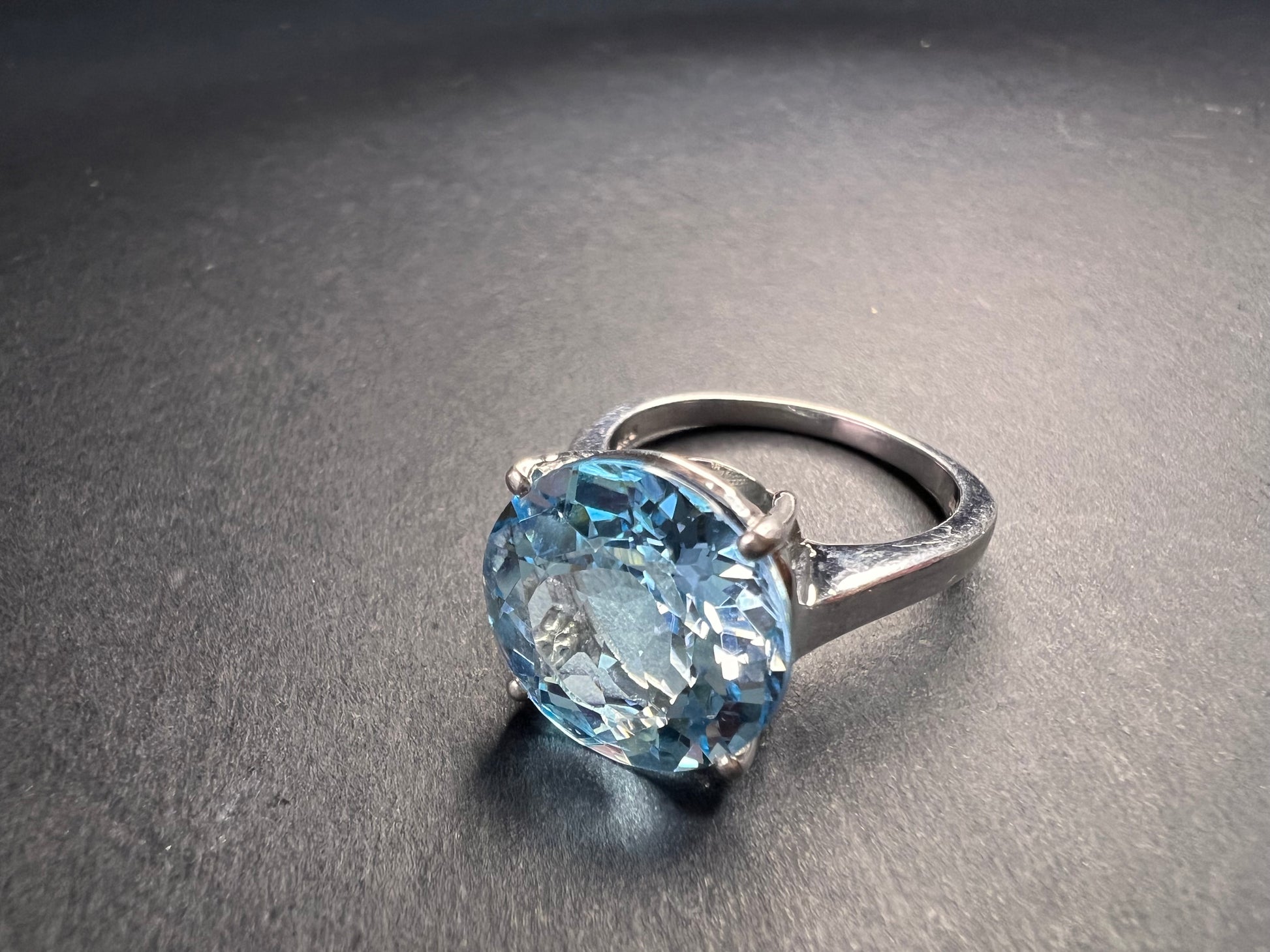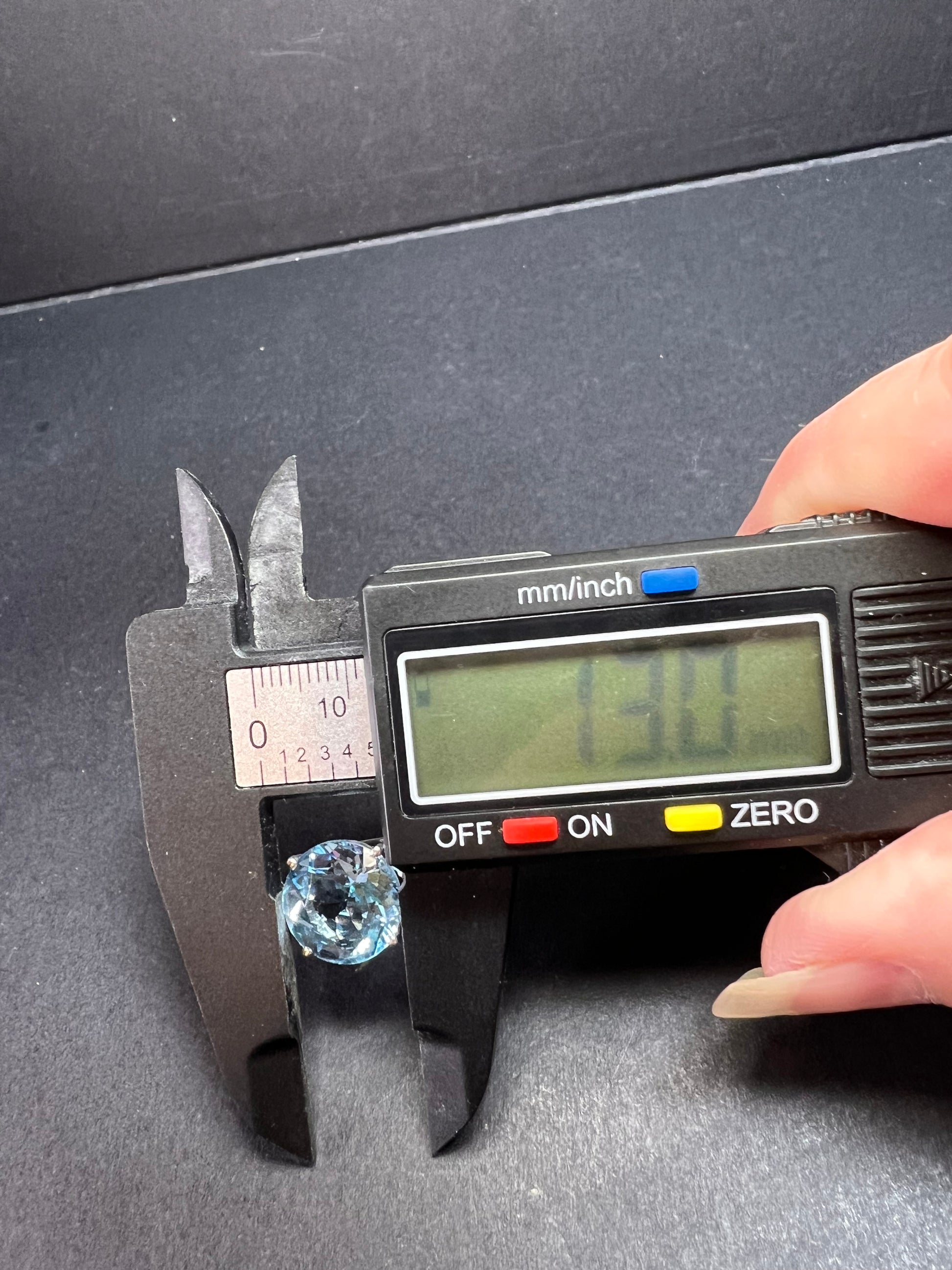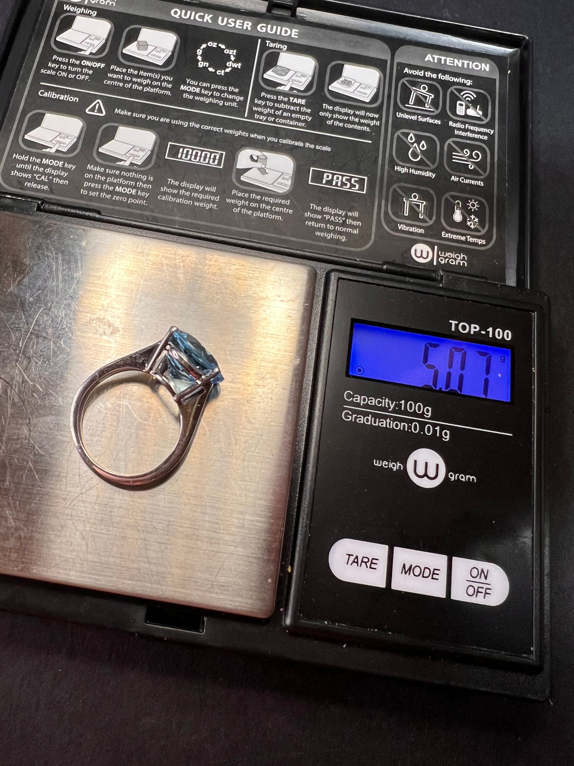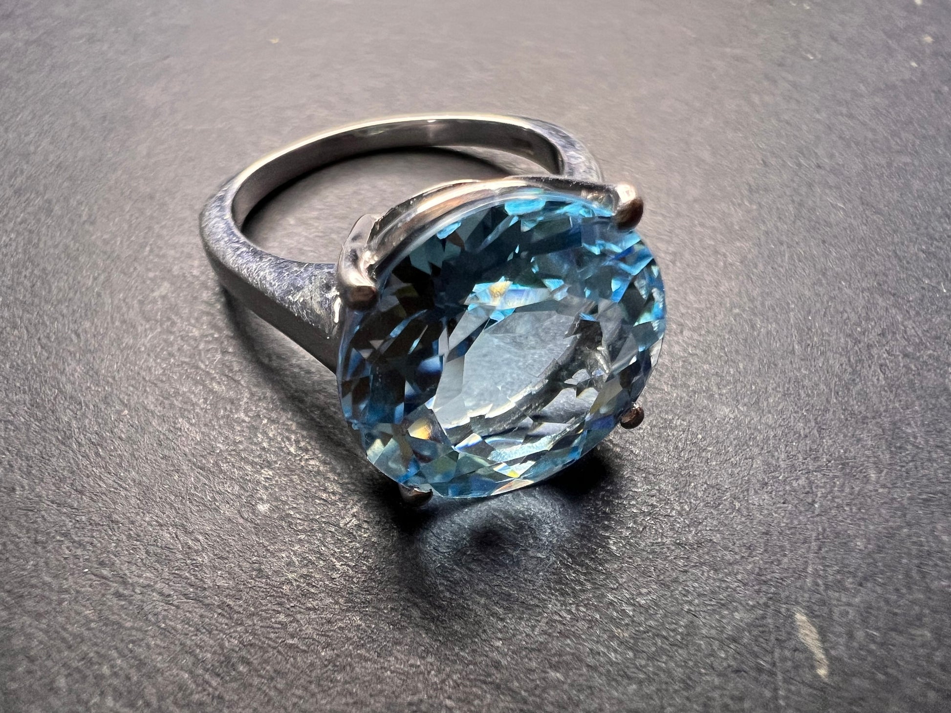 Genuine sky blue topaz round cut gemstone measuring about 13mm in diameter, prong set in an authentic 925 sterling silver setting that’s likely plated with rhodium. Measures a size 7 and has a total weight of 5.07 grams. Stamped 925 India.