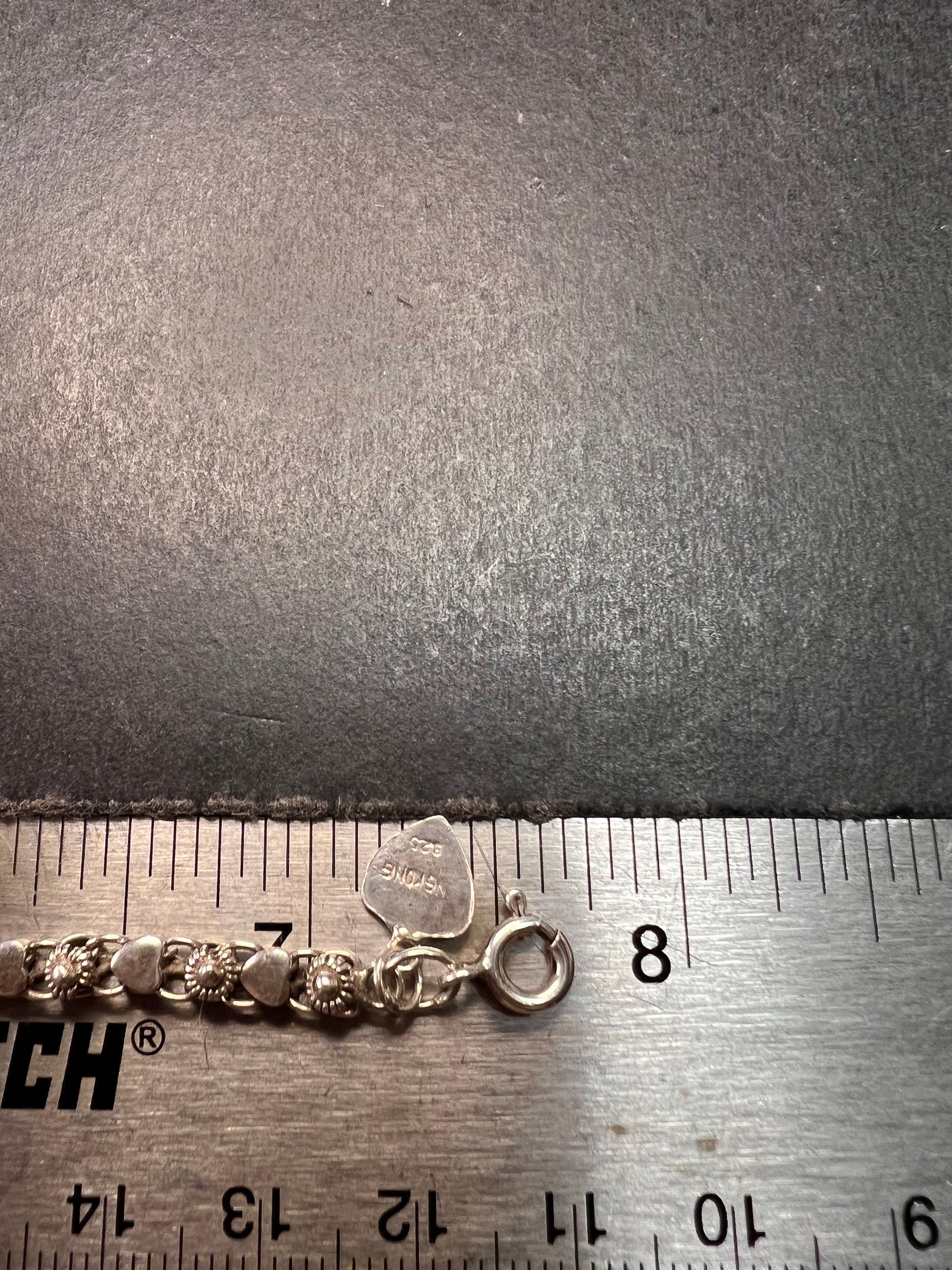 Authentic 925 sterling silver tennis bracelet with cannetille and hearts measuring about 7.5 inches with a spring ring clasp. Heart charm on end is stamped 925 Hong Kong. Total weight is 6.53 grams.