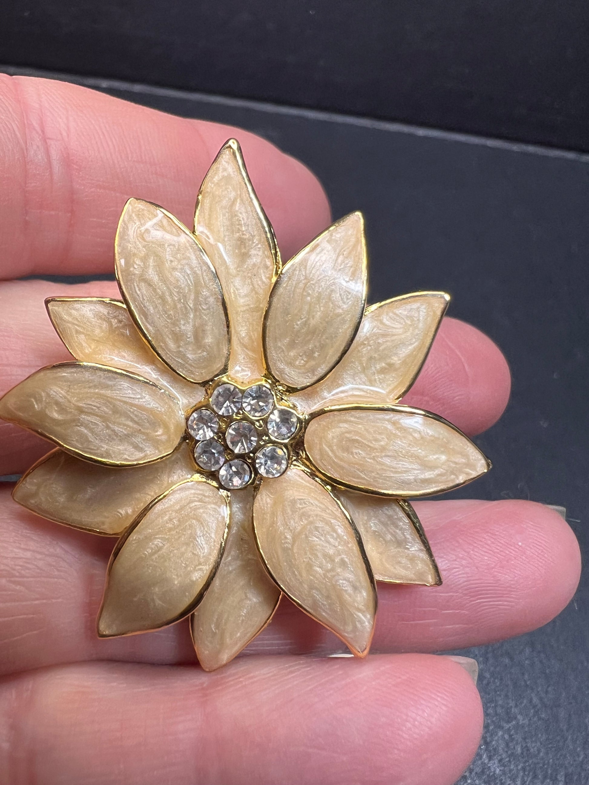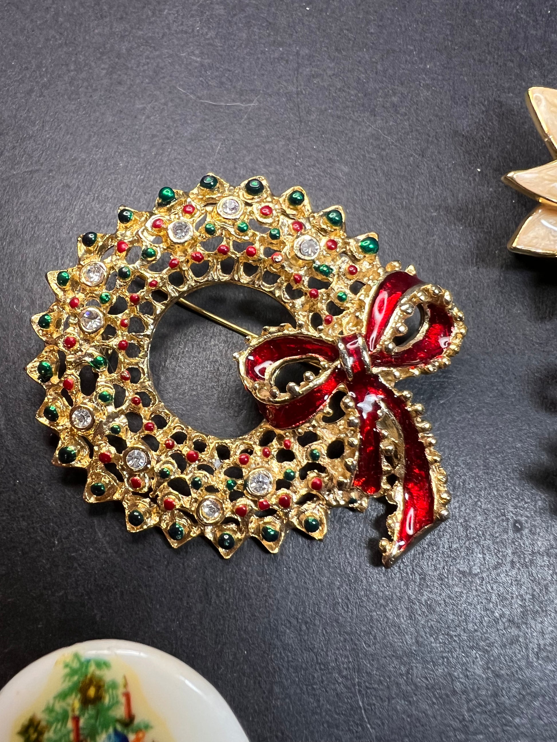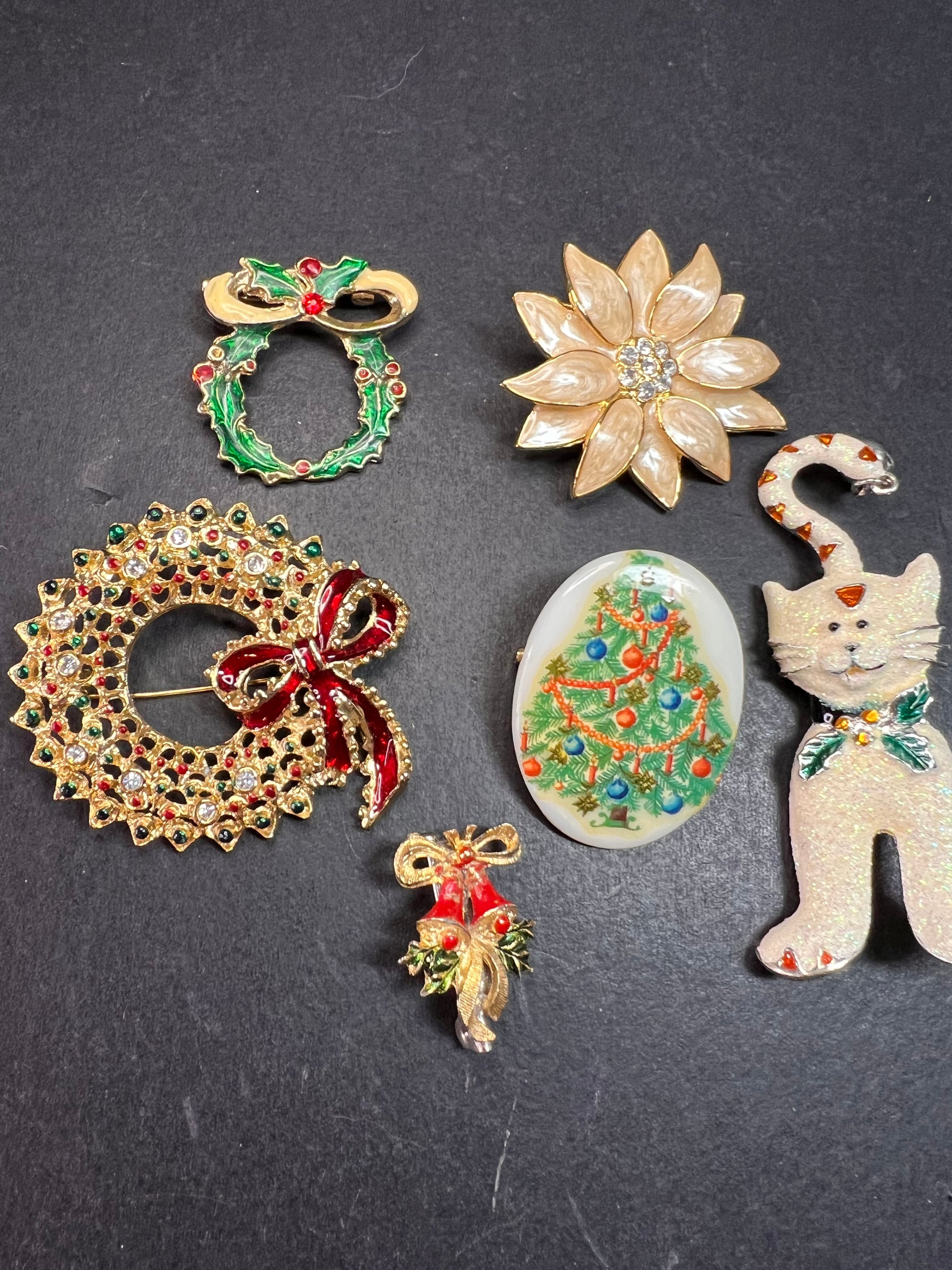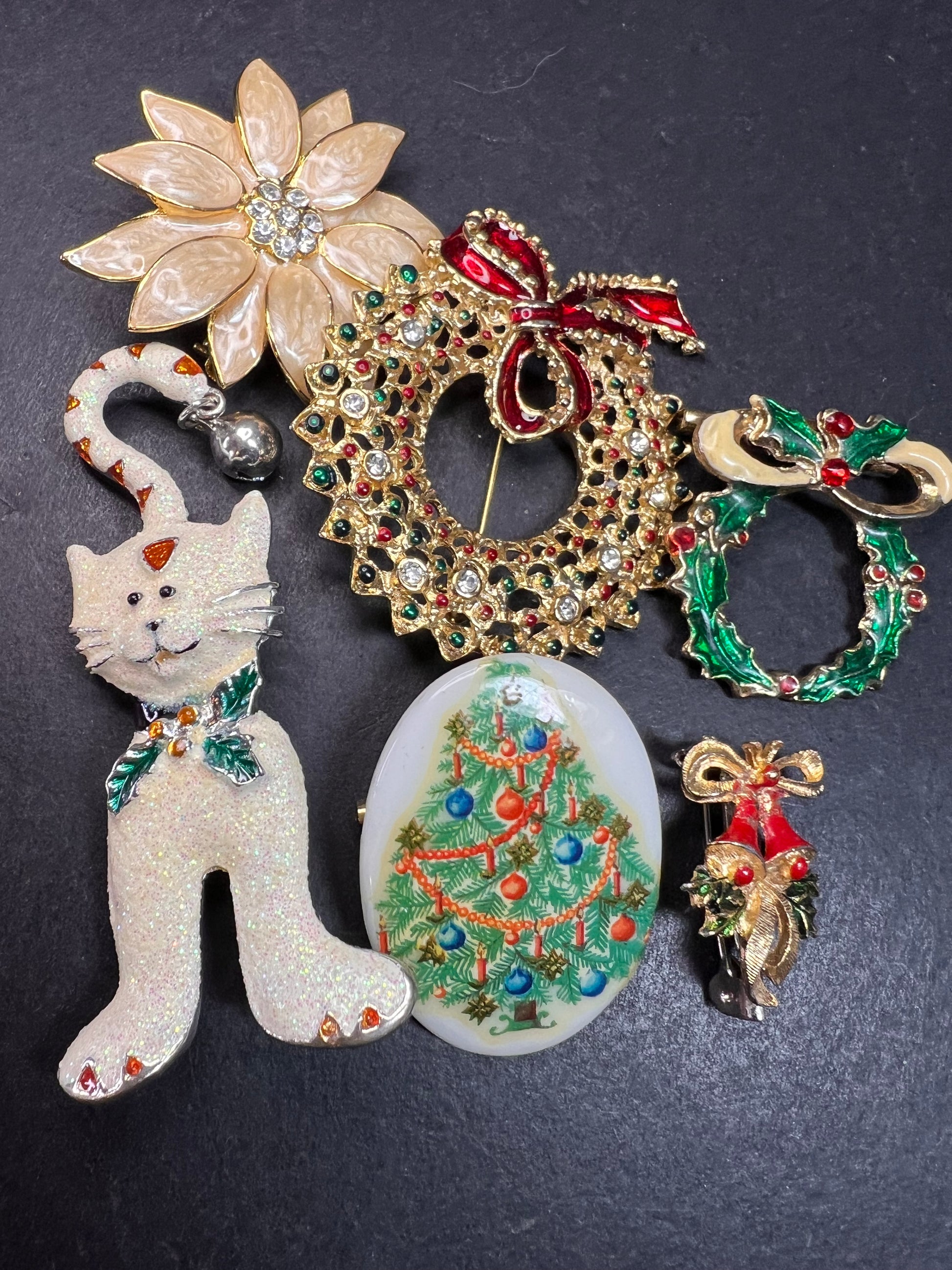 Charming lot of six vintage costume jewelry Christmas brooch pins featuring classic holiday motifs including wreaths, a decorated Christmas tree, festive bows, holly, a glitter enamel cat, and a poinsettia flower. Mixed gold and silver tone metals with enamel, glitter, and rhinestone accents. These are mid-century to late 20th century vintage pieces, perfect for holiday collecting, gift giving, or seasonal wear. All pins are pre-owned estate finds in good vintage condition with working clasps as shown in photos. A wonderful coordinated lot for resale, display, or personal holiday jewelry rotation.
