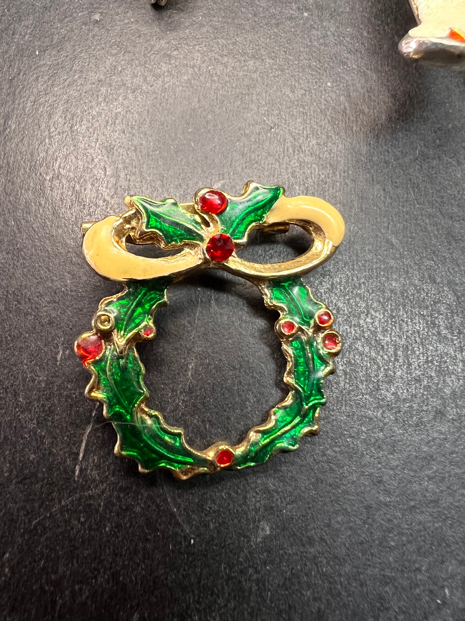 Vintage Christmas Brooch Lot of 6 Holiday Wreath Cat Tree Enamel Pins