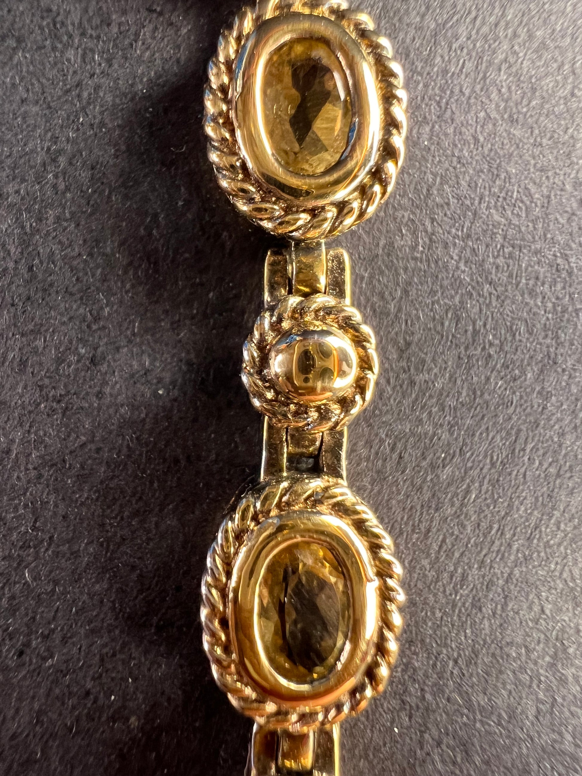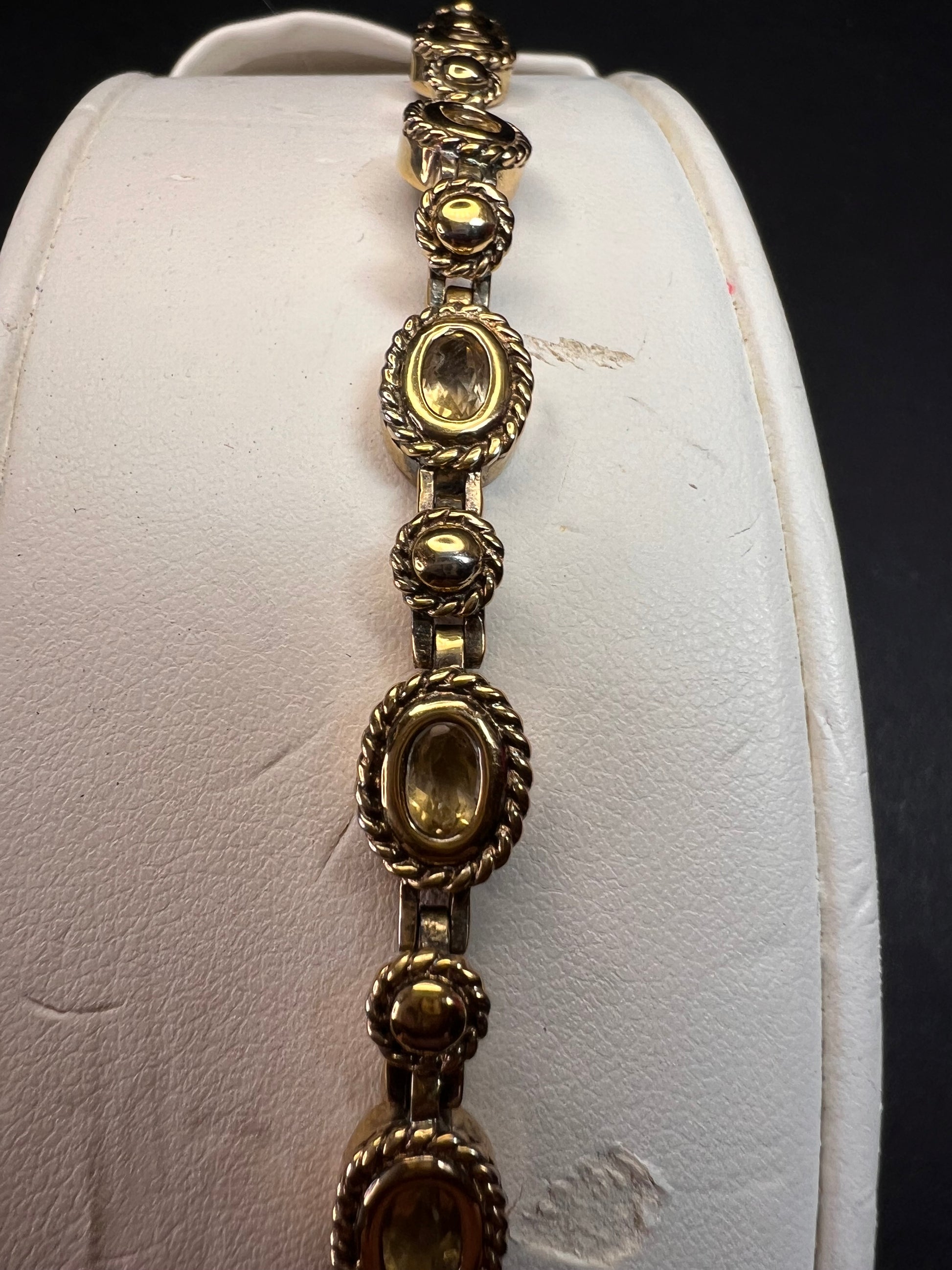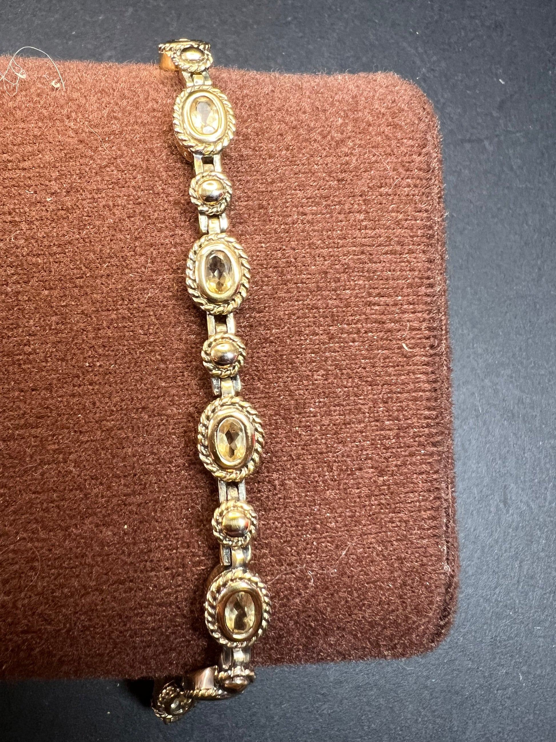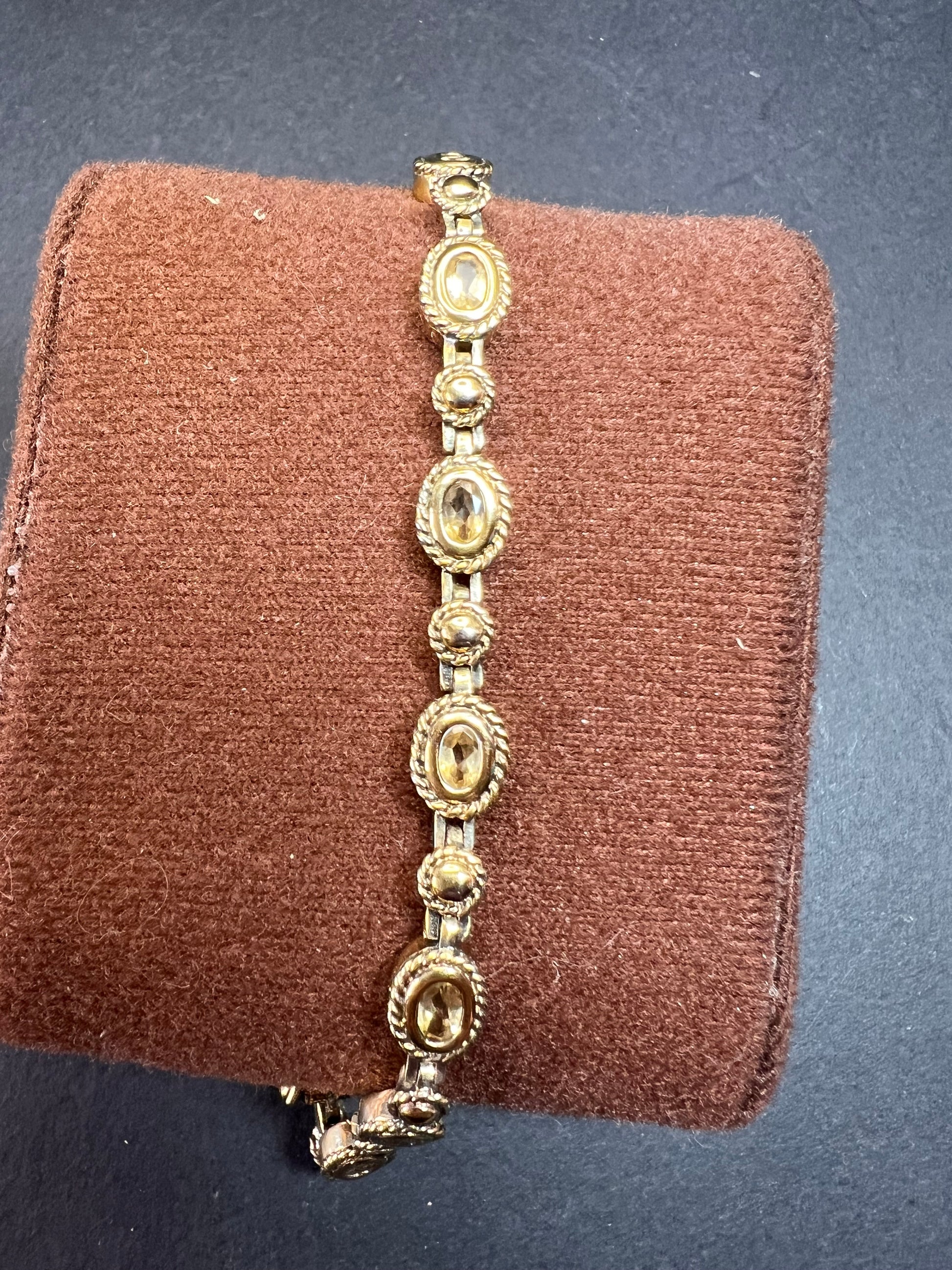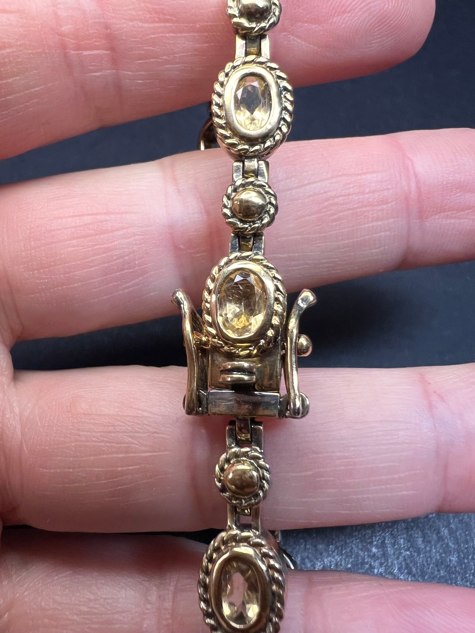Genuine citrine gemstones set in authentic 925 sterling silver plated with yellow gold. Bracelet measures roughly 8 inches in length. This bracelet will occasionally require some polishing given the nature of sterling silver and the age of the gold plating over the silver. Total weight is 18.49 grams. Stamped 925 CJ Thai.