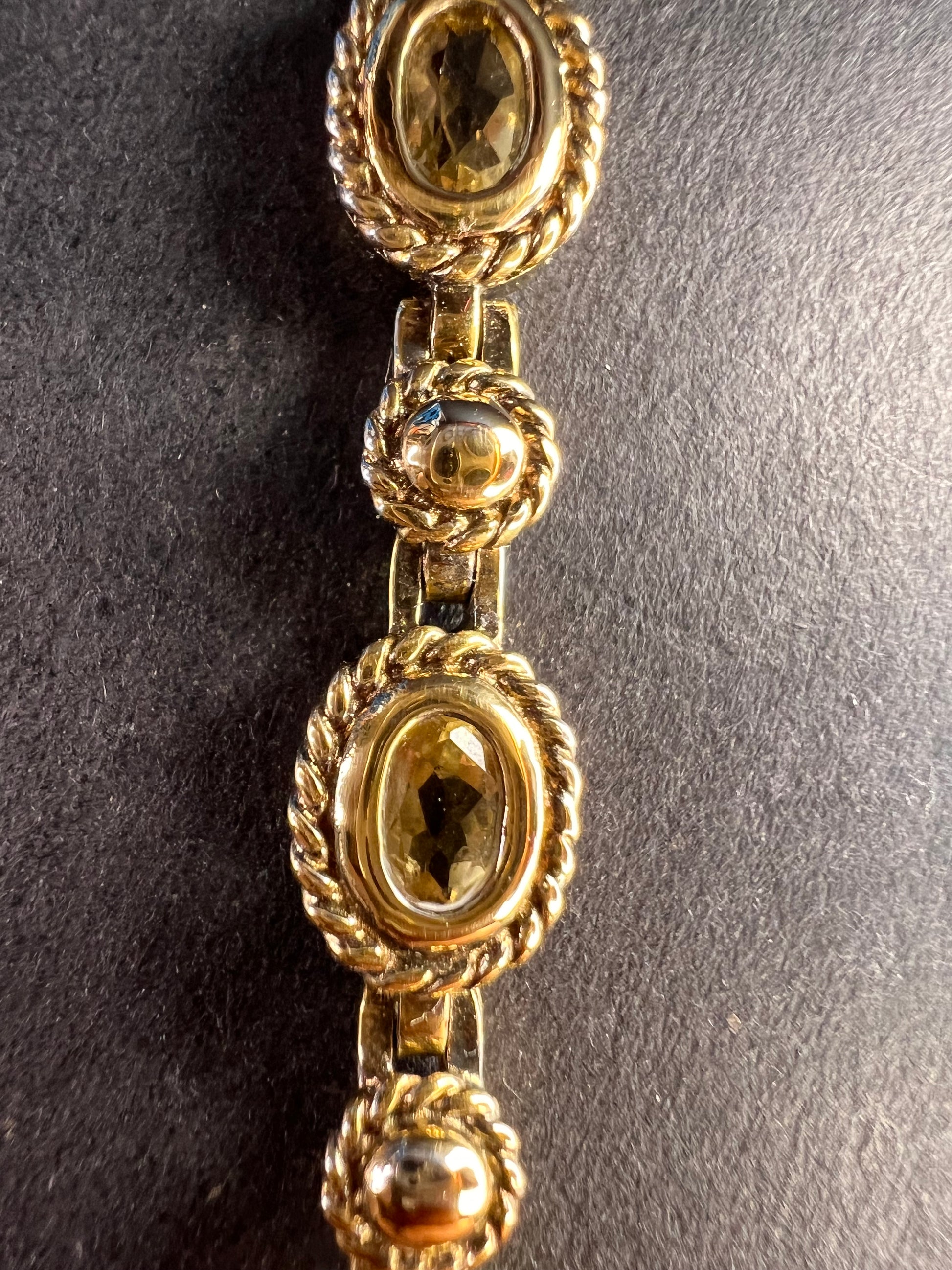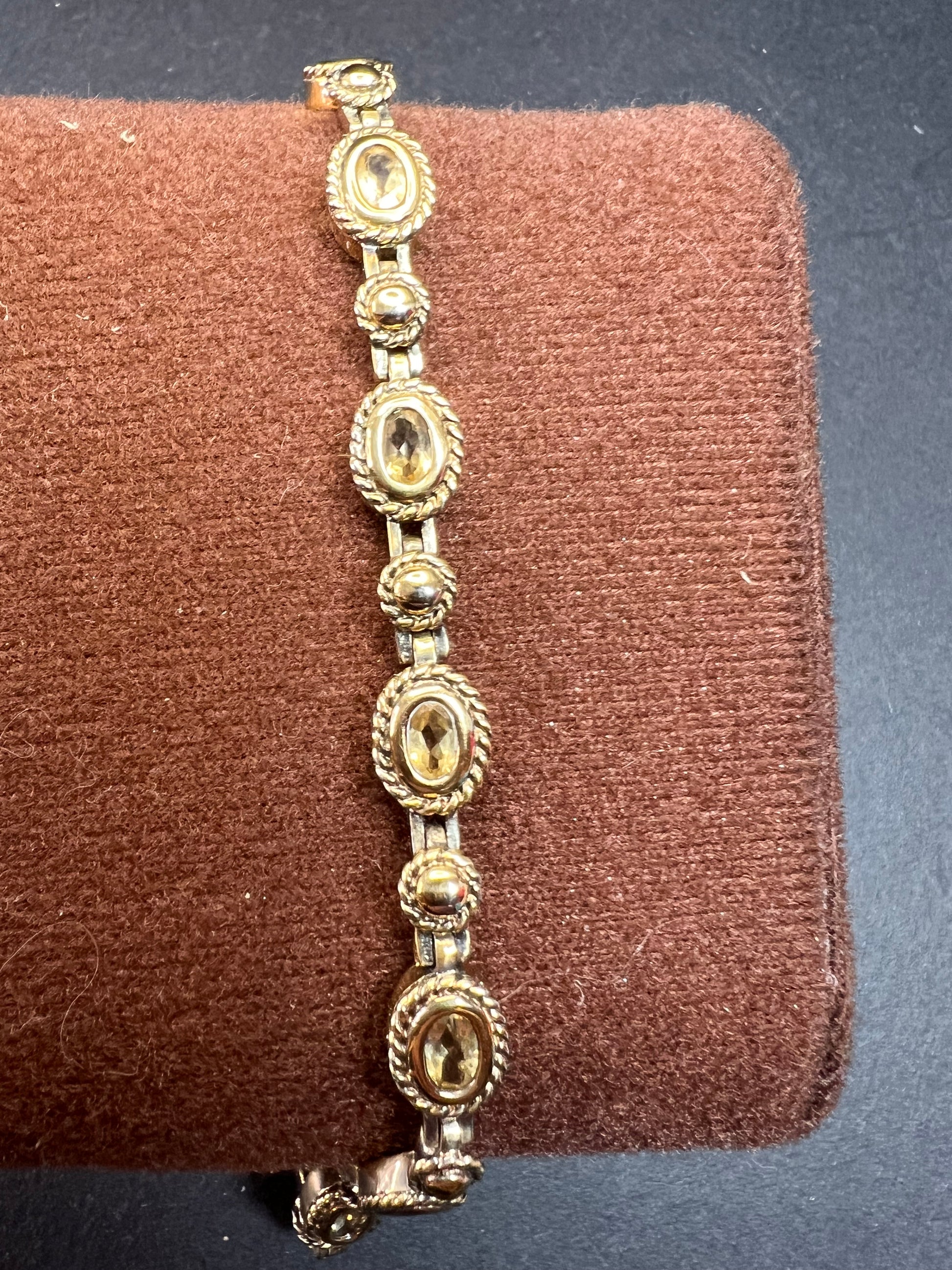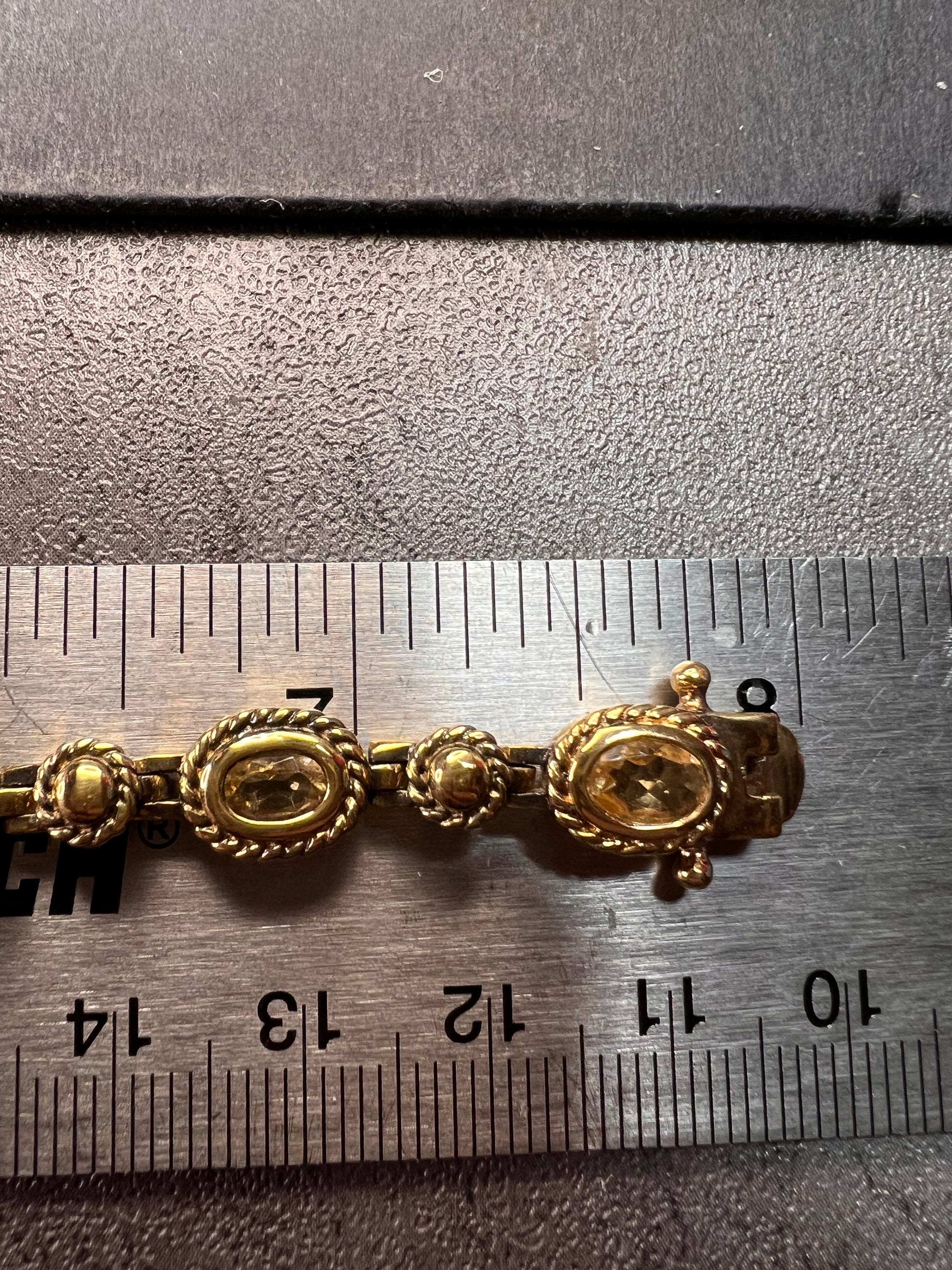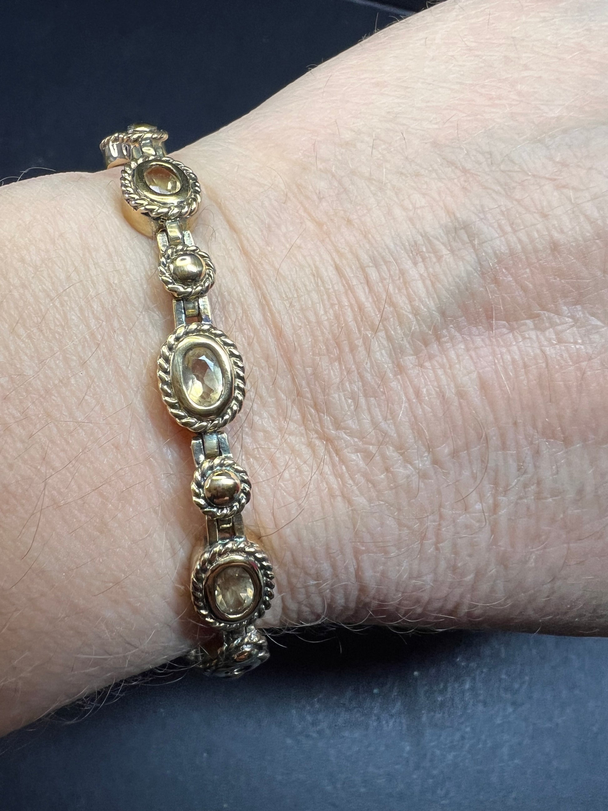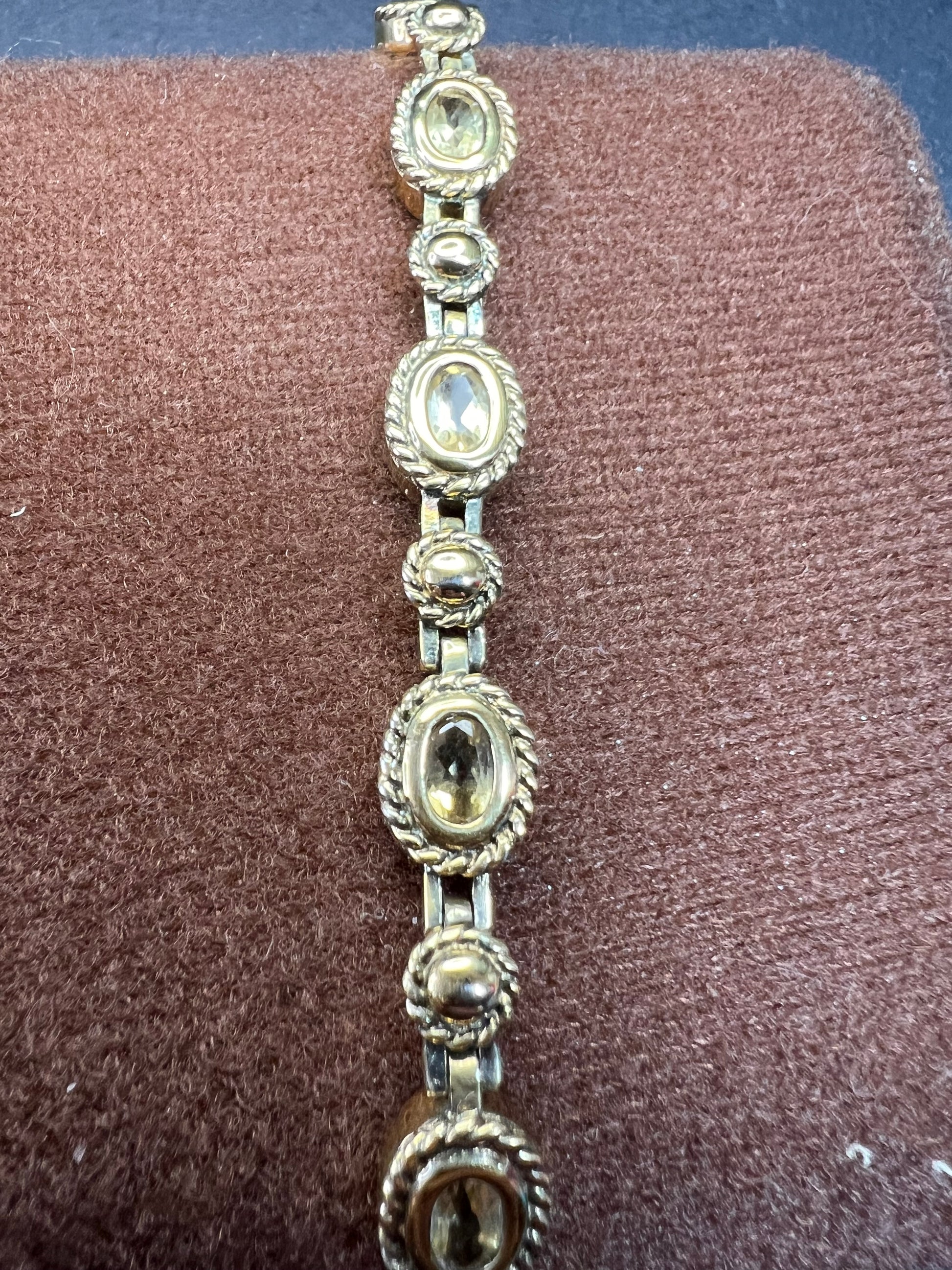 Genuine citrine gemstones set in authentic 925 sterling silver plated with yellow gold. Bracelet measures roughly 8 inches in length. This bracelet will occasionally require some polishing given the nature of sterling silver and the age of the gold plating over the silver. Total weight is 18.49 grams. Stamped 925 CJ Thai.