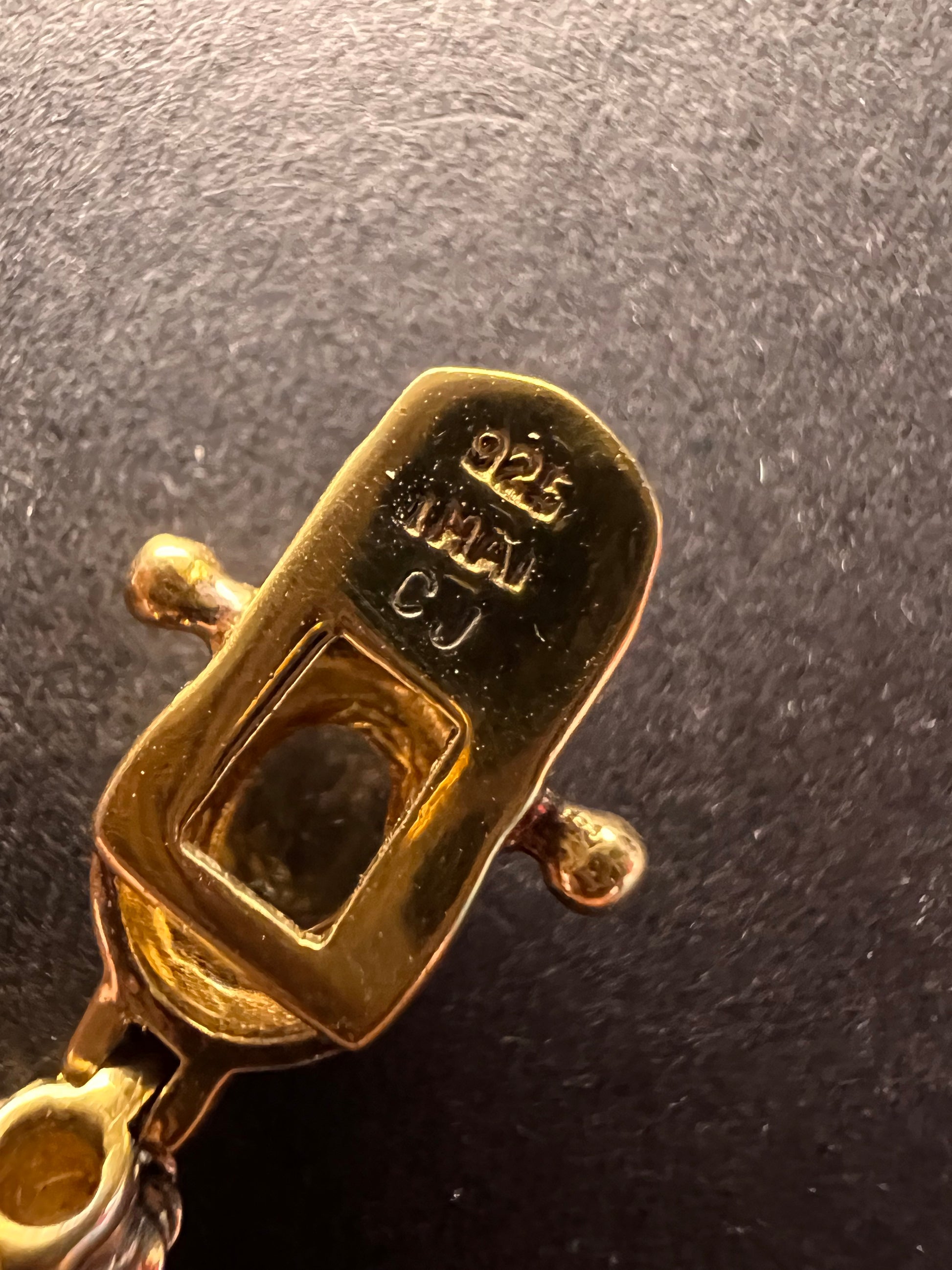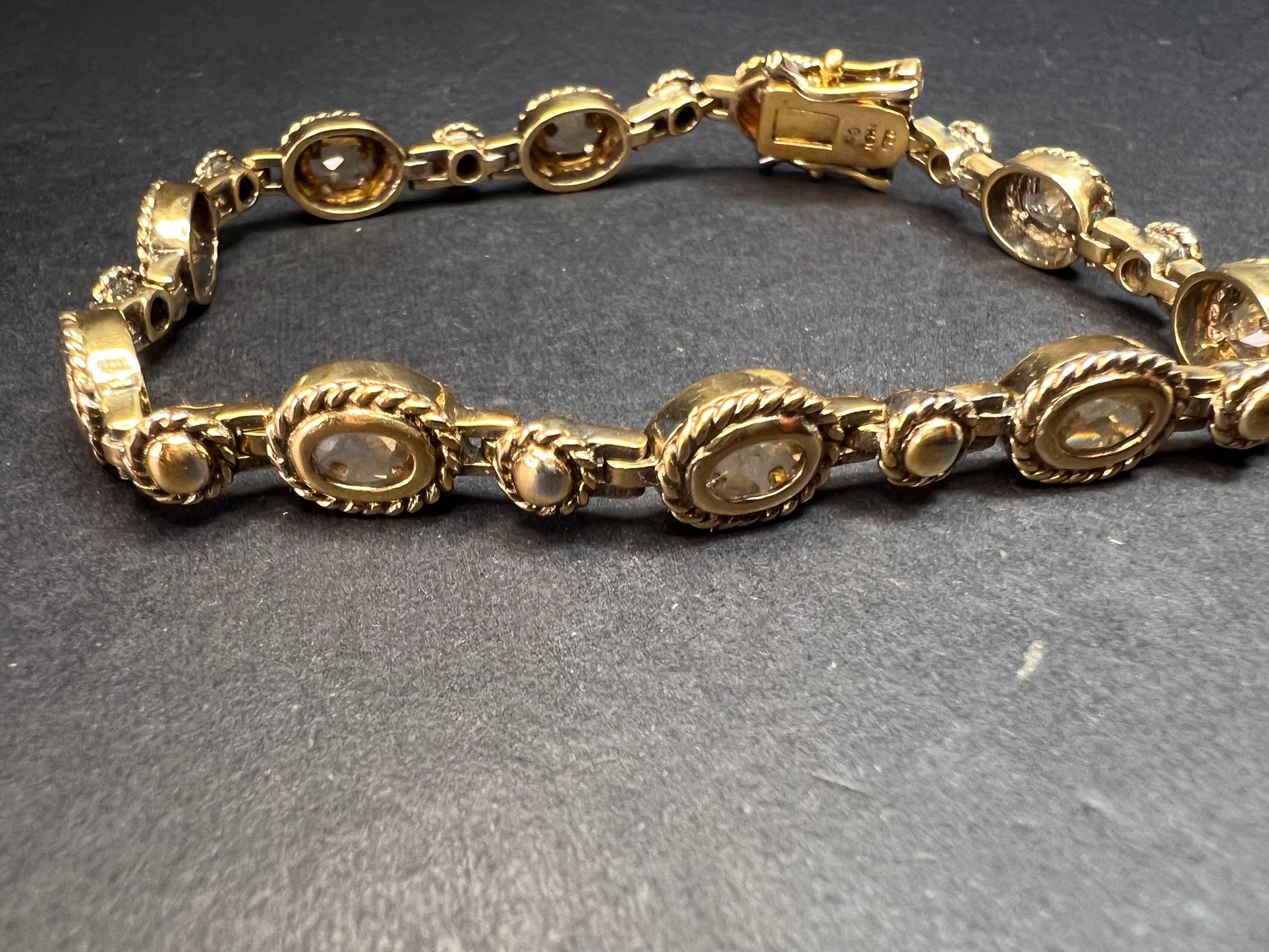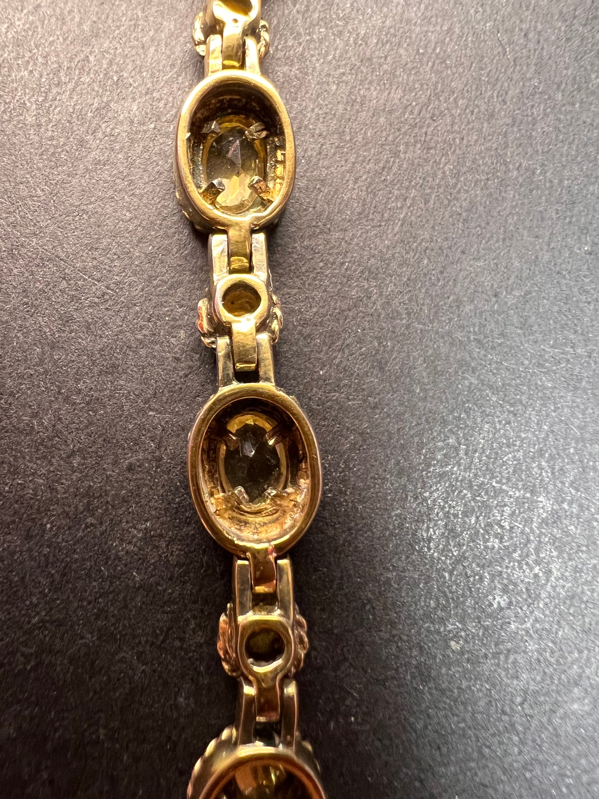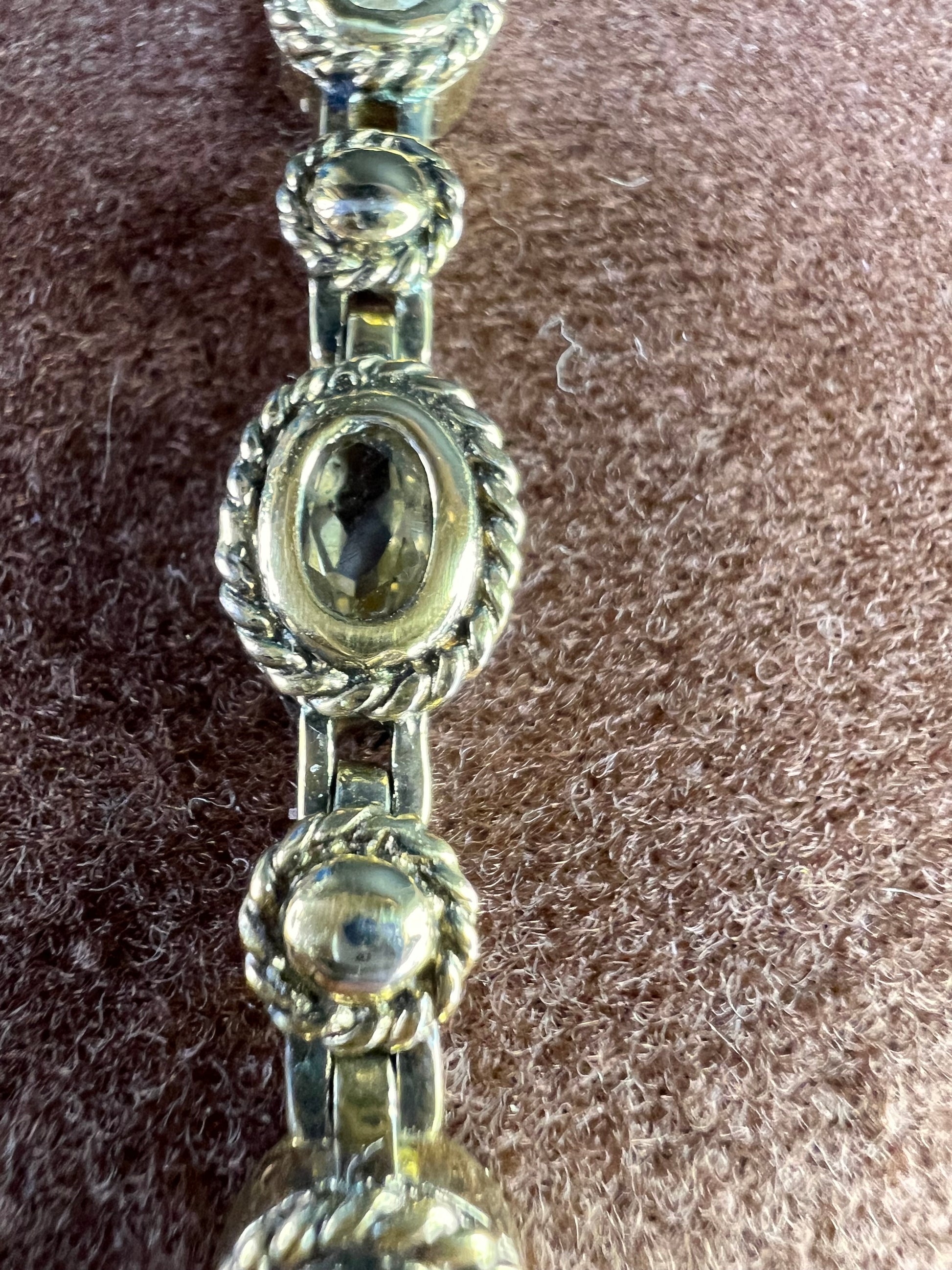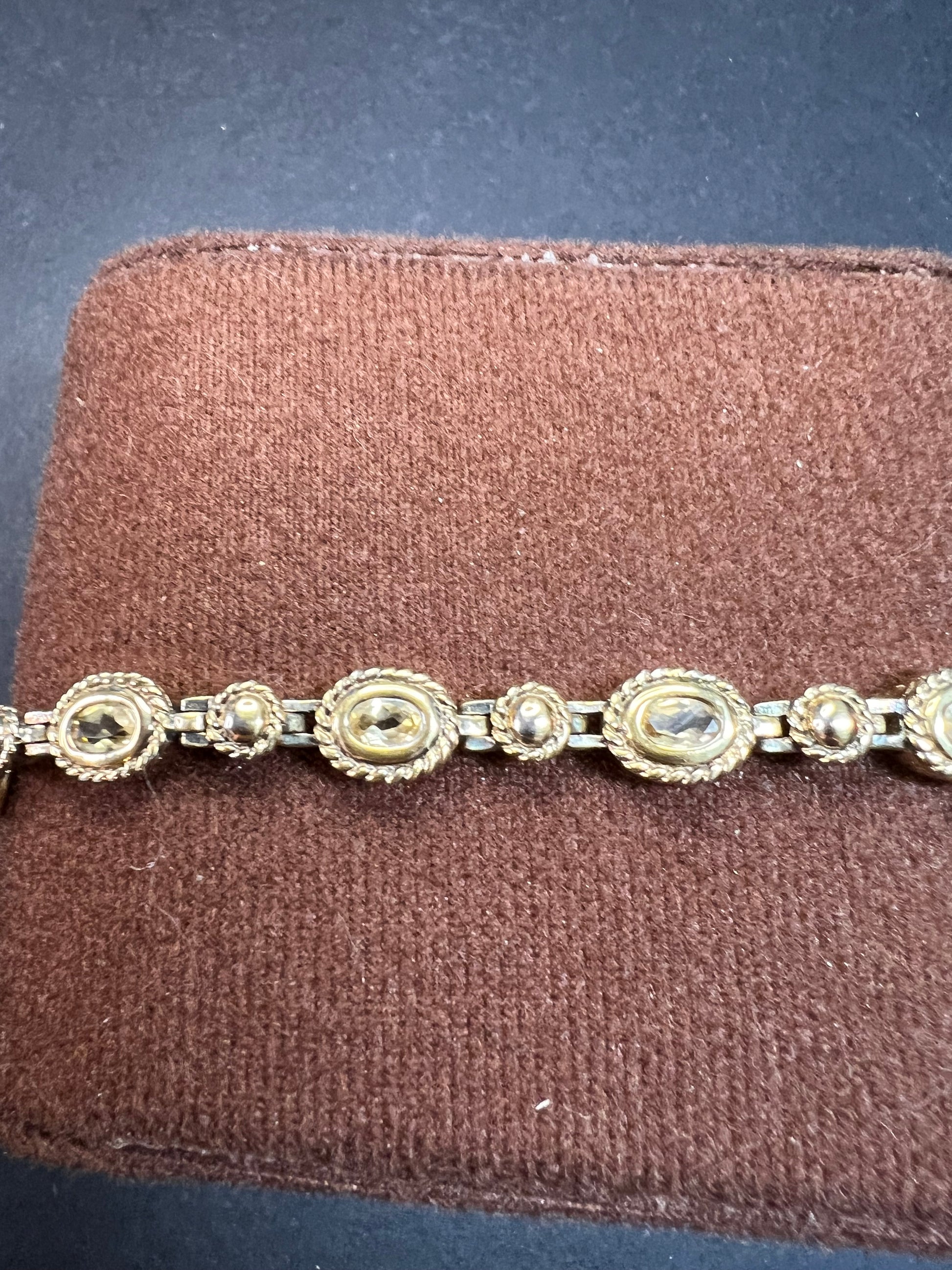 Genuine citrine gemstones set in authentic 925 sterling silver plated with yellow gold. Bracelet measures roughly 8 inches in length. This bracelet will occasionally require some polishing given the nature of sterling silver and the age of the gold plating over the silver. Total weight is 18.49 grams. Stamped 925 CJ Thai.