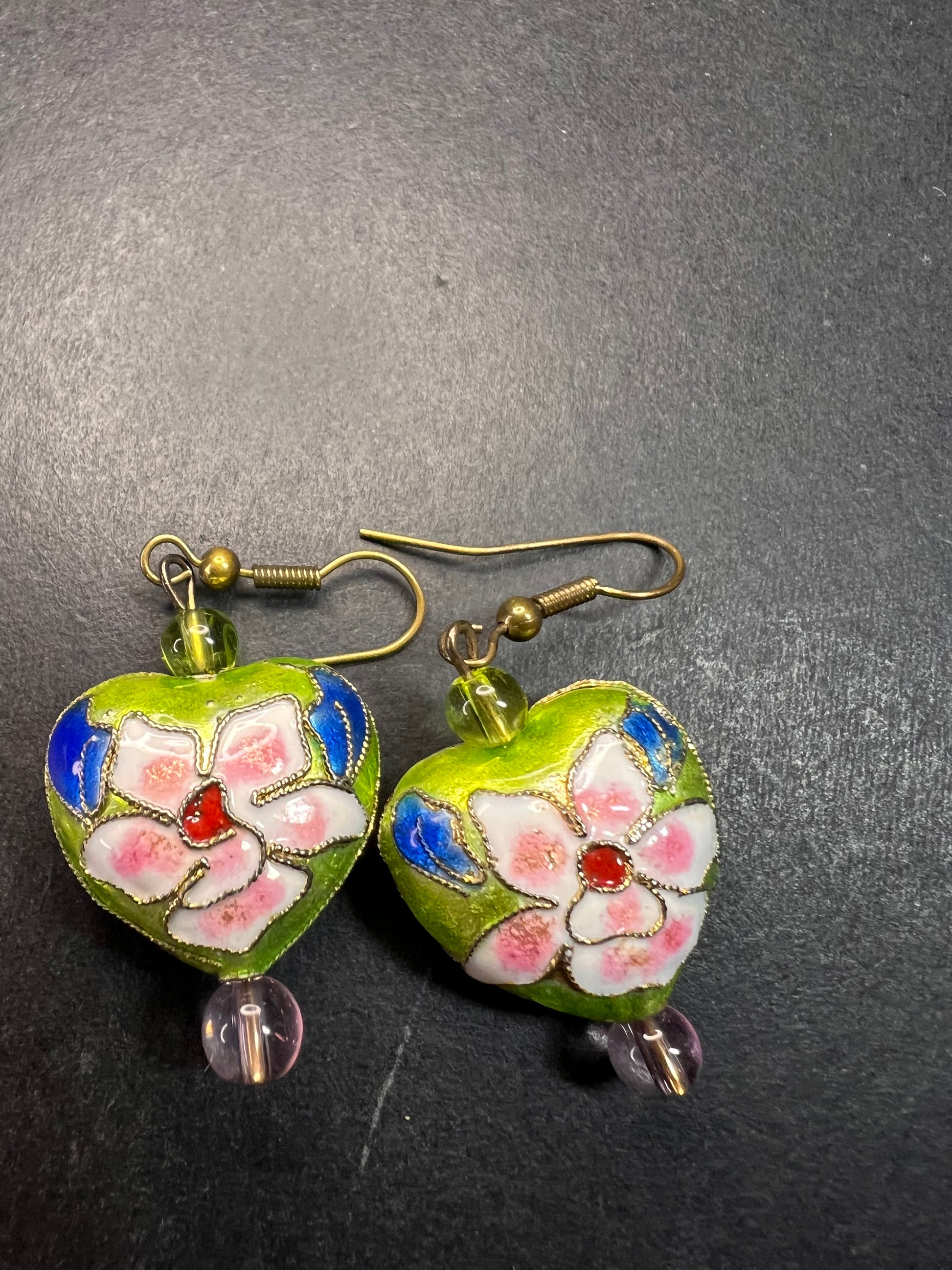 Vintage cloisonné puffy heart green earrings with glass or plastic spacer beads. Hung on French wires that are likely made of brass