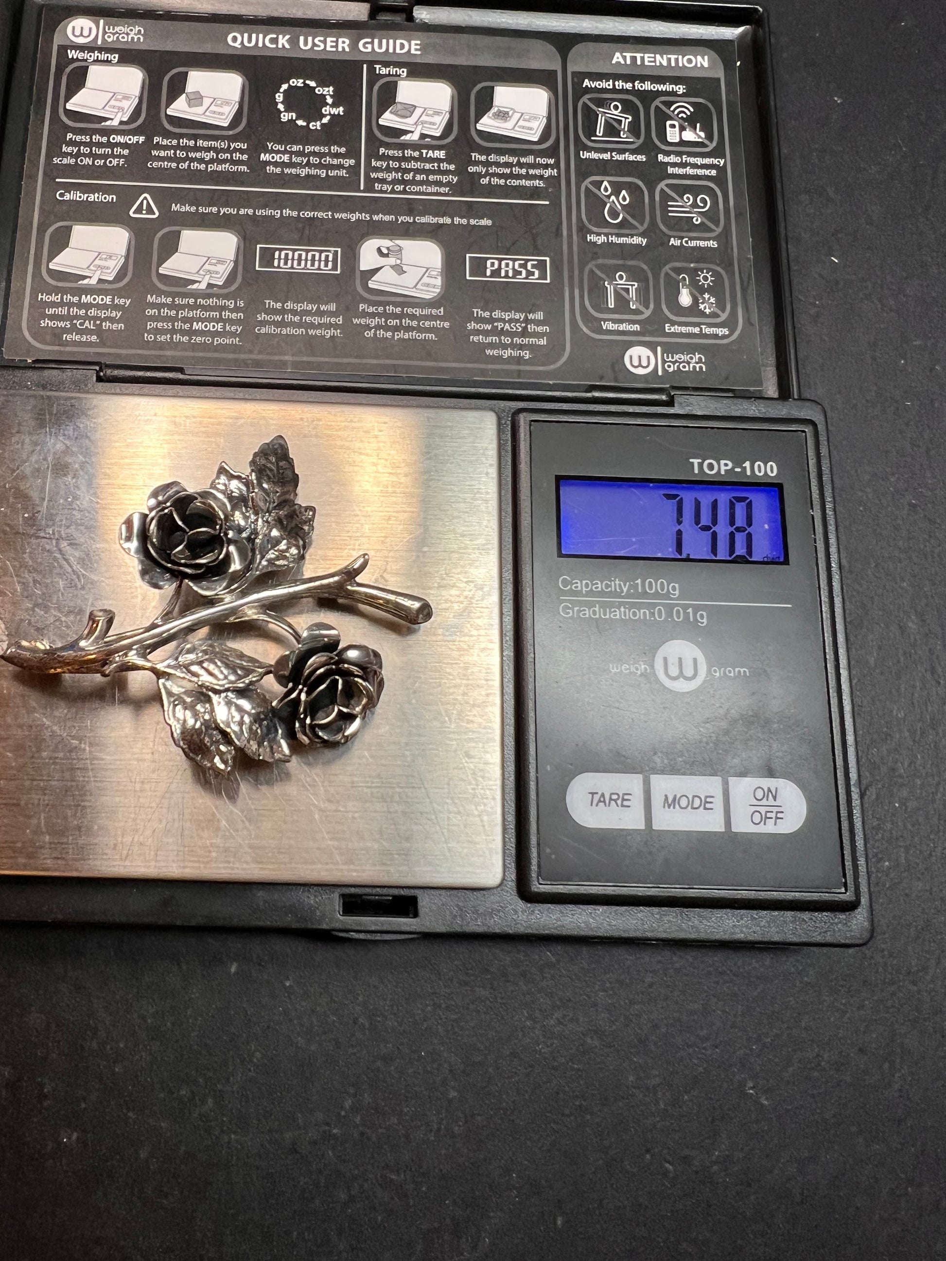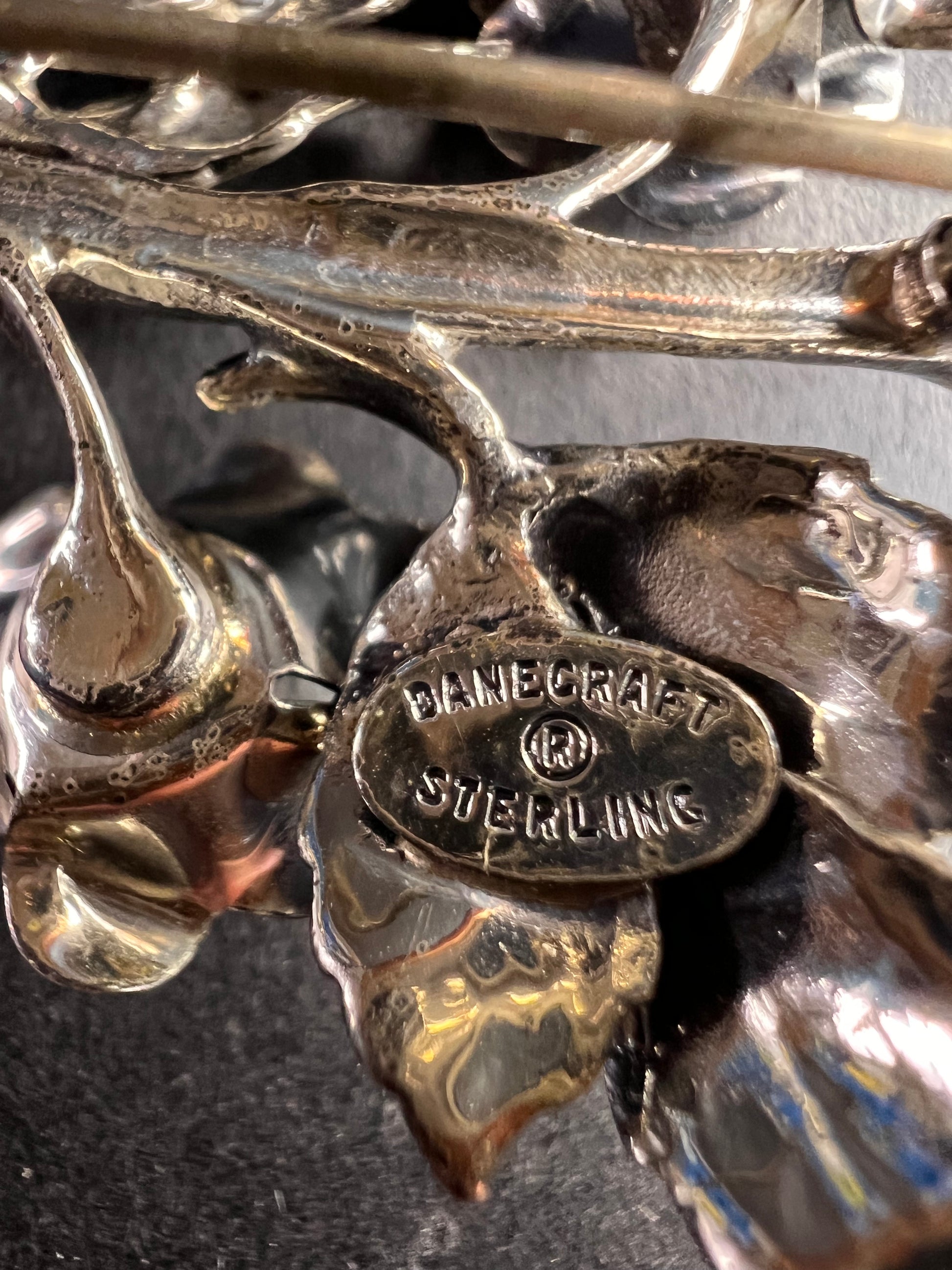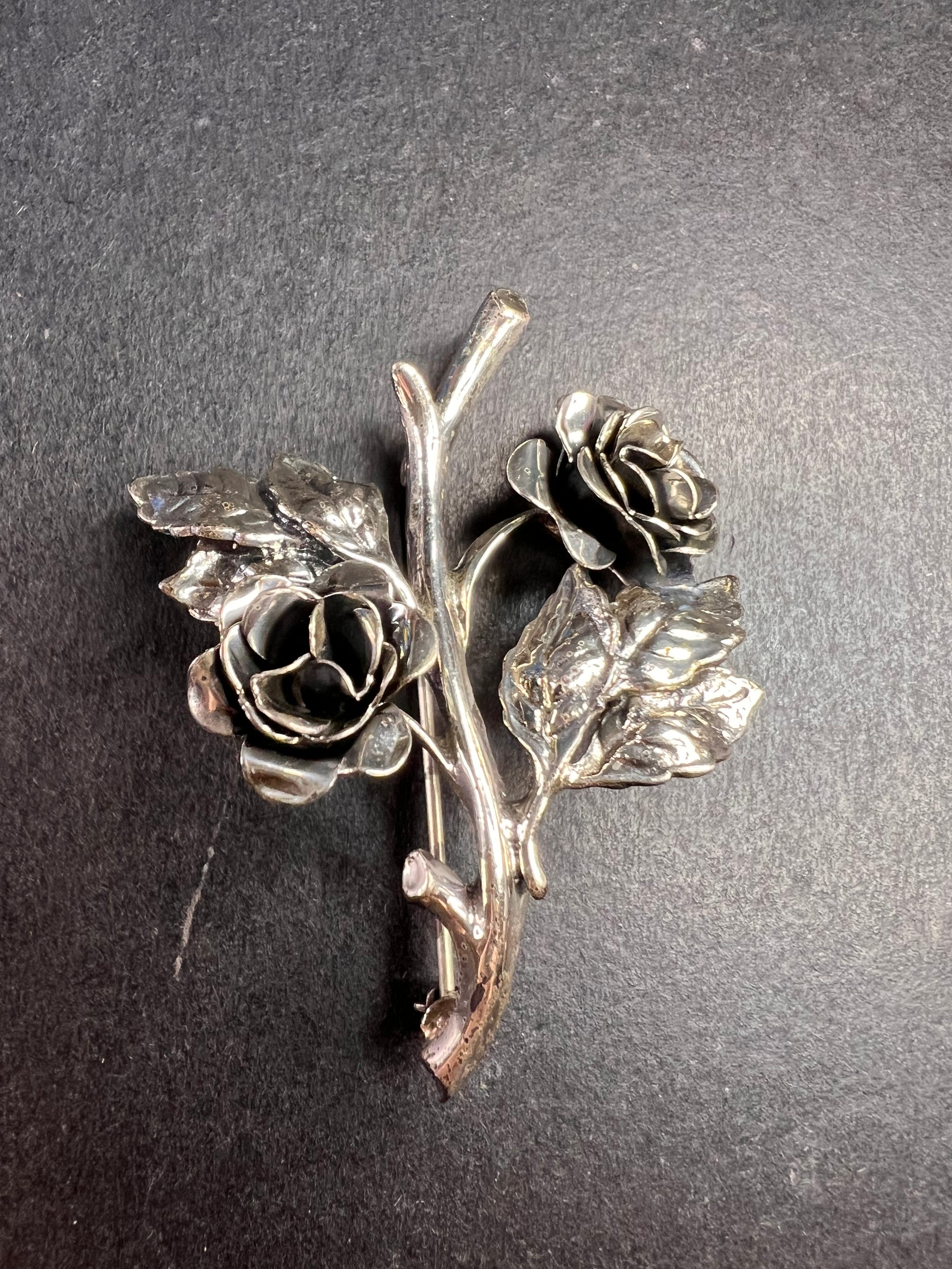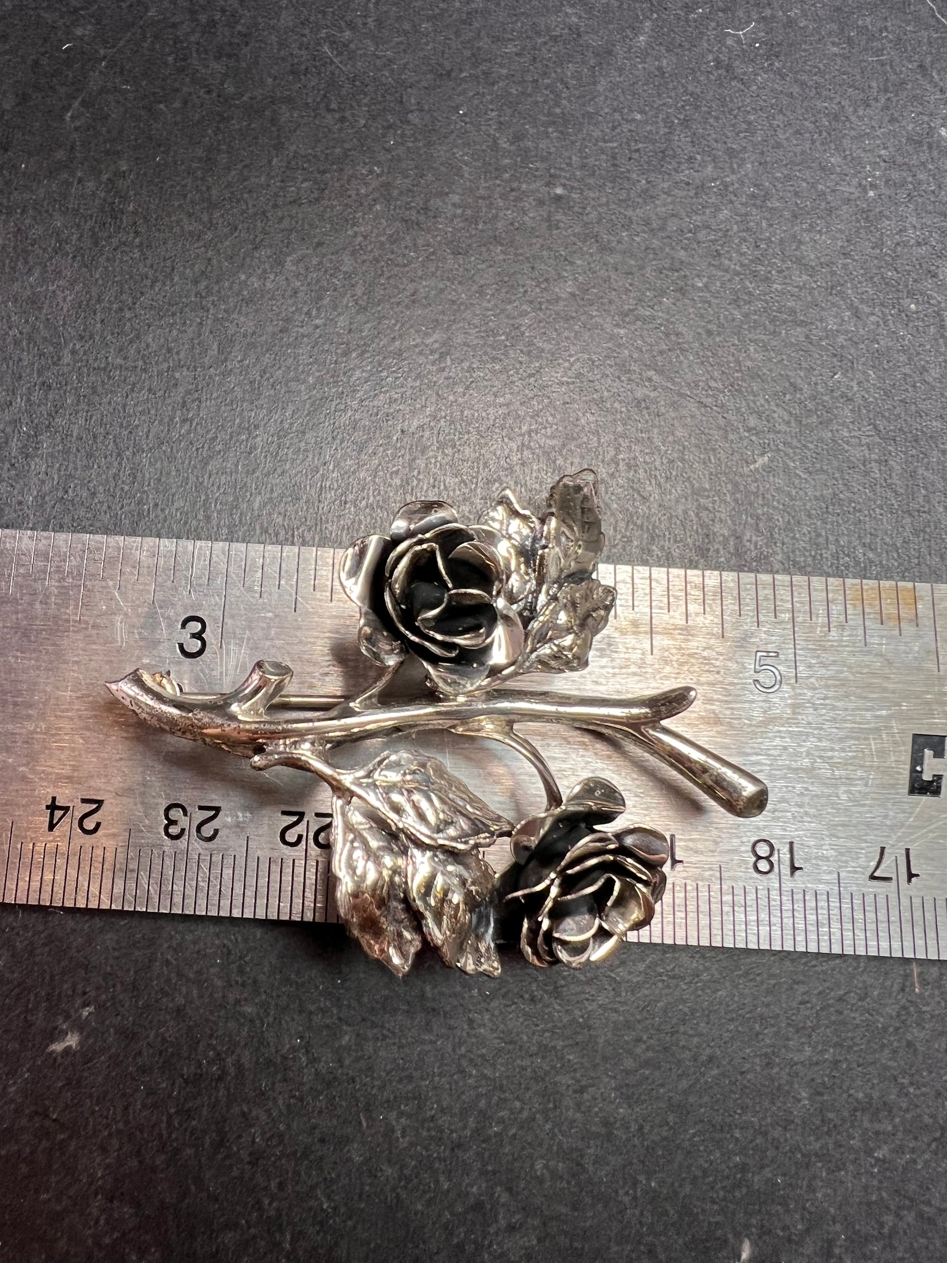 Vintage Sterling Danecraft roses brooch pin measuring almost 2.25 inches in length and weighing 11.69 grams.