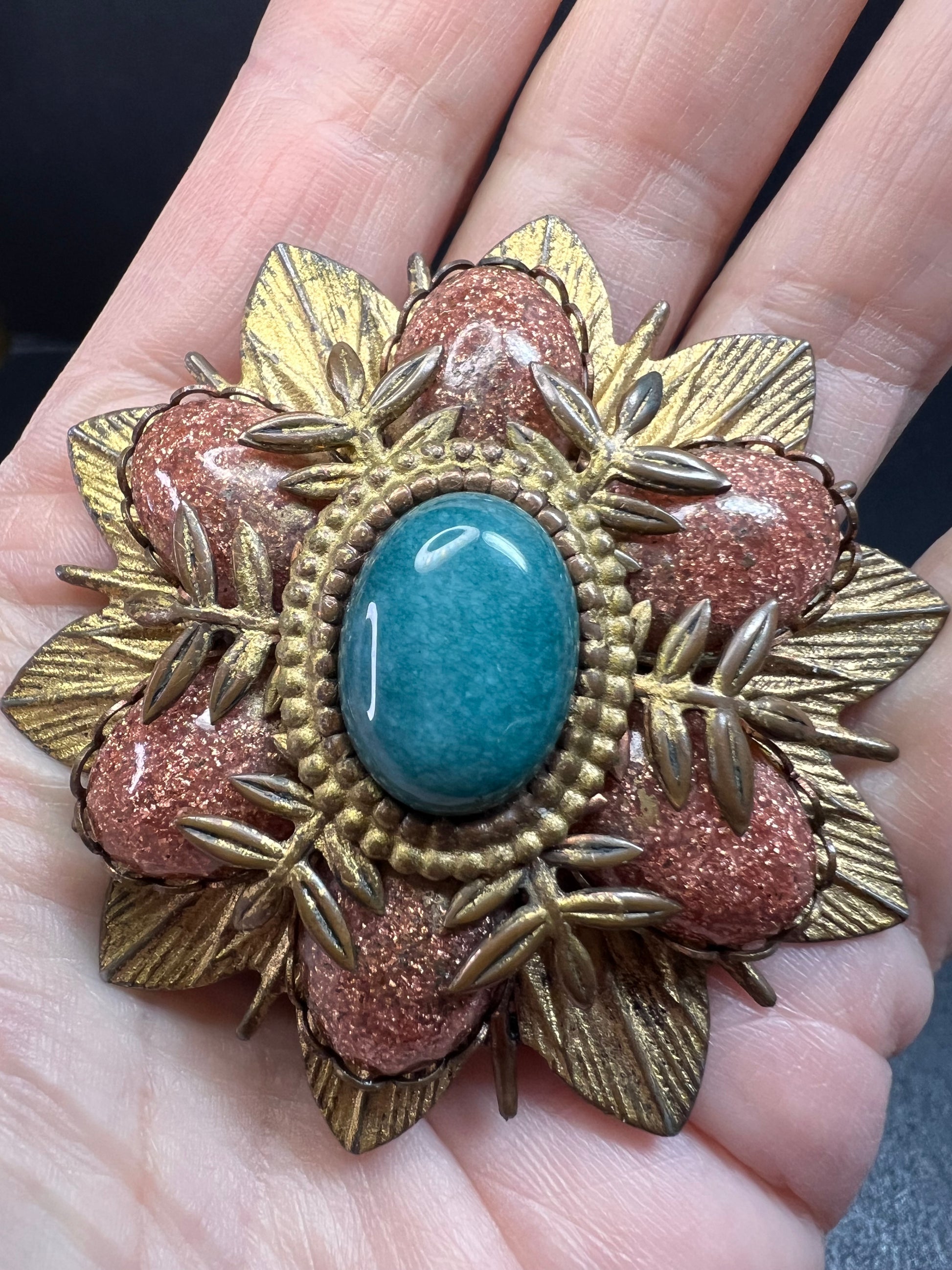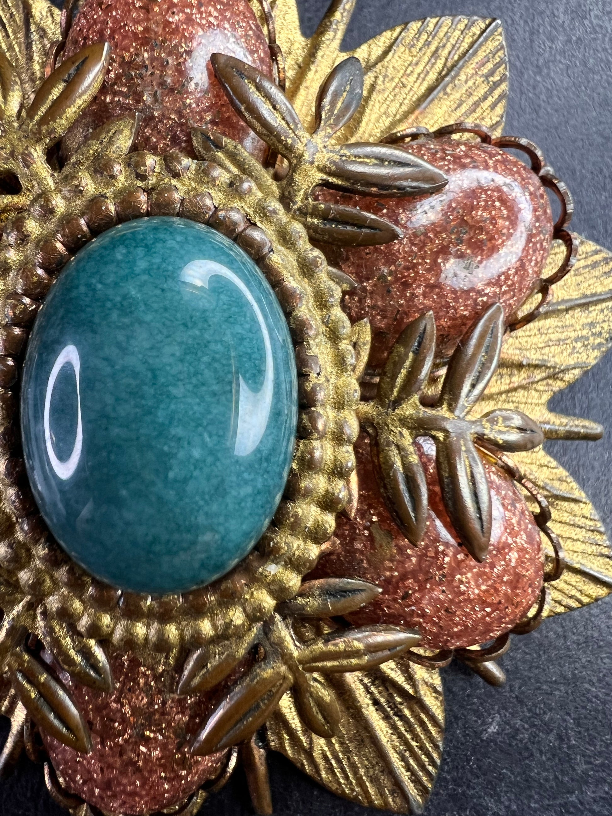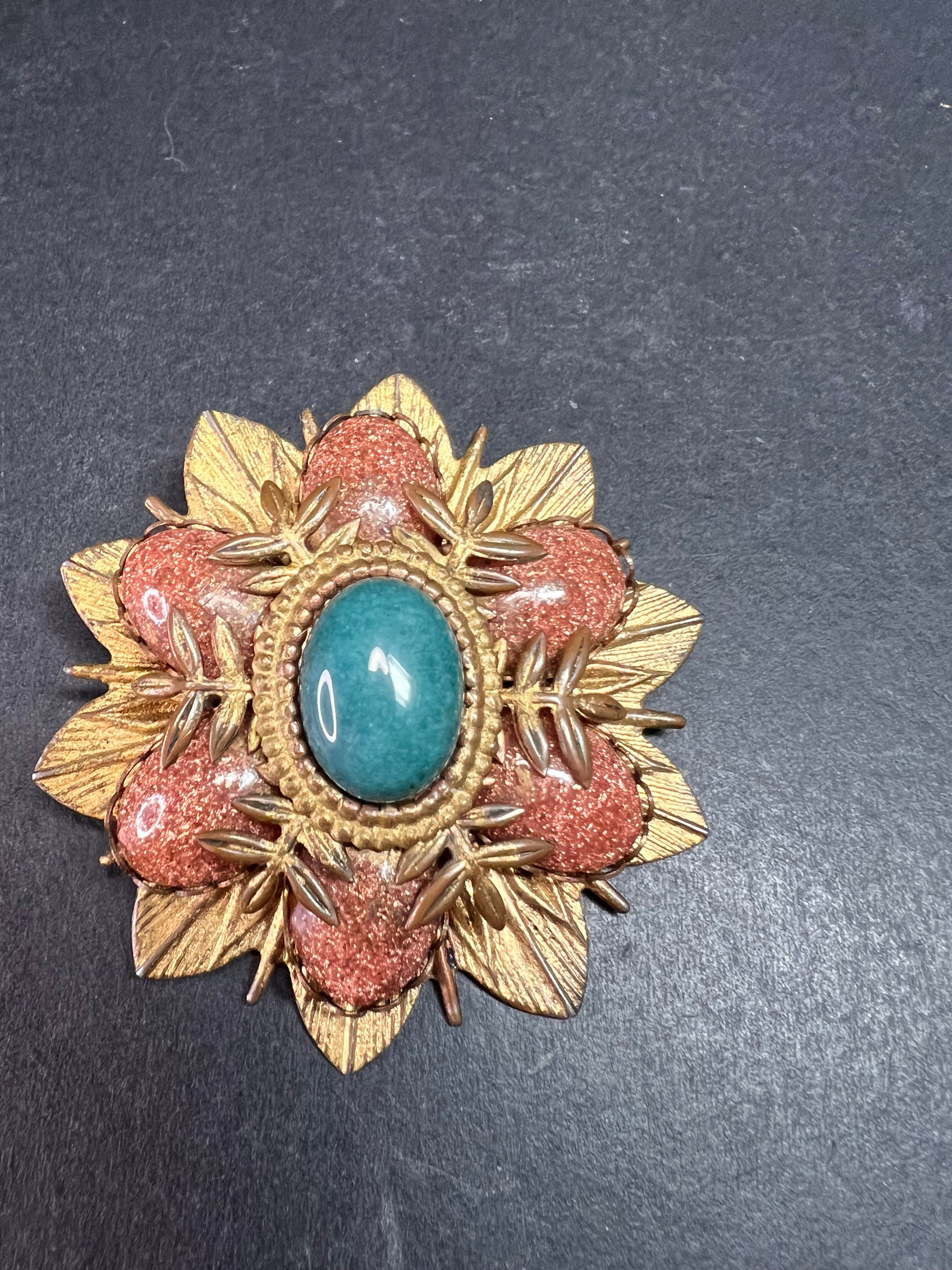 Striking vintage mid-century floral costume jewelry brooch featuring a large oval faux turquoise glass cabochon framed by a beaded rope bezel, surrounded by six shimmering copper glitter glass cabochons in a dimensional gold tone botanical setting with layered leaf detailing. Measures approx. 2.6 inches across (see ruler photo). Brooch is unsigned; however, design, materials, and construction closely match documented 1950sā1960s DeNicola floral brooches and it is attributed to DeNicola style by visual comparison only. Secure rollover pin back. Beautiful aged patina with light surface wear consistent with vintage condition. Bold Hollywood Regency statement piece for coats, sweaters, or scarves.