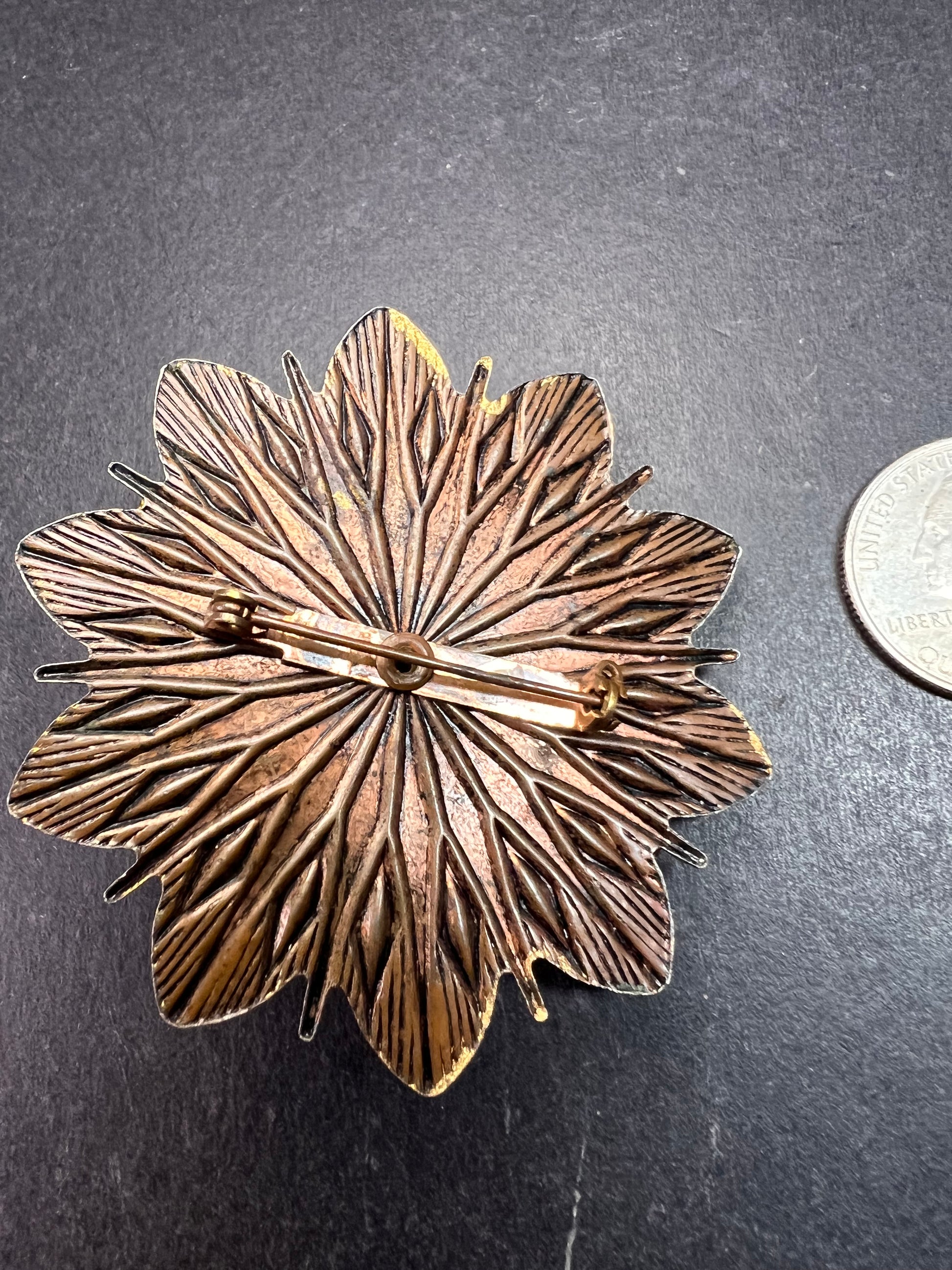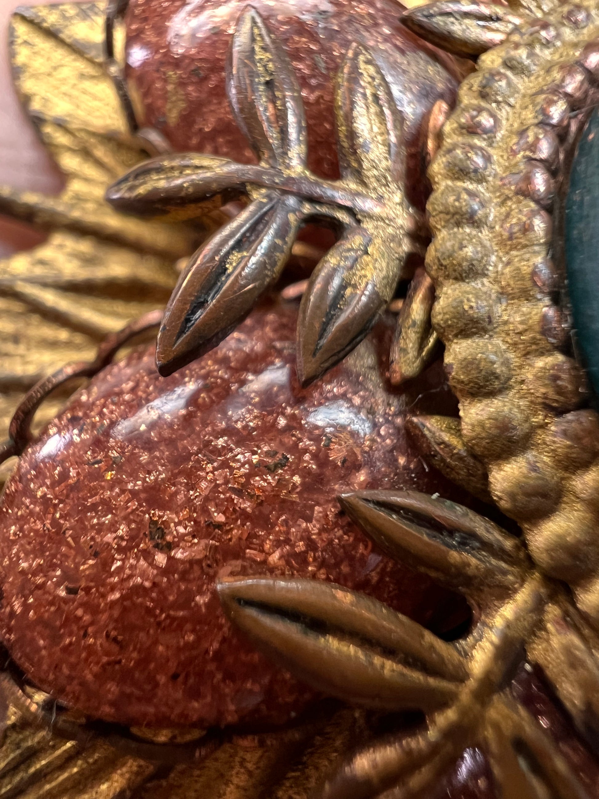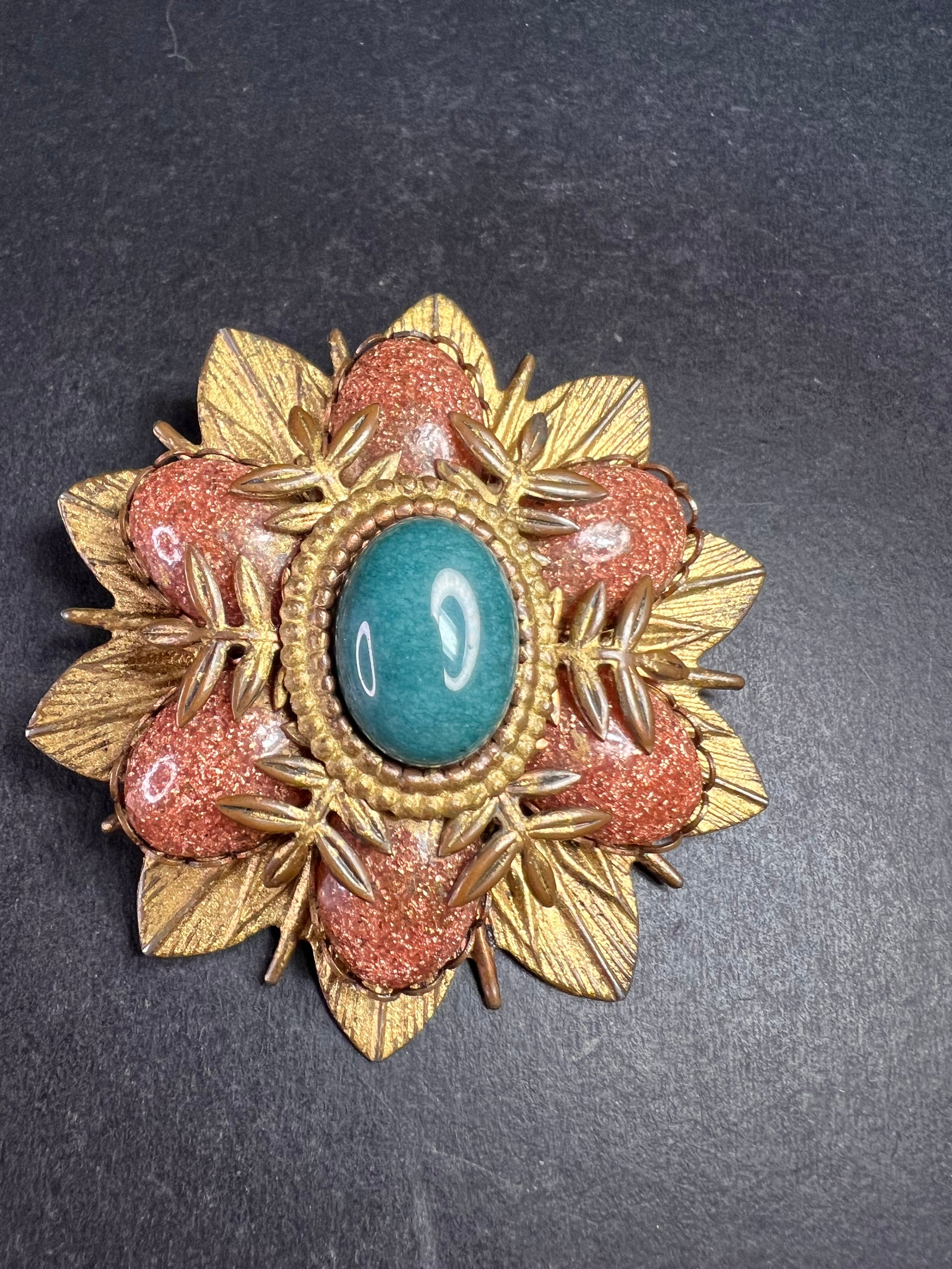Striking vintage mid-century floral costume jewelry brooch featuring a large oval faux turquoise glass cabochon framed by a beaded rope bezel, surrounded by six shimmering copper glitter glass cabochons in a dimensional gold tone botanical setting with layered leaf detailing. Measures approx. 2.6 inches across (see ruler photo). Brooch is unsigned; however, design, materials, and construction closely match documented 1950sā1960s DeNicola floral brooches and it is attributed to DeNicola style by visual comparison only. Secure rollover pin back. Beautiful aged patina with light surface wear consistent with vintage condition. Bold Hollywood Regency statement piece for coats, sweaters, or scarves.